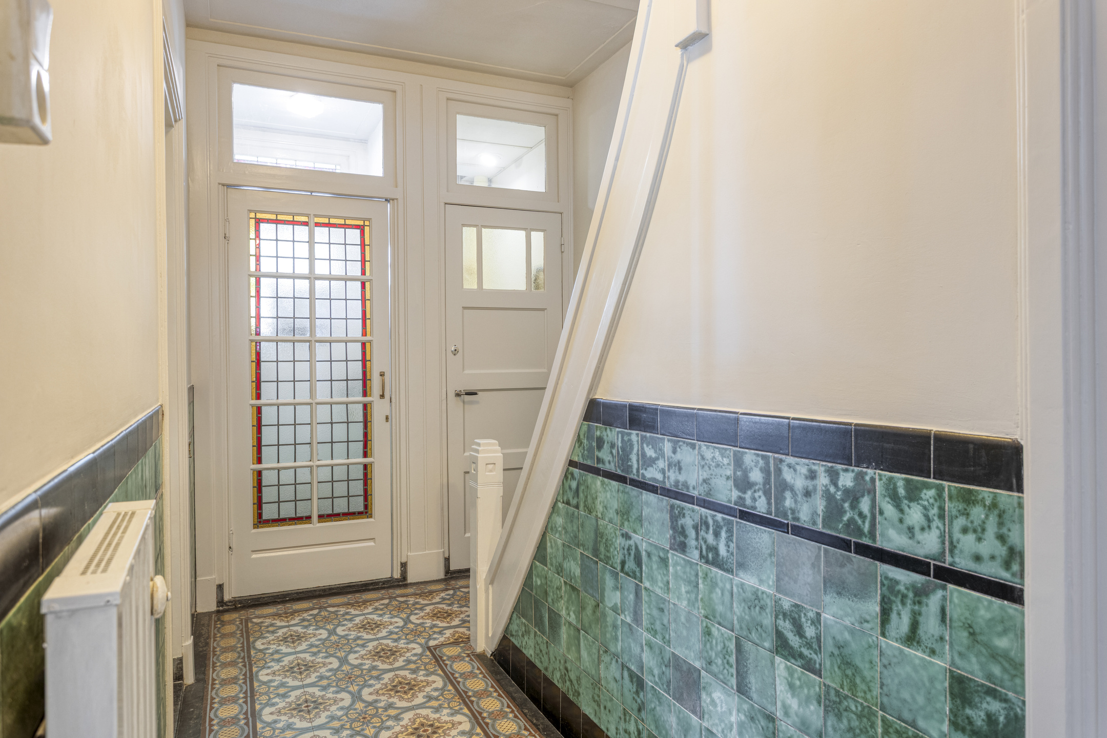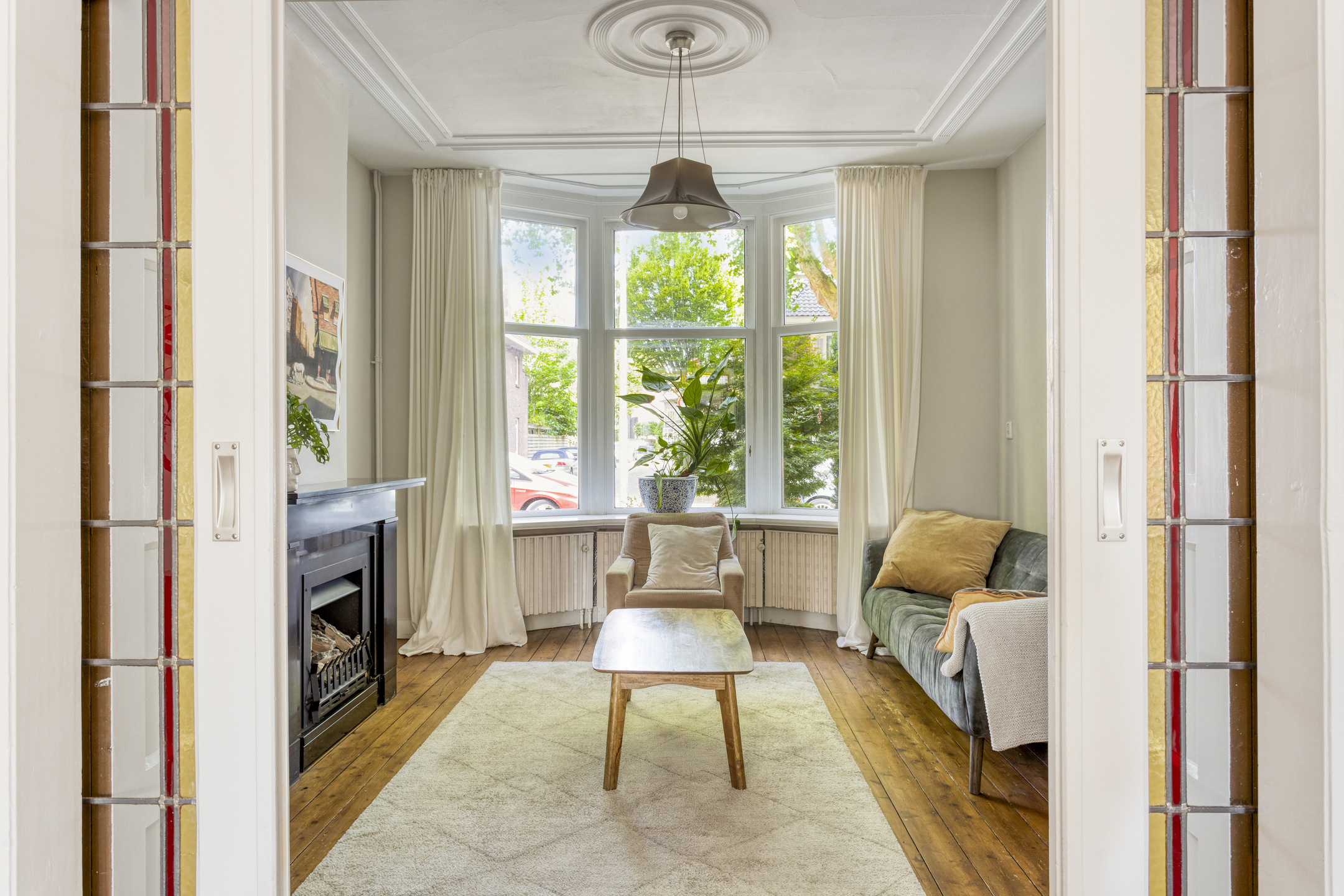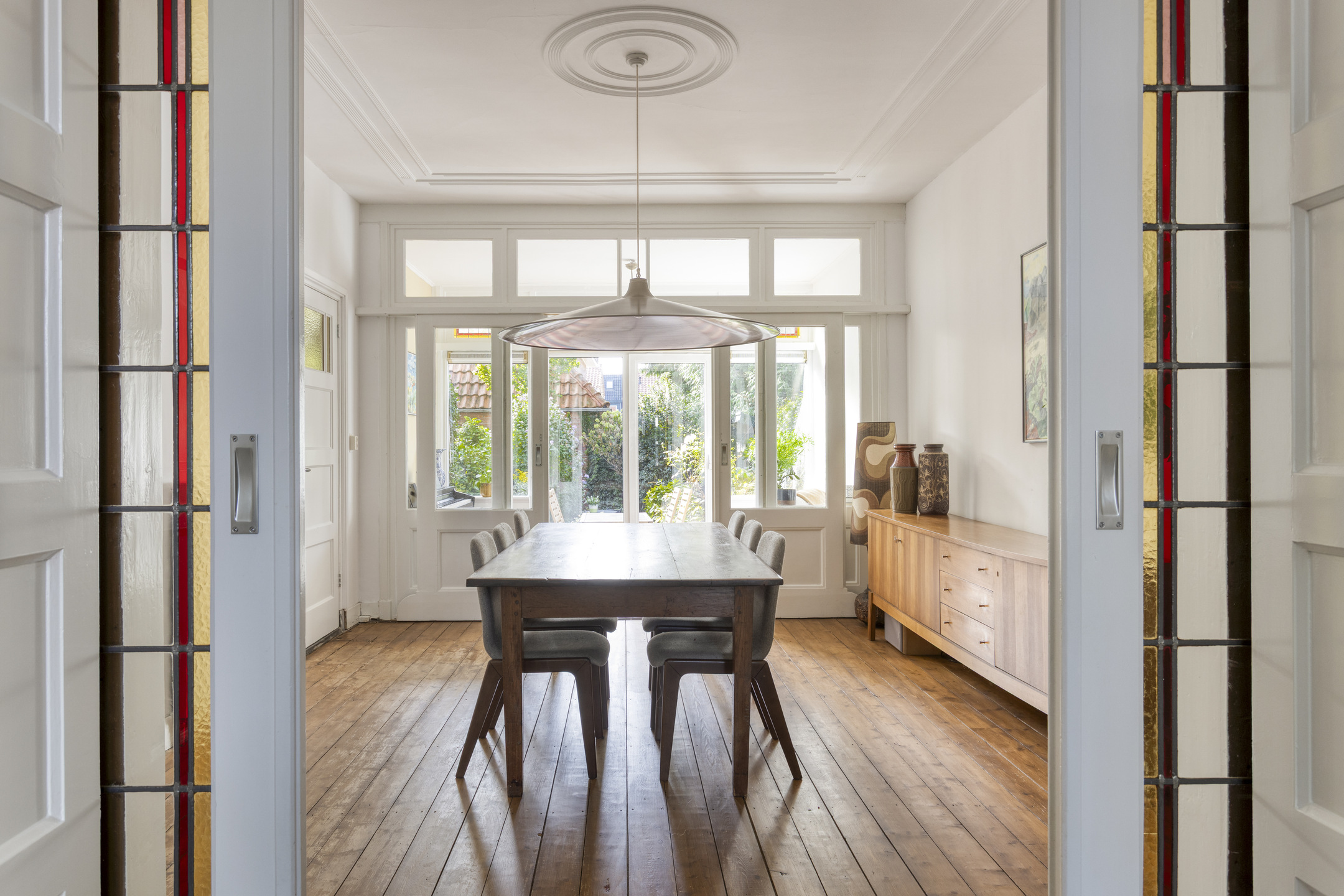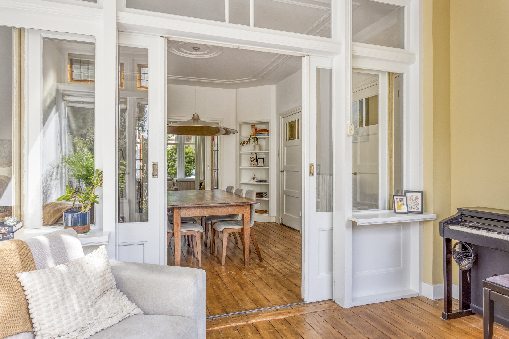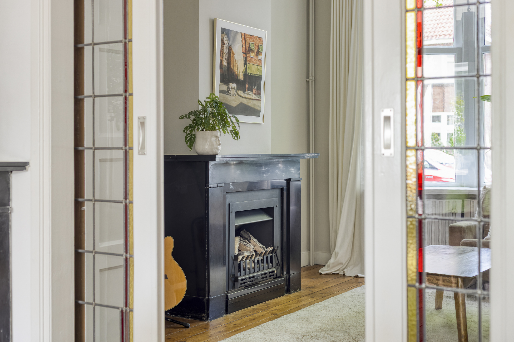 Begane grond: entree en hal voorzien van authentiek tegel- en glas-in-loodwerk, met trapopgang naar de 1e verdieping, toegang tot de kelder, meterkast (2022) en toilet voorzien van fonteintje. Ruime woonkamer-en-suite, bestaande uit een zitkamer aan de voorzijde met erker en gashaard, eetkamer en (tuin-)kamer aan de achterzijde met toegang tot het terras. Recent vernieuwde keuken met terrazzo werkblad, luxe SMEG-fornuis (5-pits inductie, 3 ovens), vaatwasser, koelkast en tuindeur.