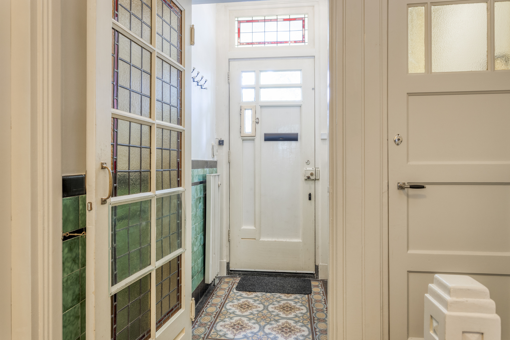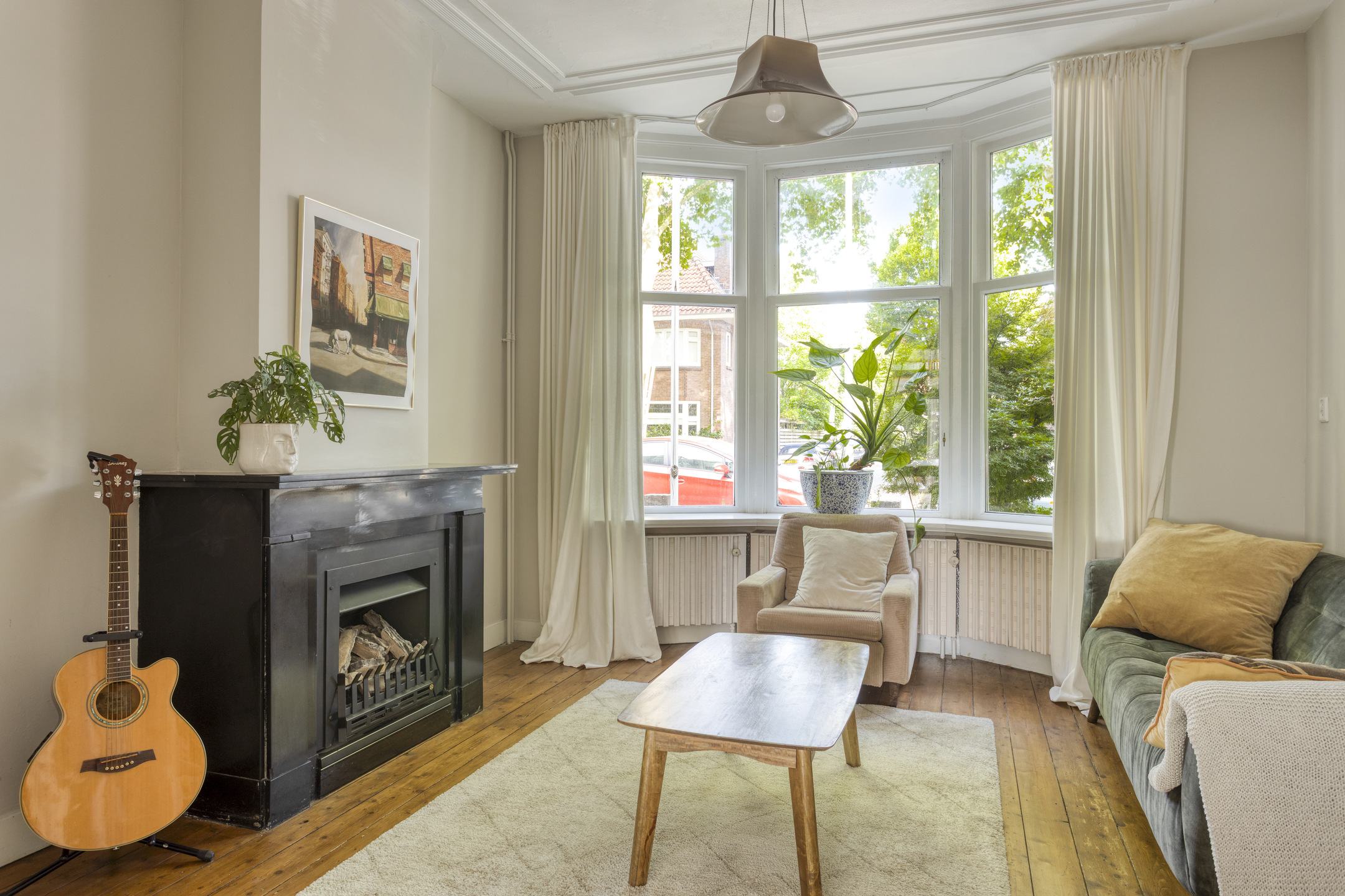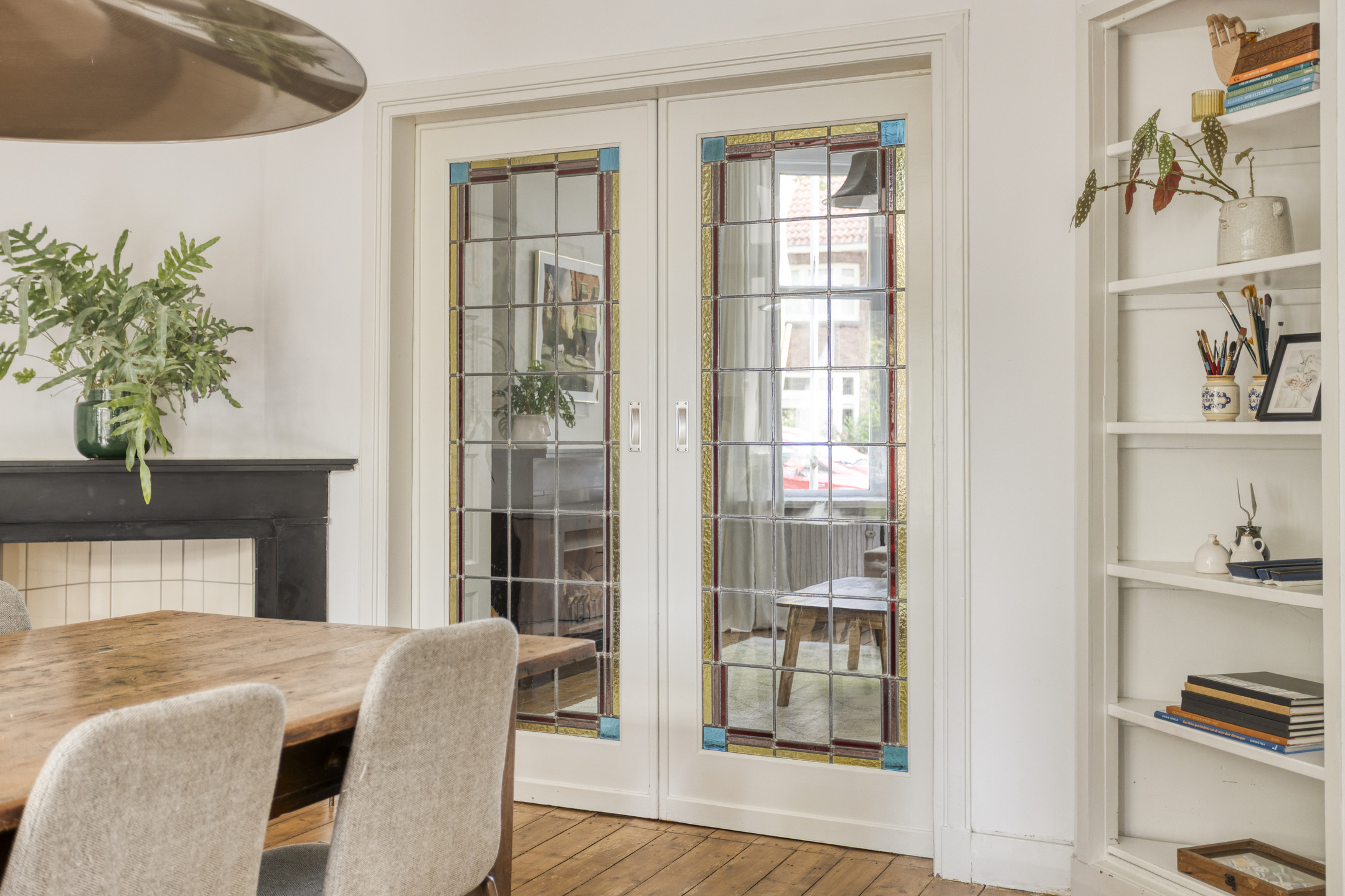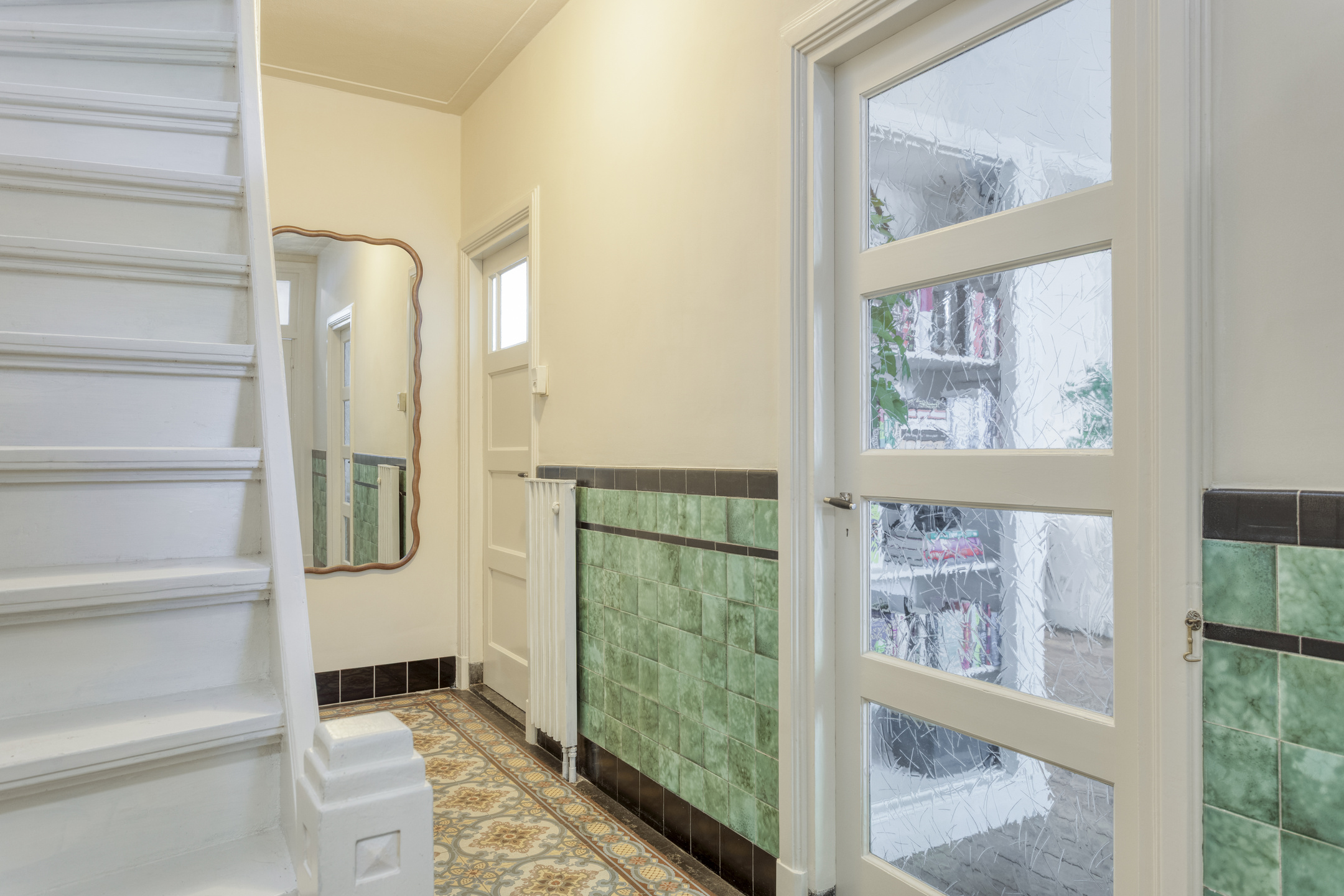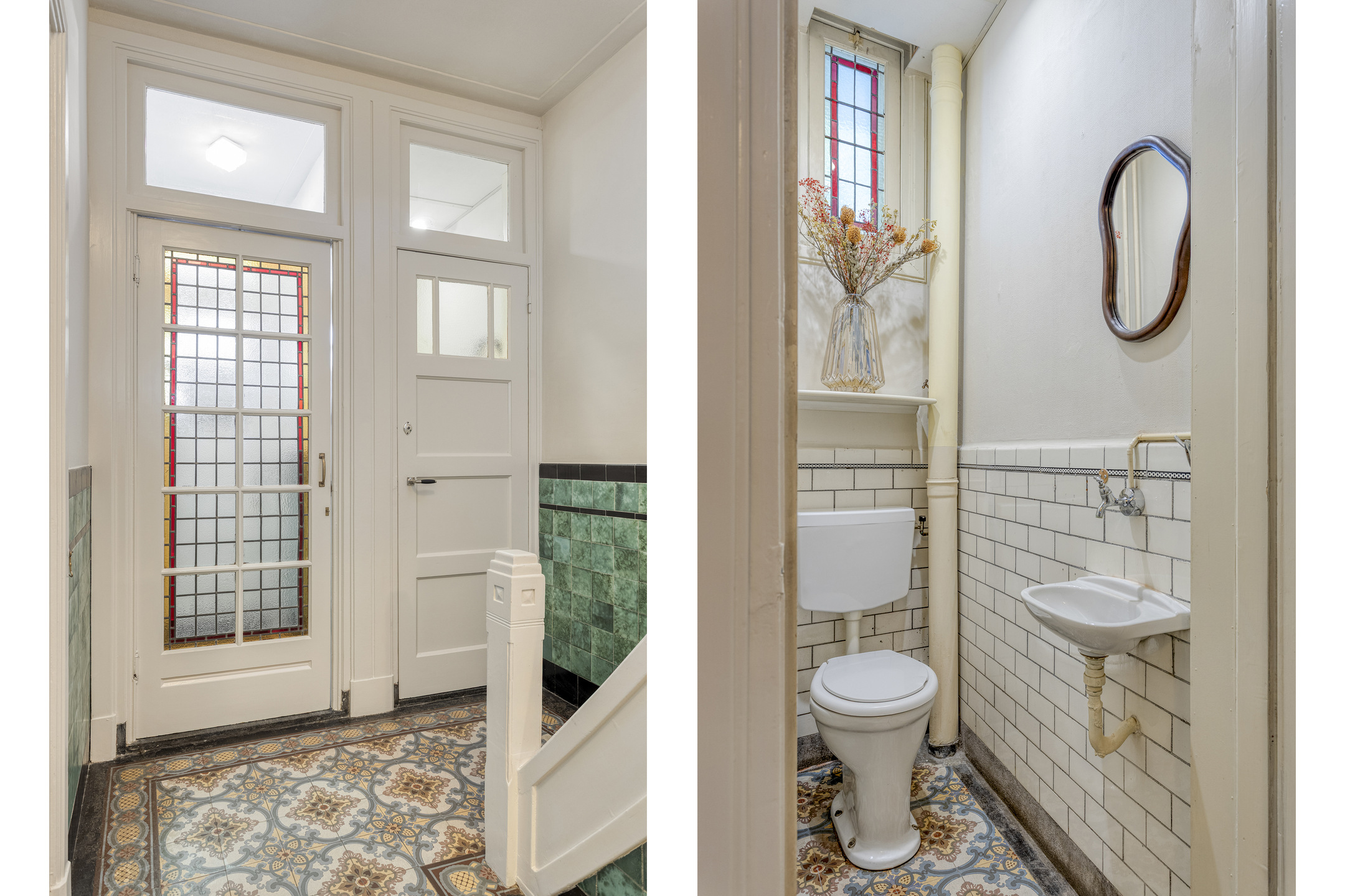 Begane grond: entree en hal voorzien van authentiek tegel- en glas-in-loodwerk, met trapopgang naar de 1e verdieping, toegang tot de kelder, meterkast (2022) en toilet voorzien van fonteintje. Ruime woonkamer-en-suite, bestaande uit een zitkamer aan de voorzijde met erker en gashaard, eetkamer en (tuin-)kamer aan de achterzijde met toegang tot het terras. Recent vernieuwde keuken met terrazzo werkblad, luxe SMEG-fornuis (5-pits inductie, 3 ovens), vaatwasser, koelkast en tuindeur.