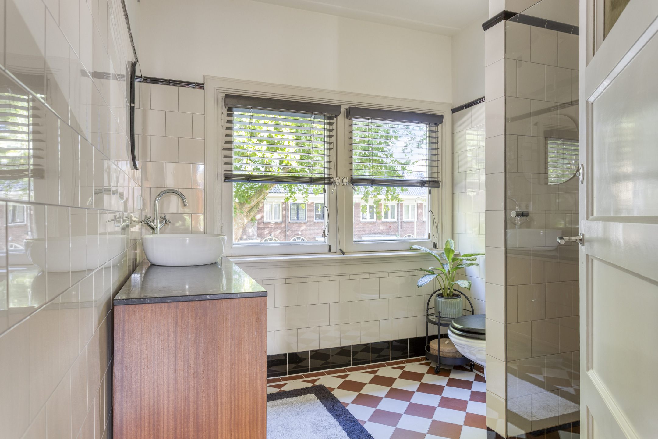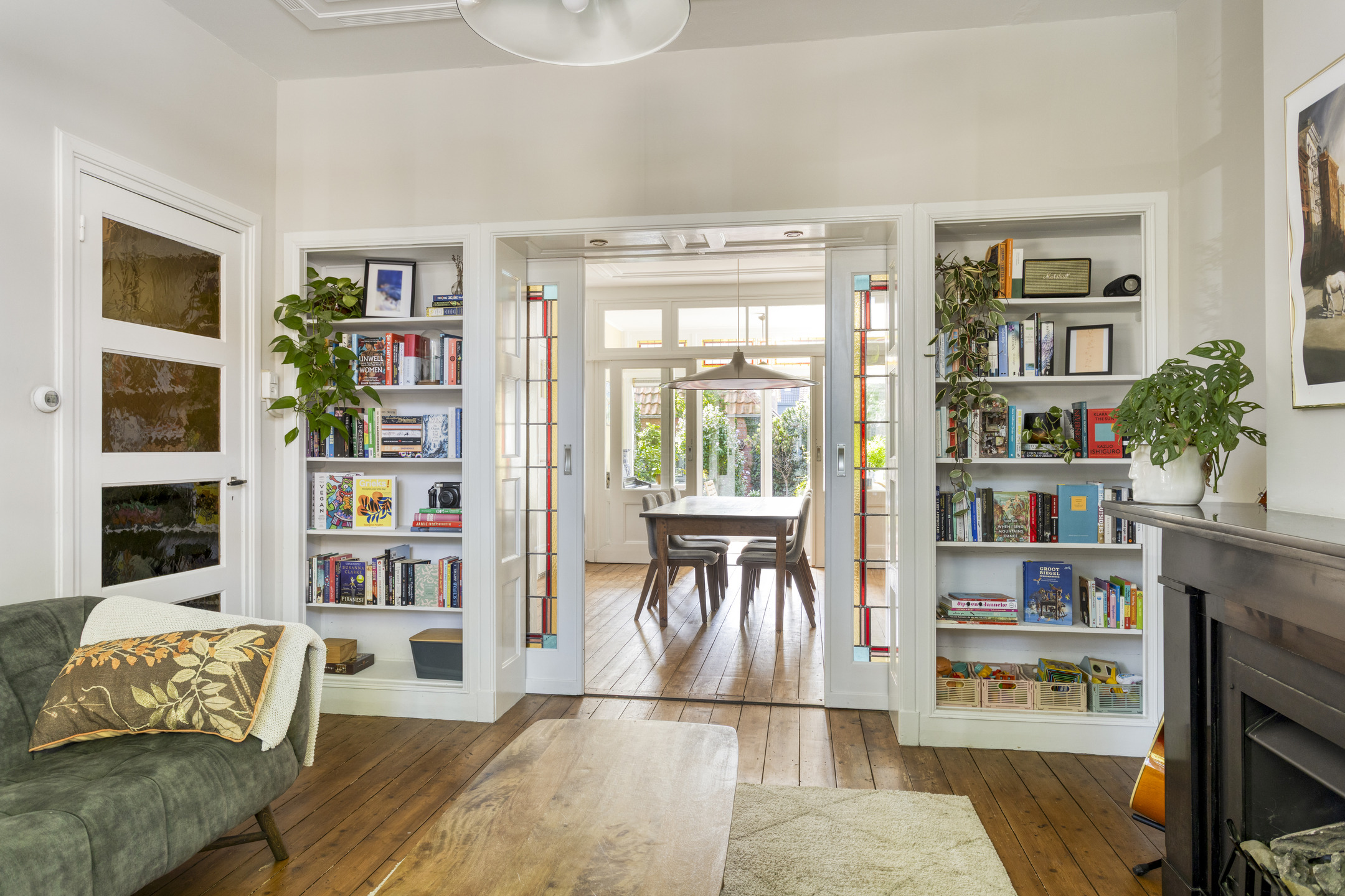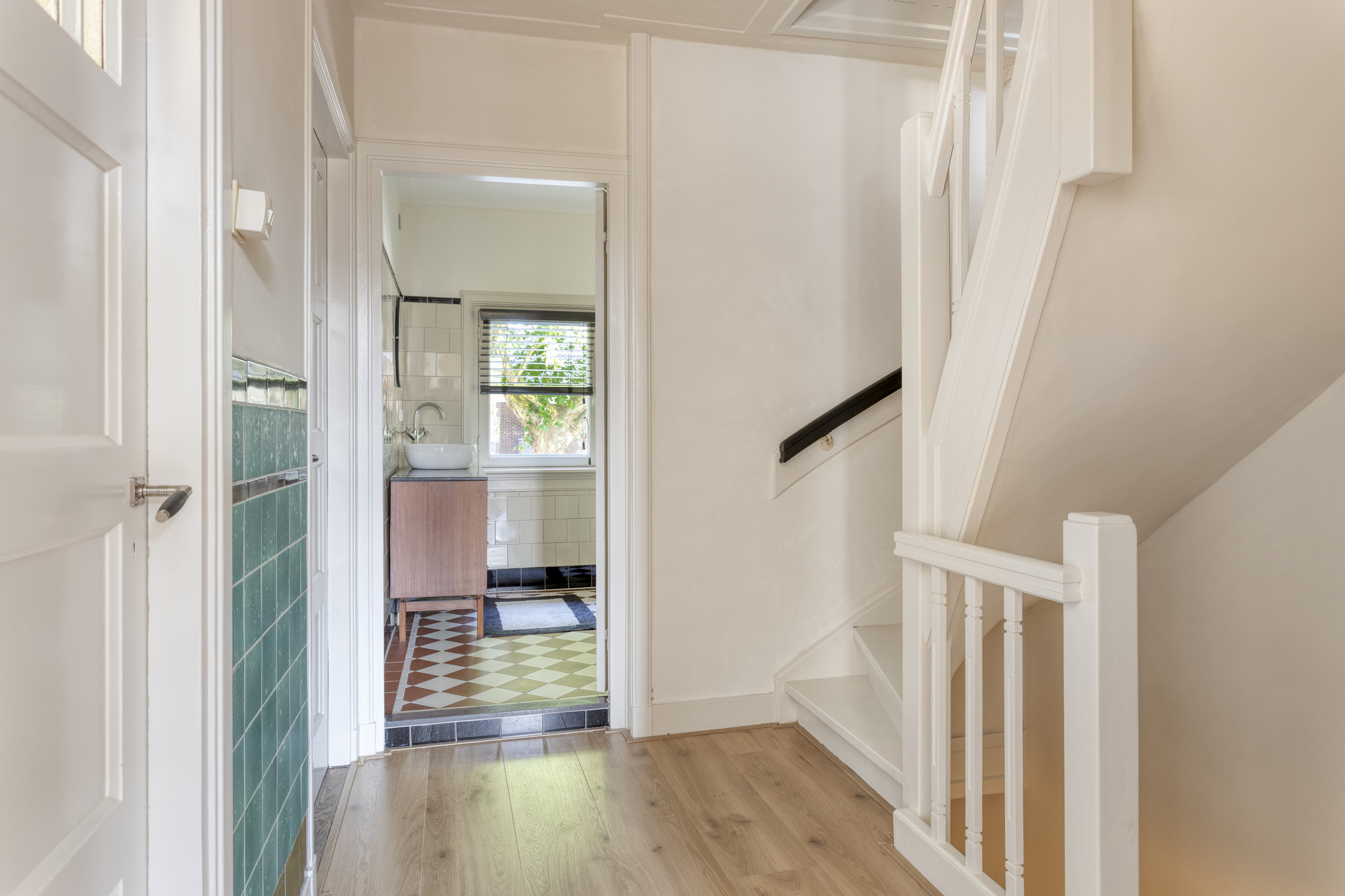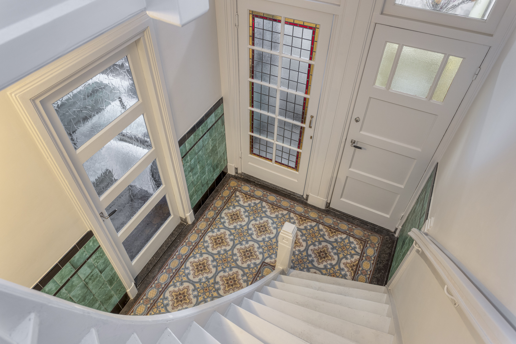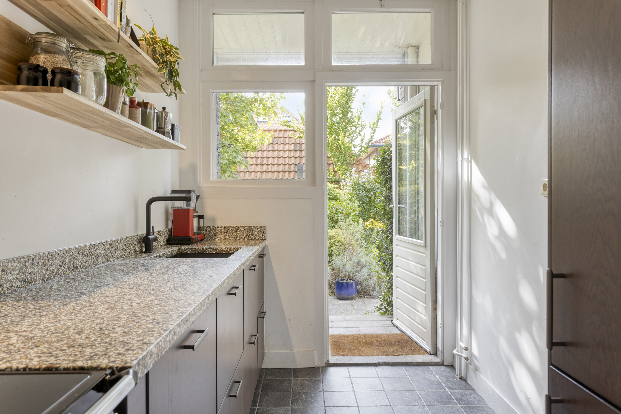 Begane grond: entree en hal voorzien van authentiek tegel- en glas-in-loodwerk, met trapopgang naar de 1e verdieping, toegang tot de kelder, meterkast (2022) en toilet voorzien van fonteintje. Ruime woonkamer-en-suite, bestaande uit een zitkamer aan de voorzijde met erker en gashaard, eetkamer en (tuin-)kamer aan de achterzijde met toegang tot het terras. Recent vernieuwde keuken met terrazzo werkblad, luxe SMEG-fornuis (5-pits inductie, 3 ovens), vaatwasser, koelkast en tuindeur.