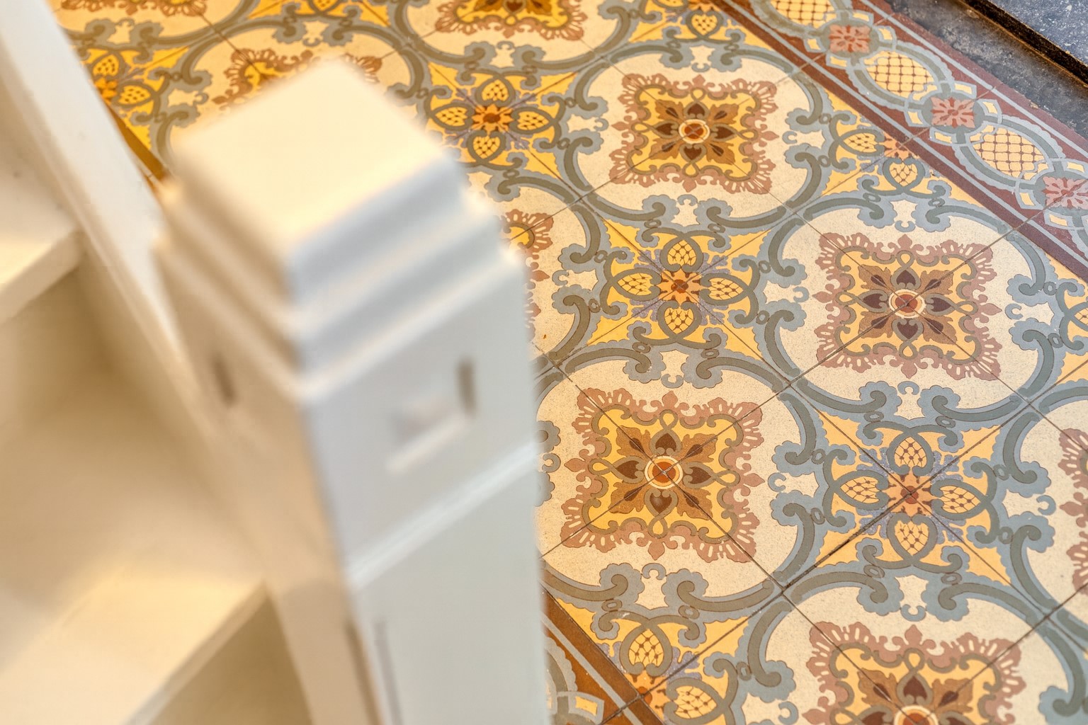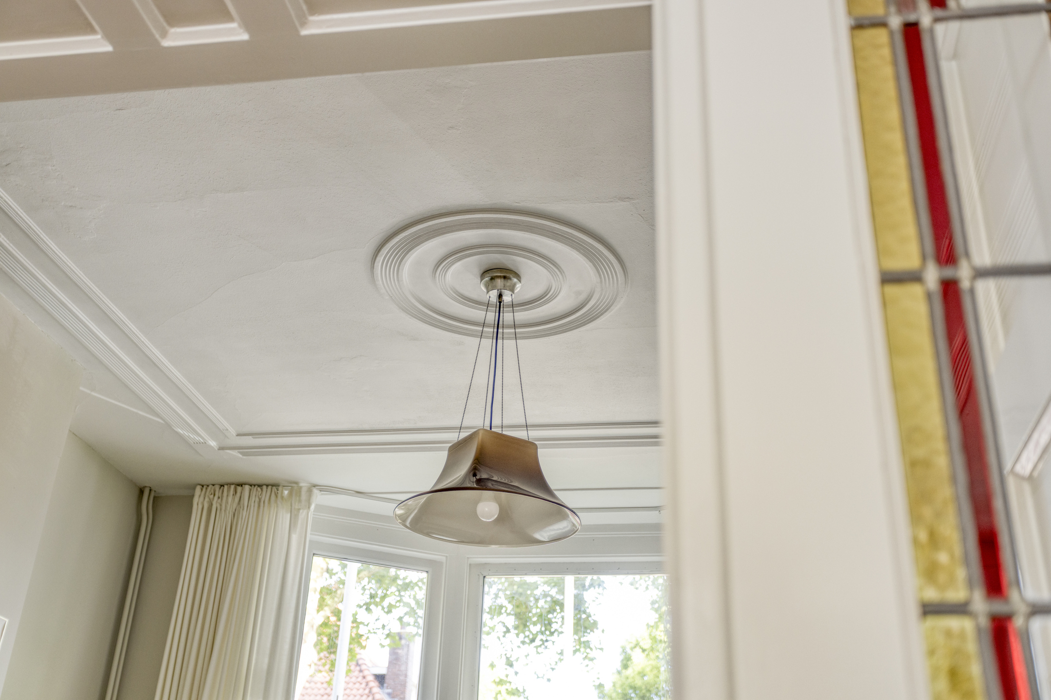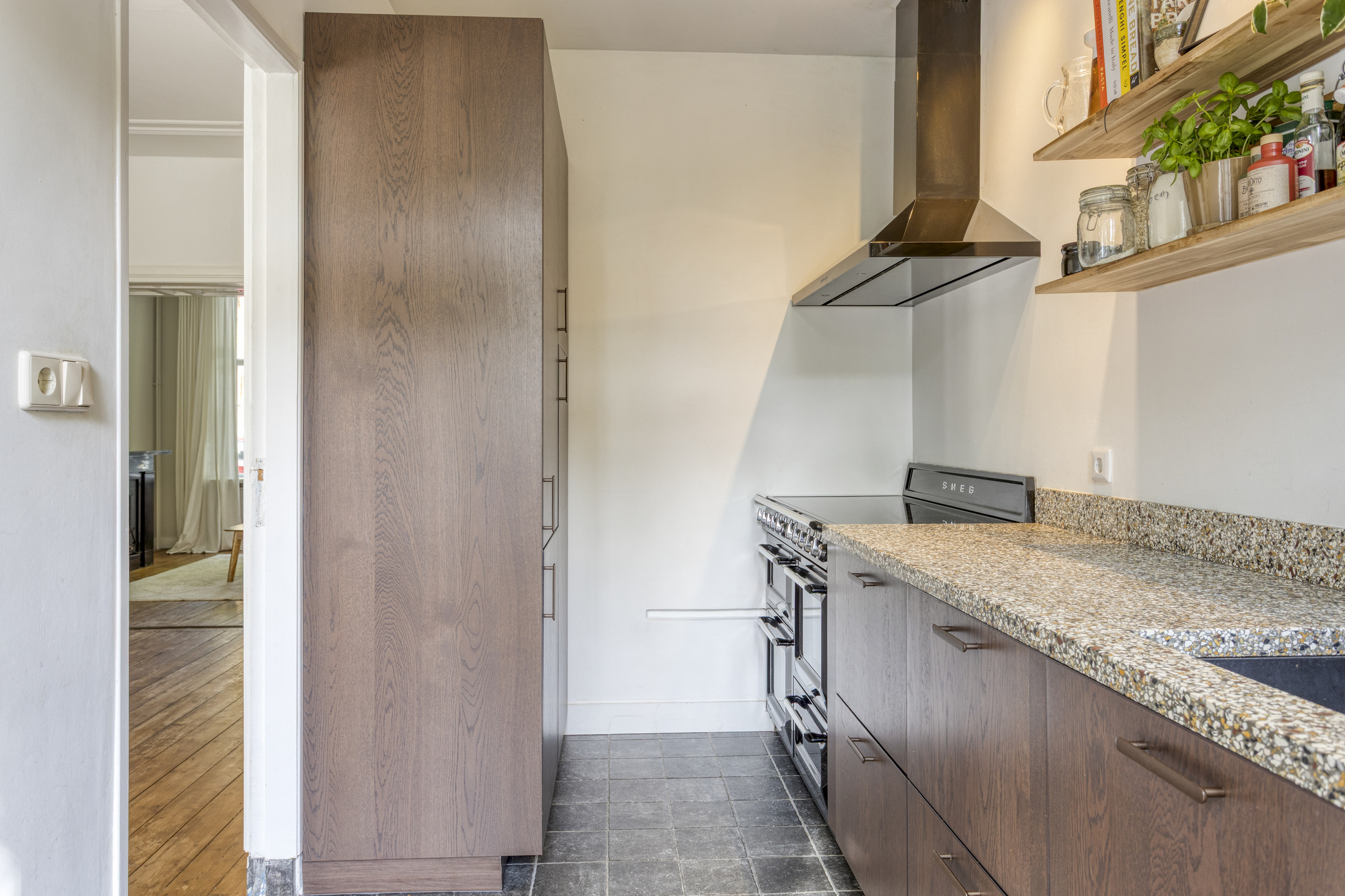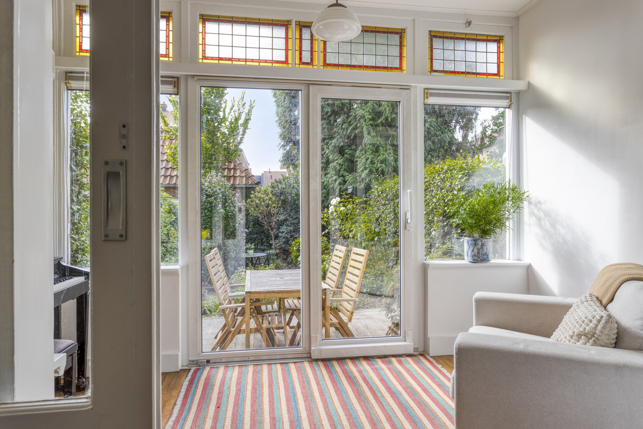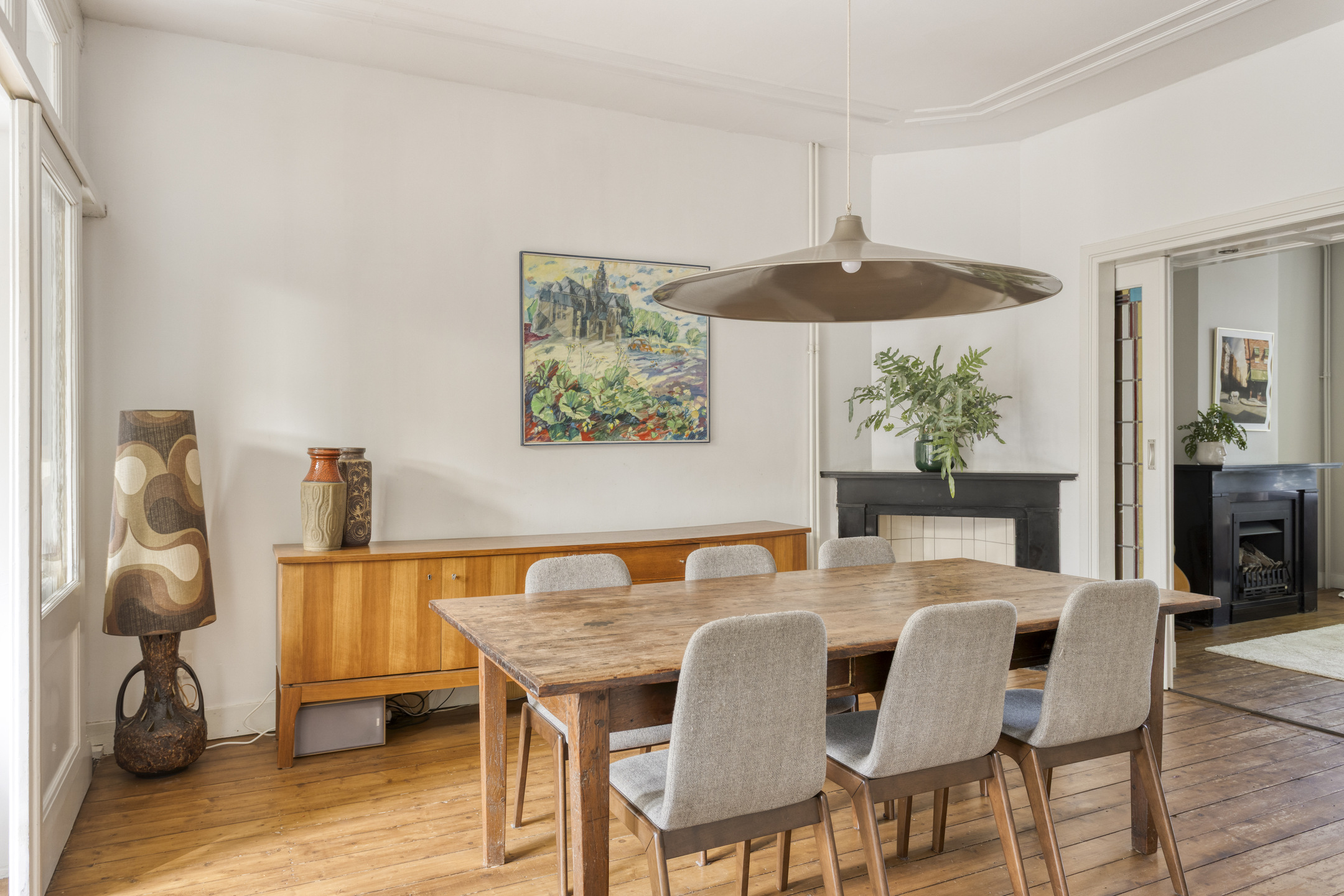 Begane grond: entree en hal voorzien van authentiek tegel- en glas-in-loodwerk, met trapopgang naar de 1e verdieping, toegang tot de kelder, meterkast (2022) en toilet voorzien van fonteintje. Ruime woonkamer-en-suite, bestaande uit een zitkamer aan de voorzijde met erker en gashaard, eetkamer en (tuin-)kamer aan de achterzijde met toegang tot het terras. Recent vernieuwde keuken met terrazzo werkblad, luxe SMEG-fornuis (5-pits inductie, 3 ovens), vaatwasser, koelkast en tuindeur.