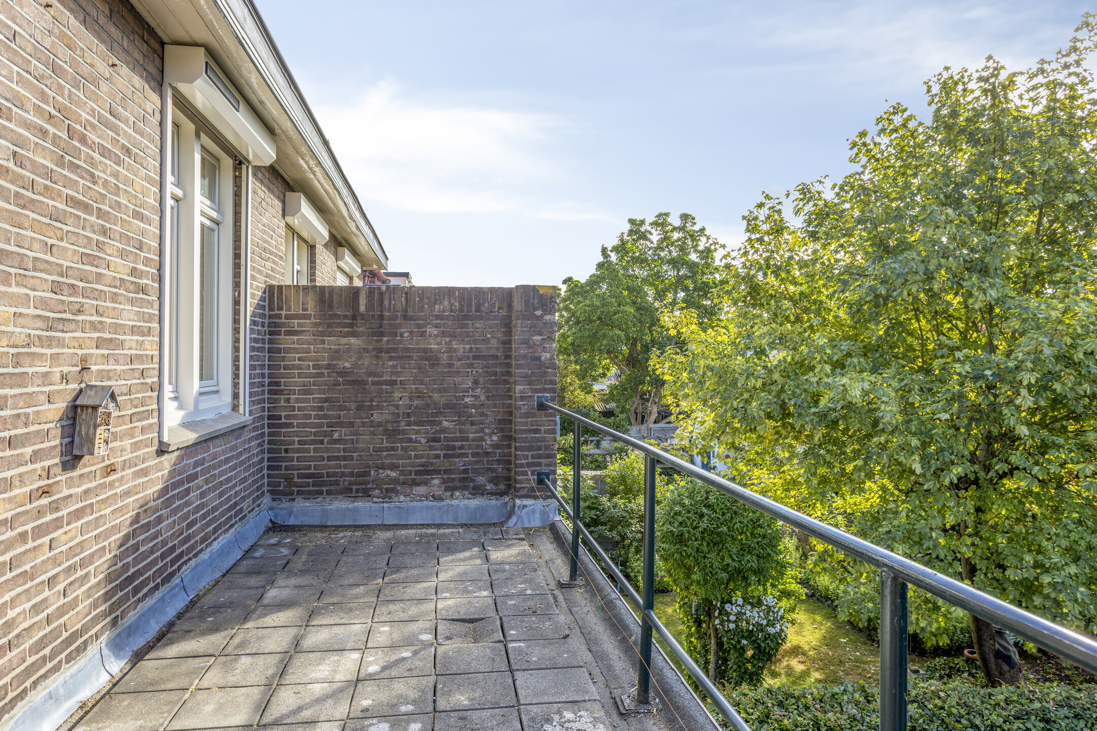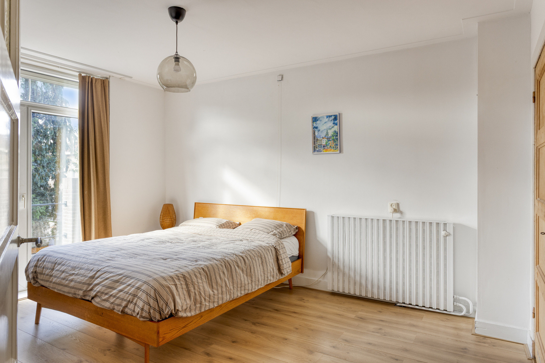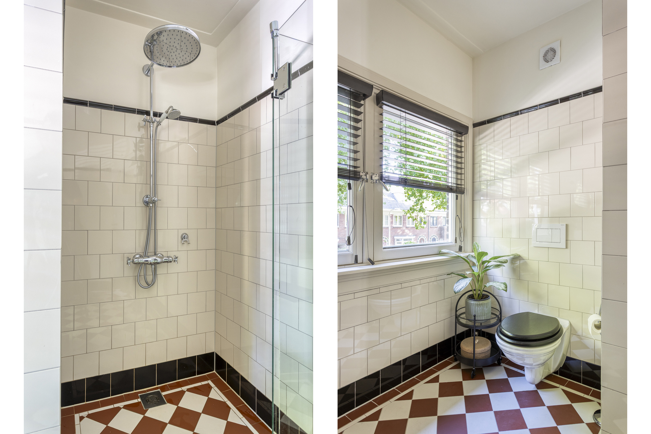 1e verdieping: overloop. Drie keurig afgewerkte slaapkamers ter grootte van circa 7,5 m², 11 m² en 15,5 m², allen voorzien van vaste kasten en rolluiken. De grote slaapkamer biedt toegang tot een royaal balkon aan de achterzijde ter grootte van circa 13,5 m². Badkamer in klassieke stijl, voorzien van regendouche, sfeervol wastafelmeubel, en tweede toilet (wandcloset).