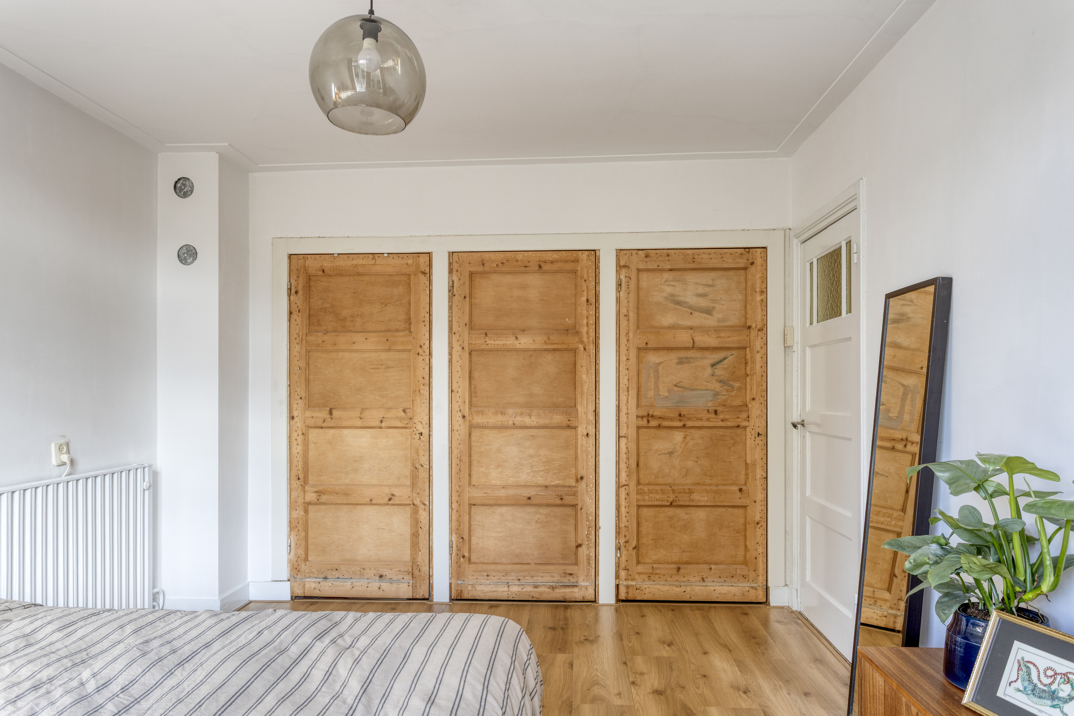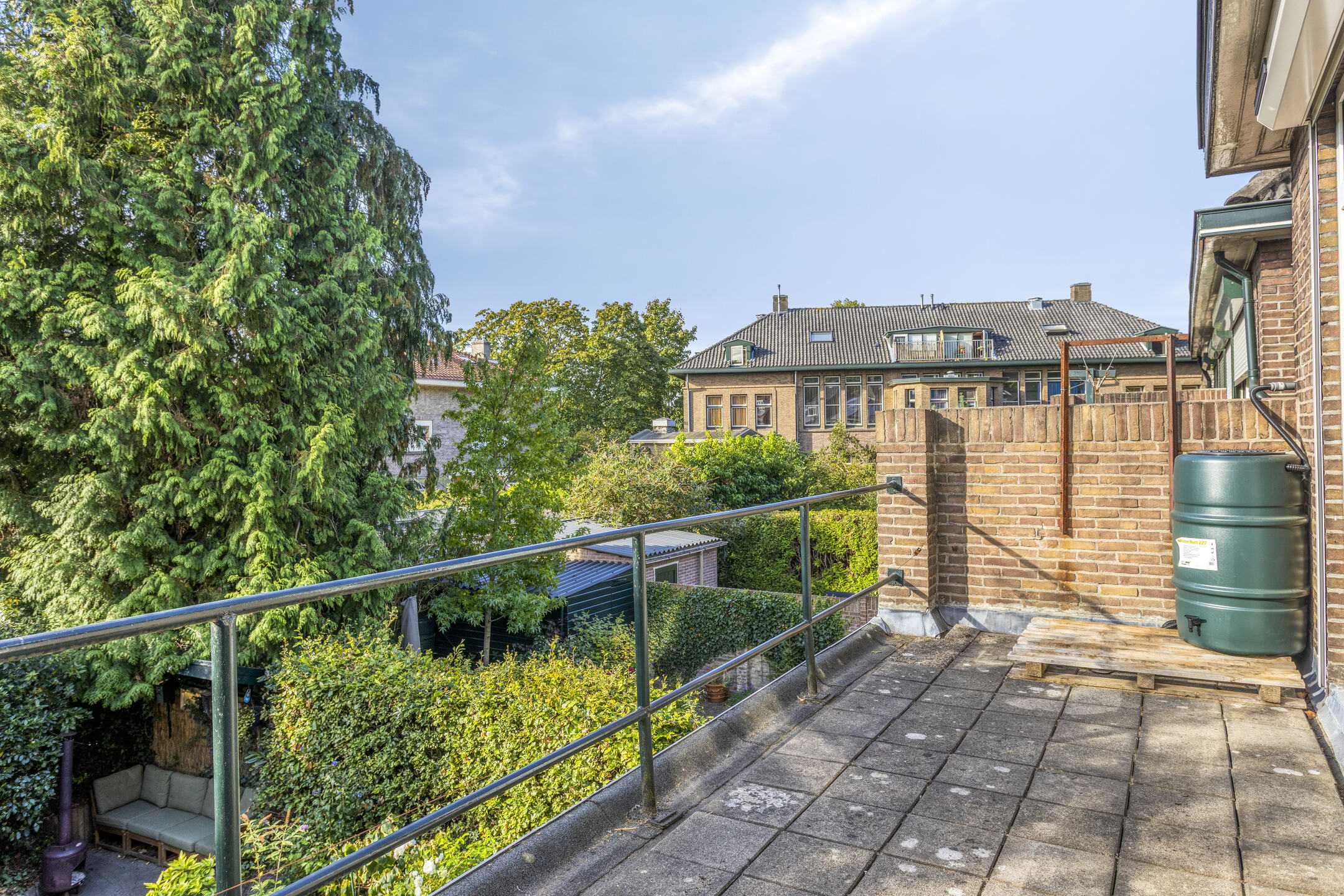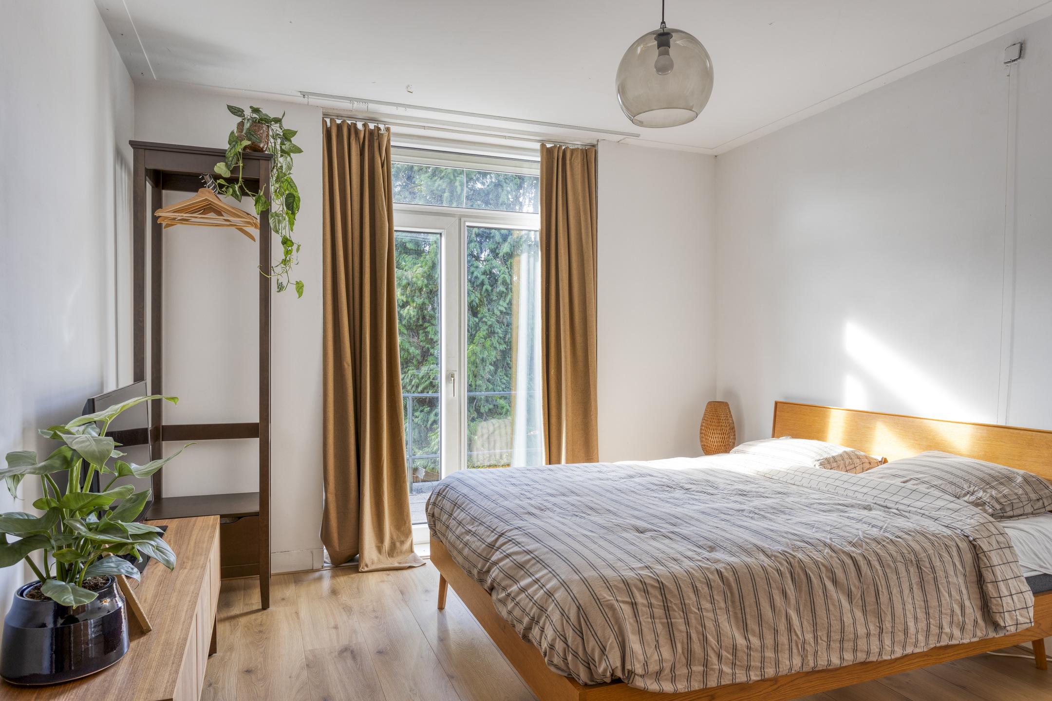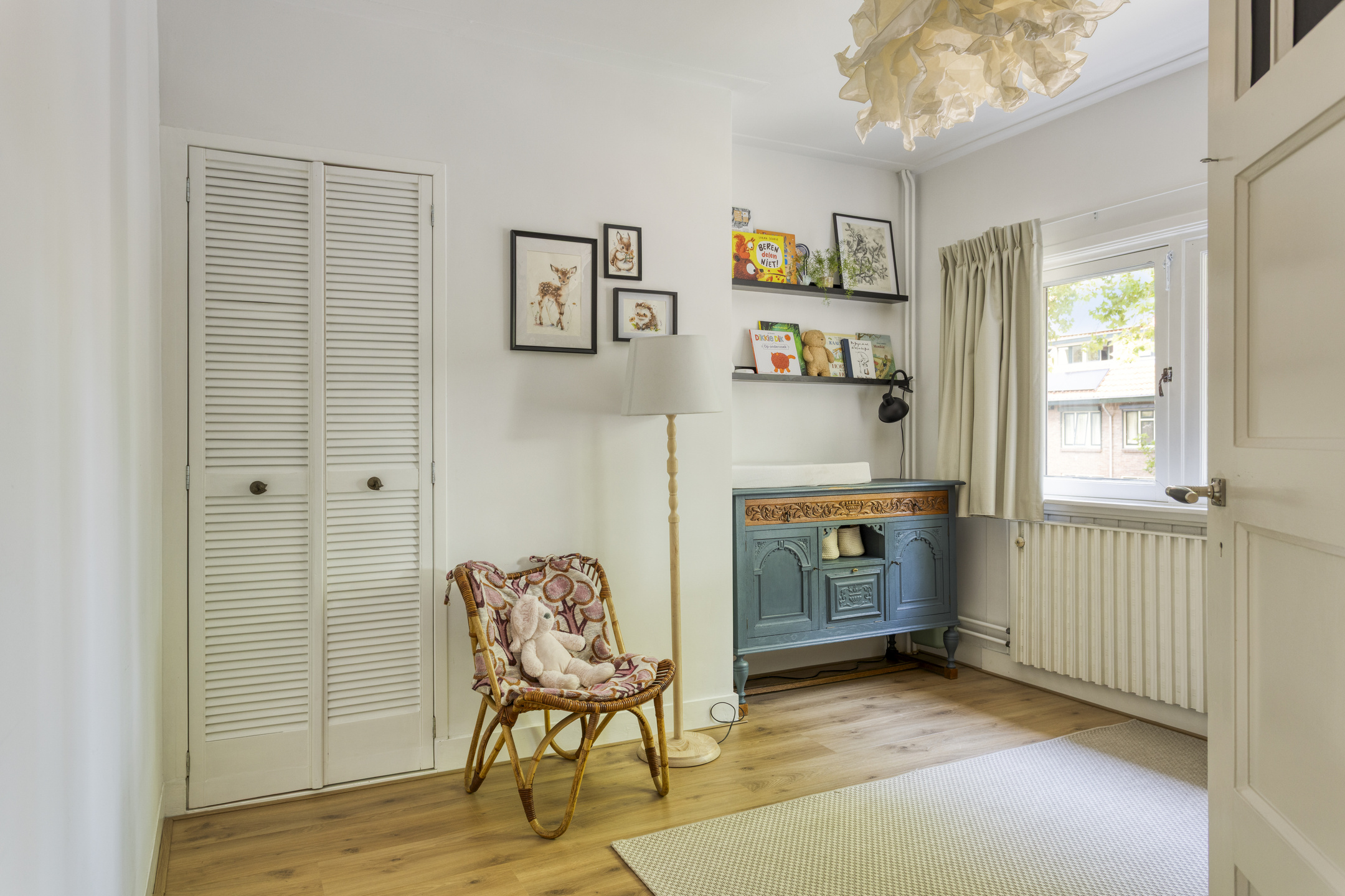 1e verdieping: overloop. Drie keurig afgewerkte slaapkamers ter grootte van circa 7,5 m², 11 m² en 15,5 m², allen voorzien van vaste kasten en rolluiken. De grote slaapkamer biedt toegang tot een royaal balkon aan de achterzijde ter grootte van circa 13,5 m². Badkamer in klassieke stijl, voorzien van regendouche, sfeervol wastafelmeubel, en tweede toilet (wandcloset).