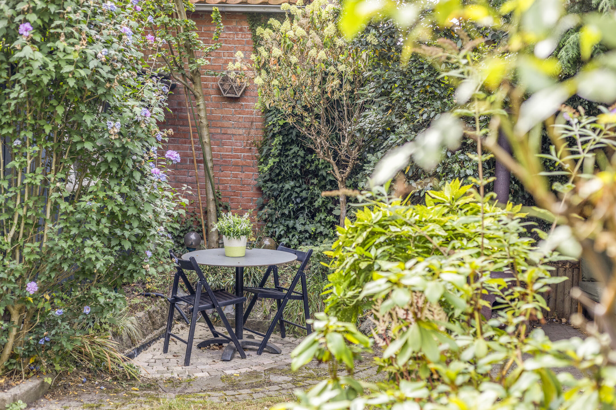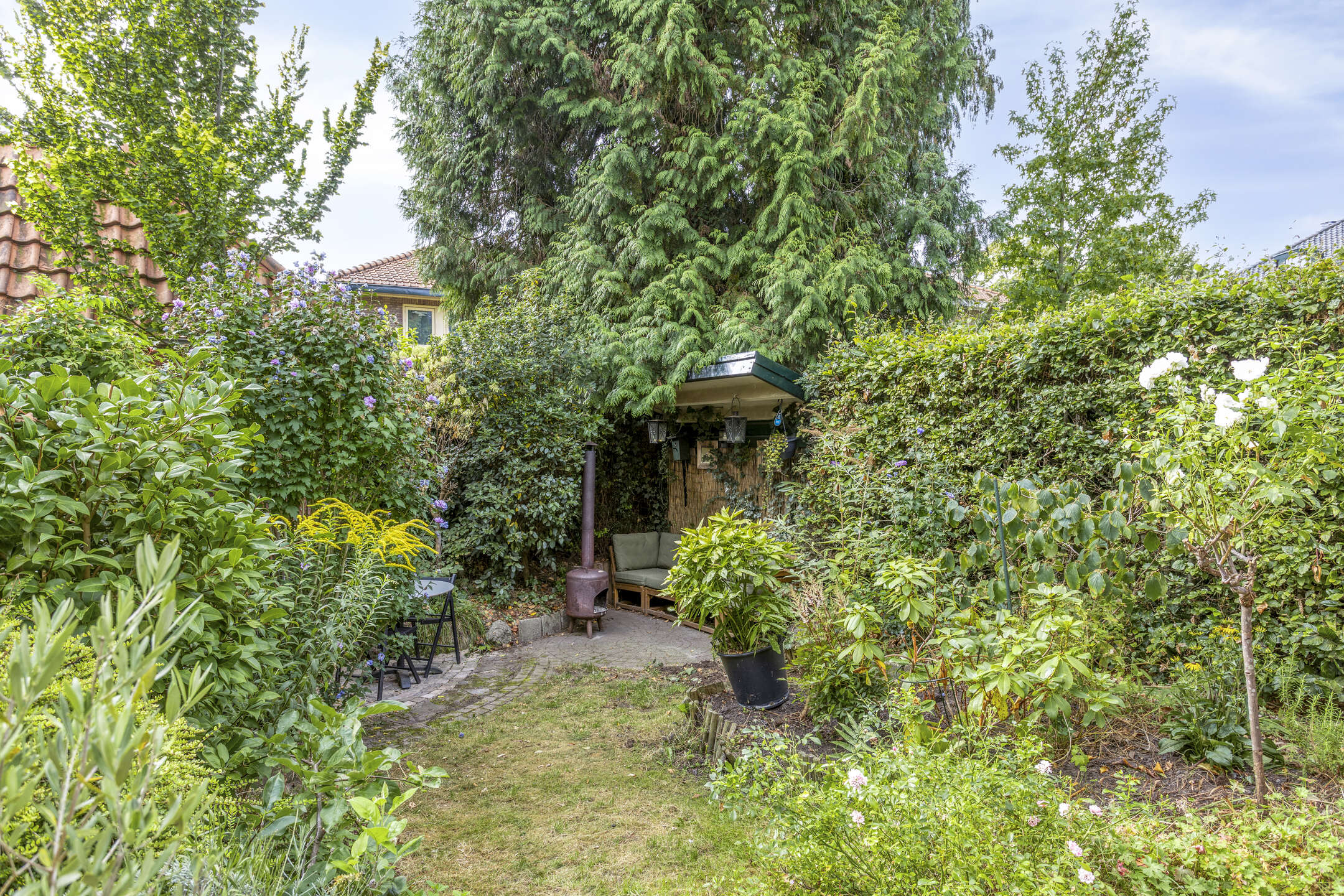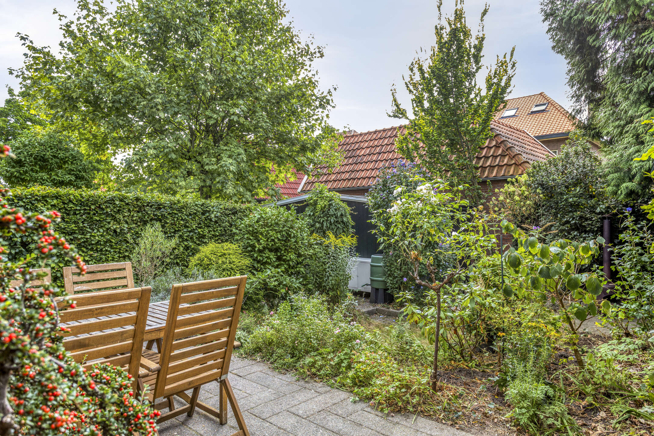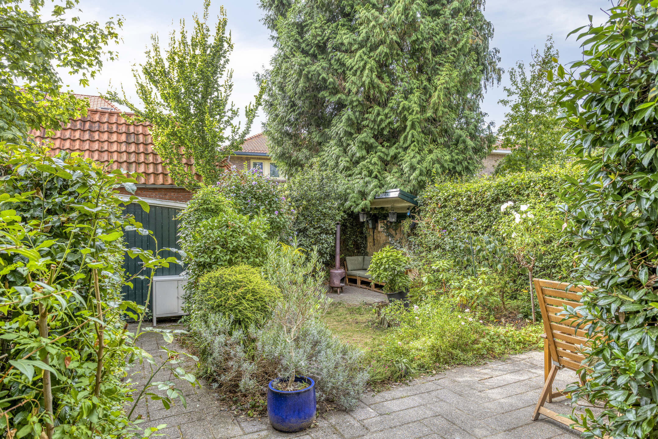 Fraai aangelegde achtertuin (78m²) op het zuidoosten met terras tegen de achtergevel, voorzien van elektrisch zonnescherm, gazon, borders, houten berging en een zitje achterin. De tuin is achterom te bereiken via het pad langs de woning. Parkeren is mogelijk in de straat op de openbare parkeervoorzieningen.