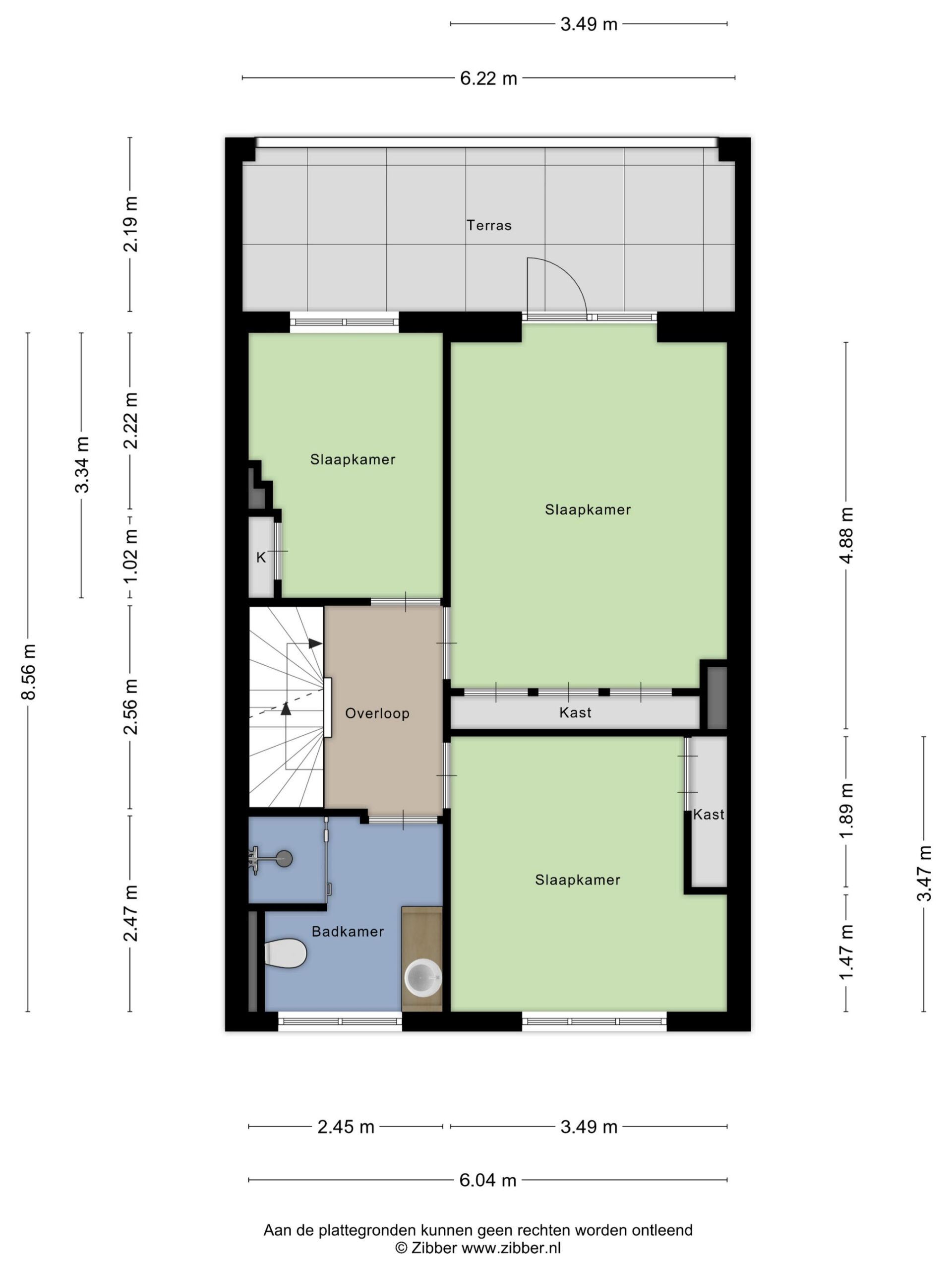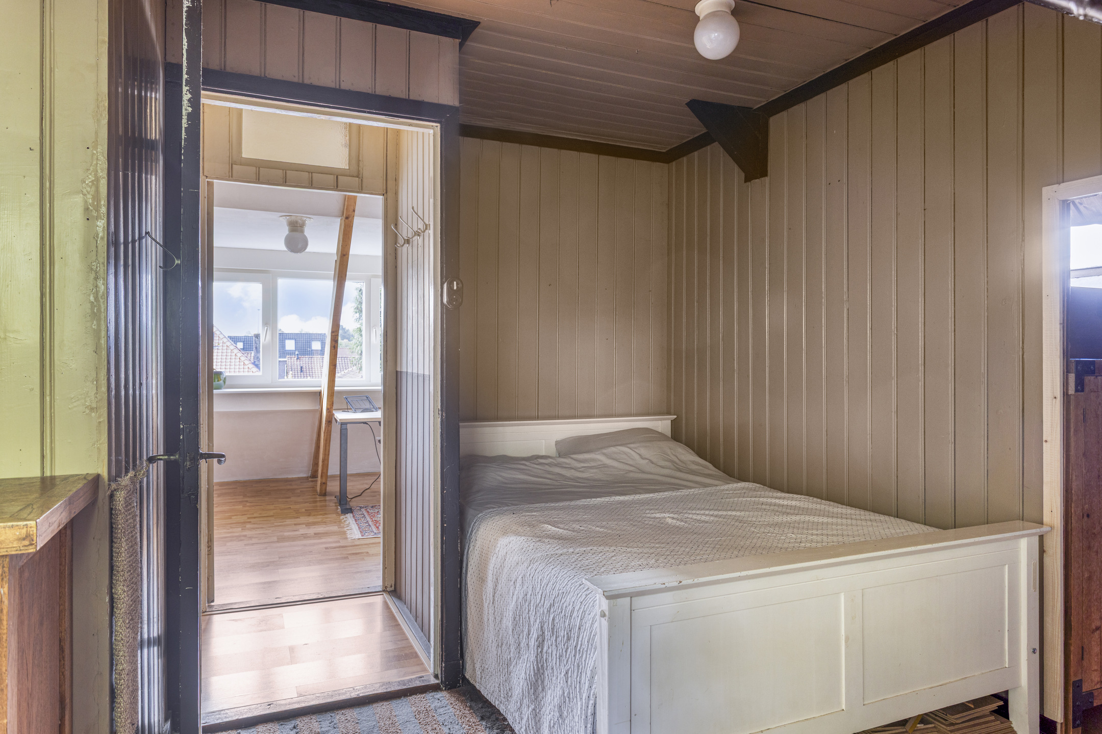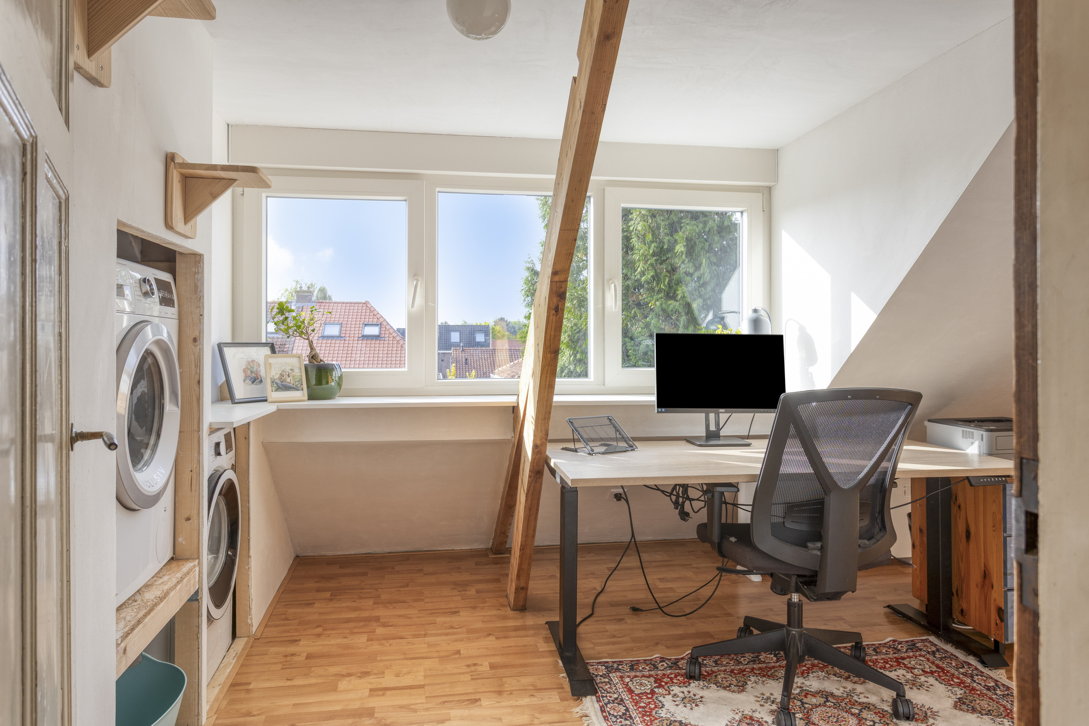 2e Verdieping: overloop. Twee slaapkamers ter grootte van circa 9,5 m² en 10,5 m², waarvan één met eigen wastafel en één met cv-opstelplaats en wasmachine-aansluiting. Op de slaapkamer aan de achterzijde van de woning is ook zonwering aanwezig.