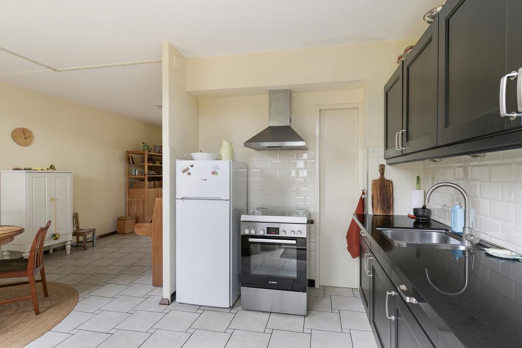 Begane grond: entree, hal met meterkast en garderobe. Ruime L-vormige woonkamer met zithoek aan de voorzijde en eethoek aan de achterzijde, voorzien van plavuizen vloer met vloerverwarming. Open keuken met tuindeur, voorzien van stenen werkblad, afzuigkap en vaatwasser.