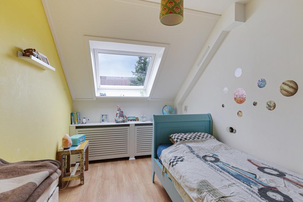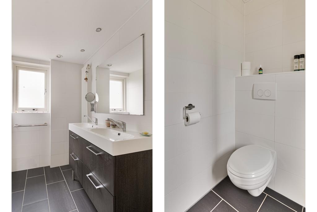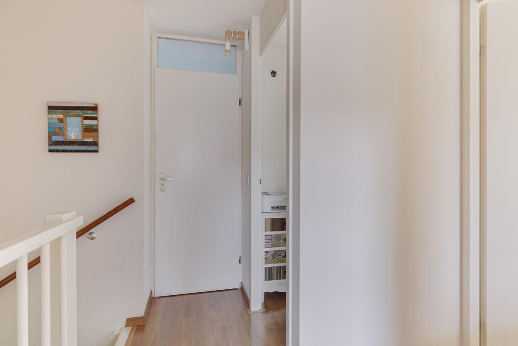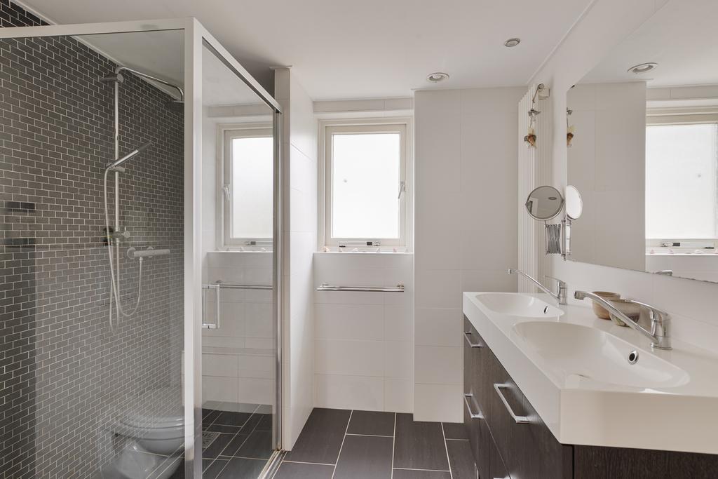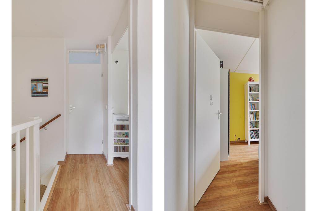 1e Verdieping: overloop met vlizotrap naar de bergzolder. Drie slaapkamers alle ter grootte van circa 10 m², voorzien van nette laminaatvloer en dubbele glas. Moderne (vergrootte) badkamer, voorzien van inloopdouche, dubbele wastafel, en wandcloset.