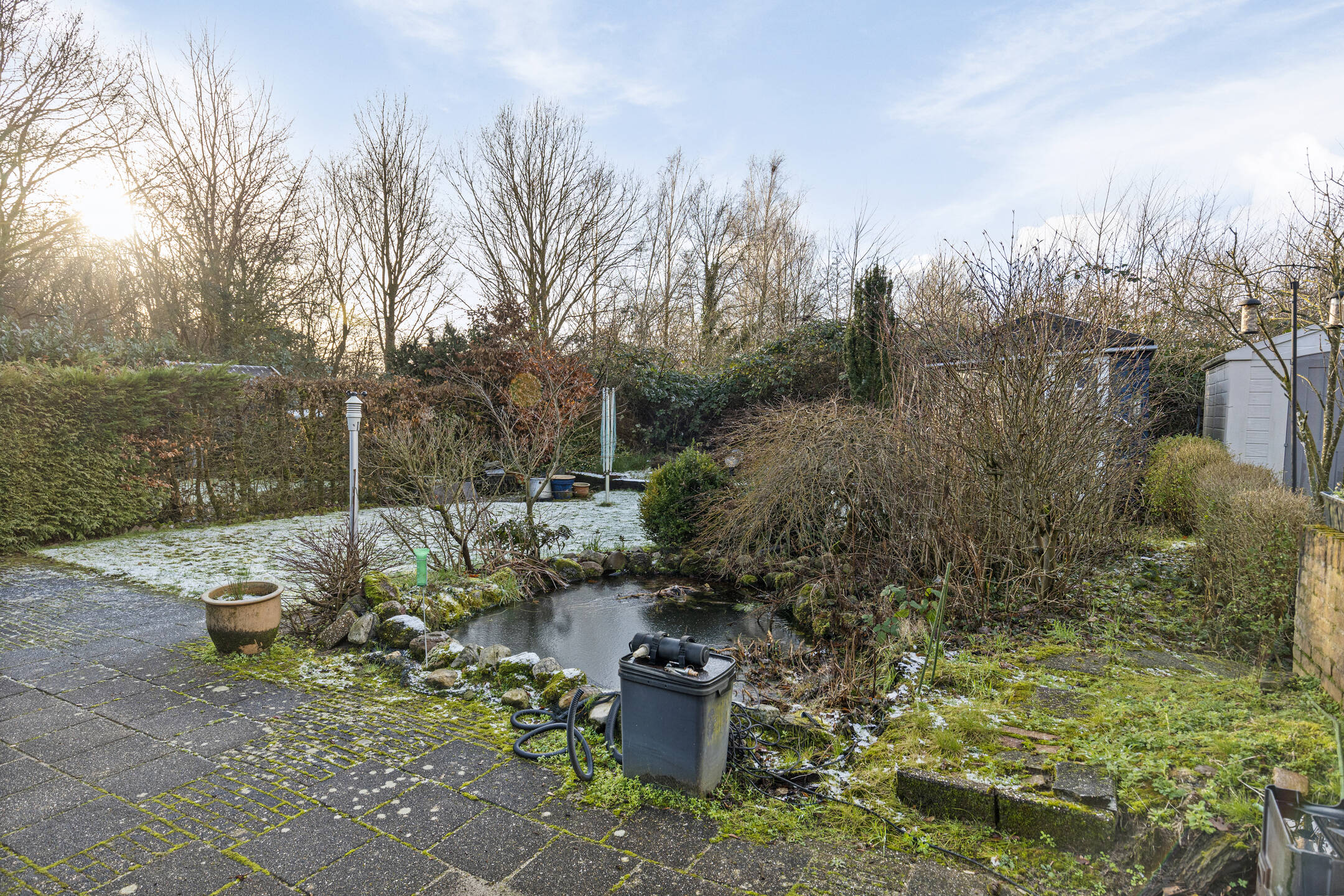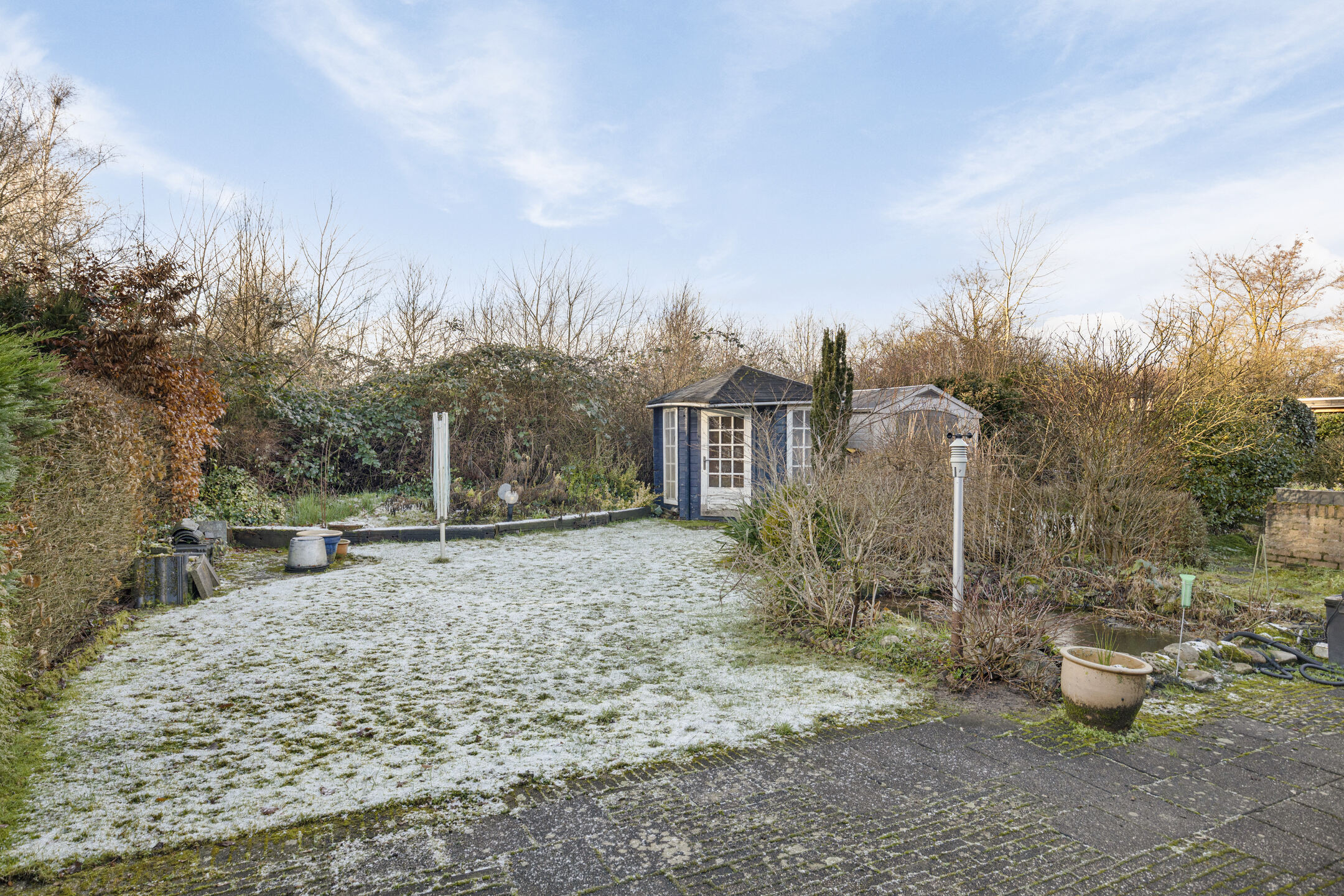 Verzorgde achtertuin op het westen met terras tegen de achtergevel, elektrisch bedienbaar zonnescherm, siertuin, meerdere borders, vijvers, gazon en houten tuinhuisje. De voortuin bestaat uit een ruime siertuin en oprit met parkeerruimte voor minstens twee personenauto’s.