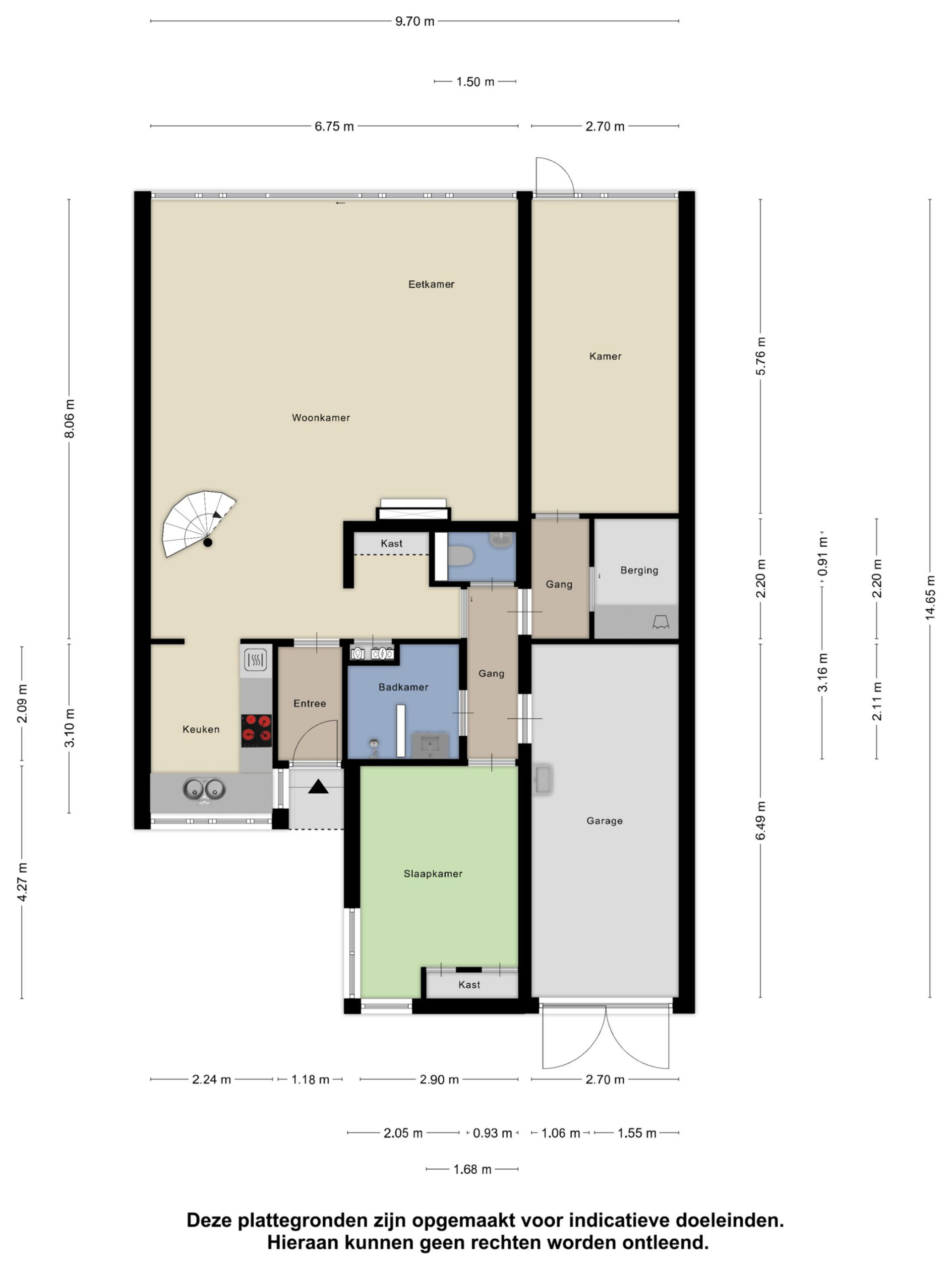 Begane grond: entree, hal met garderobe, meterkast en toilet voorzien van wandcloset en fonteintje. Riante tuingerichte woonkamer met hoog plafond met dakraam, schuifpui naar de achtertuin, gashaard en open trap naar de 1e verdieping. Half open keuken voorzien van koelkast, combi-magnetron, 4-pits inductiekookplaat, afzuigkap en vaatwasser. Twee (slaap-)kamers ter grootte van 11 m² en 15,5 m², waarvan één met tuindeur en één voorzien van kast. Badkamer voorzien van inloopdouche, wastafelmeubel en kolomkast. Berging/bijkeuken met wasmachine-aansluiting. Inpandige garage ter grootte van circa 17,5 m², voorzien van uitstortgootsteen en openslaande garagedeuren.