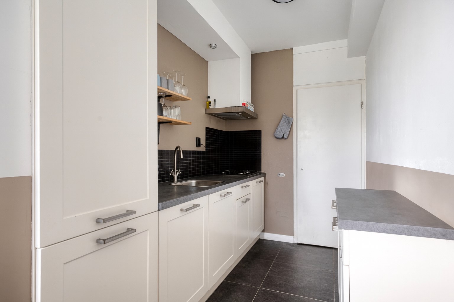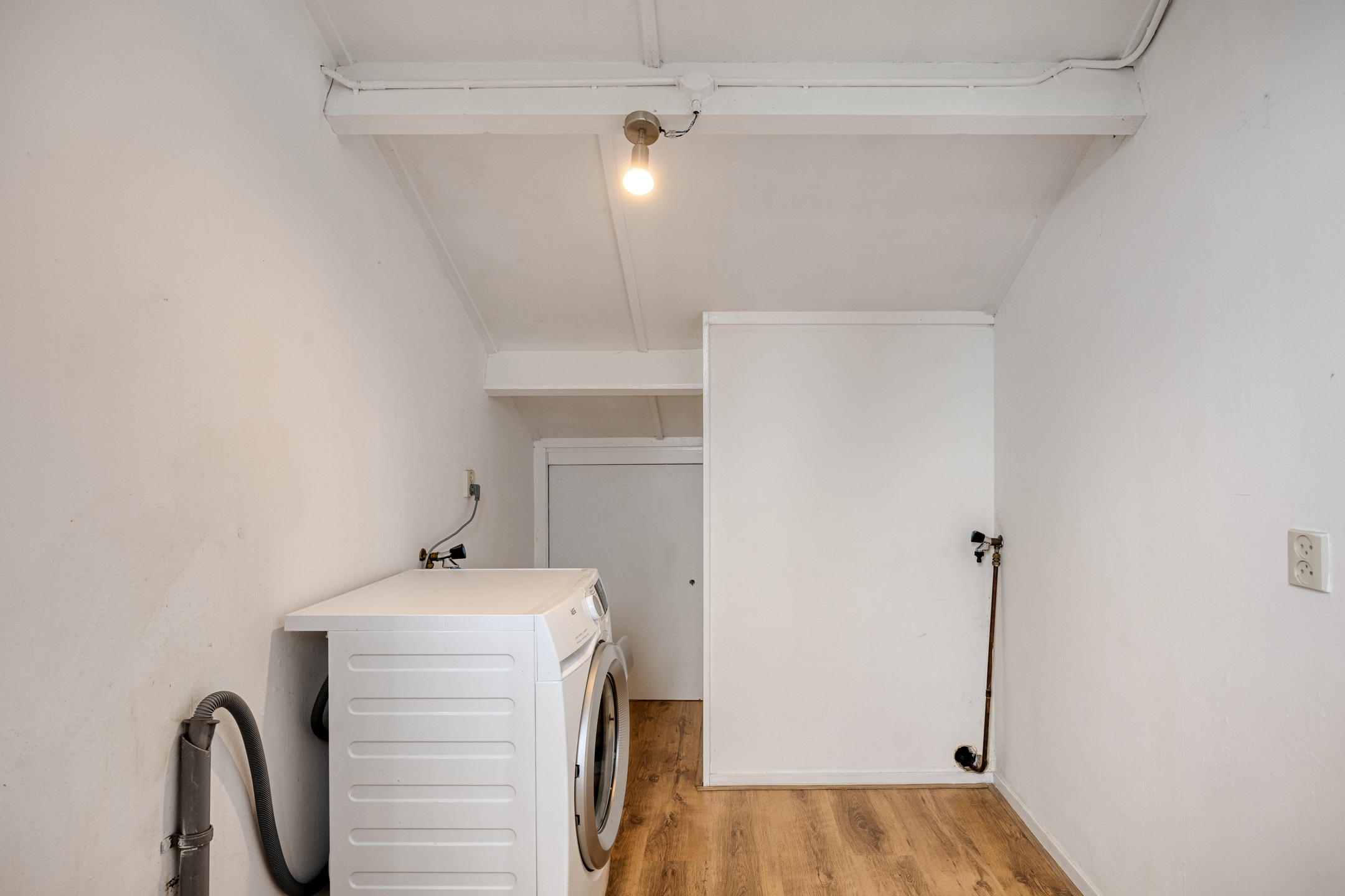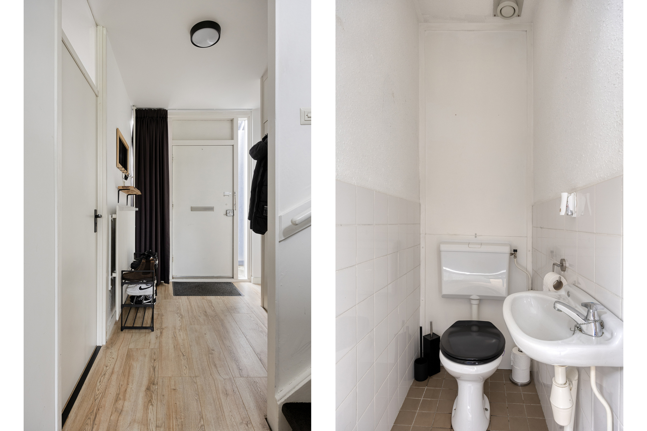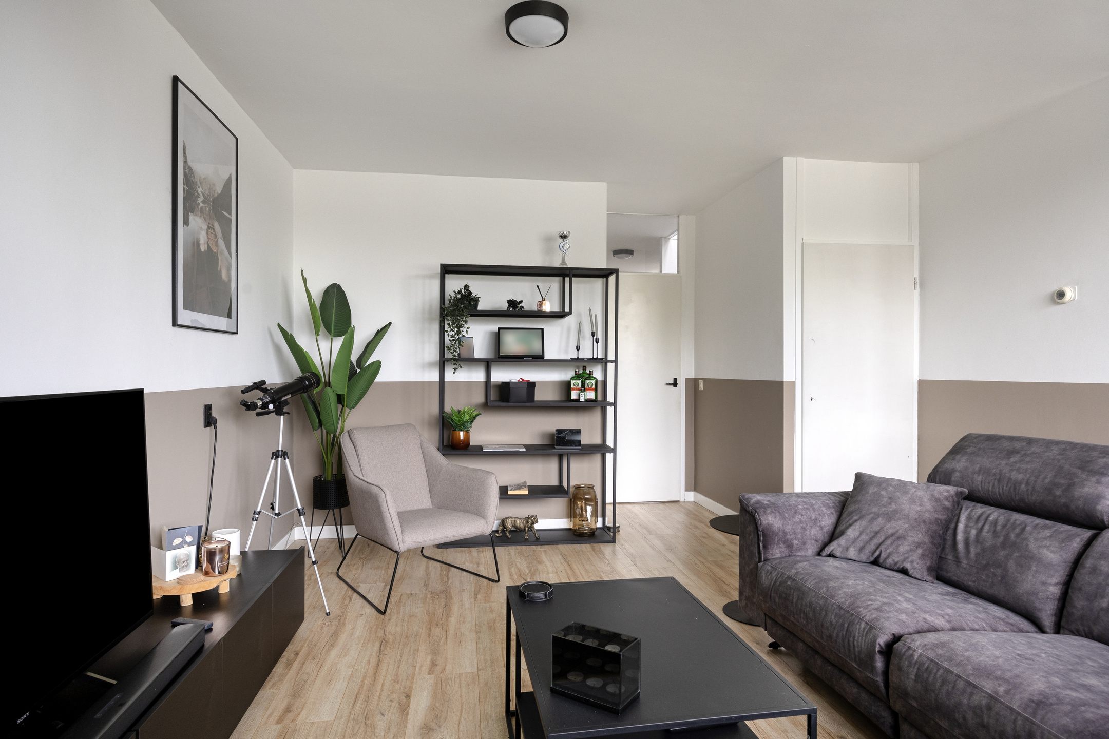 1e woonverdieping: hal, meterkast, toegang tot toilet, badkamer, slaapkamer (ca. 9 m²) en woonkamer. In de hal is de trapopgang naar de 2e verdieping. Fijne ruime en lichte woonkamer, vaste kast en doorloop naar de moderne in 2019 vernieuwde half open keuken. In de hal, woonkamer en slaapkamer ligt een nette laminaatvloer. De keuken is voorzien van inbouwapparatuur, waaronder een vaatwasser, koelkast vriezer en een 4-pits gaskookplaat met afzuigkap. In de keuken is ook een vaste kast met cv-opstelling (Remeha Avanta, bouwjaar 2015). De badkamer is voorzien van een douche, wastafel en een aansluiting voor de wasmachine.