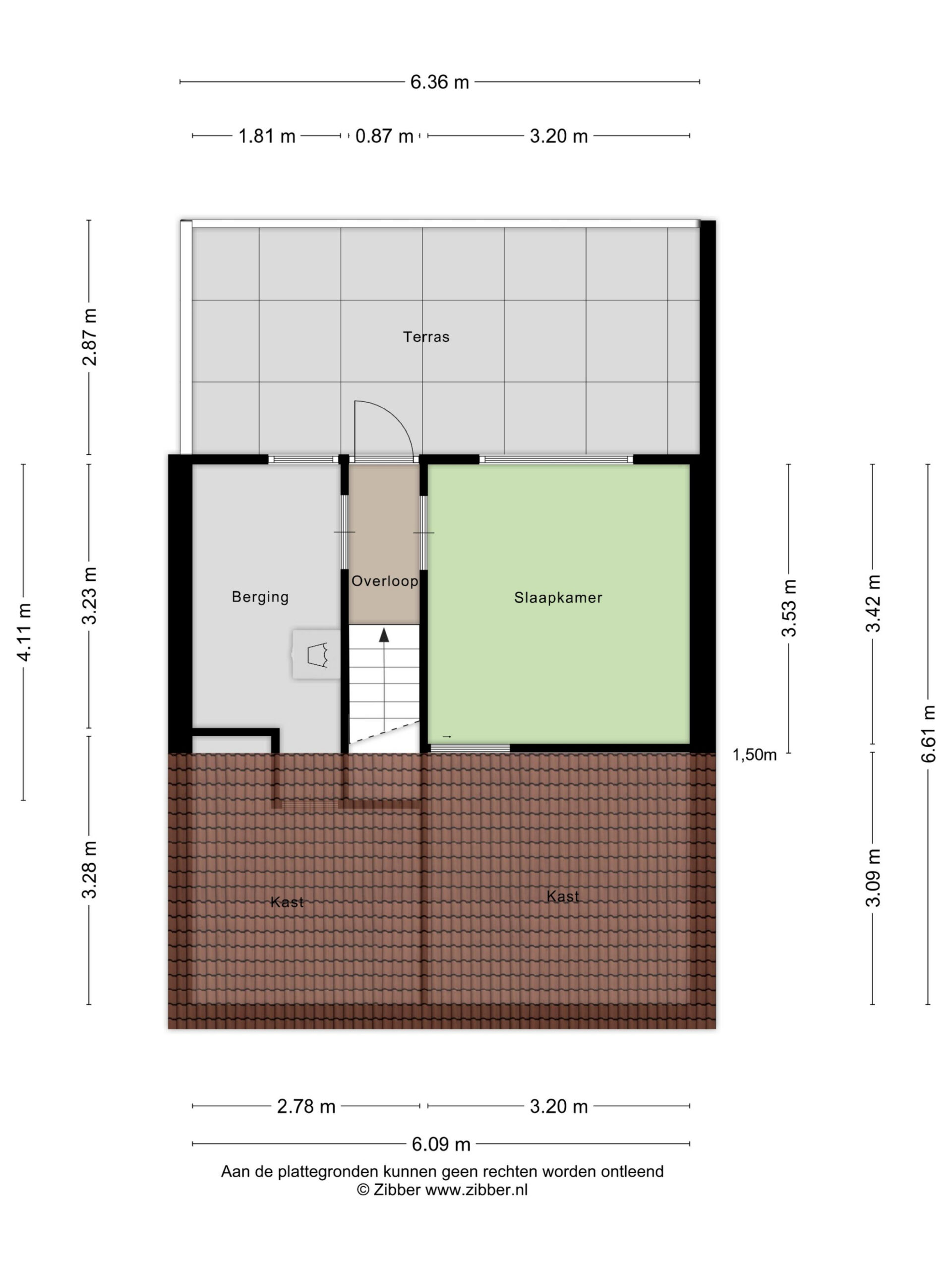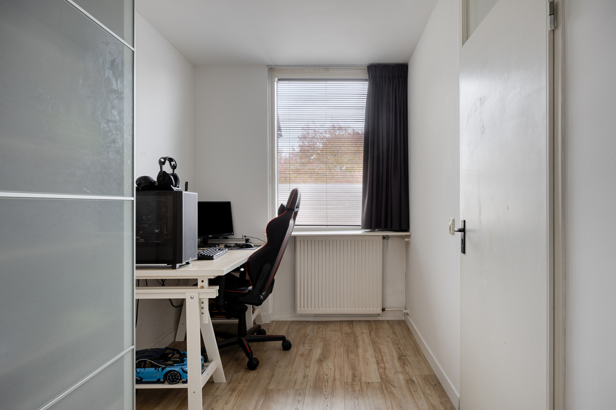 2e Verdieping: Overloop, twee slaapkamers (ca. 6 en 11 m²) beide voorzien van een nette laminaatvloer. Op de kleinste kamer zijn de wasmachine en wasdroger opgesteld en is een bergruimte onder de schuine kap bereikbaar. De grootste slaapkamer heeft eveneens bergruimte en dat is via een schuifsysteem bereikbaar. Het dak is in de grootste slaapkamer geïsoleerd en afgewerkt met gestucte gipsplaten. Tevens heeft deze kamer een rolluik. Via de overloop is het ruime dakterras te bereiken. Dit dakterras is gelegen op het oosten en voorzien van tegels en heeft een prachtig uitzicht over een leuke dierenweide.