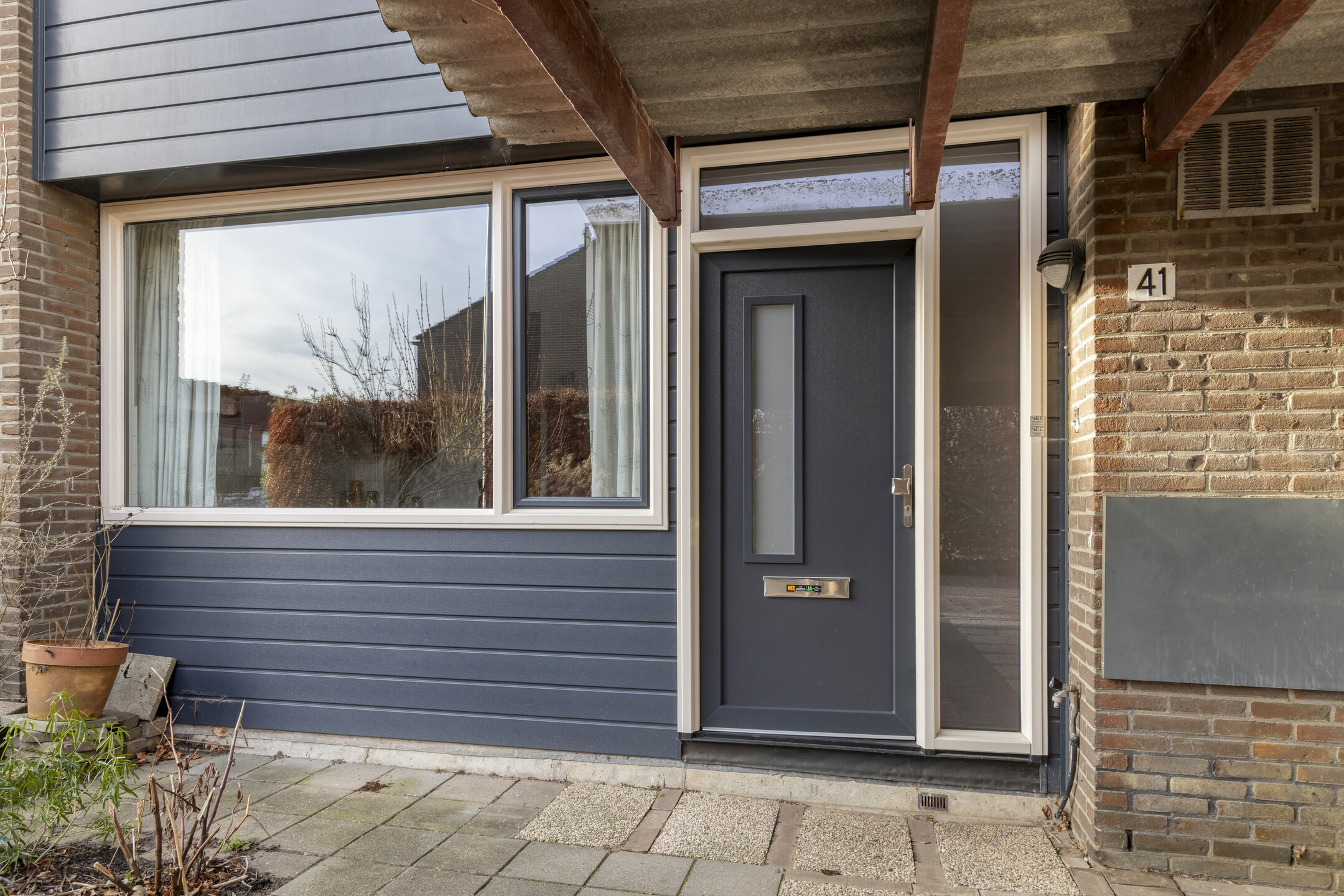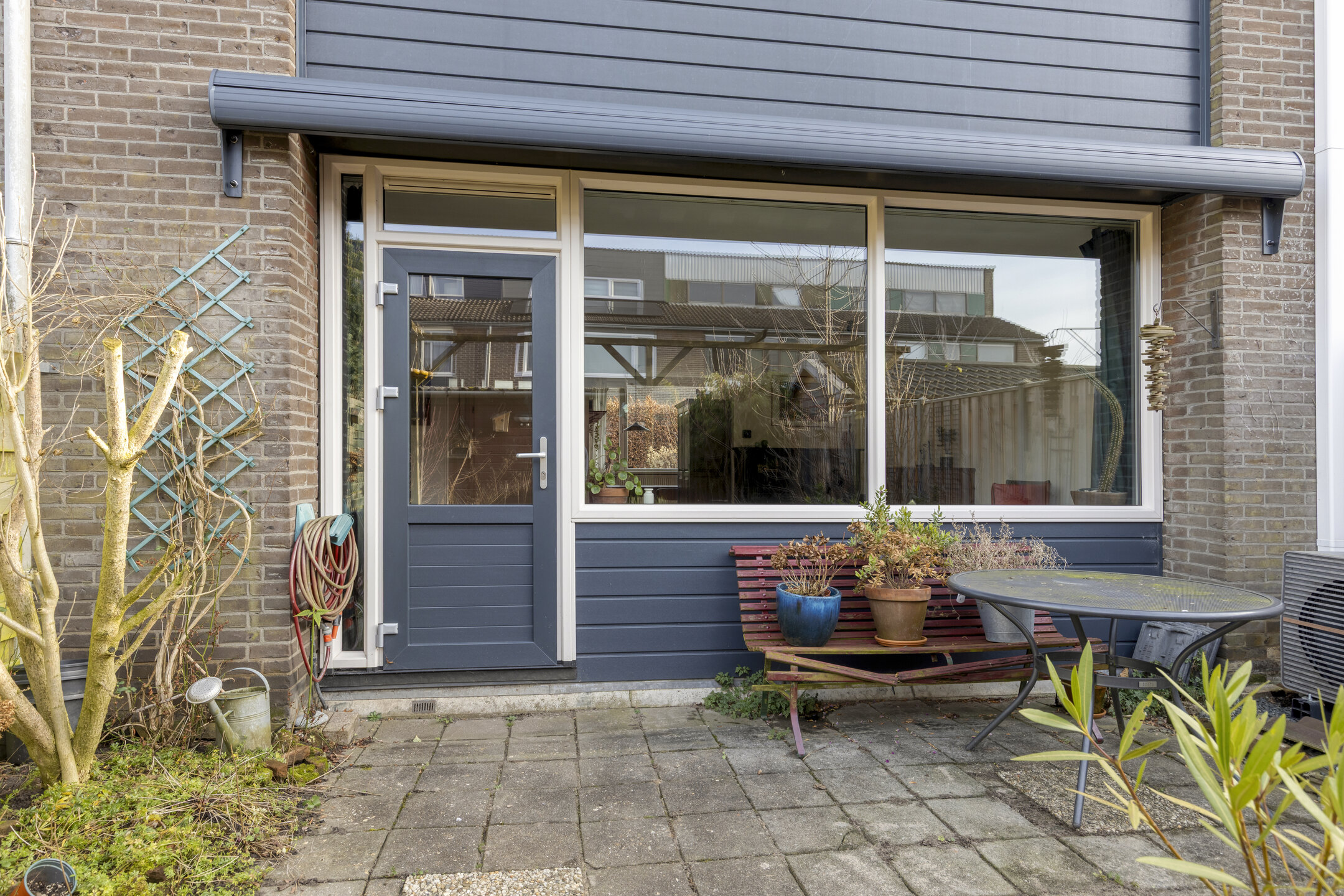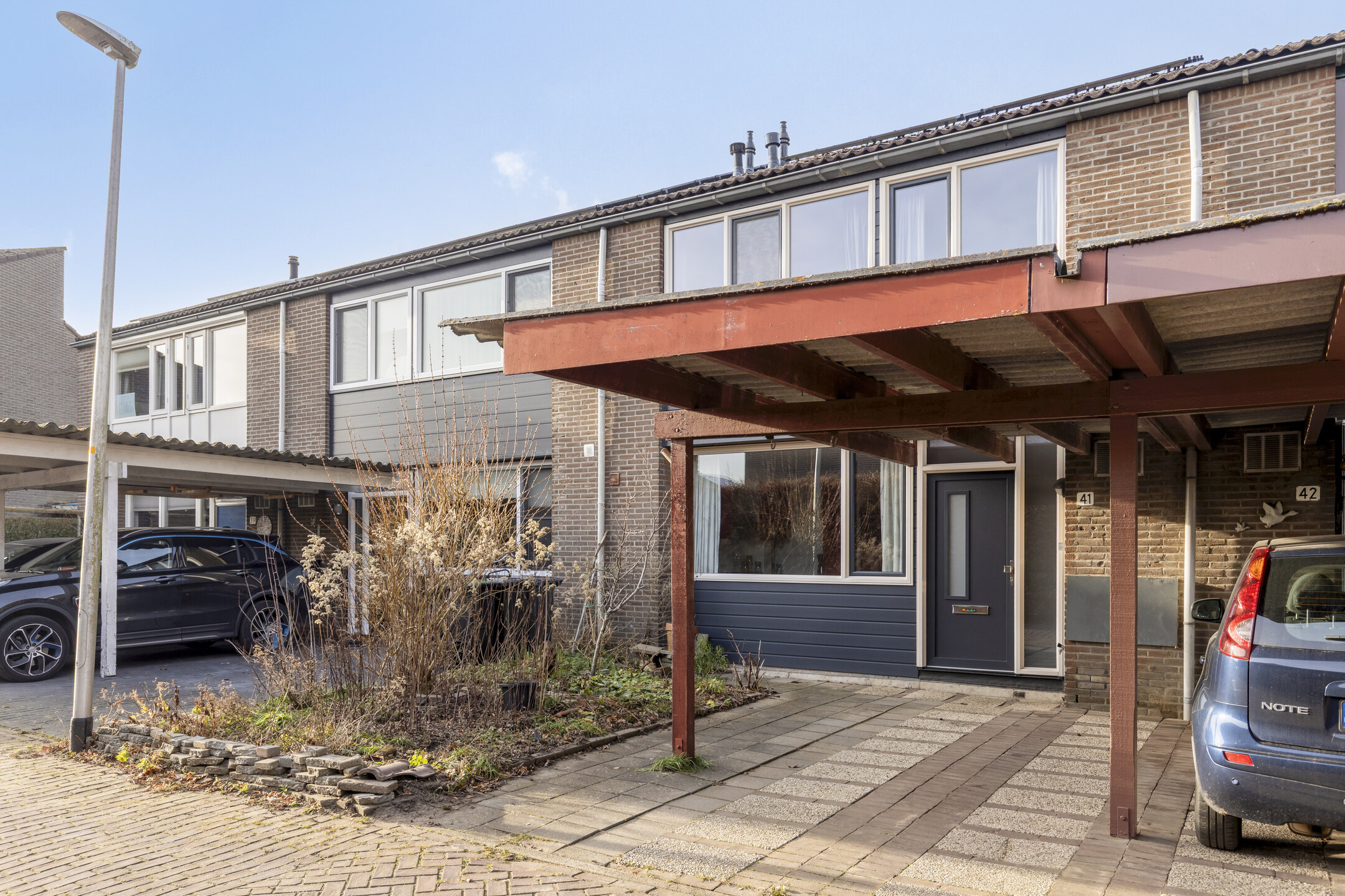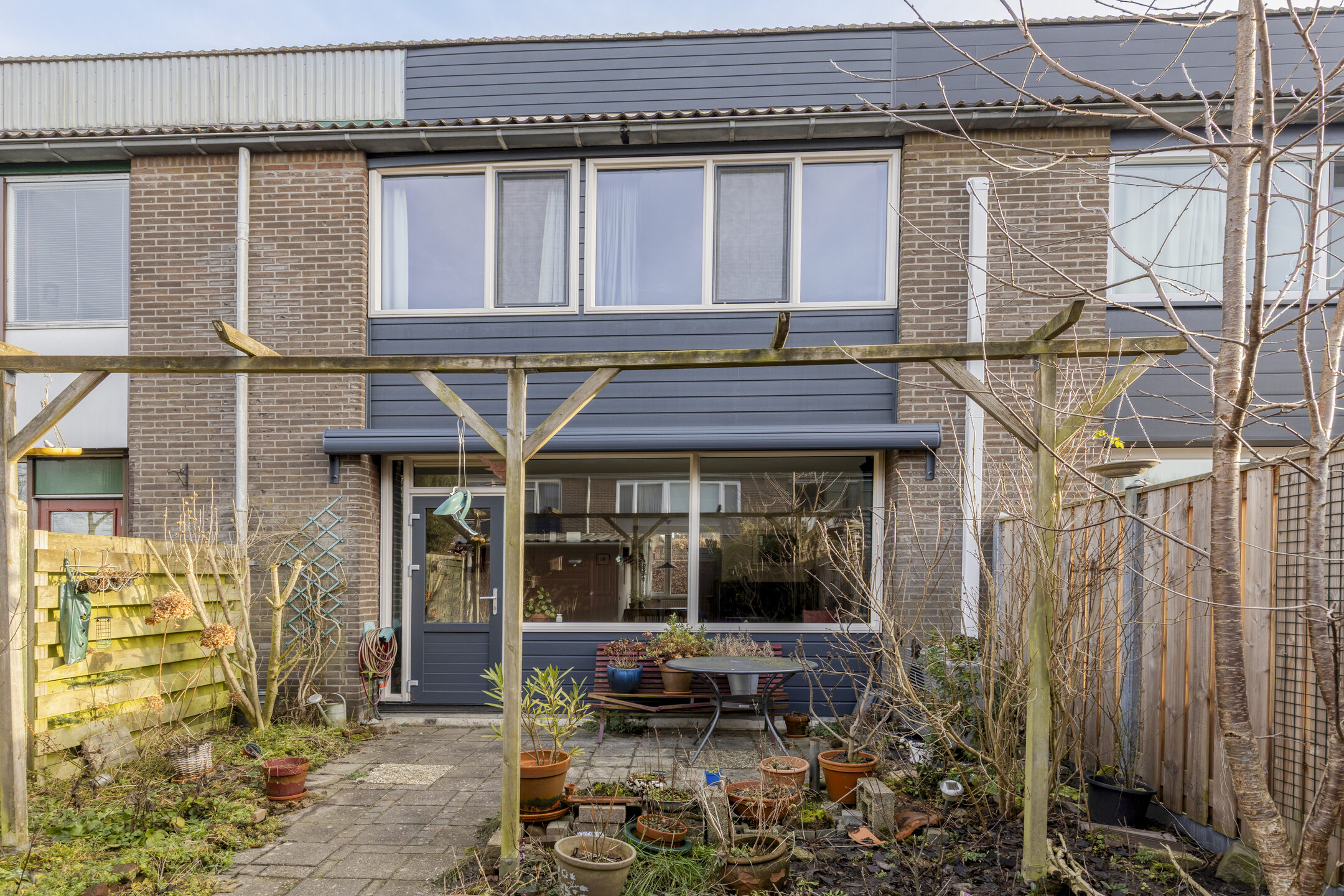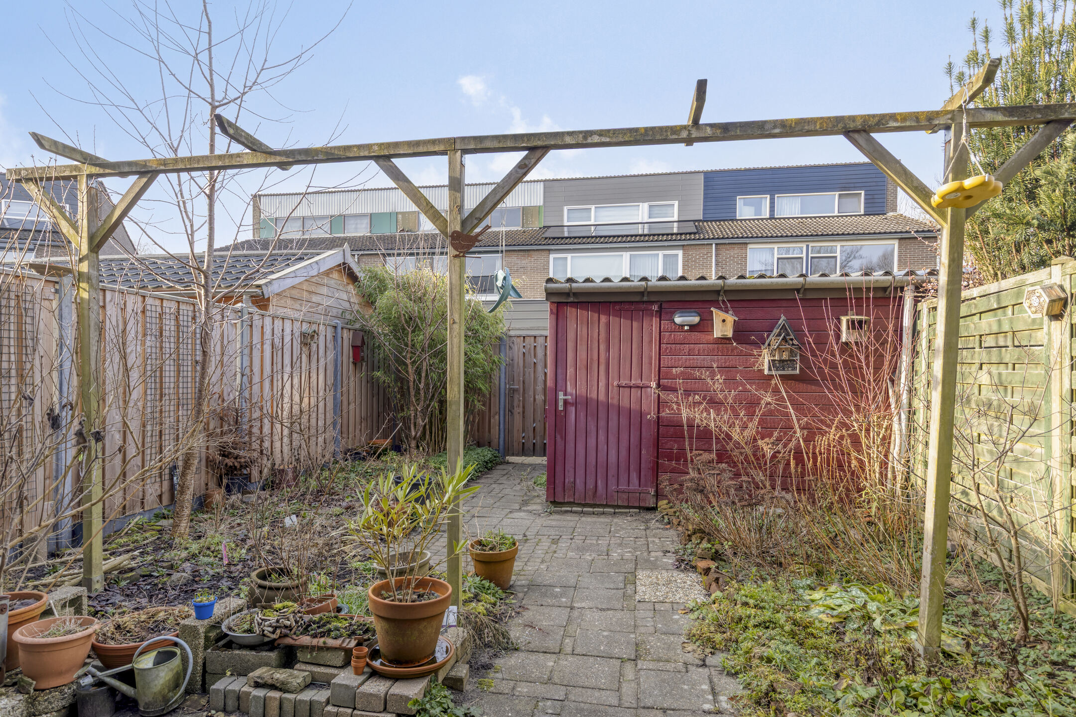 Fraai aangelegde achtertuin met berstraat terras aan de achtergevel voorzien van elektrisch zonnescherm, meerdere borders, houten (fietsen)berging en achterom. Aan de voorzijde is een oprit met carport met parkeerruimte voor één personenauto op eigen terrein.