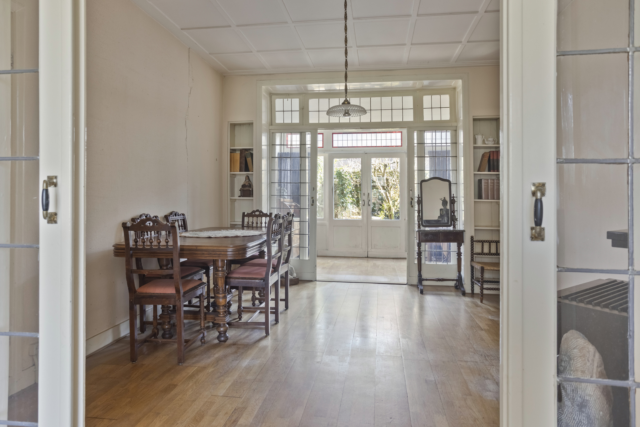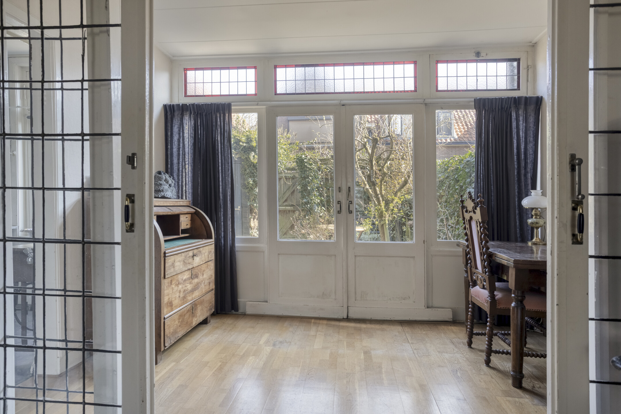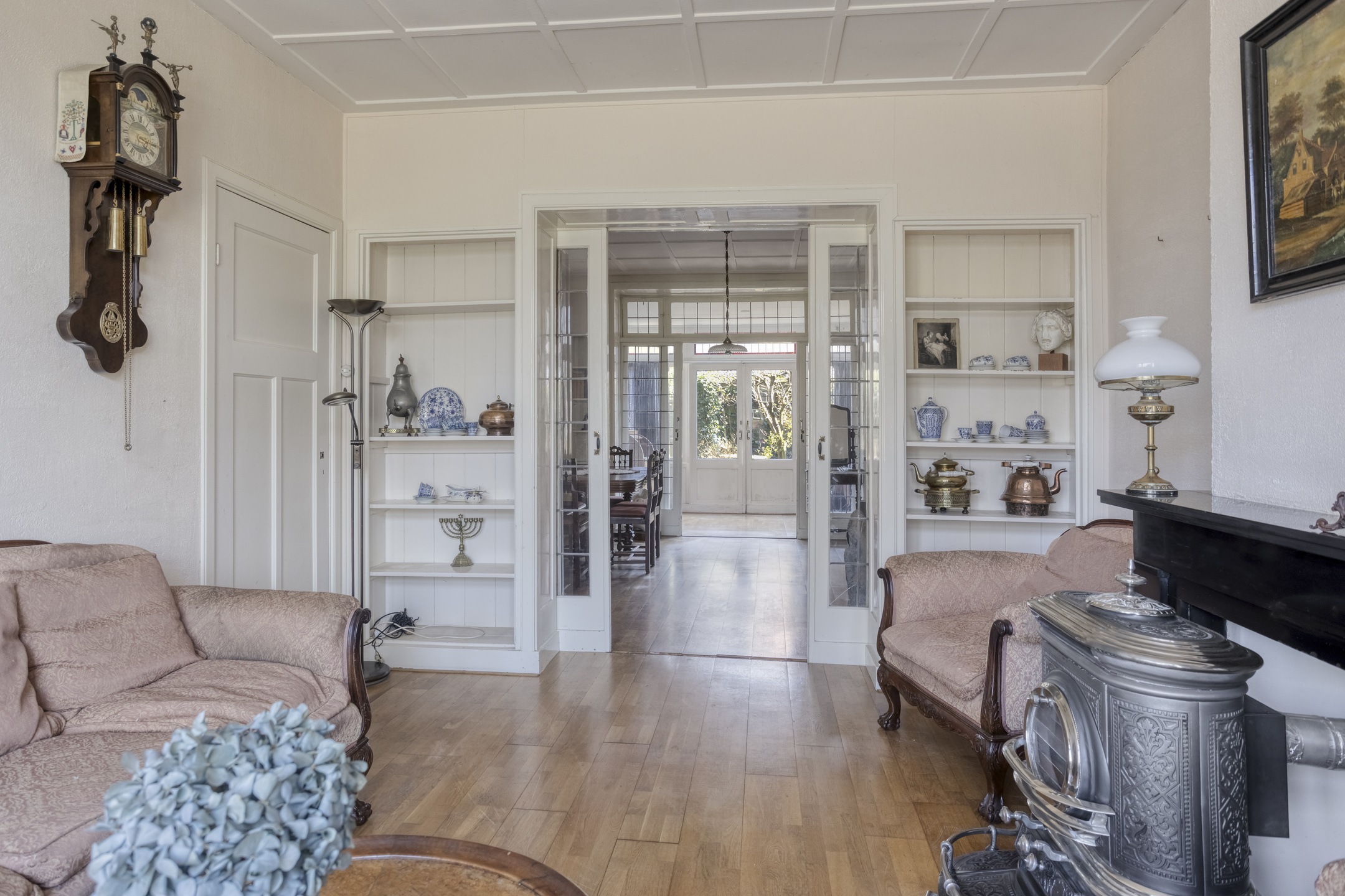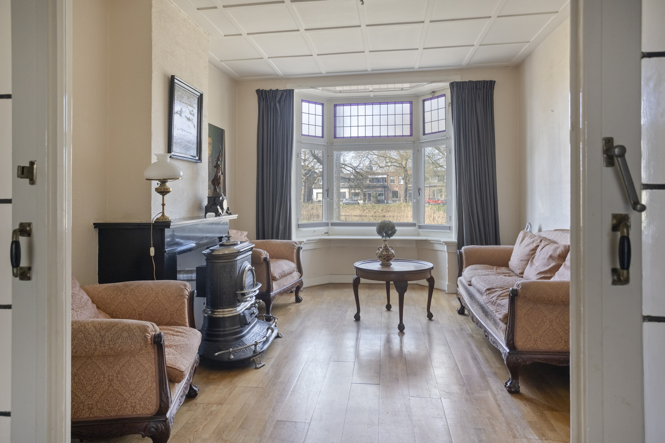 Begane grond: entree, hal voorzien van granitovloer met trapopgang naar de 1e verdieping, toegang tot de kelder en toilet voorzien van fonteintje. Sfeervolle woonkamer en suite met aan de voorzijde de zitkamer met erker voorzien van glas-in-loodwerk, eetkamer/tussenkamer en aan de achterzijde de tuinkamer met schuifpui naar de achtertuin. Aparte keuken met tuindeur voorzien van keukenblok met dubbele spoelbak, keuken boiler en 4-pits gasfornuis met oven.