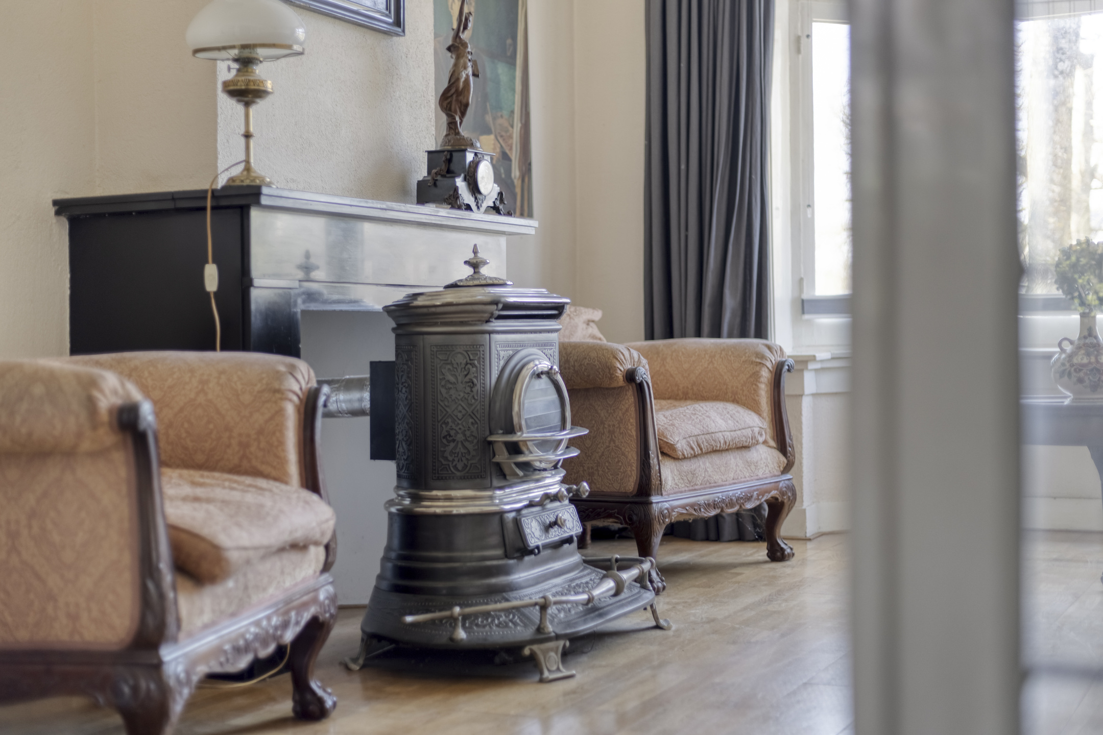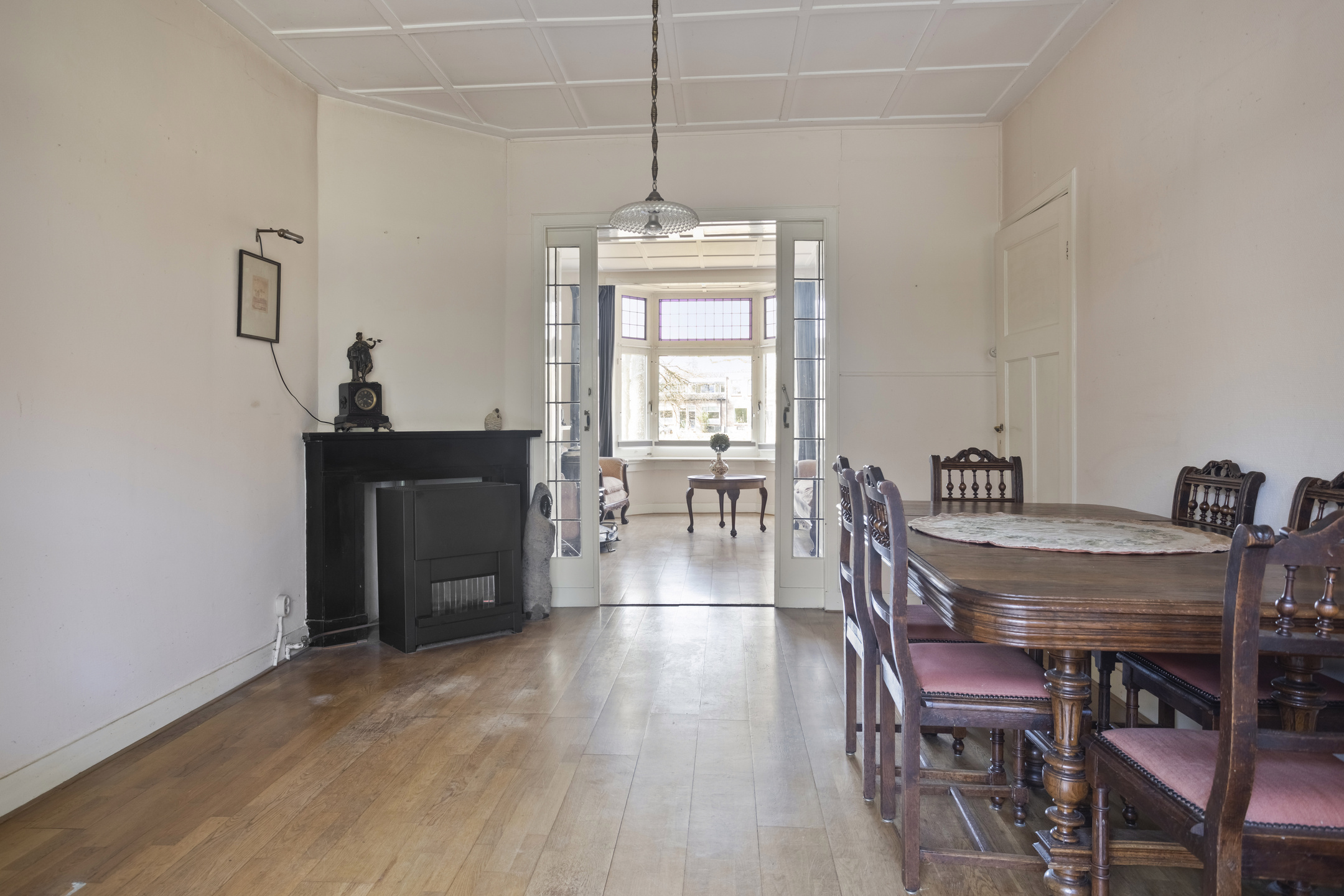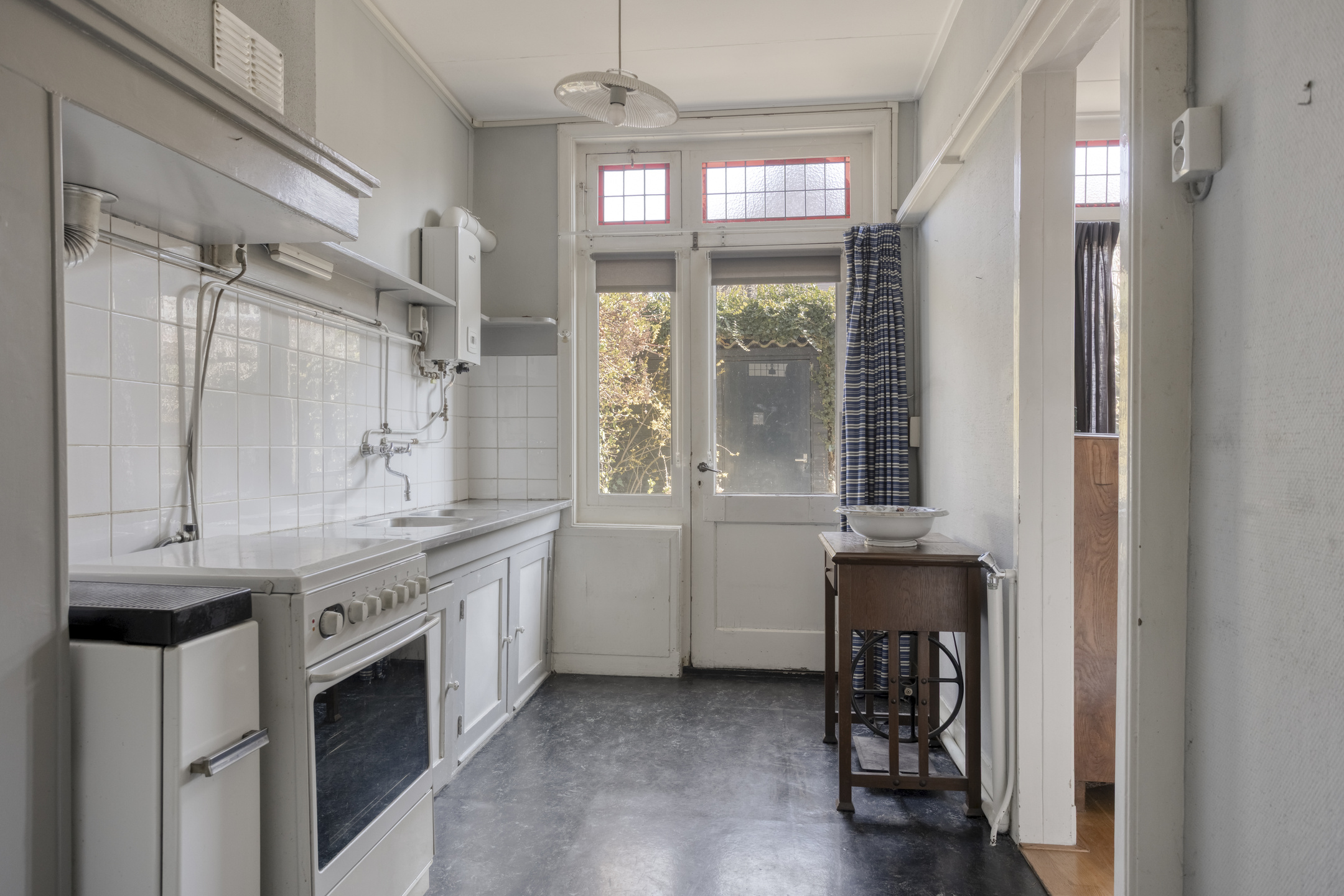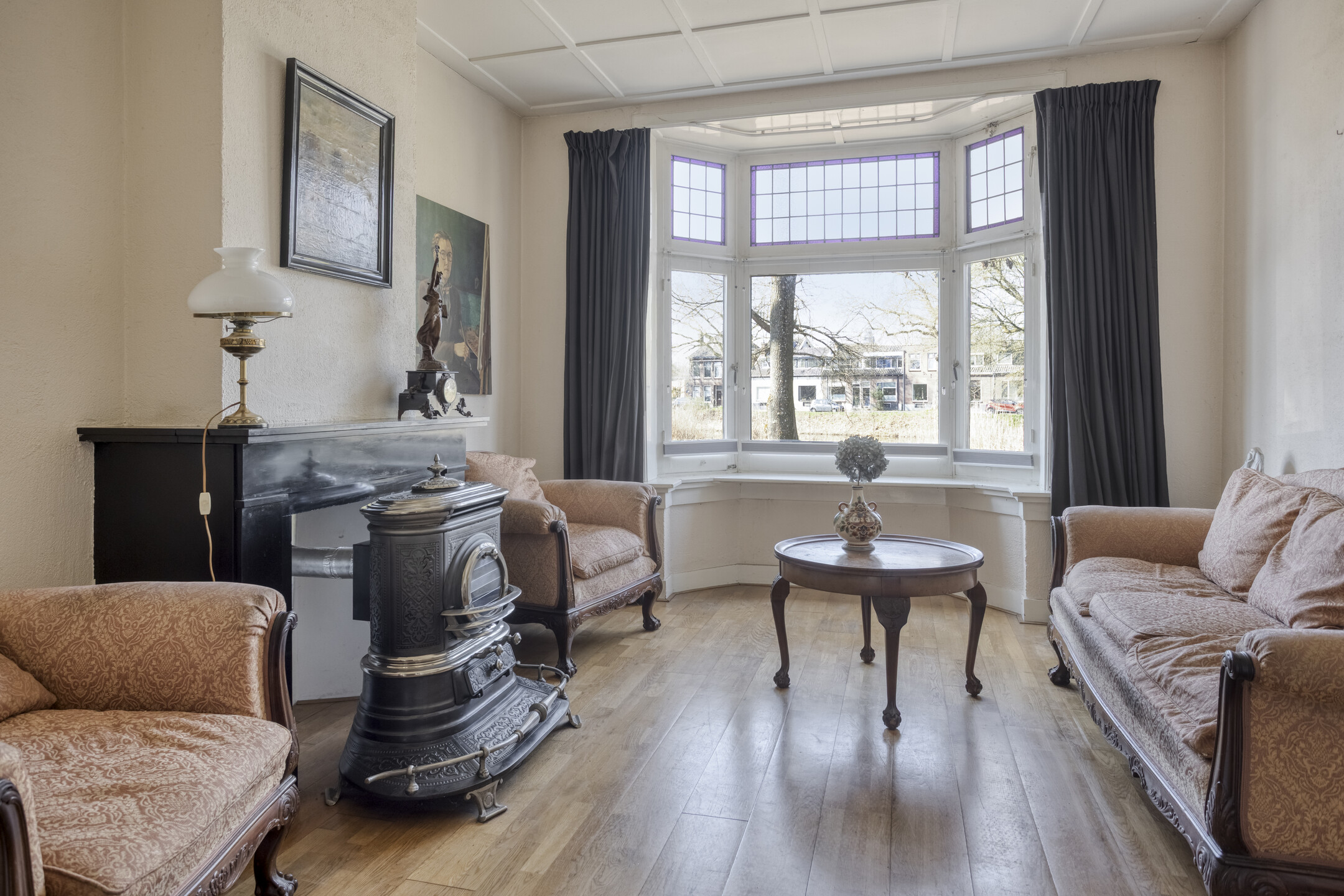 Begane grond: entree, hal voorzien van granitovloer met trapopgang naar de 1e verdieping, toegang tot de kelder en toilet voorzien van fonteintje. Sfeervolle woonkamer en suite met aan de voorzijde de zitkamer met erker voorzien van glas-in-loodwerk, eetkamer/tussenkamer en aan de achterzijde de tuinkamer met schuifpui naar de achtertuin. Aparte keuken met tuindeur voorzien van keukenblok met dubbele spoelbak, keuken boiler en 4-pits gasfornuis met oven.