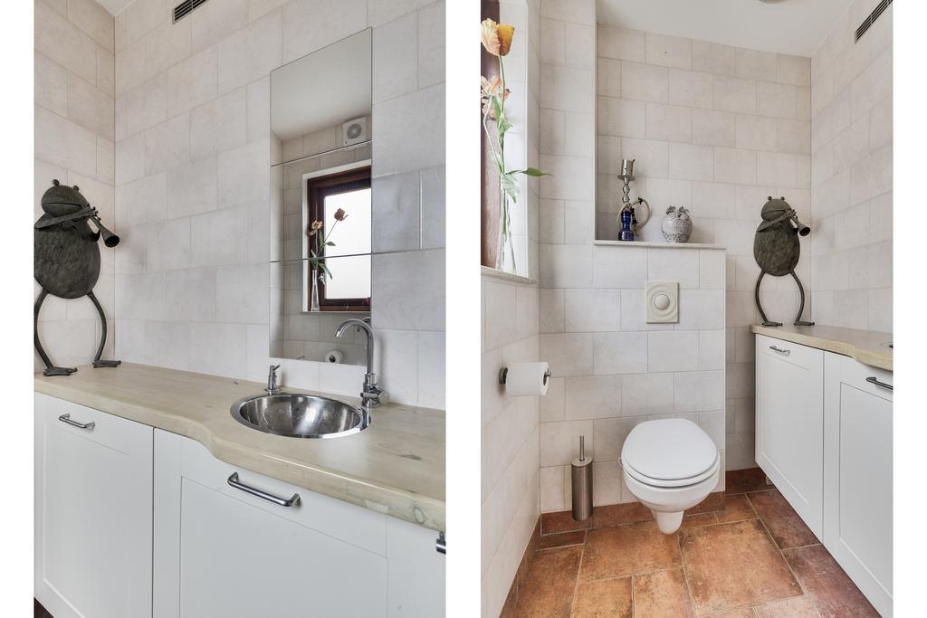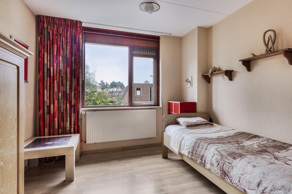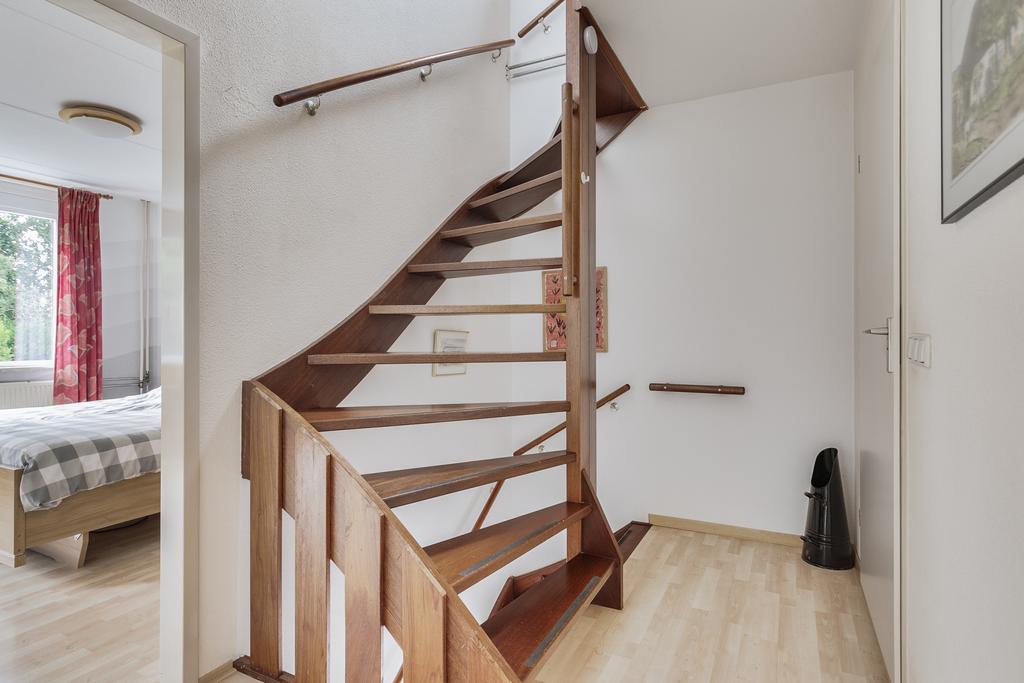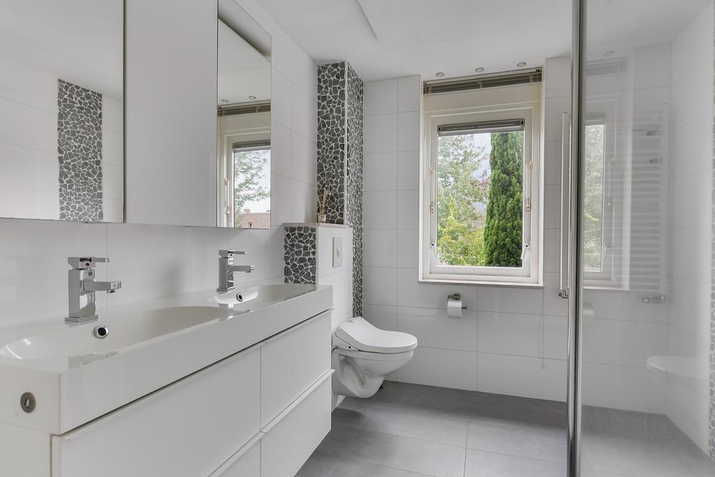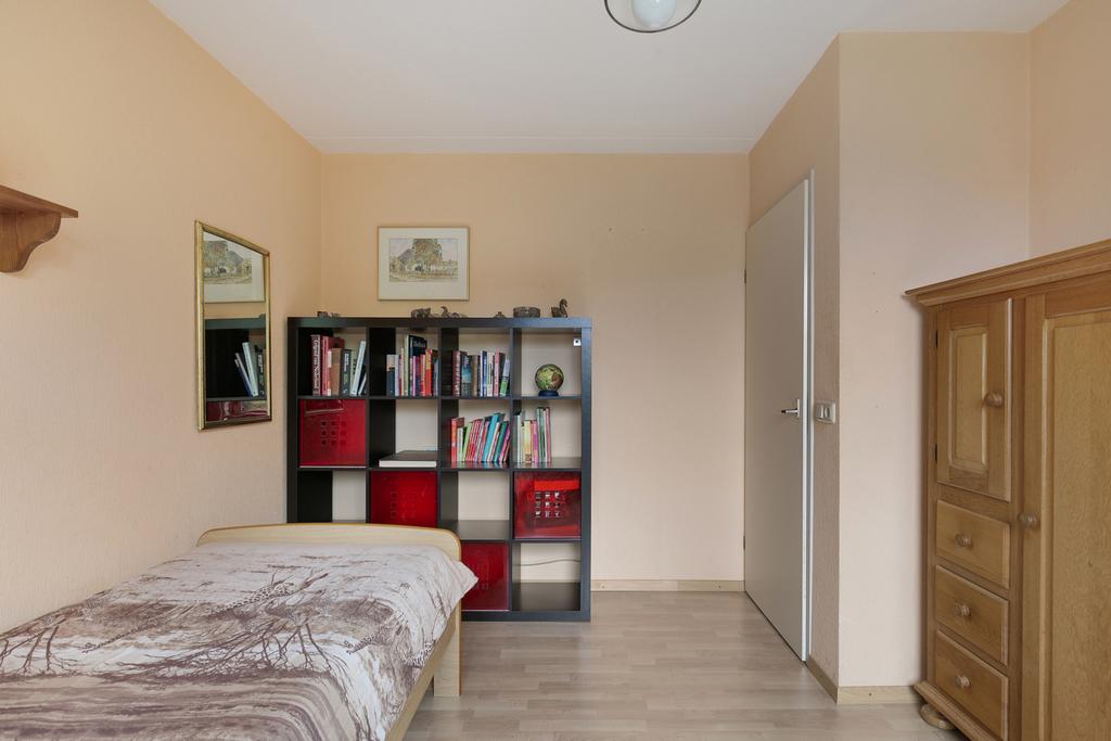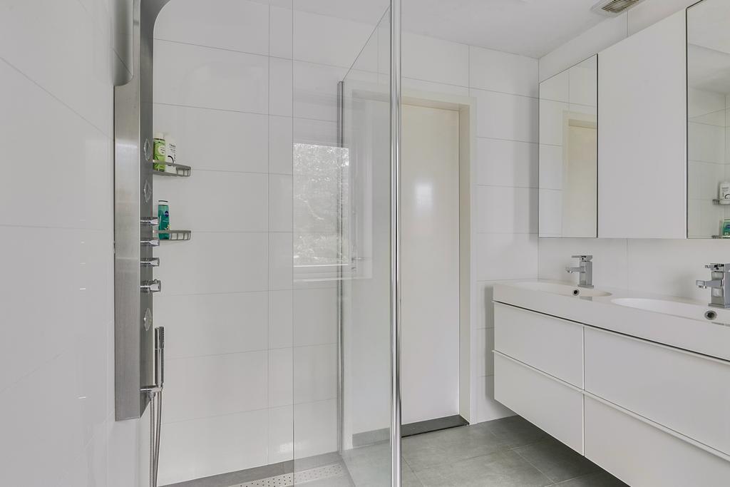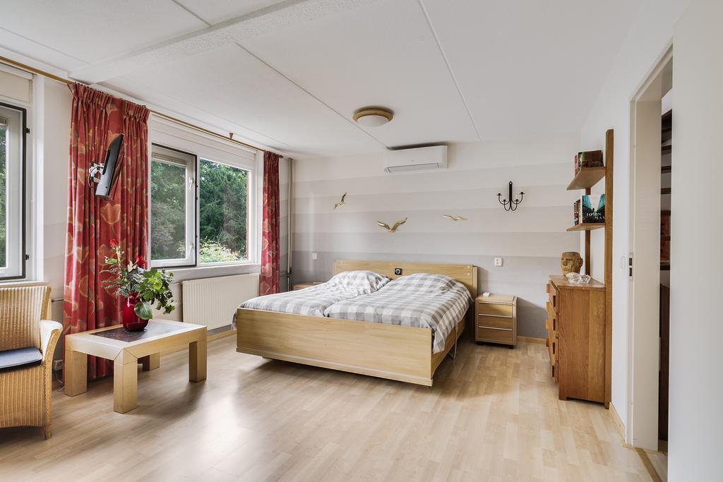 Eerste verdieping: overloop met vaste kast, twee slaapkamers (voorheen drie) met een grootte van circa 22 en 11 m², waarvan de grootste slaapkamer voorzien is van een kastenwand en een airco-unit (tevens te gebruiken voor verwarming). De moderne badkamer is uitgerust met een wastafelmeubel met dubbele wasbak, een tweede toilet en een inloopdouche.