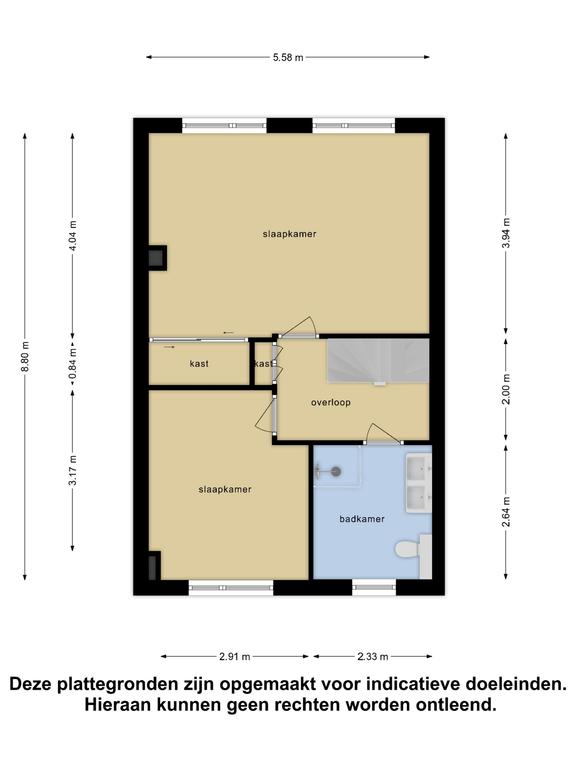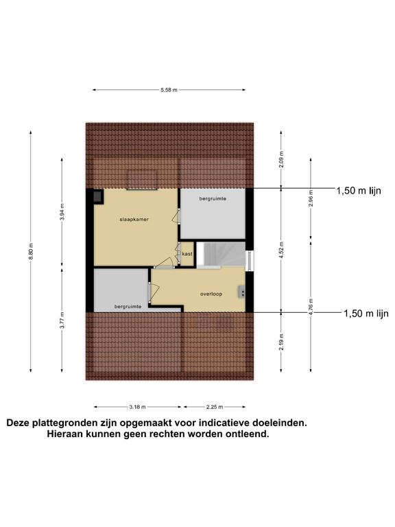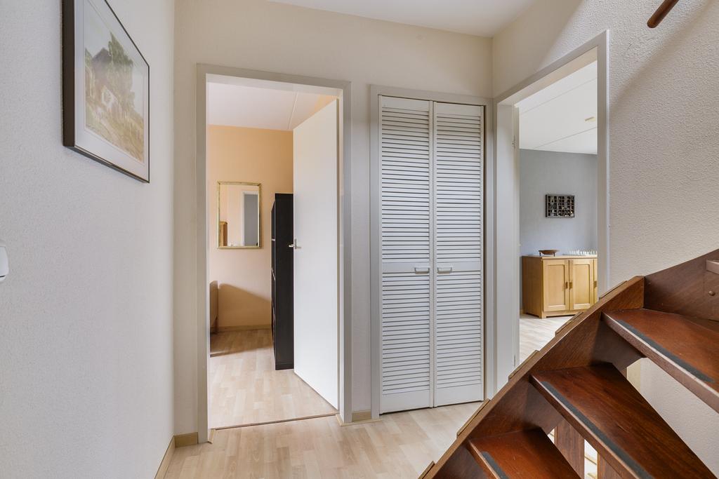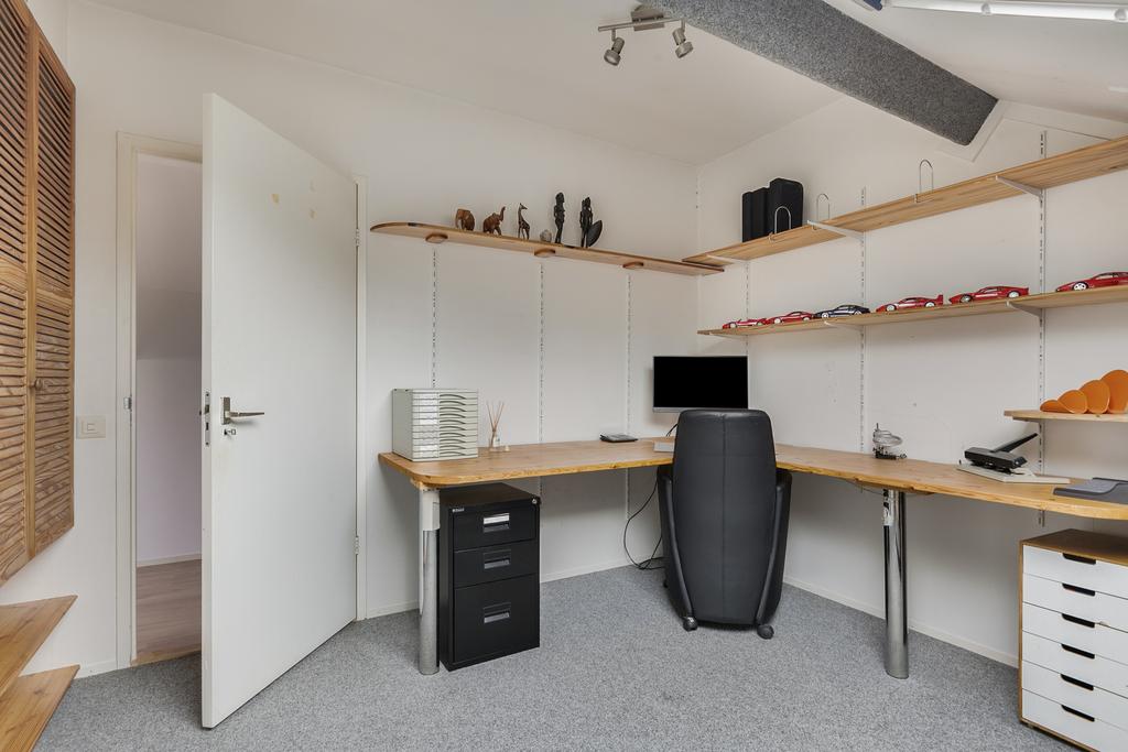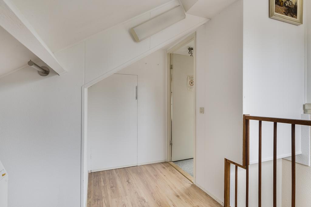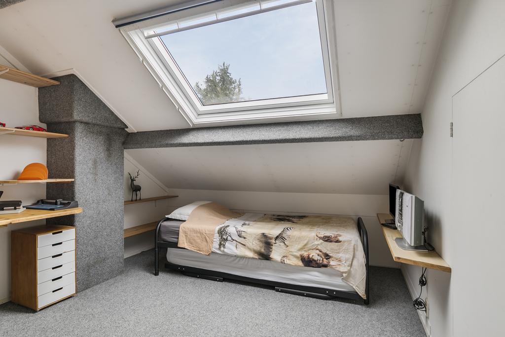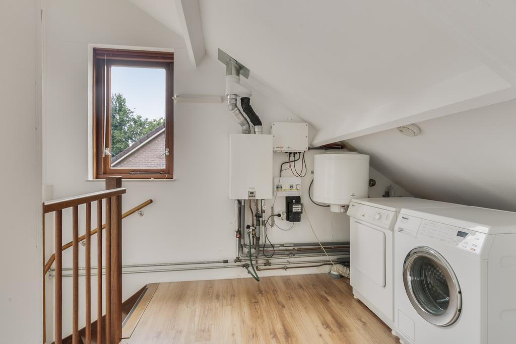 Tweede verdieping: overloop met wasmachineaansluiting en verwarmingsopstelling. Op deze verdieping bevindt zich de derde slaapkamer van circa 12 m² met dakraam. Tevens zijn er twee grote bergruimtes.