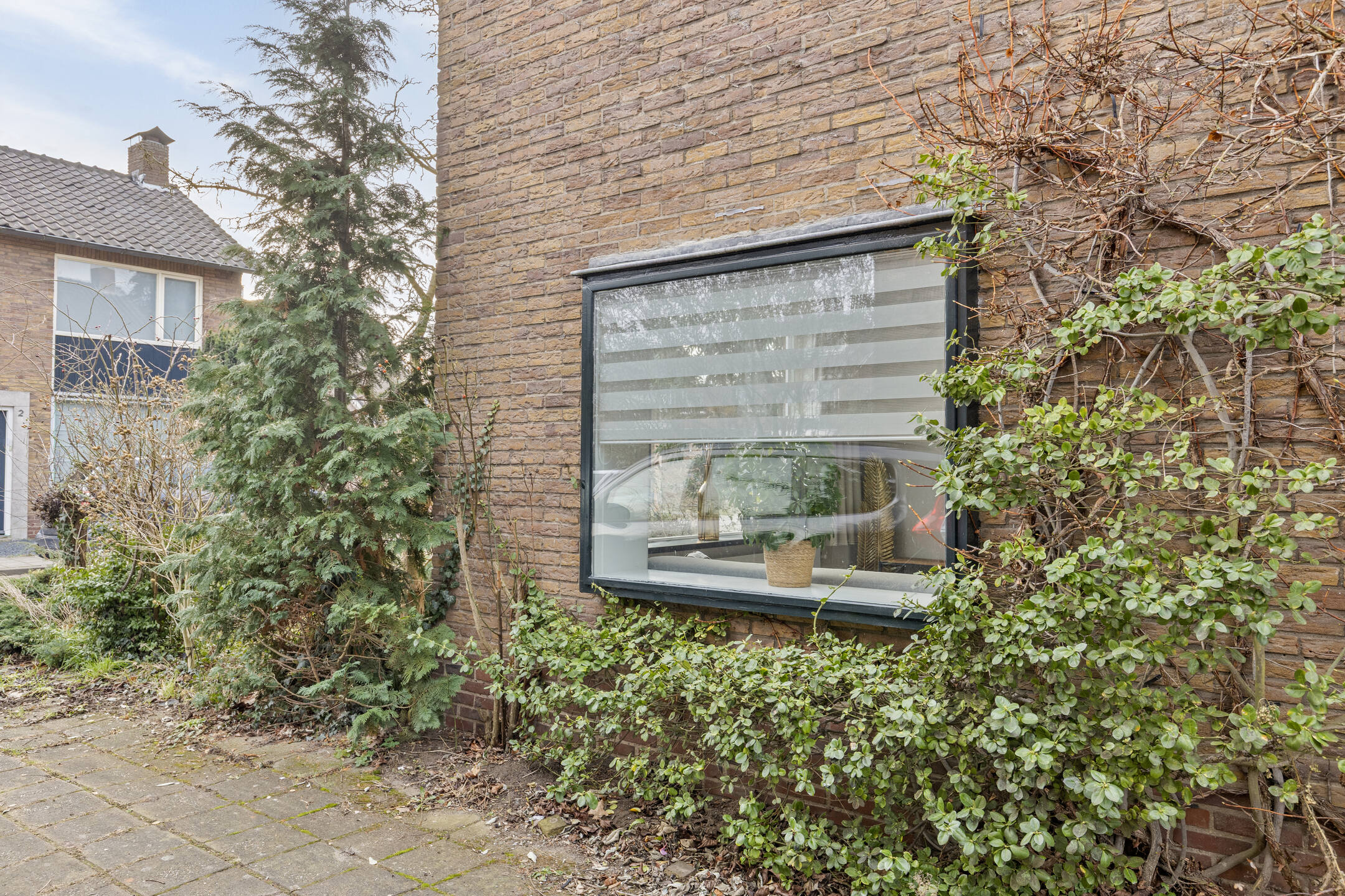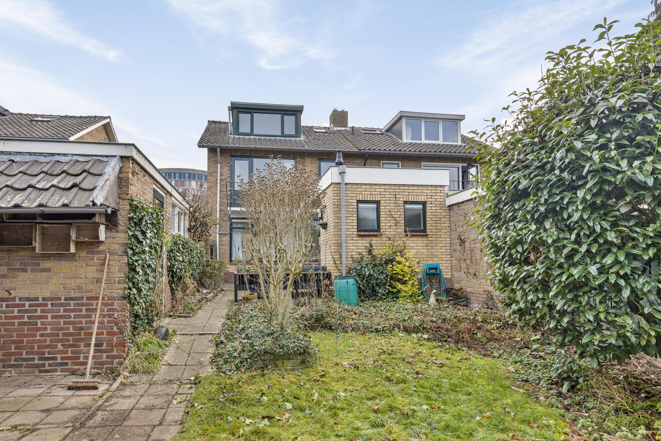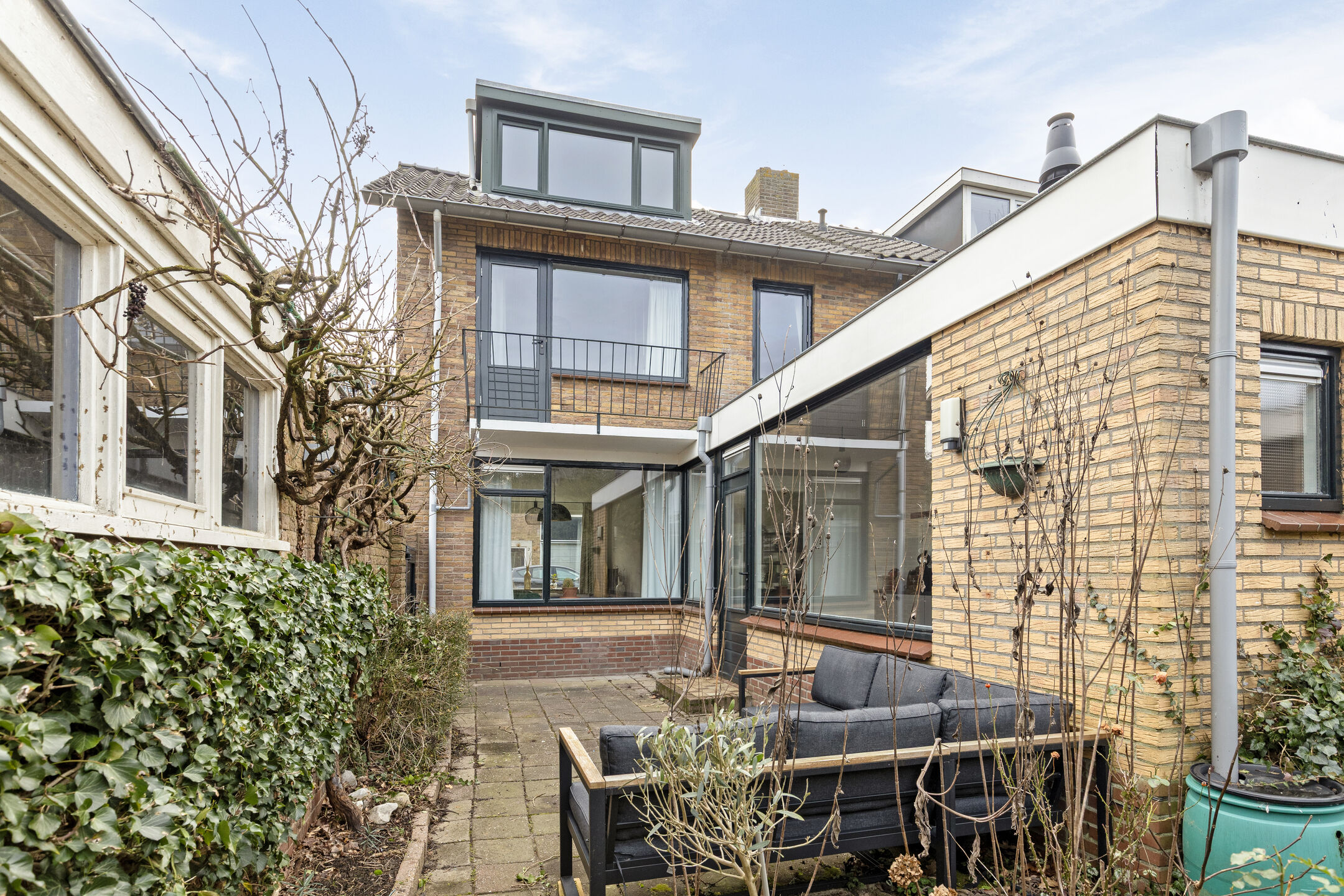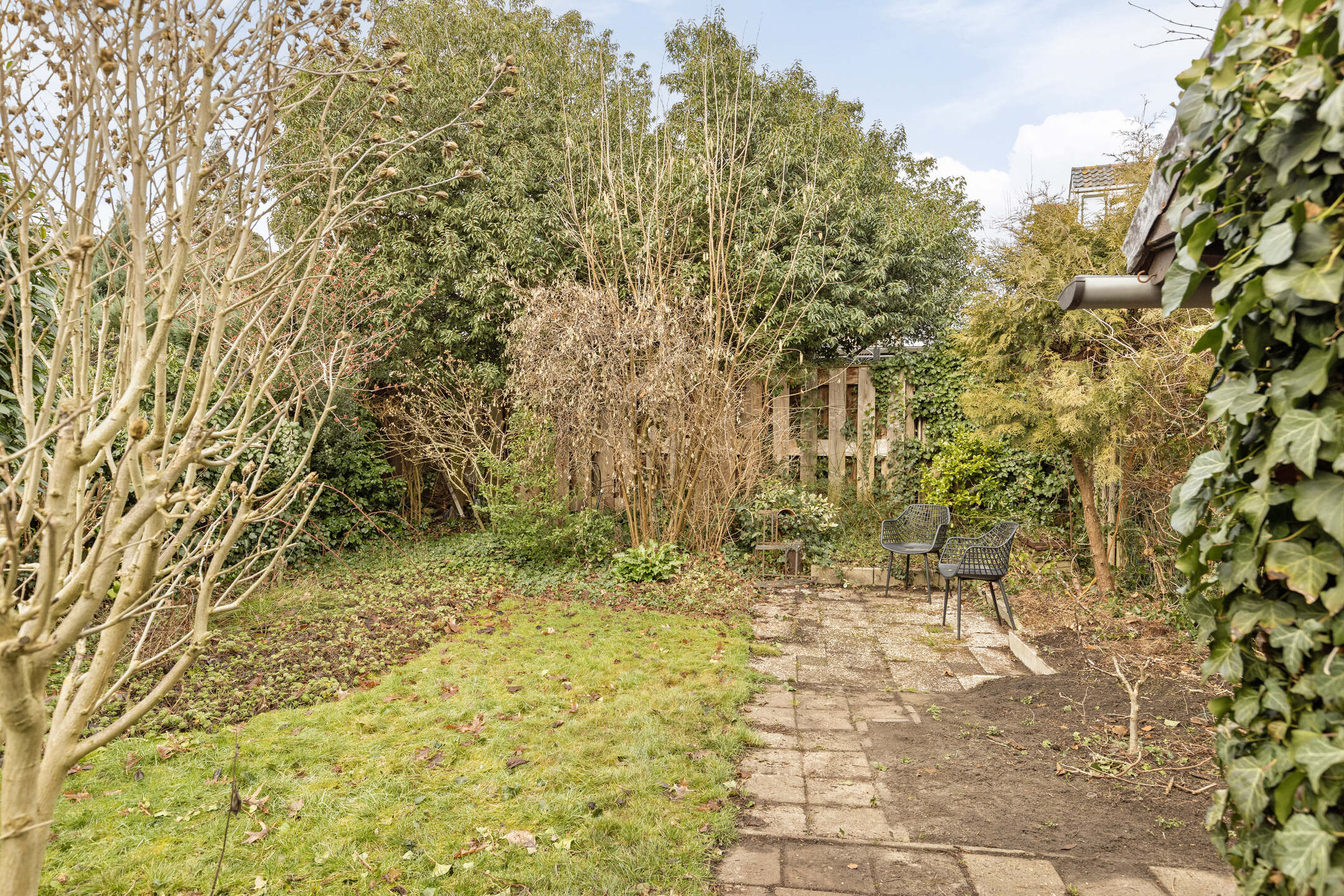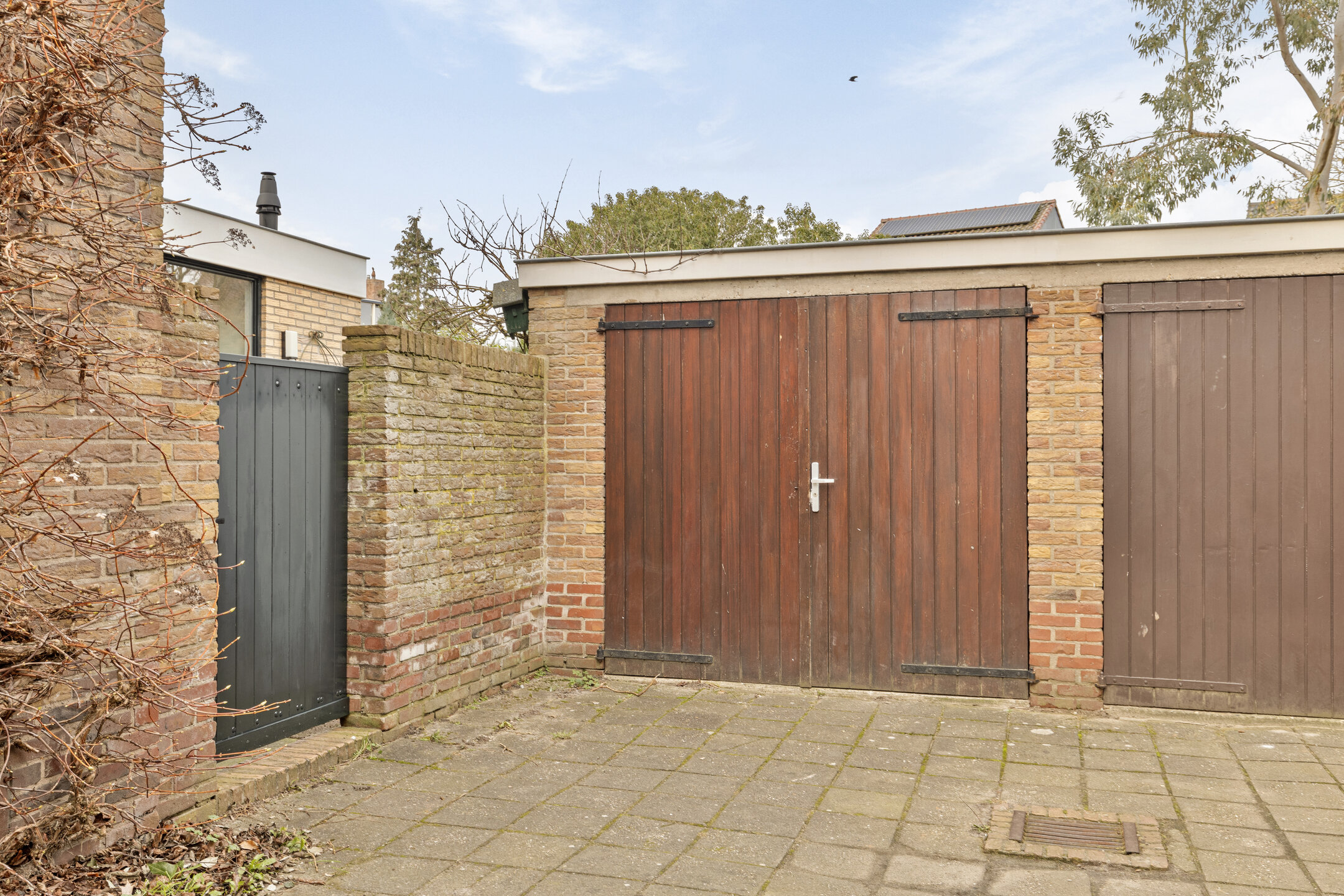 Achtertuin op het noordwesten, met terras langs de uitbouw, gazon en vrijstaande stenen garage ter grootte van circa 17 m². Aan de zijkant van de woning is een oprit met parkeerruimte voor twee personenauto’s op eigen terrein.
