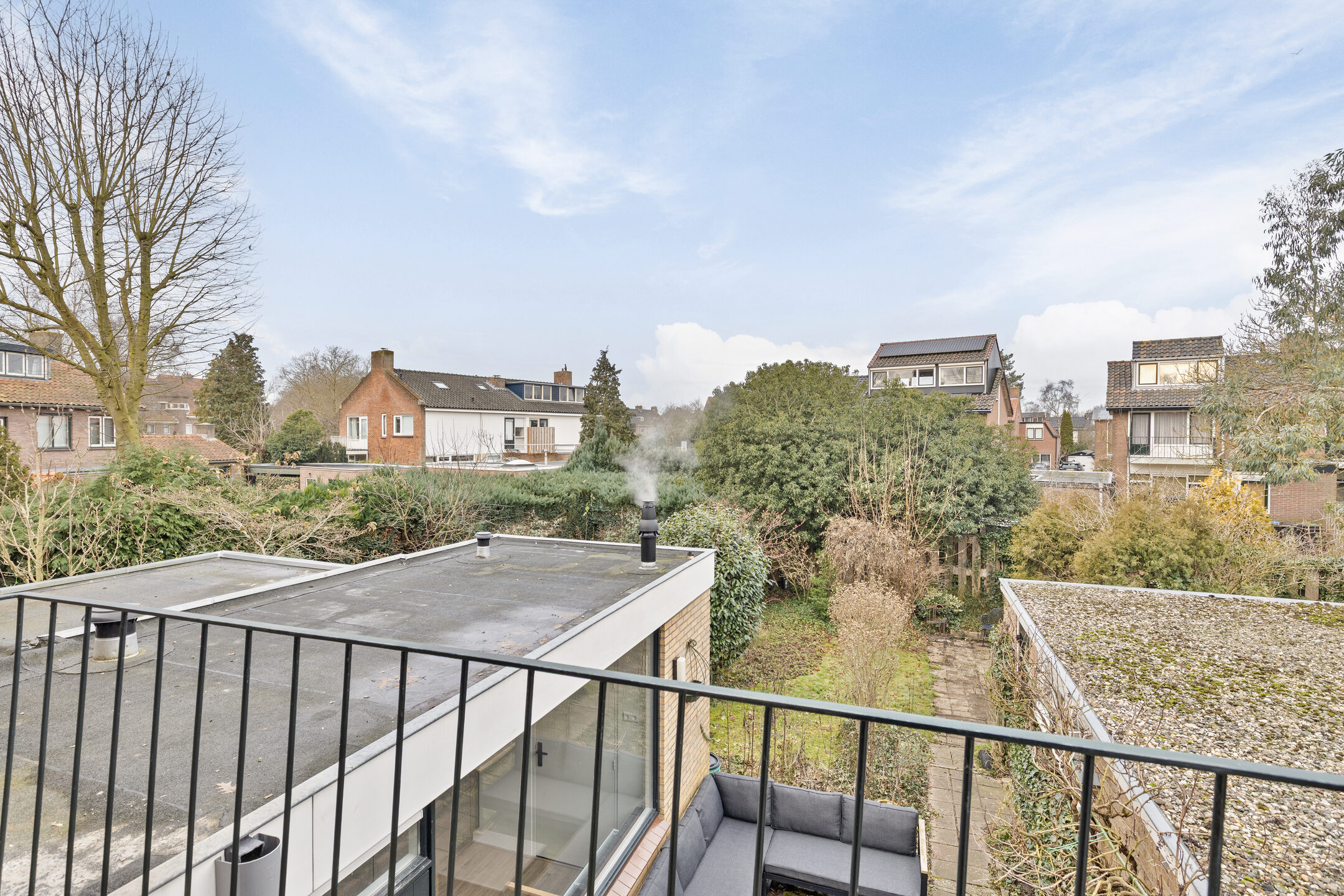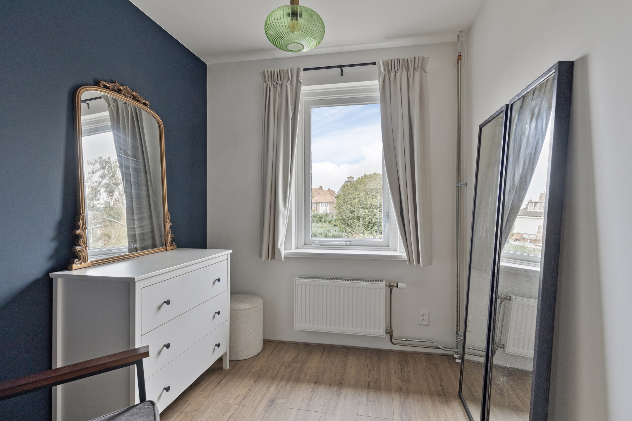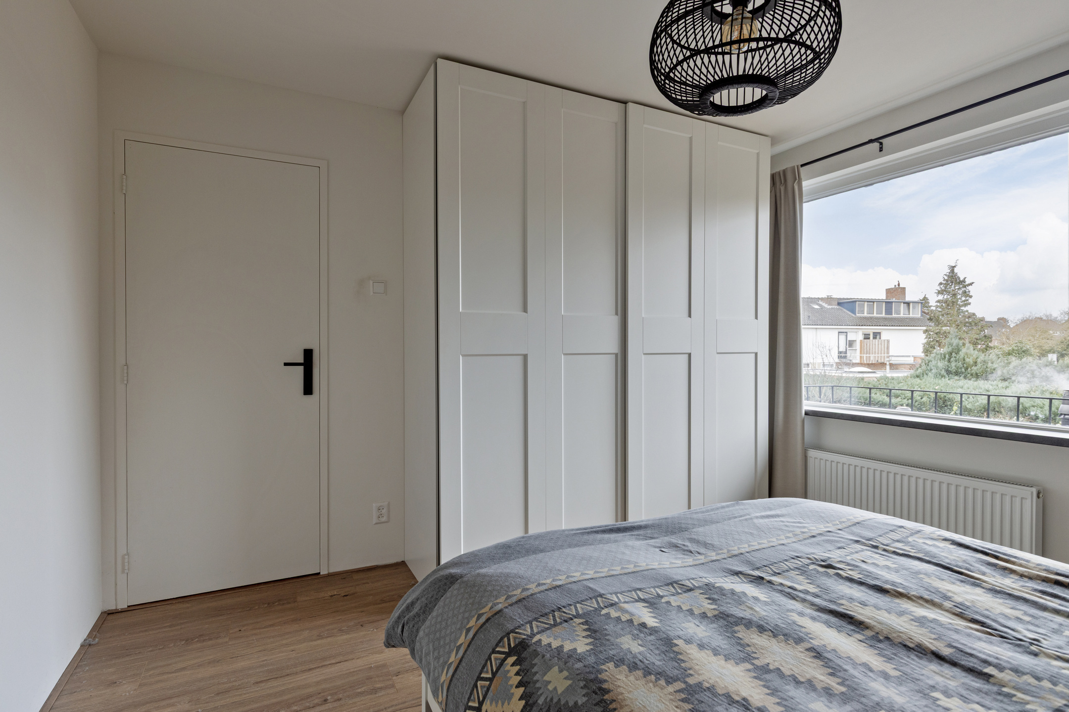 1e Verdieping: overloop. Drie slaapkamers ter grootte van circa 5,5 m², 10,5 m² en 12,5 m², allen keurig afgewerkt. De grote slaapkamer biedt tevens toegang tot het balkon aan de achtergevel. Moderne badkamer voorzien van douche, wandcloset, dubbel-wastafelmeubel en handdoekenradiator.