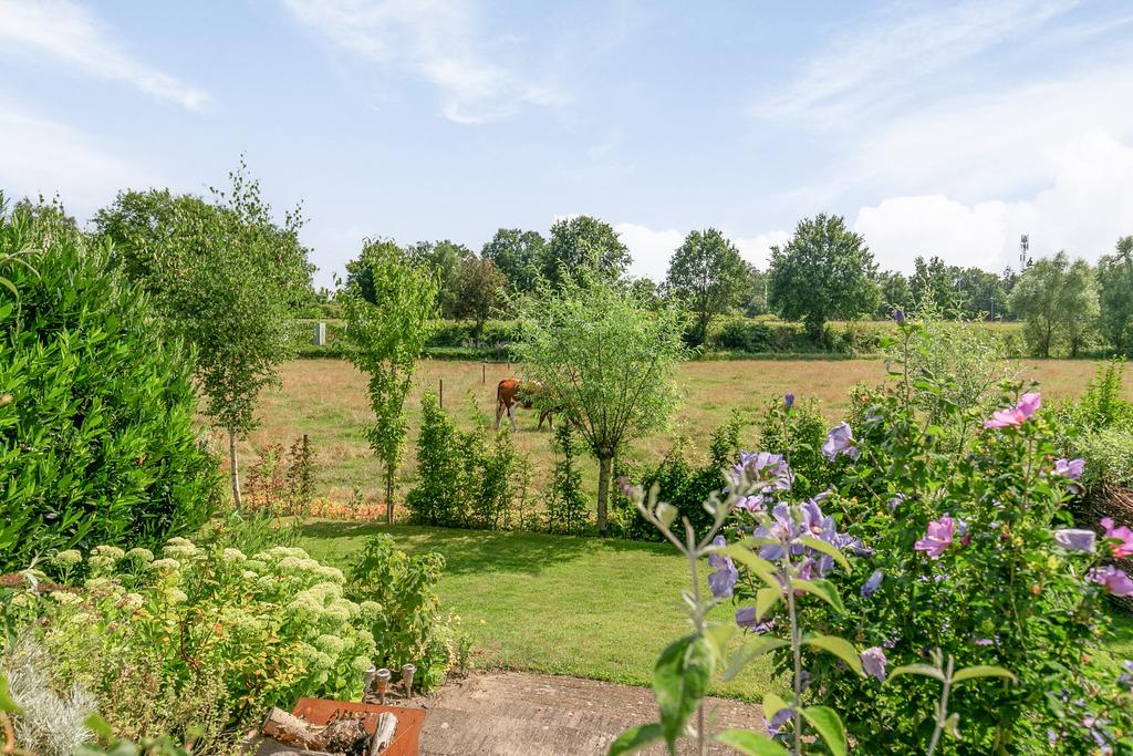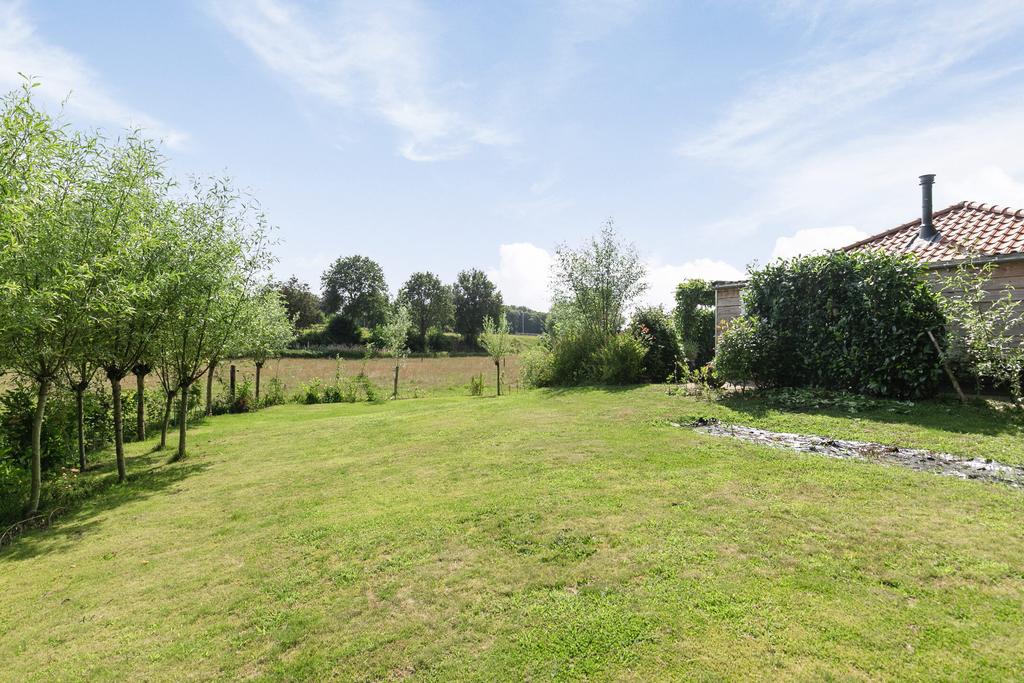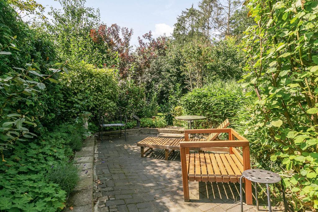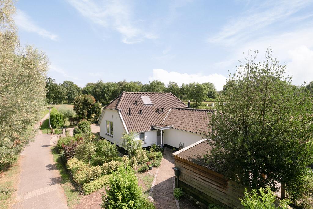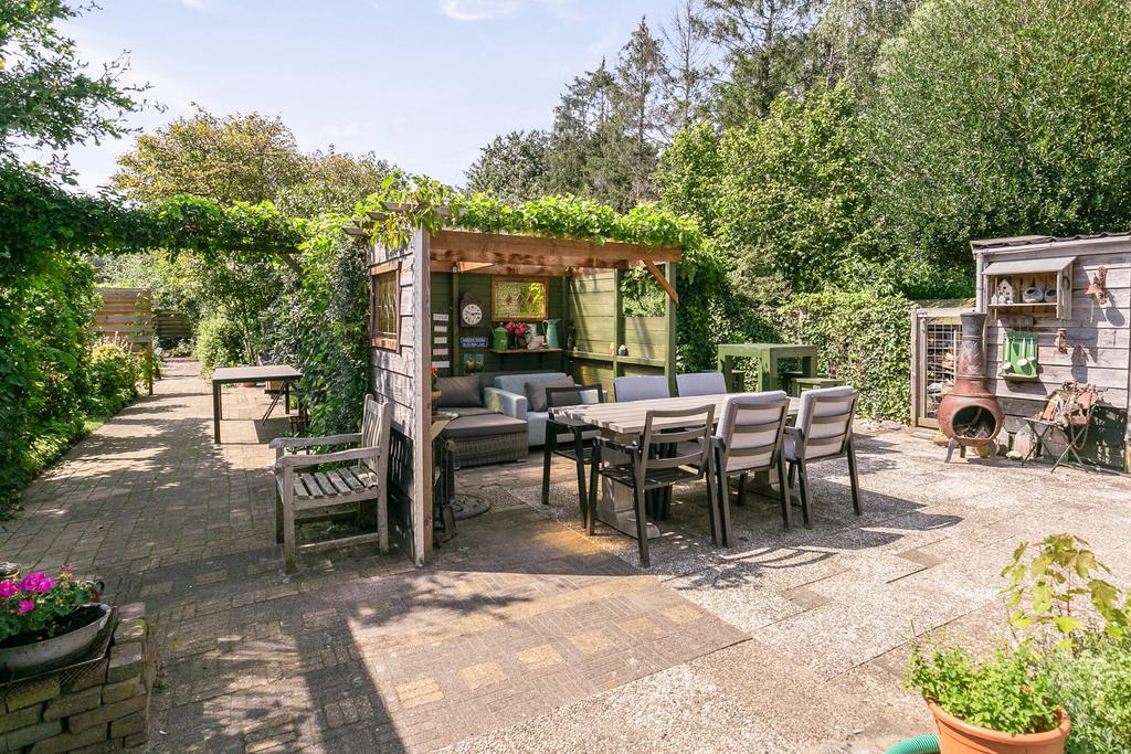 De prachtig aangelegde tuin rondom het huis biedt meerdere zitjes, een fraai gazon, kleurrijke borders, een houtopslag, een houten overkapping, een grondwaterpuls en uitzicht over het aangrenzende weiland. Voor de woning bevindt zich een ruime oprit met voldoende parkeergelegenheid op eigen terrein. Naast de woning is een (fietsen)schuur met voldoende opbergruimte voor tuin- en gereedschap en toegang tot de tuin.