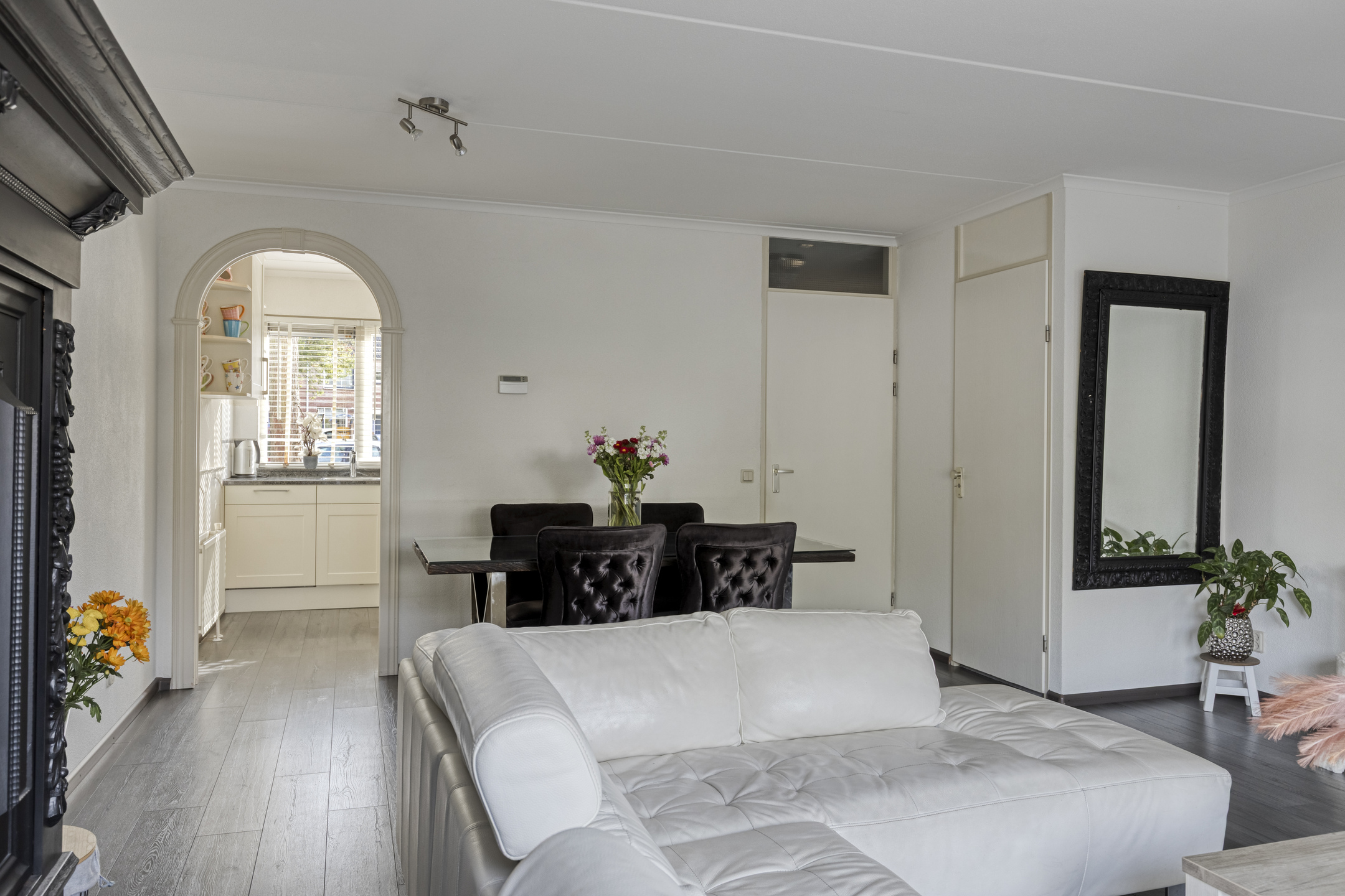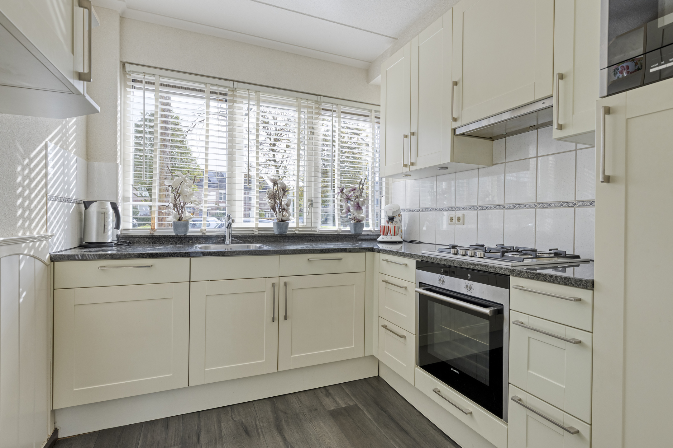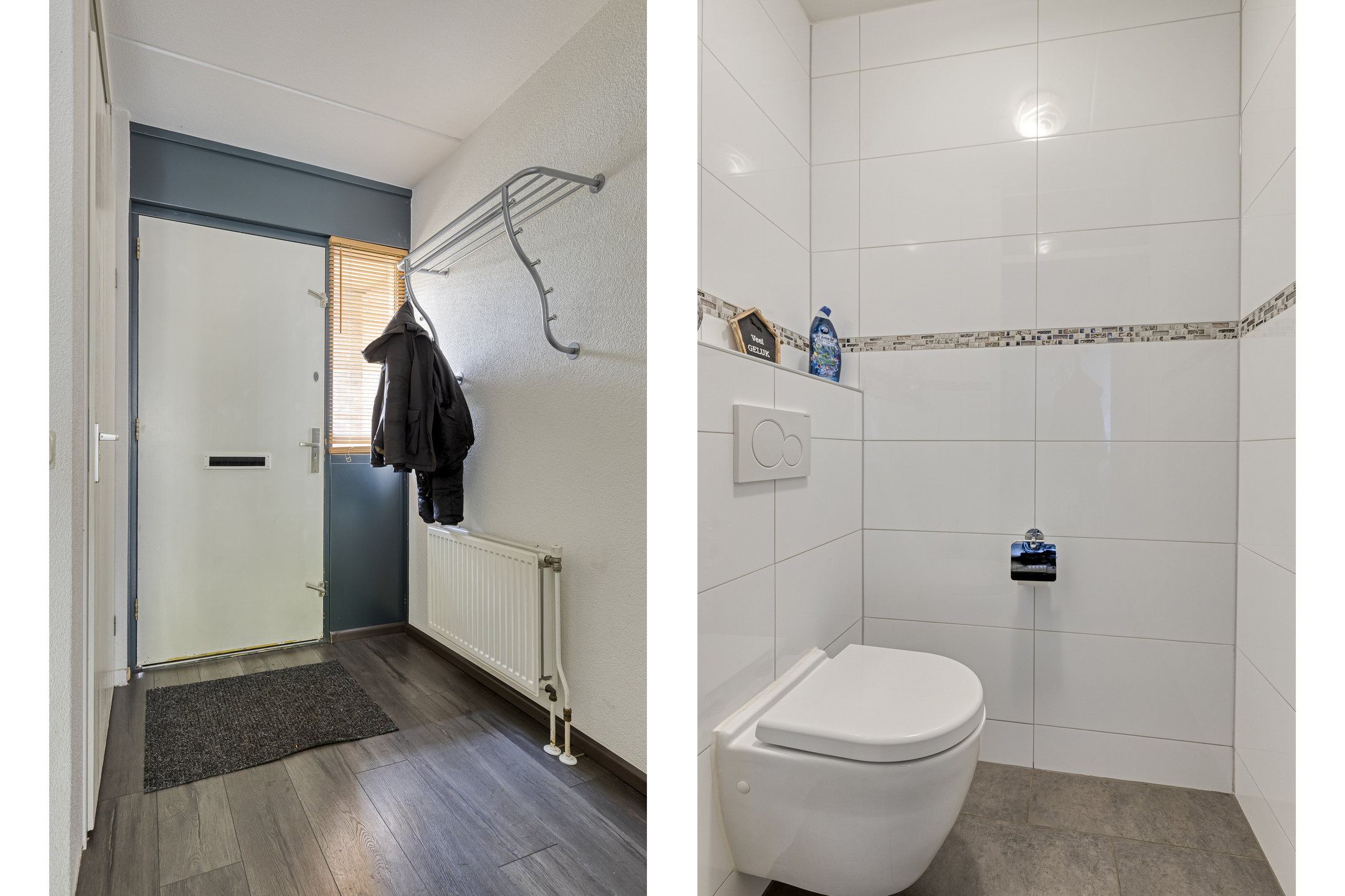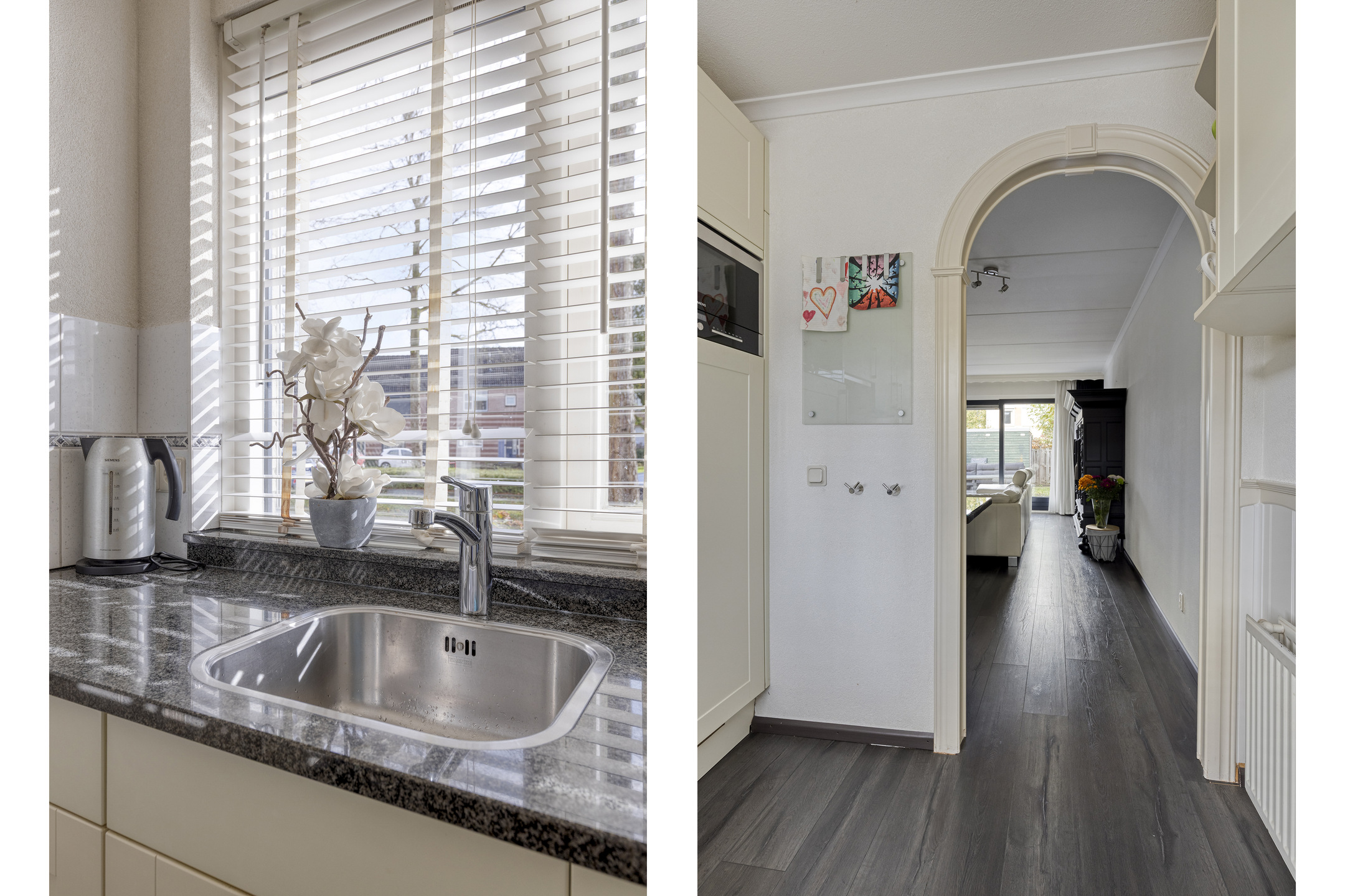Begane grond: overdekte entree, hal met trapopgang naar de 1e verdieping, meterkast en toilet voorzien van wandcloset. Lichte, tuingerichte woonkamer met trapkast en schuifpui naar de achtertuin. Half open keuken in L-opstelling, voorzien van 4-pits gaskookplaat, afzuigkap, combi-oven, koelkast en vaatwasser.
