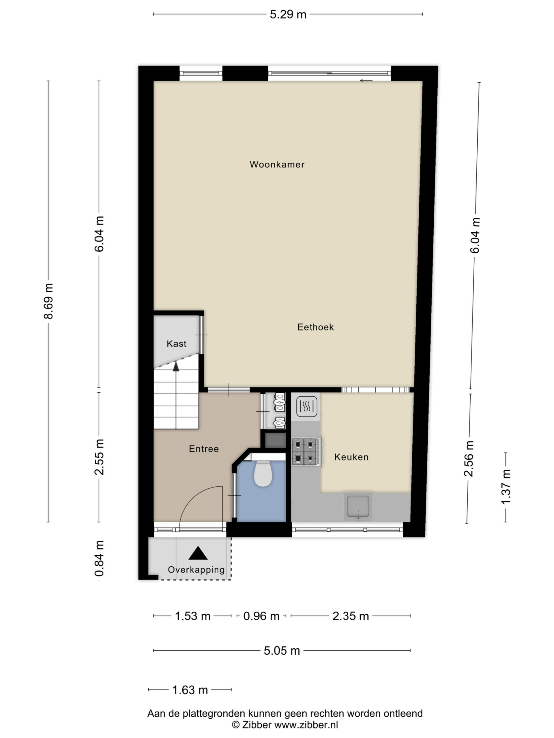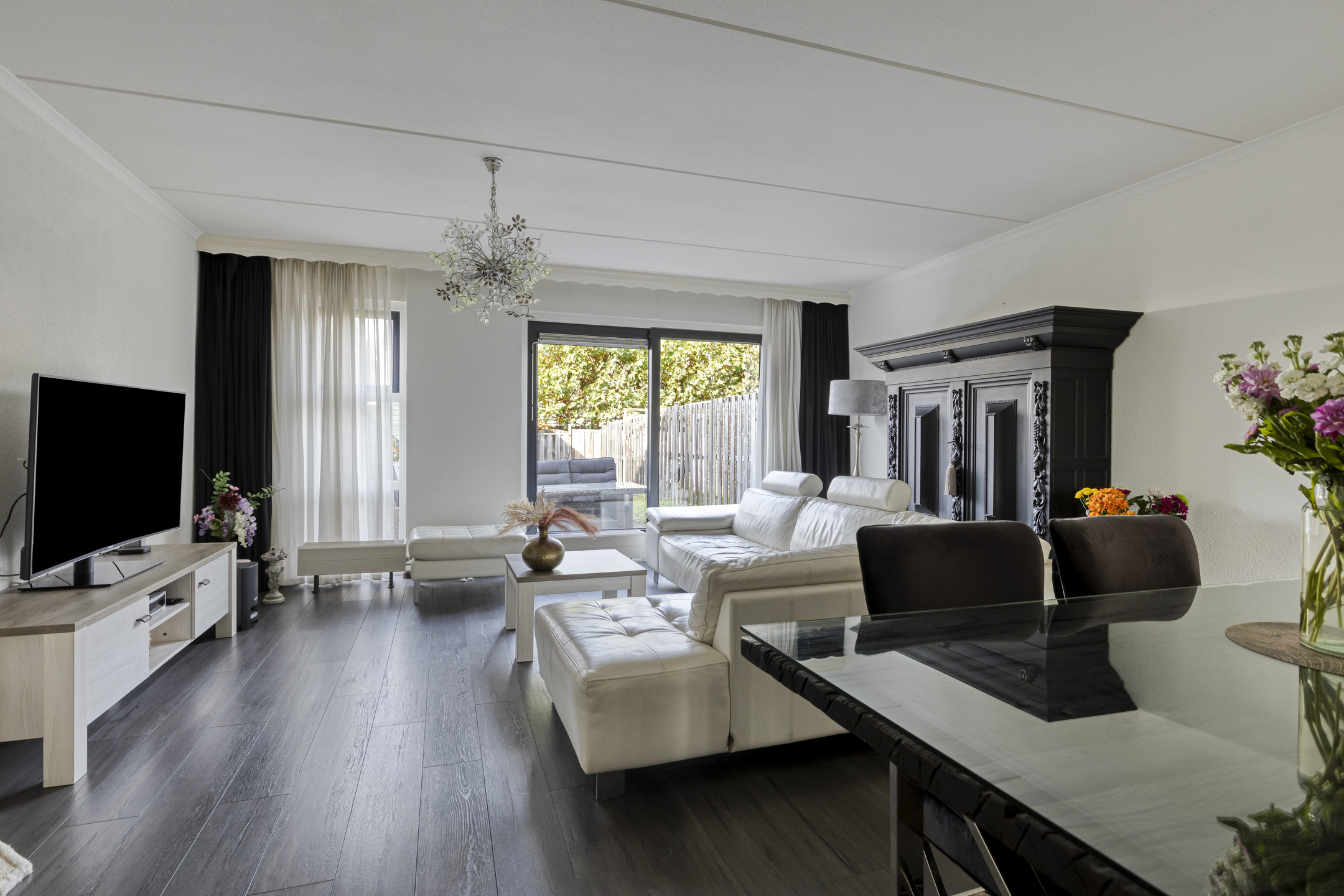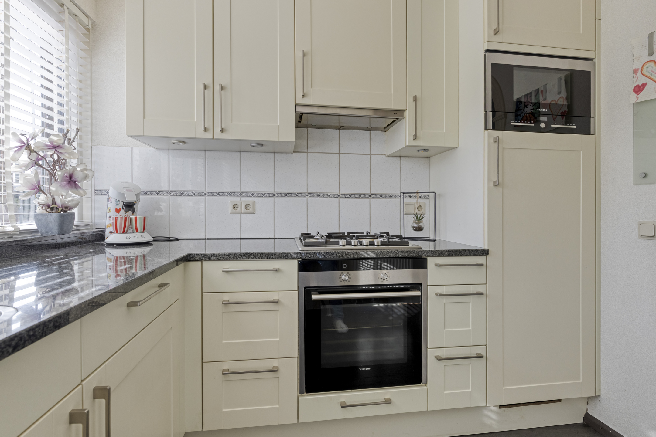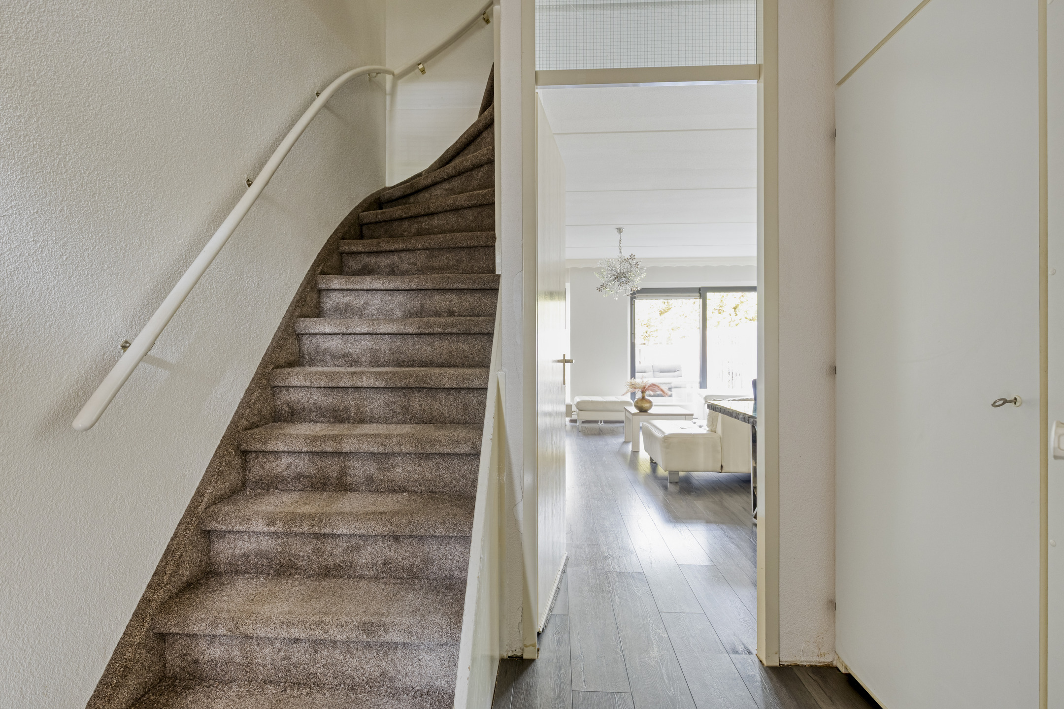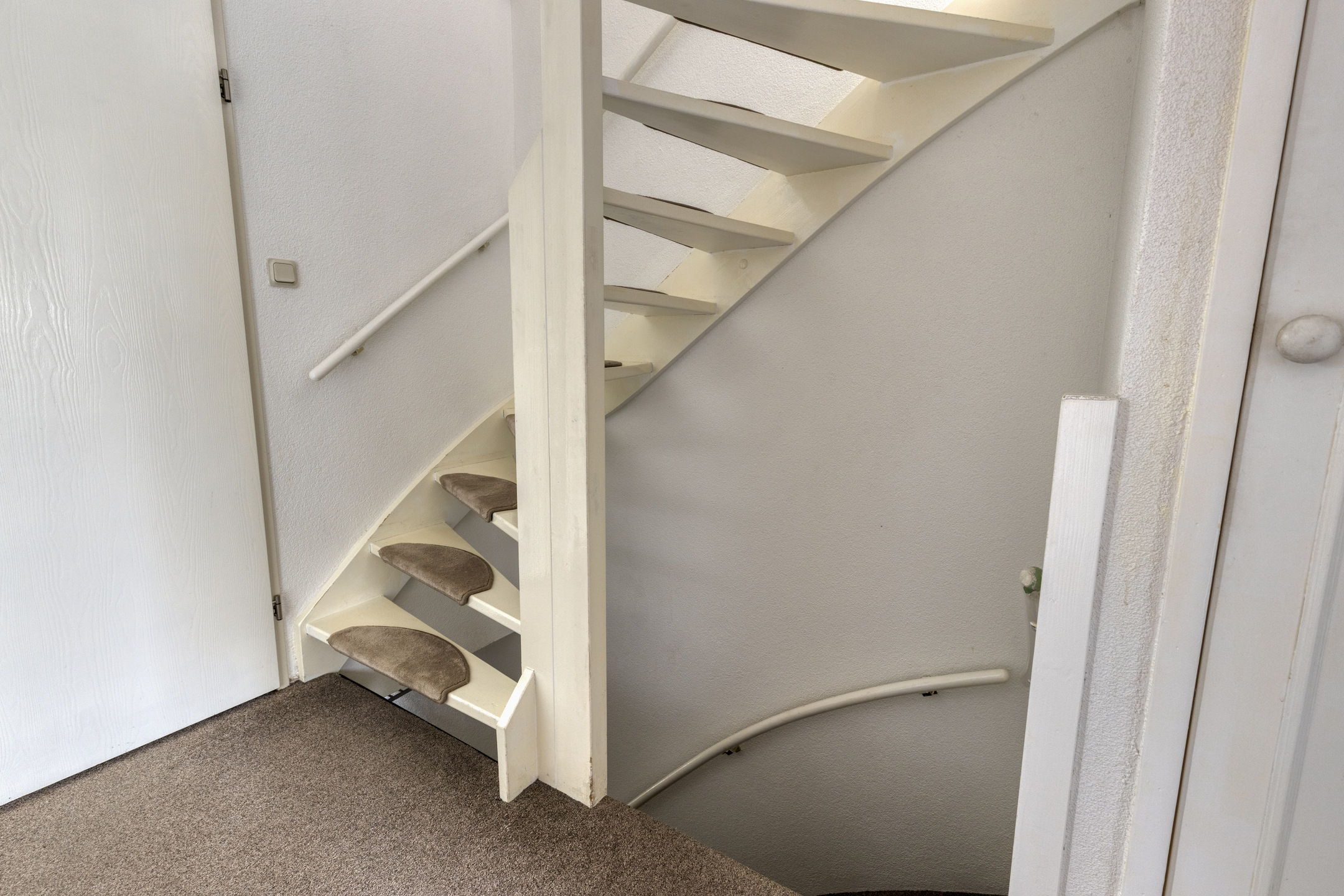 Begane grond: overdekte entree, hal met trapopgang naar de 1e verdieping, meterkast en toilet voorzien van wandcloset. Lichte, tuingerichte woonkamer met trapkast en schuifpui naar de achtertuin. Half open keuken in L-opstelling, voorzien van 4-pits gaskookplaat, afzuigkap, combi-oven, koelkast en vaatwasser.