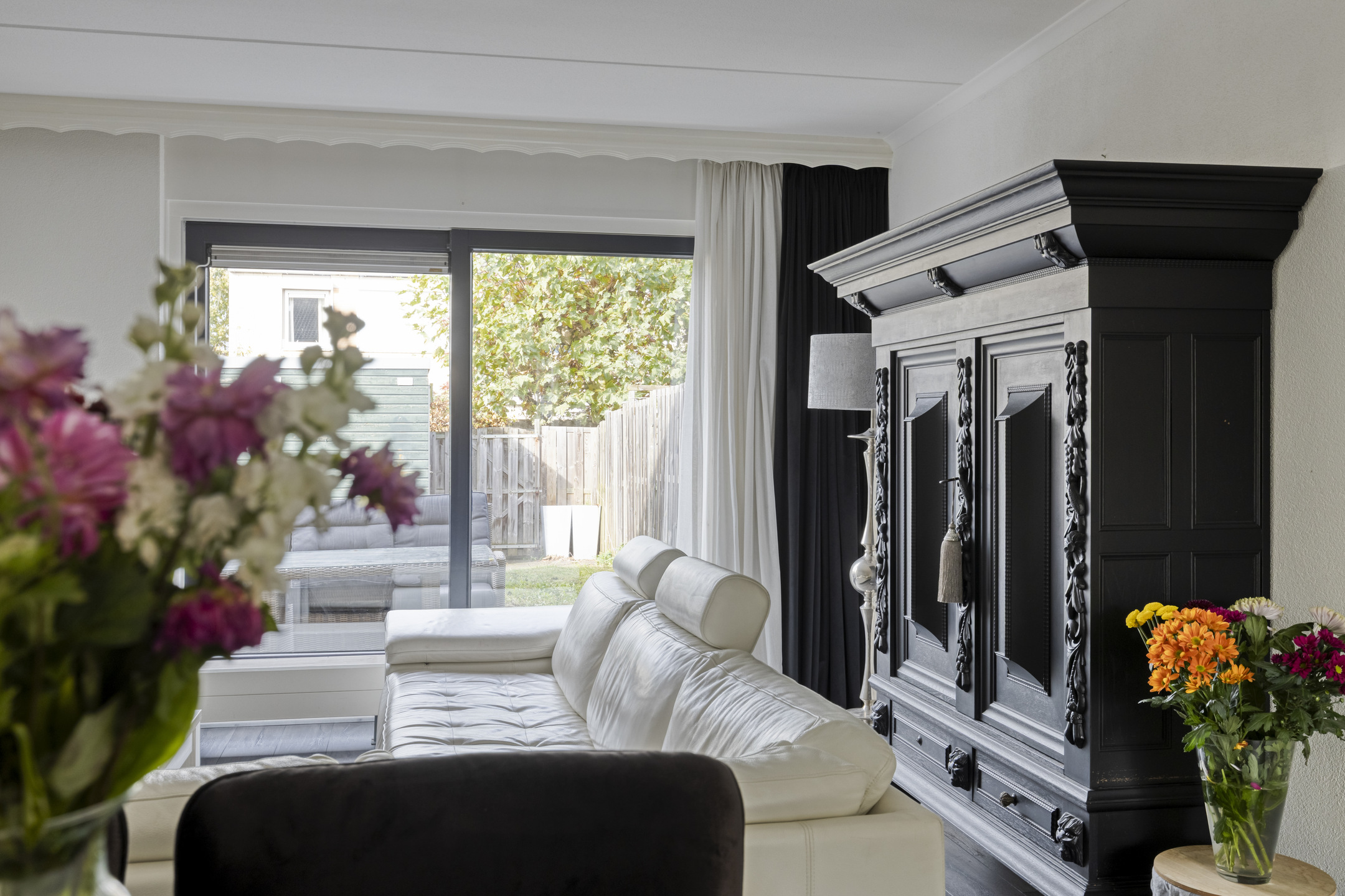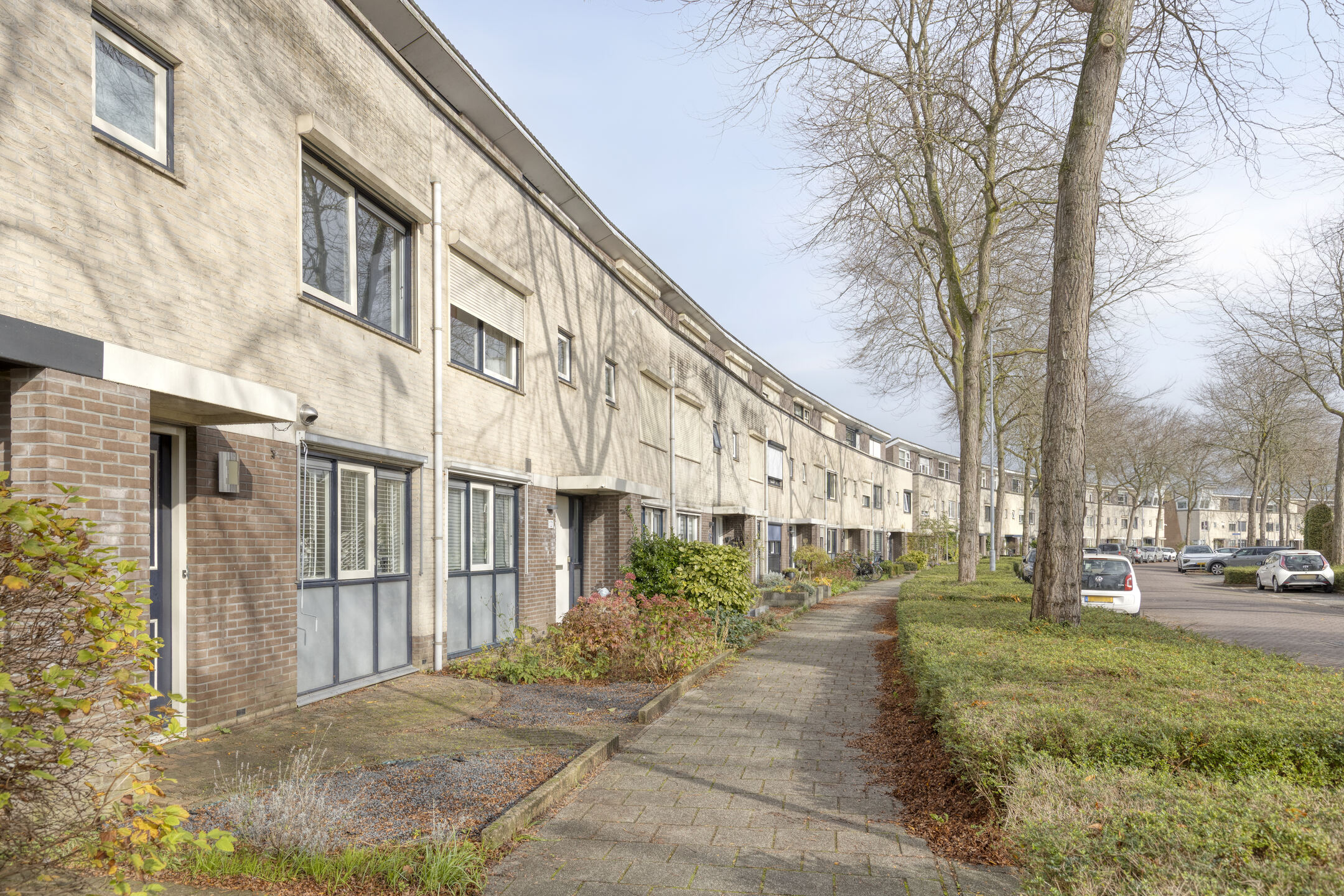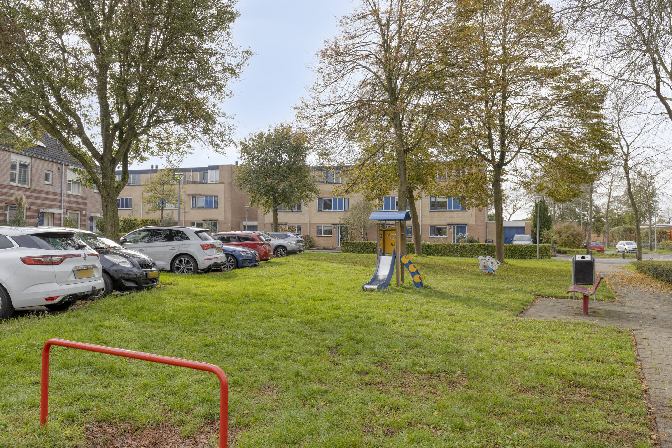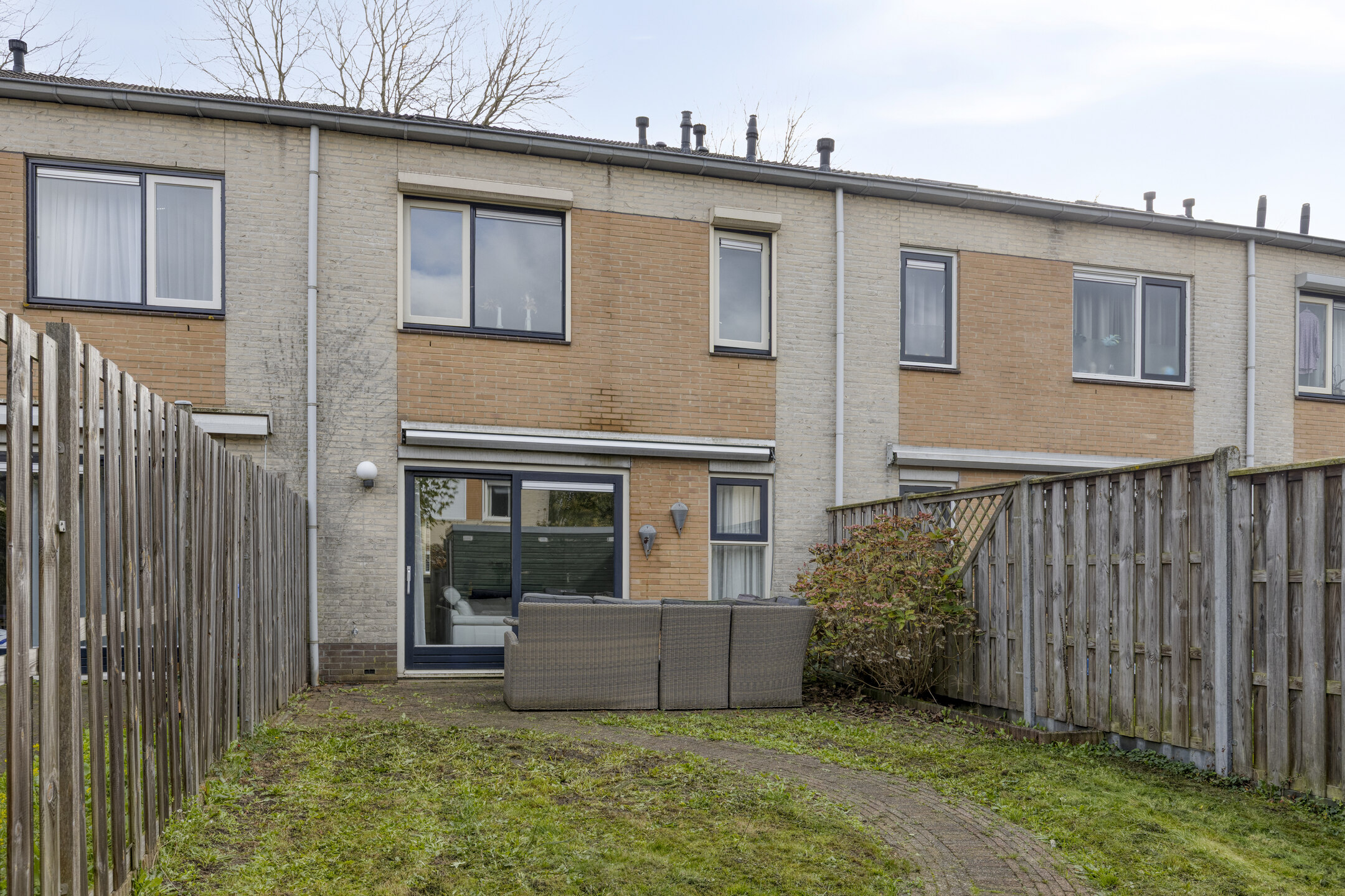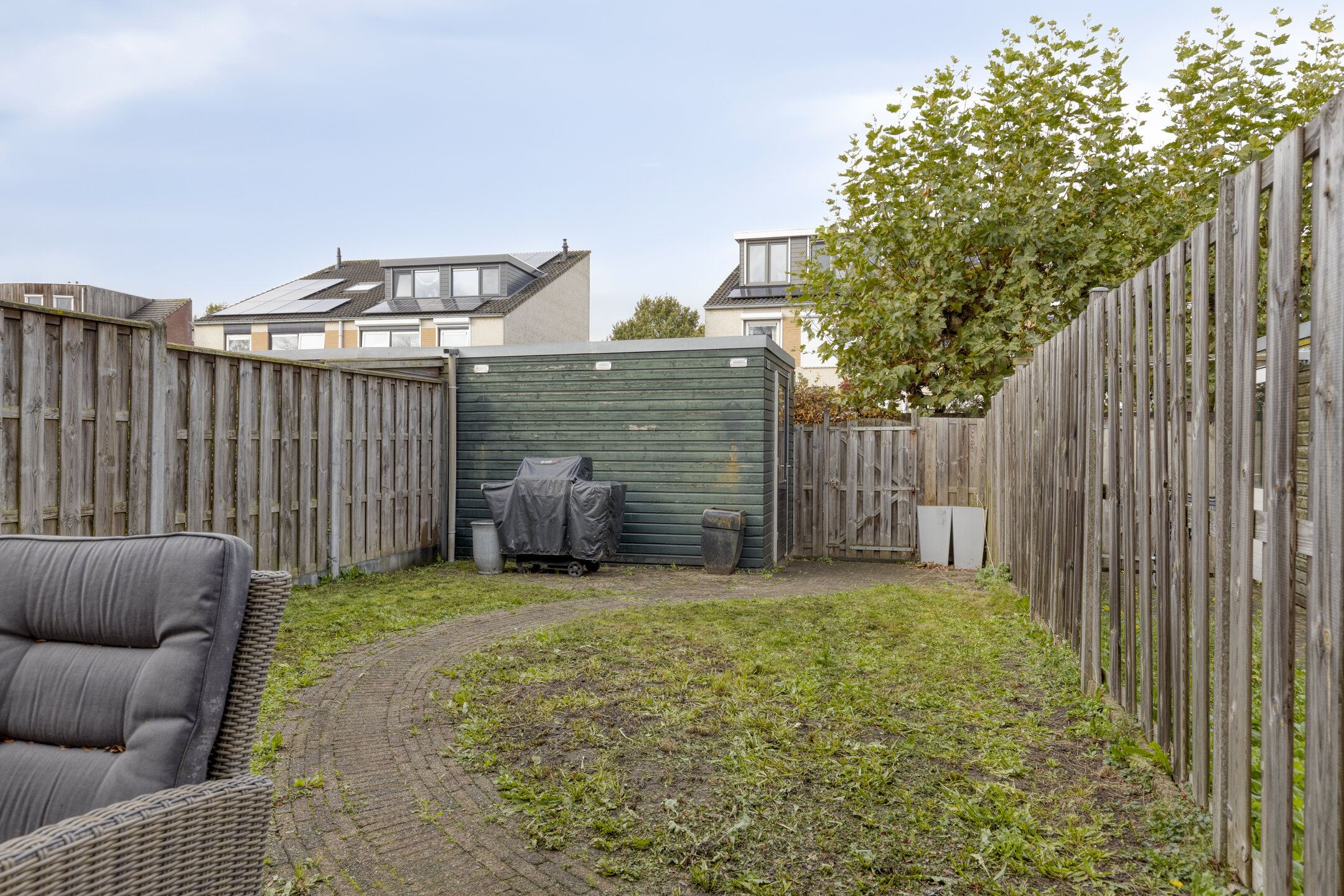 Onderhoudsvriendelijke achtertuin met terras voorzien van zonnescherm aan de achtergevel, gazon, houten berging en achterom. Parkeren is mogelijk op de openbare parkeervoorzieningen in de straat.