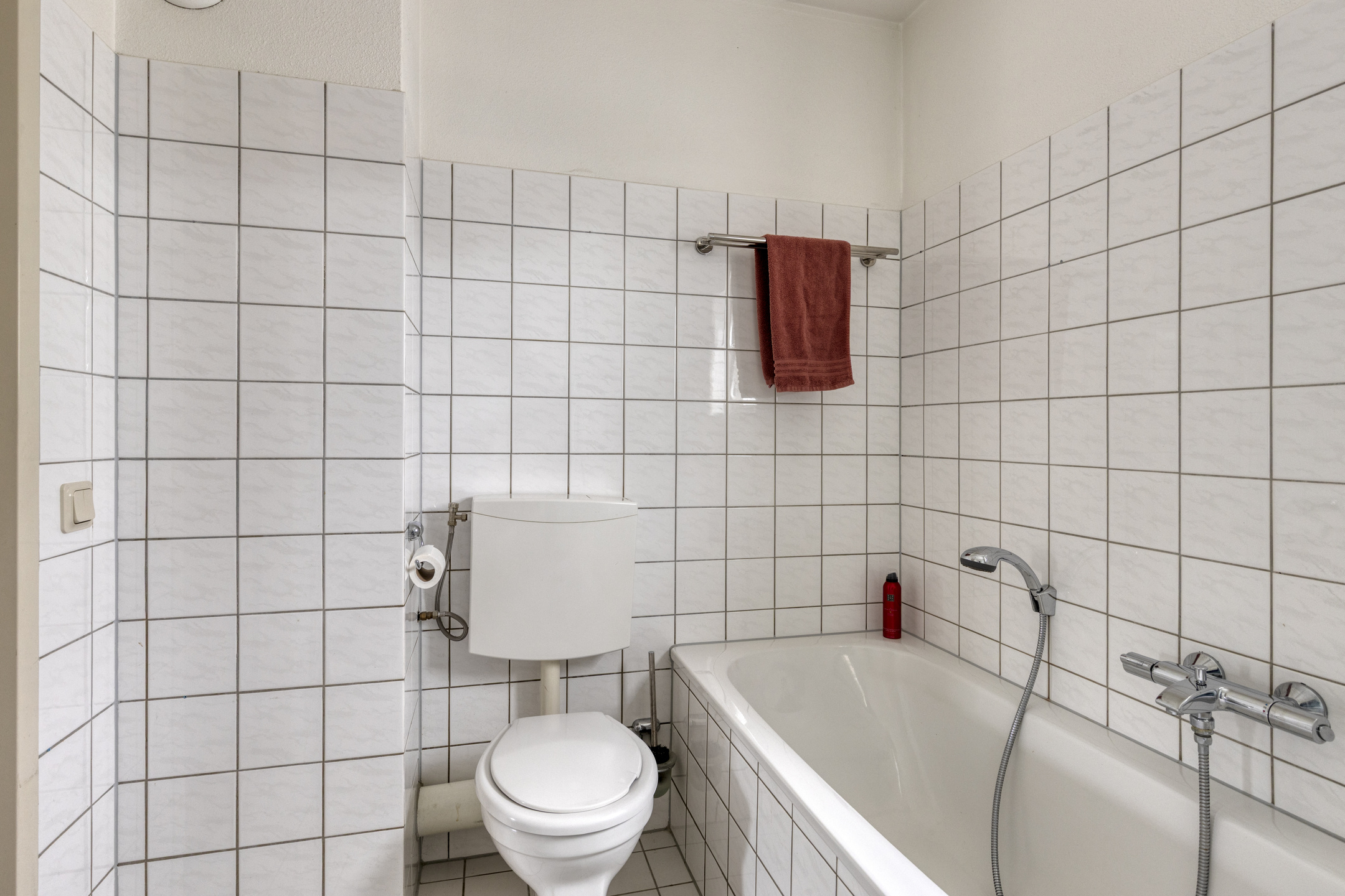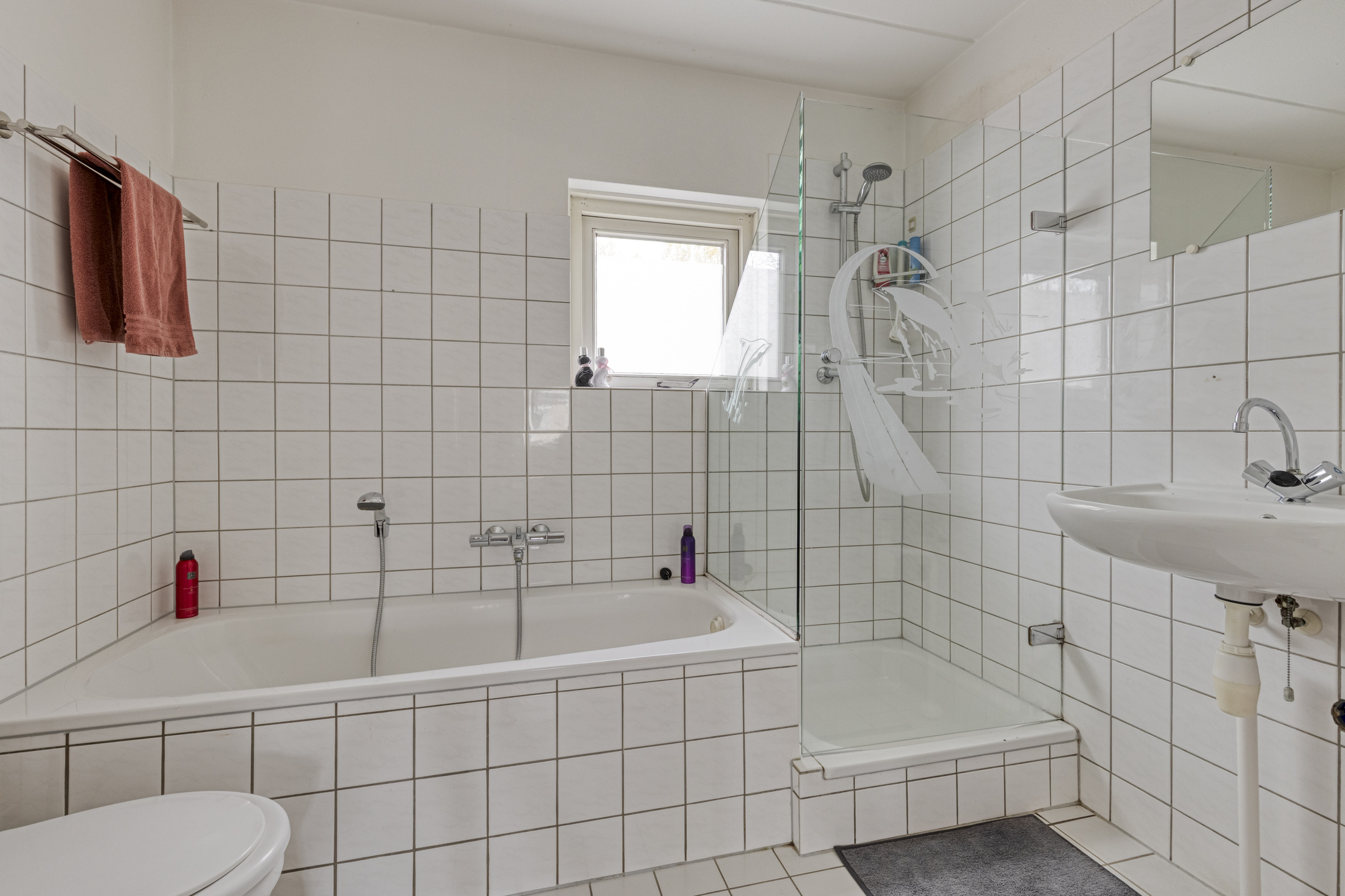 1e Verdieping: overloop met vaste kast. Drie slaapkamers ter grootte van circa 8 m², 9 m² en 15 m², alle voorzien van rolluiken en laminaatvloer. Badkamer voorzien van wastafel, ligbad, separate douche, toilet en handdoekenradiator.