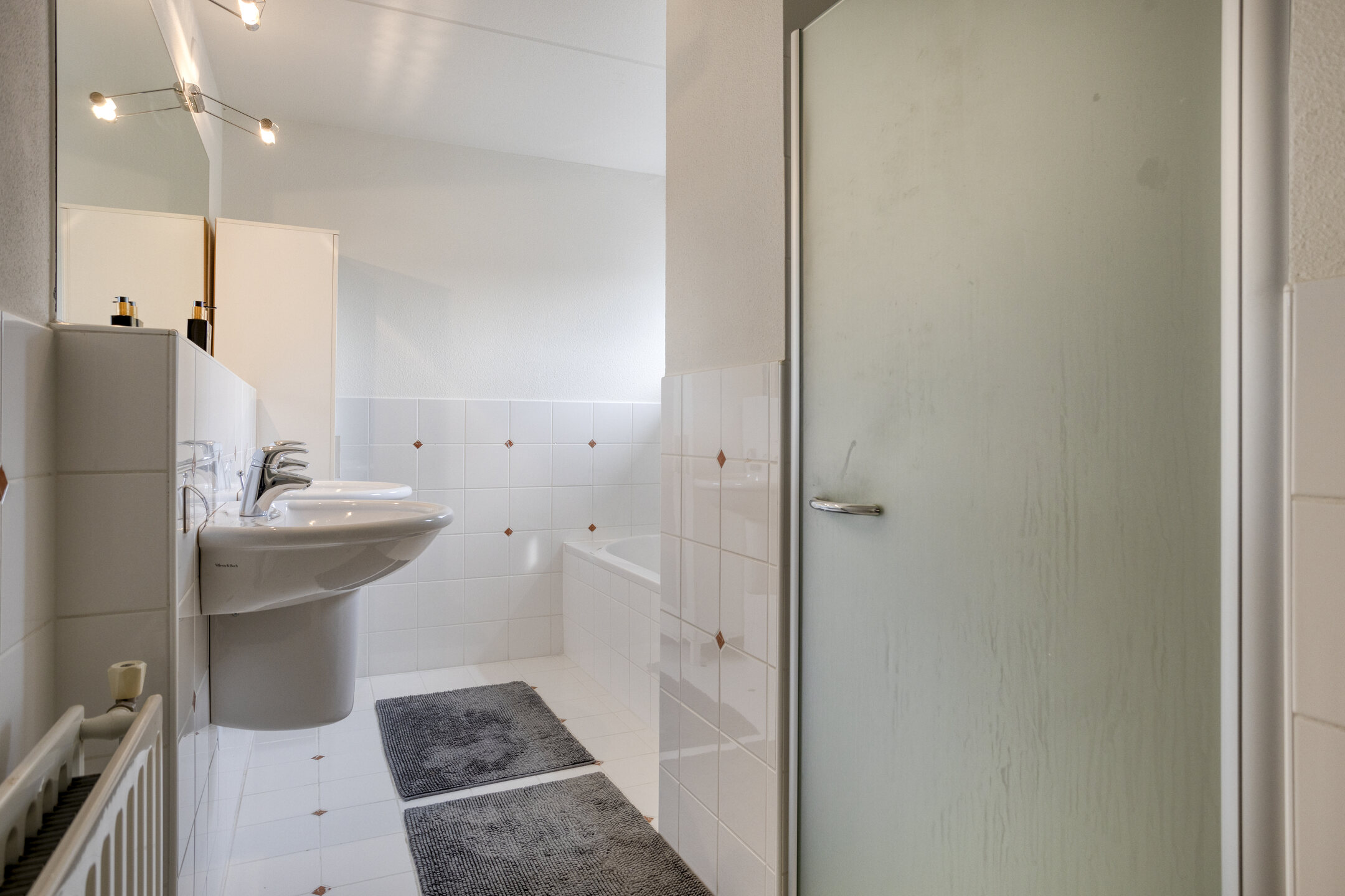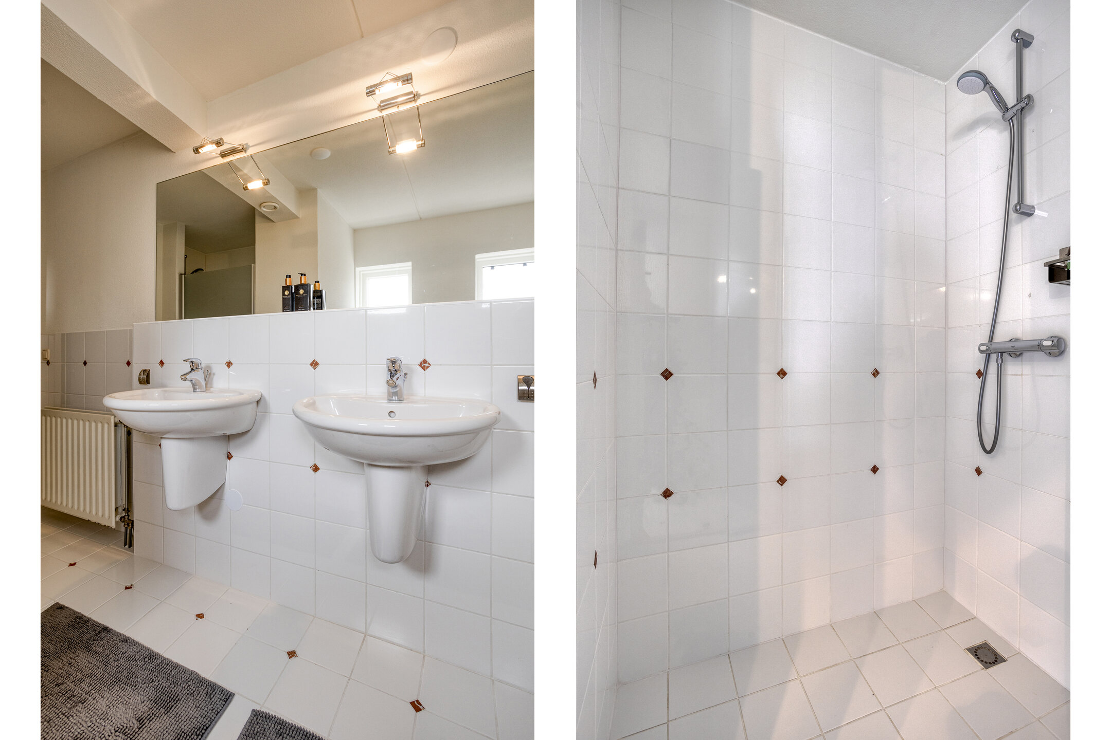 1e Verdieping: ruime overloop. Drie slaapkamers ter grootte van circa 9 m², 15 m² en 16 m², allen voorzien van houten vloeren. De slaapkamer aan de achterzijde beschikt tevens over een inloopkast ter grootte van circa 3,5 m². Ruime badkamer met twee wastafels, ligbad en inloopdouche. Separaat tweede toilet.