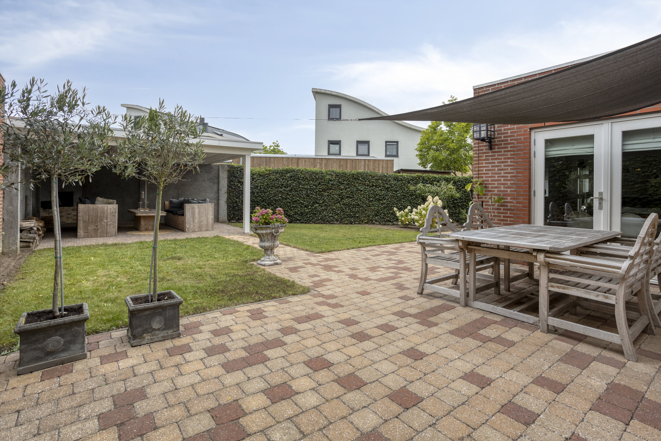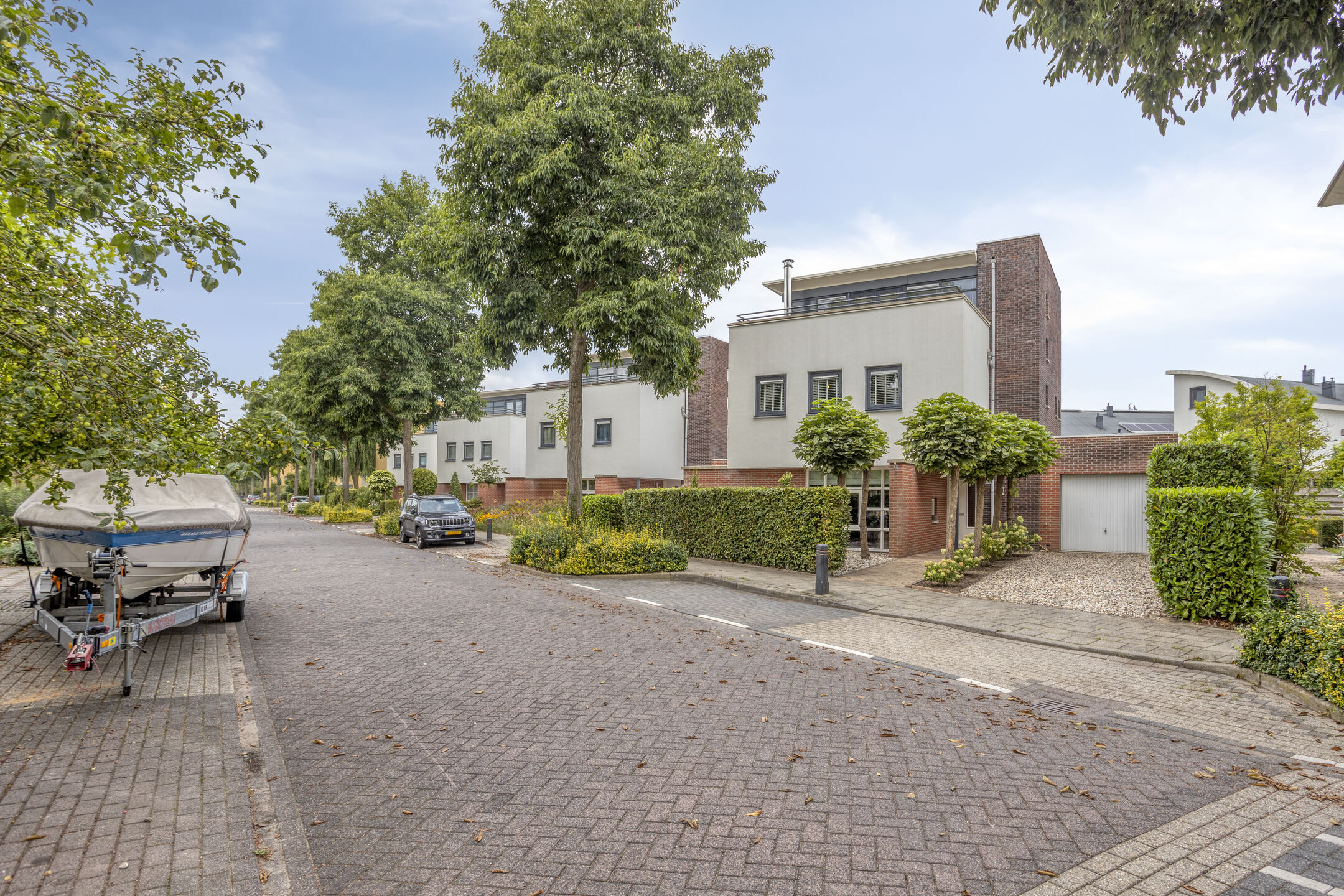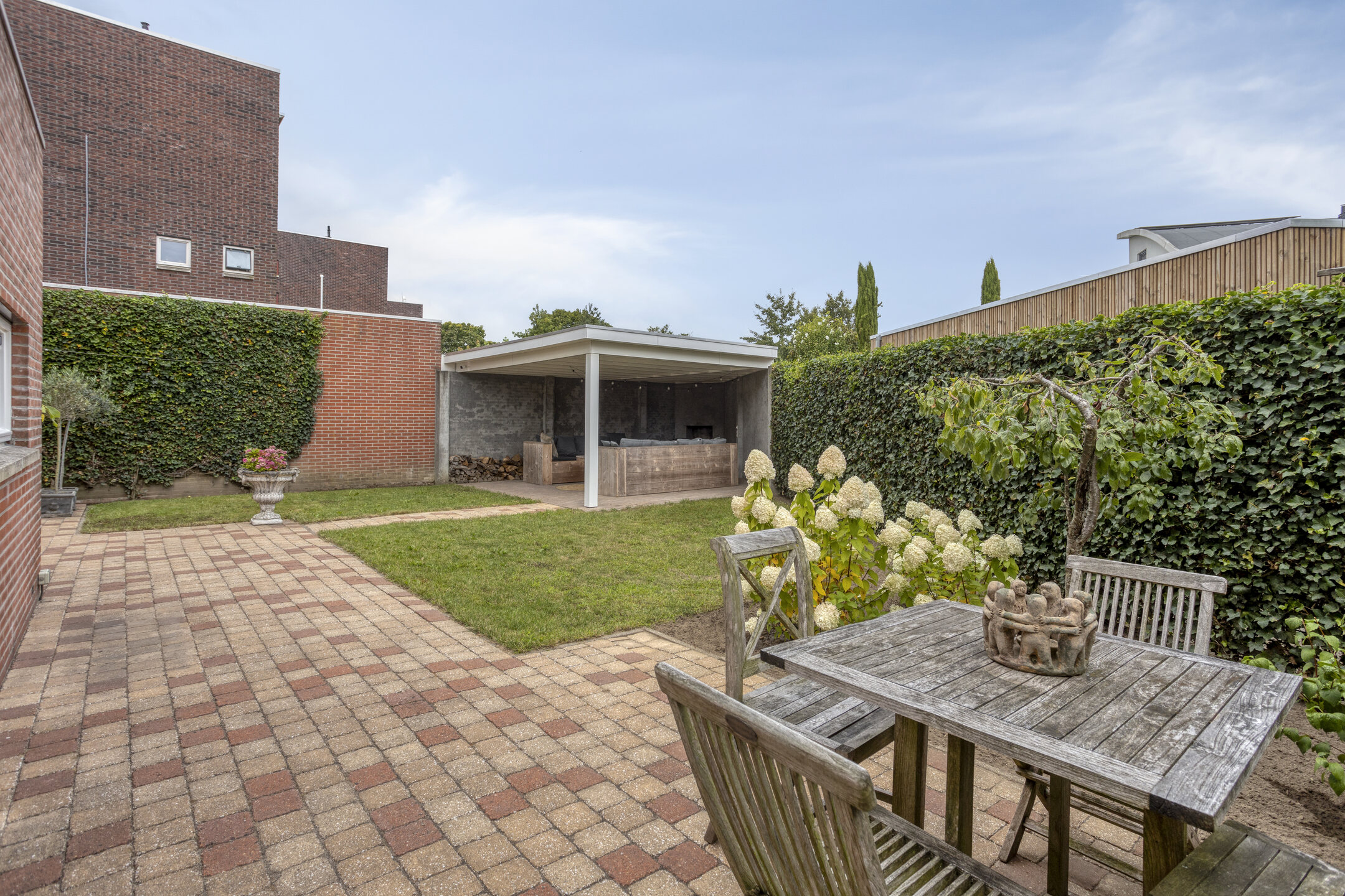 Keurig aangelegde achtertuin voorzien van een fraai terras aan de achtergevel, gazon, overkapping achterin en een achterom te bereiken langs de woning. Aan de voorzijde is een siertuin aanwezig, aangebouwde garage ter grootte van circa 16,5 m² en een oprit met parkeerruimte op eigen terrein!
