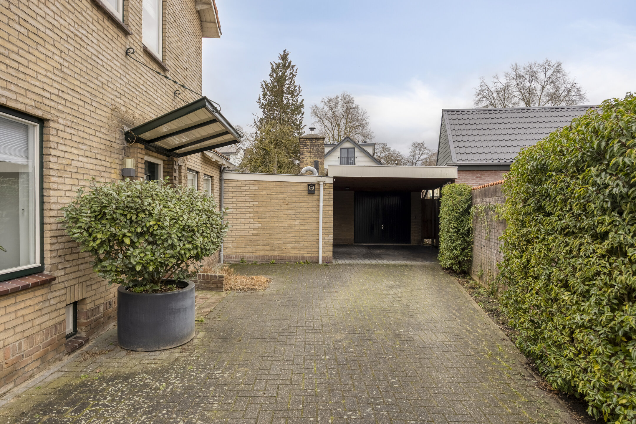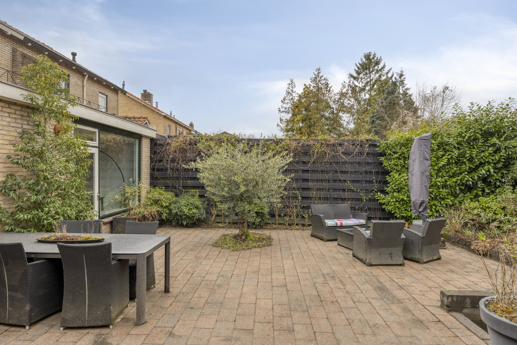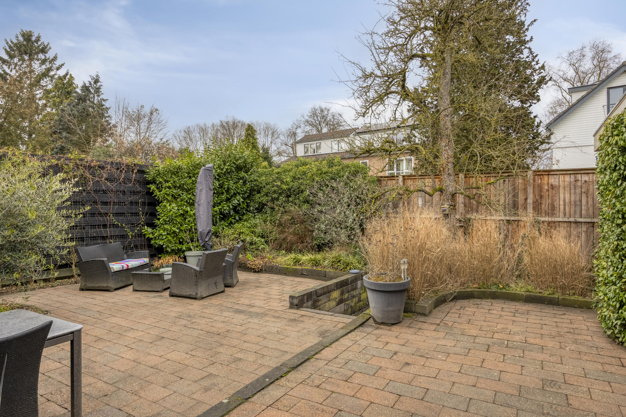 Brede, onderhoudsvriendelijke achtertuin met terras, siertuin en toegang tot de ruime vrijstaande garage (met kelder). Aan de zijkant is een lange oprit aanwezig met aan het einde een carport.