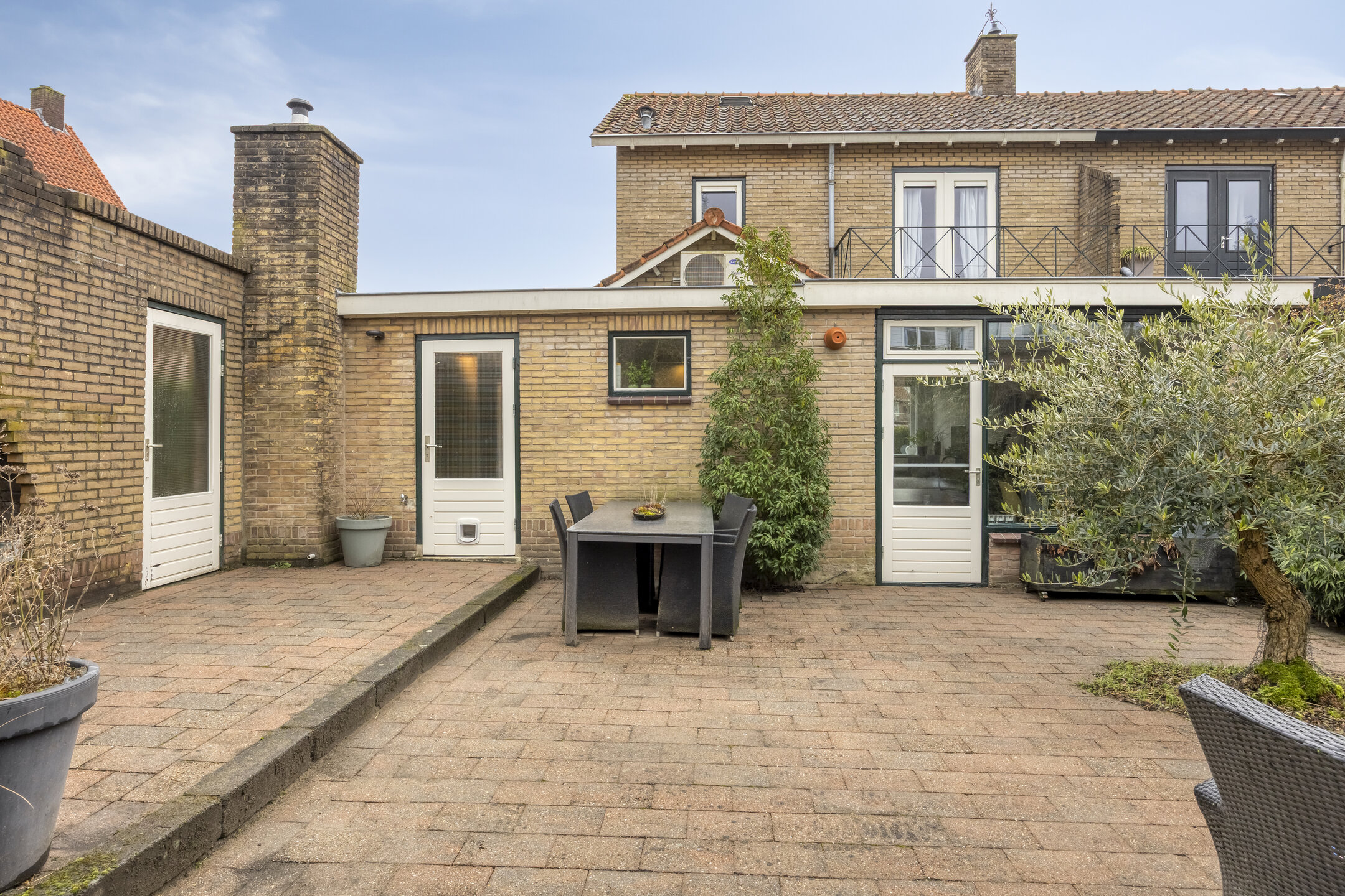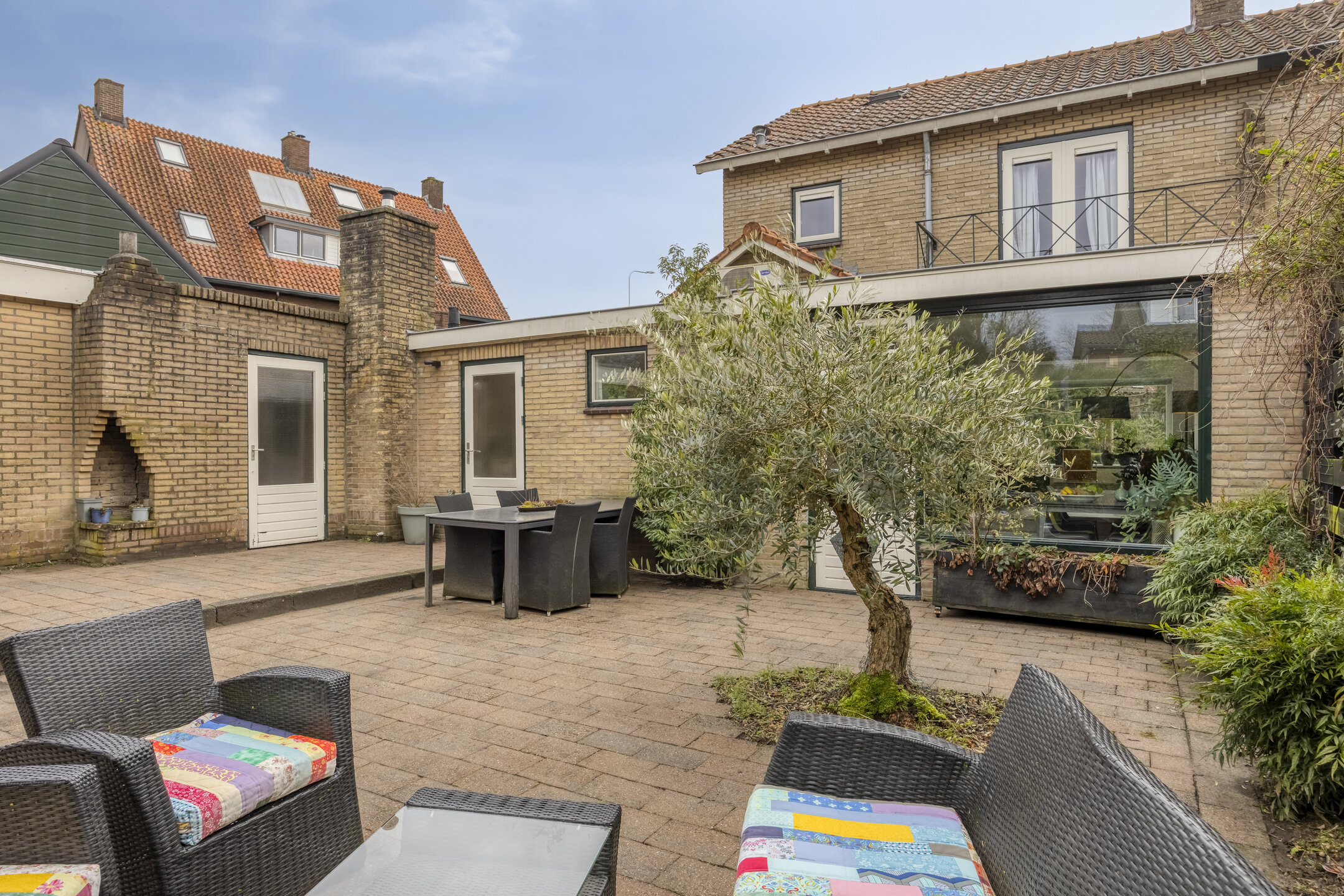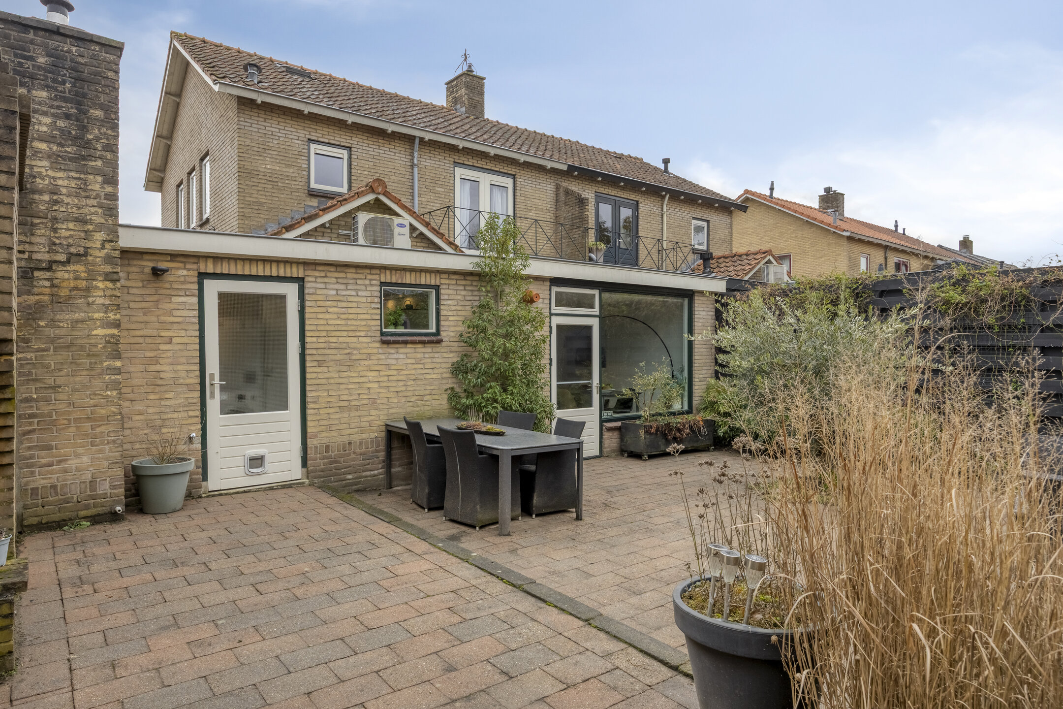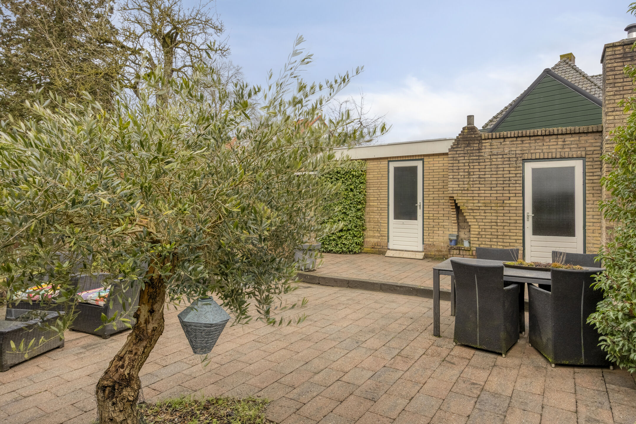 Brede, onderhoudsvriendelijke achtertuin met terras, siertuin en toegang tot de ruime vrijstaande garage (met kelder). Aan de zijkant is een lange oprit aanwezig met aan het einde een carport.