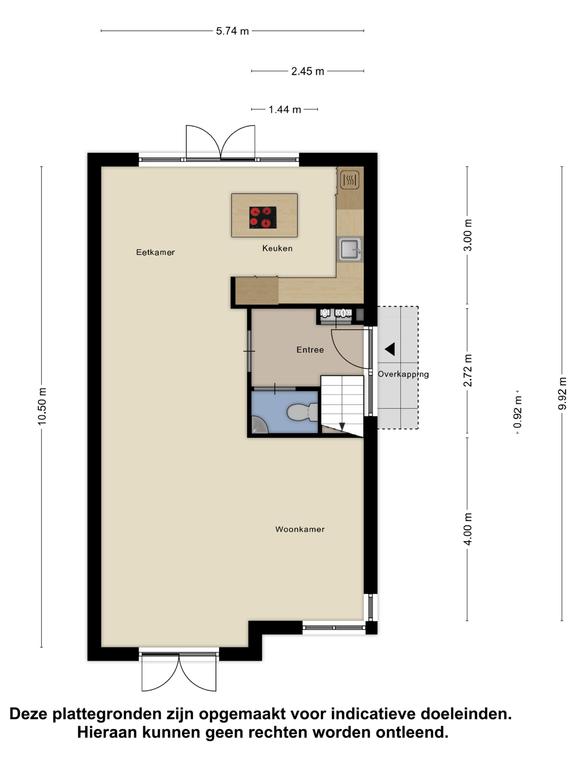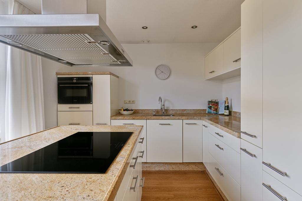 Begane grond: entree, hal met meterkast, trapopgang naar de 1e verdieping en toilet voorzien van fonteintje. Ruime woonkamer voorzien van PVC-vloer, met zithoek aan de voorzijde en eethoek aan de achterzijde, welke beide zijn voorzien van openslaande tuindeuren. Half open keuken voorzien van kookeiland met inductiekookplaat en afzuigkap, combi-oven, koel-vriescombinatie en vaatwasser.