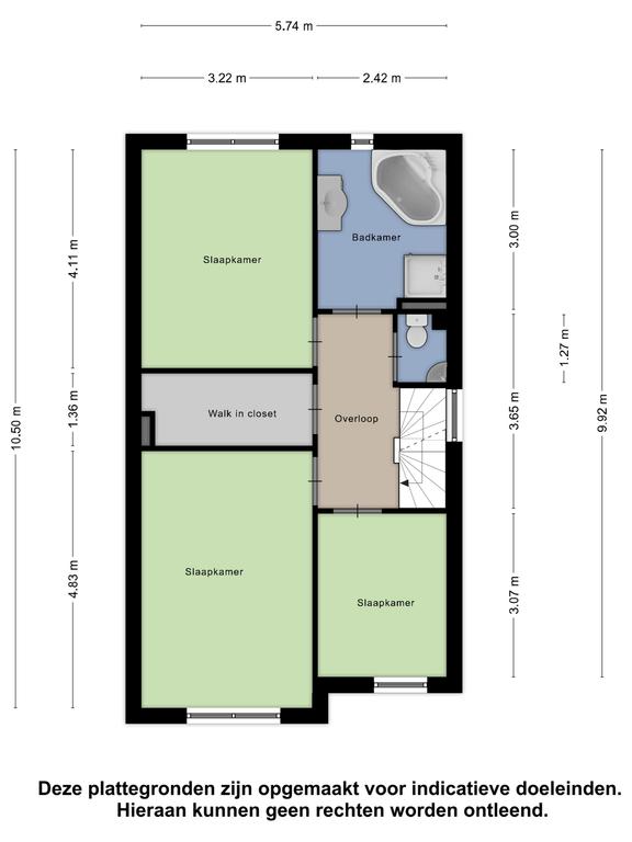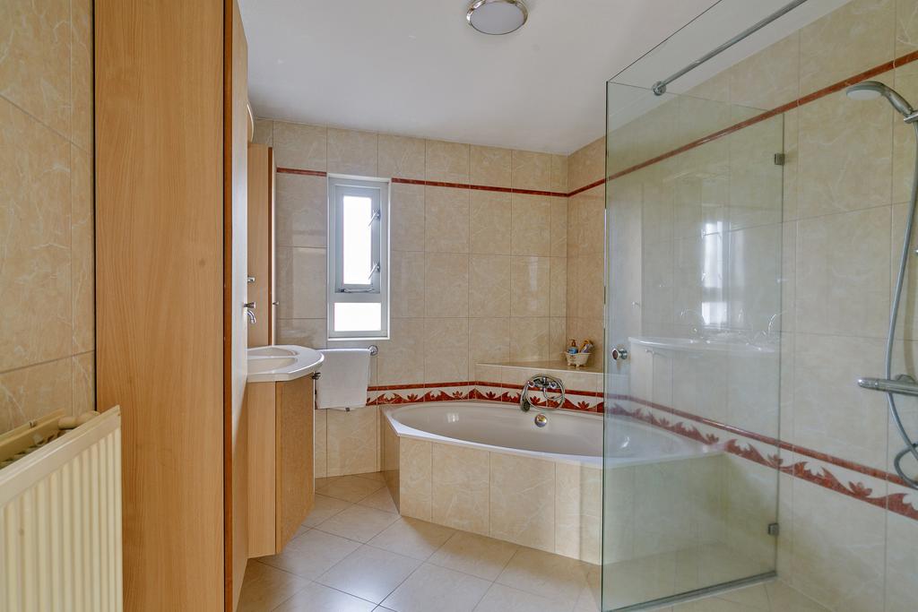 1e Verdieping: overloop met toegang tot de walk-in-closet. Drie slaapkamers ter grootte van circa 7 m², 13 m² en 15,5 m², alle voorzien van laminaatvloer. Ruime badkamer voorzien van ligbad, inloopdouche en dubbel wastafelmeubel. Separaat toilet voorzien van fonteintje.