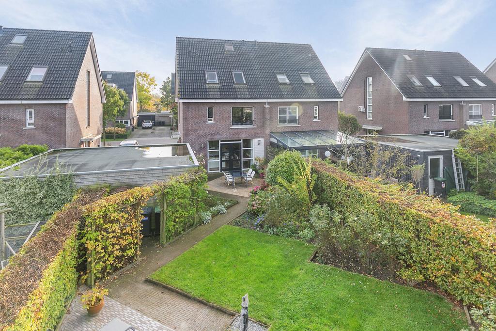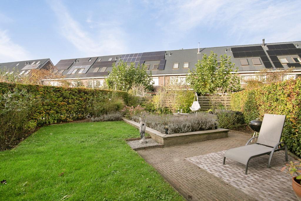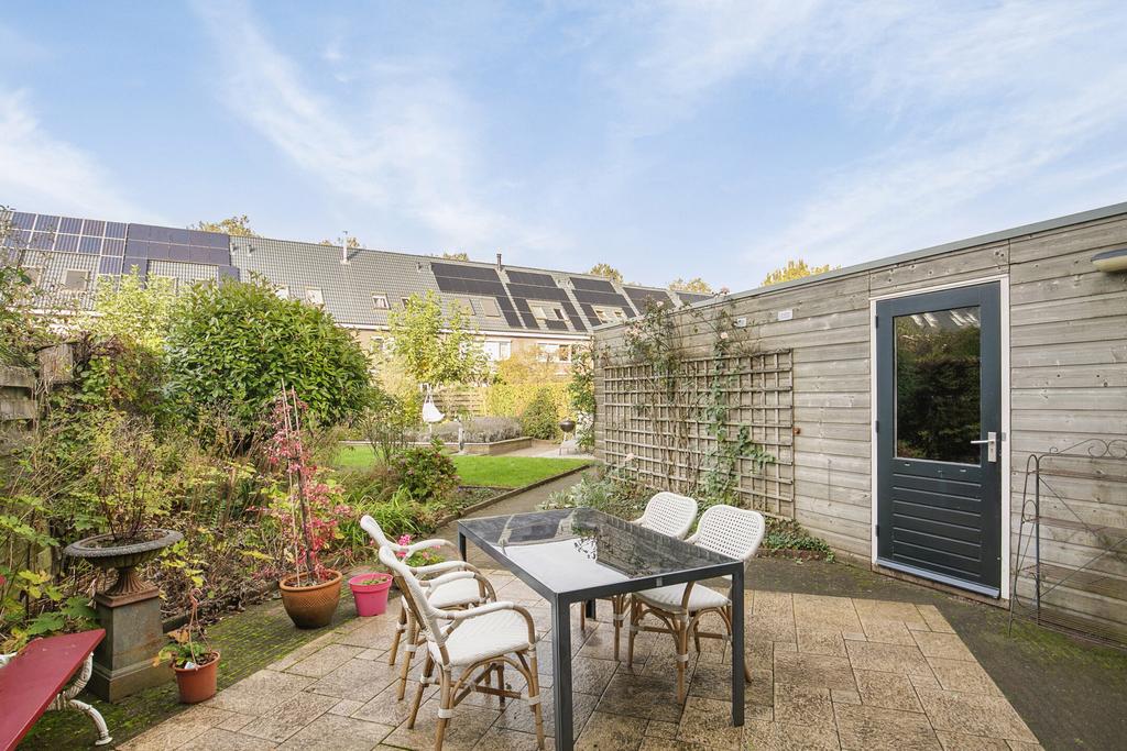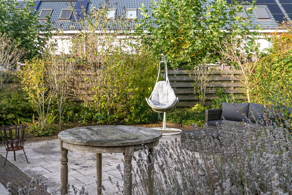 Fraai aangelegde- en diepe achtertuin met terras aan de achtergevel, meerdere borders, gazon, zitje achterin en houten vrijstaande garage ter grootte van circa 26 m². De tuin is achterom te bereiken vanaf de oprit naast de woning die parkeerruimte biedt voor minstens twee personenauto’s op eigen terrein!