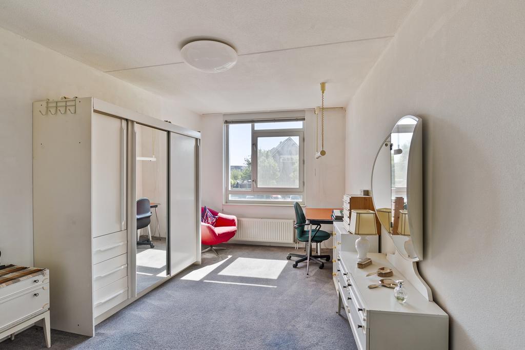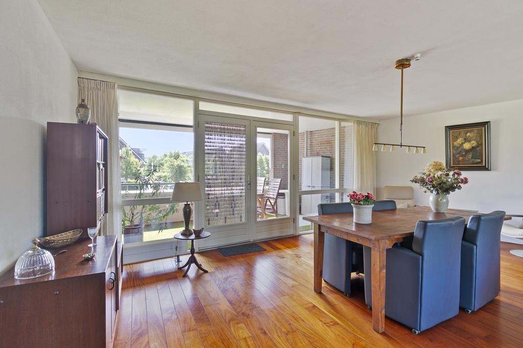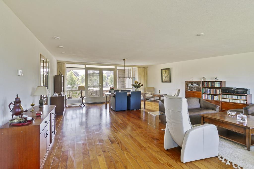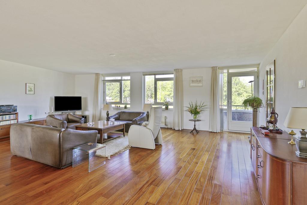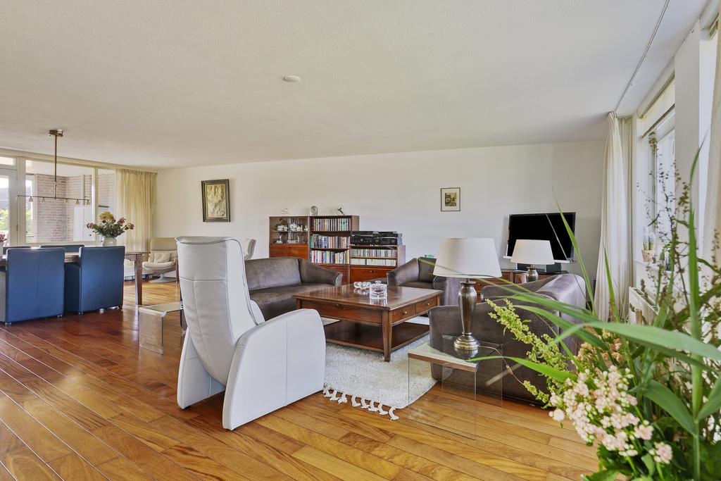 Woonverdieping: entree, hal met meterkast en gastentoilet voorzien van fonteintje en toegang tot de installatieruimte/berging met cv-opstelplaats en wasmachine-aansluiting. Riante woonkamer (circa 66 m²) voorzien van parketvloer en toegang tot beide balkons. Dichte keuken met kurkvloer in L-opstelling, voorzien van 4-pits keramische kookplaat, afzuigkap, combi-oven, koelkast en vaatwasser. Twee ruime slaapkamers ter grootte van circa 14,5 m² en 19 m², beiden voorzien van vloerbedekking. Badkamer voorzien van ligbad, wastafel, douche en toilet.