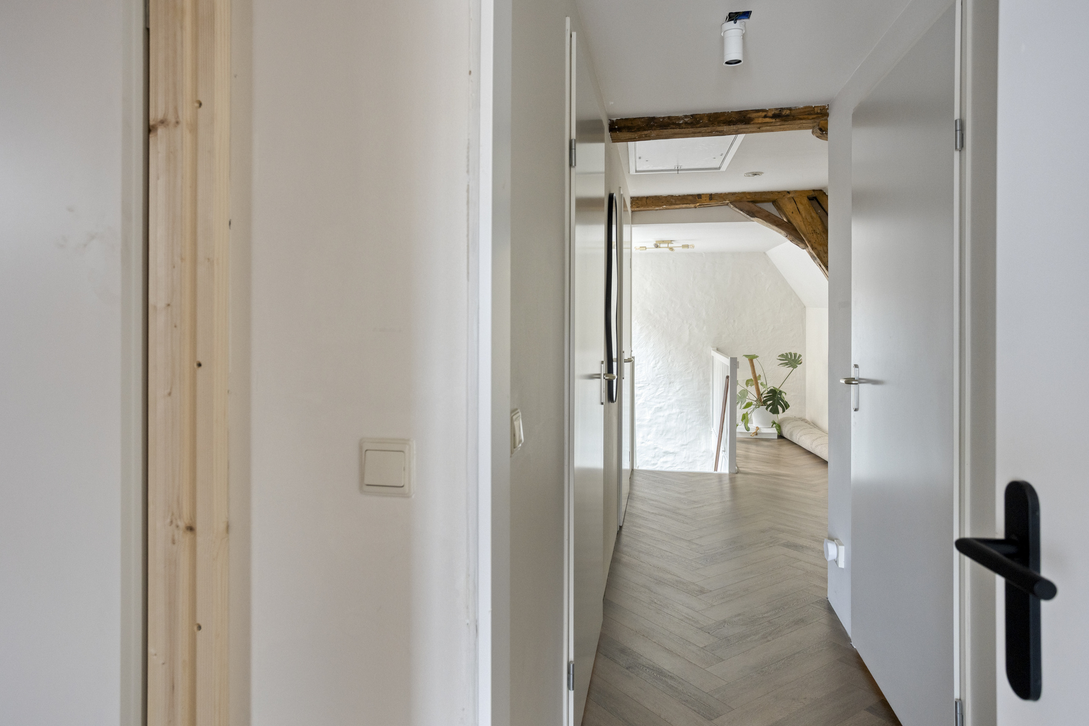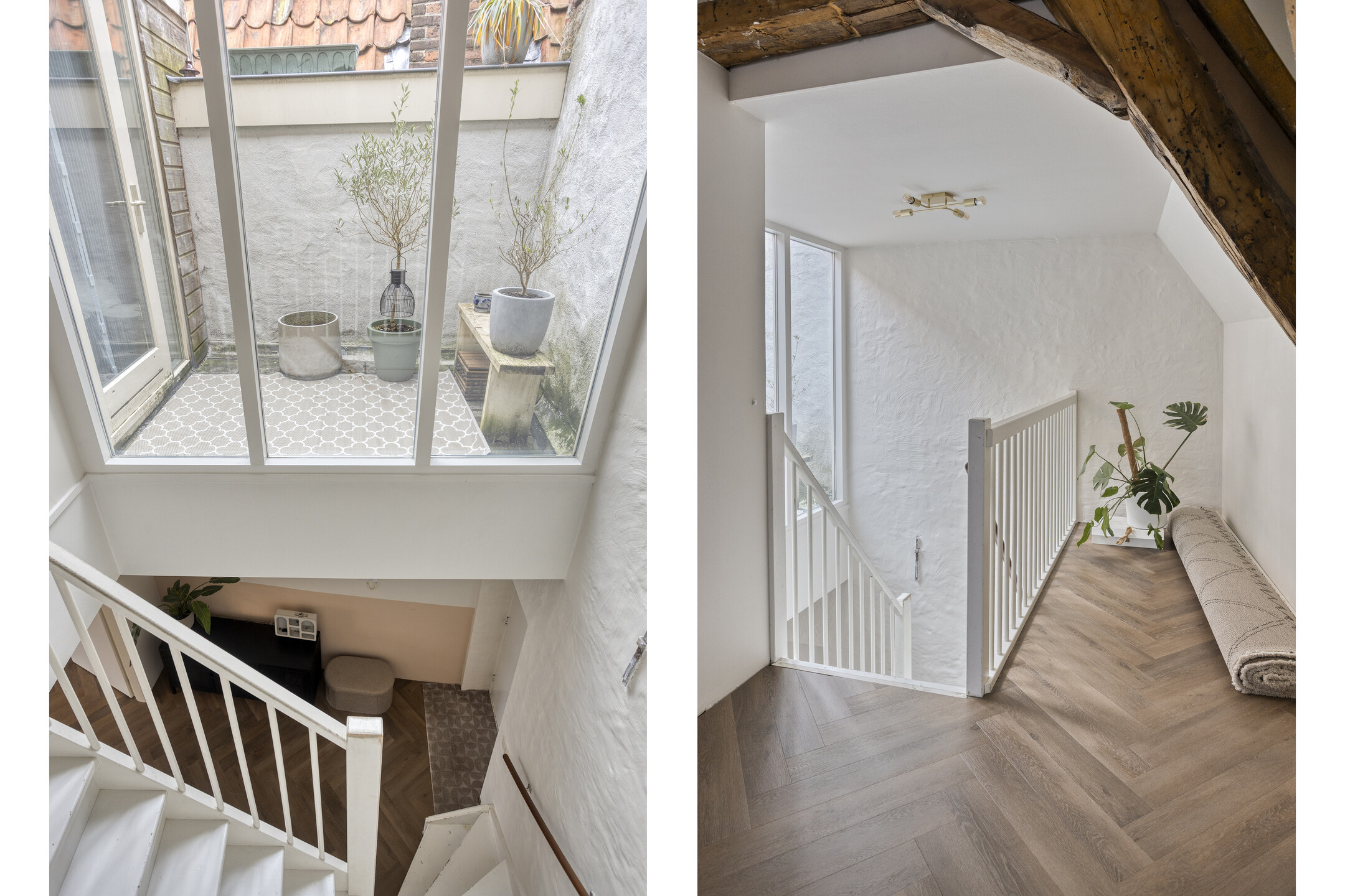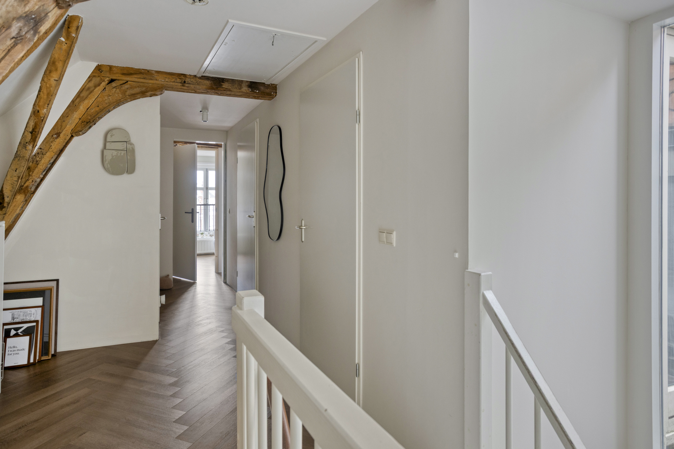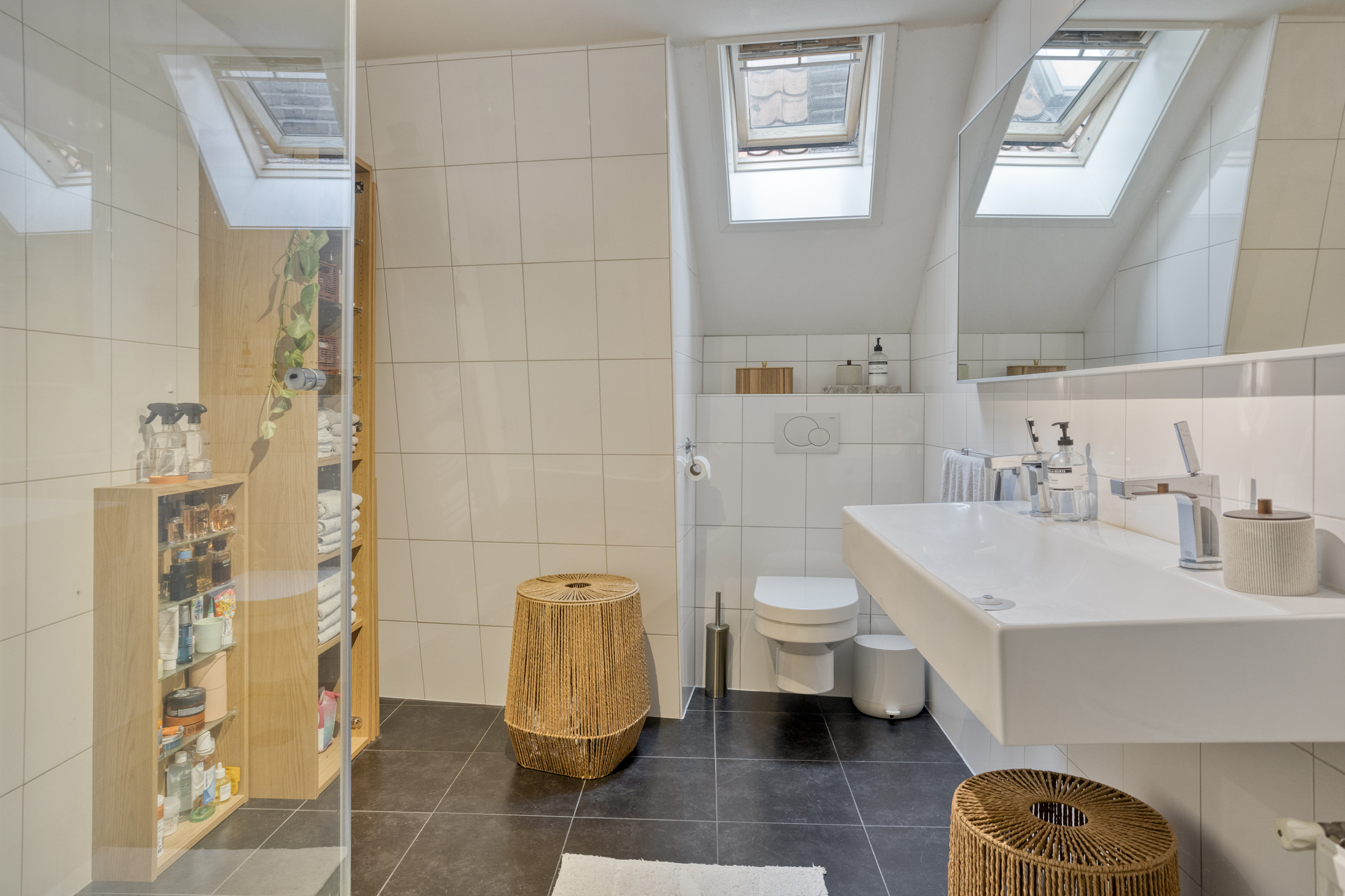2e woonlaag: ruime overloop met vlizotrap naar de bergzolder en toegang tot de wasruimte/berging met cv-opstelplaats. Drie slaapkamers ter grootte van circa 8 m², 9,5 m² en 10,5 m², alle tot in de puntjes afgewerkt, maar toch met behoud van authentieke details. Nette badkamer voorzien van dakraam, met ruime douche, dubbel-wastafelmeubel en wandcloset. Besloten balkon/dakterras ter grootte van circa 4 m².