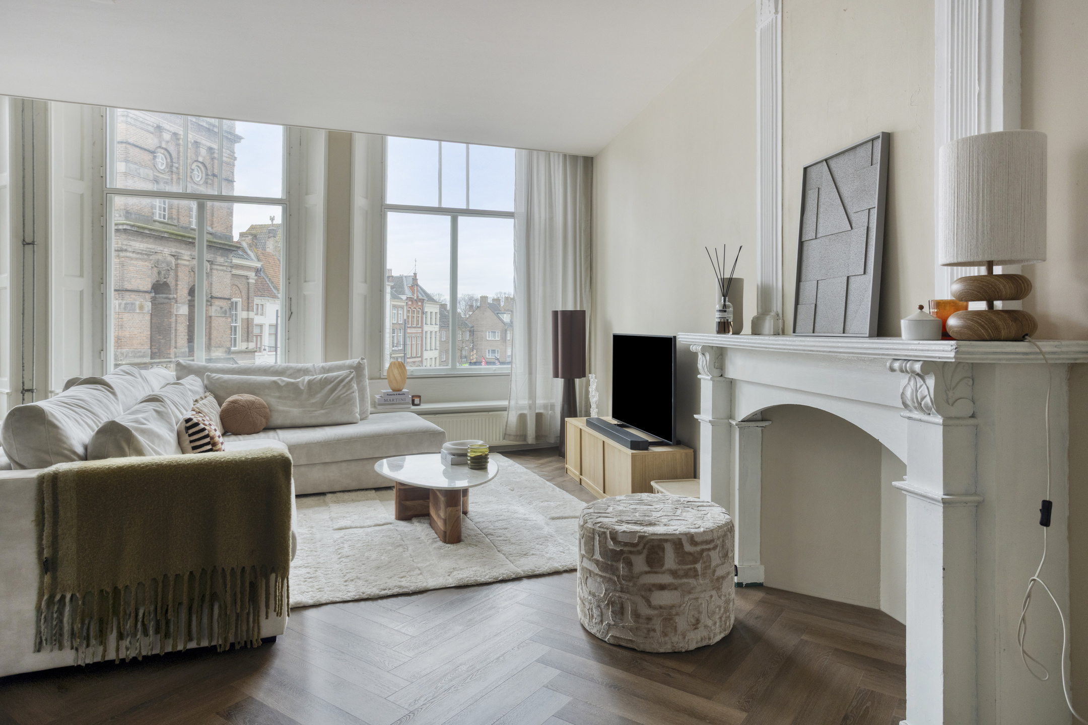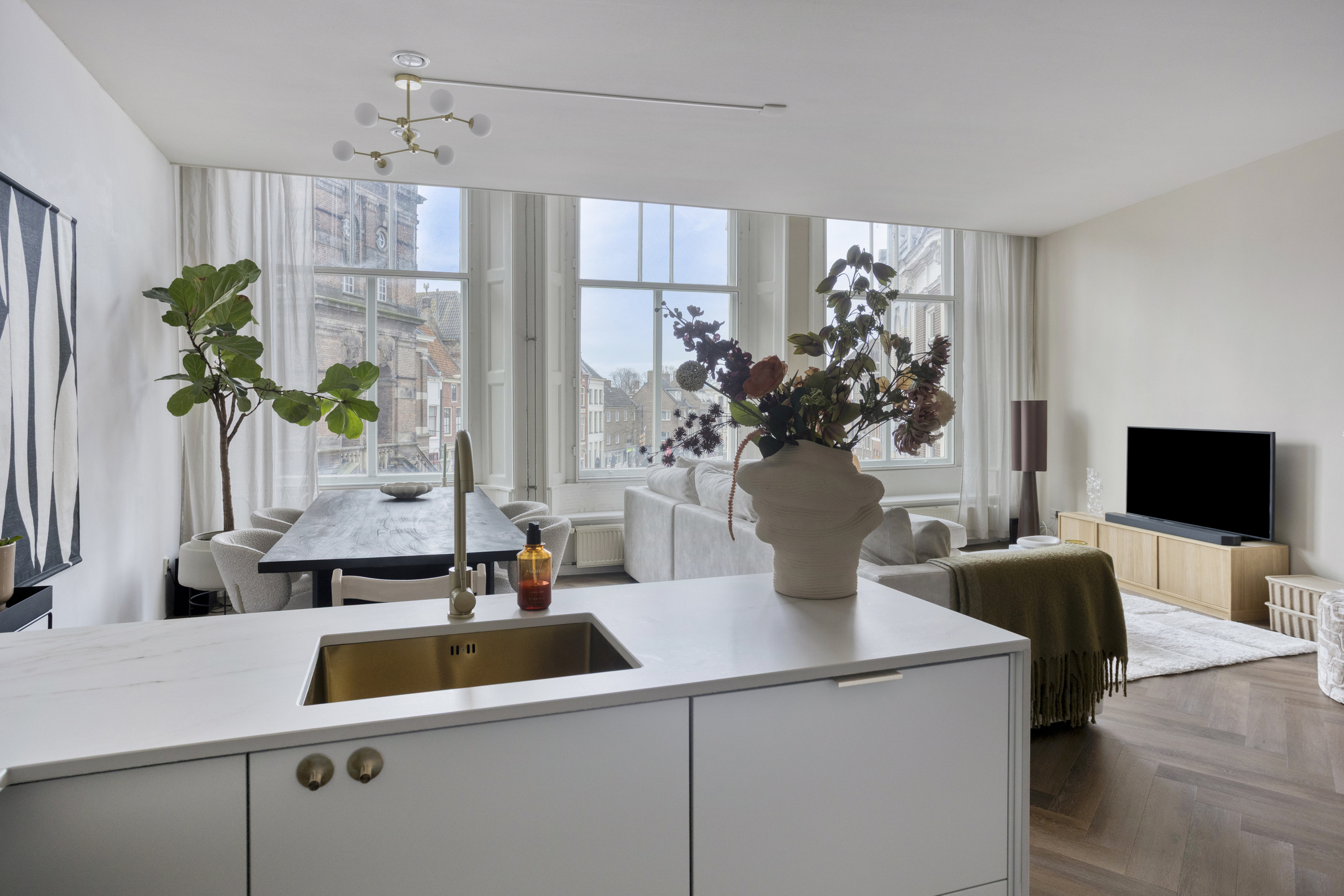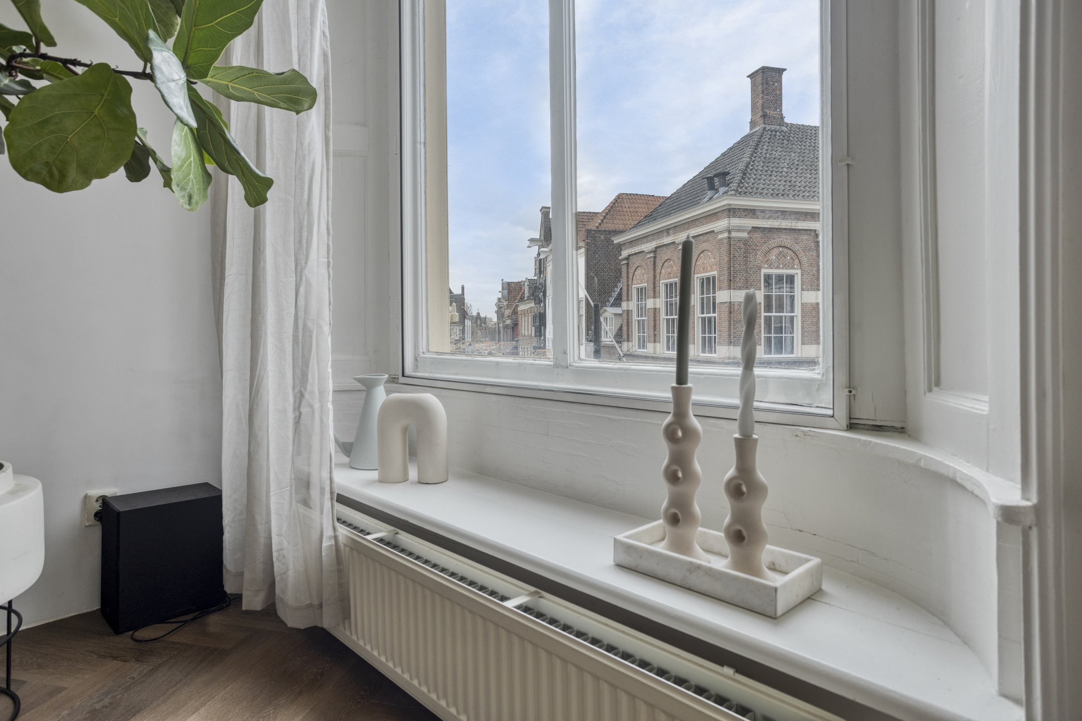1e woonlaag: entree, hal met trapopgang naar de verdieping, berging met meterkast en toilet voorzien van wandcloset en fonteintje. Ruime woonkamer met werkelijk prachtig uitzicht over de markt en de wijnhuistoren, voorzien van visgraatvloer en schouw. Luxe open keuken in U-opstelling, voorzien van inductiekookplaat met geïntegreerde afzuiging, combi-oven, koelkast, vriezer en vaatwasser.