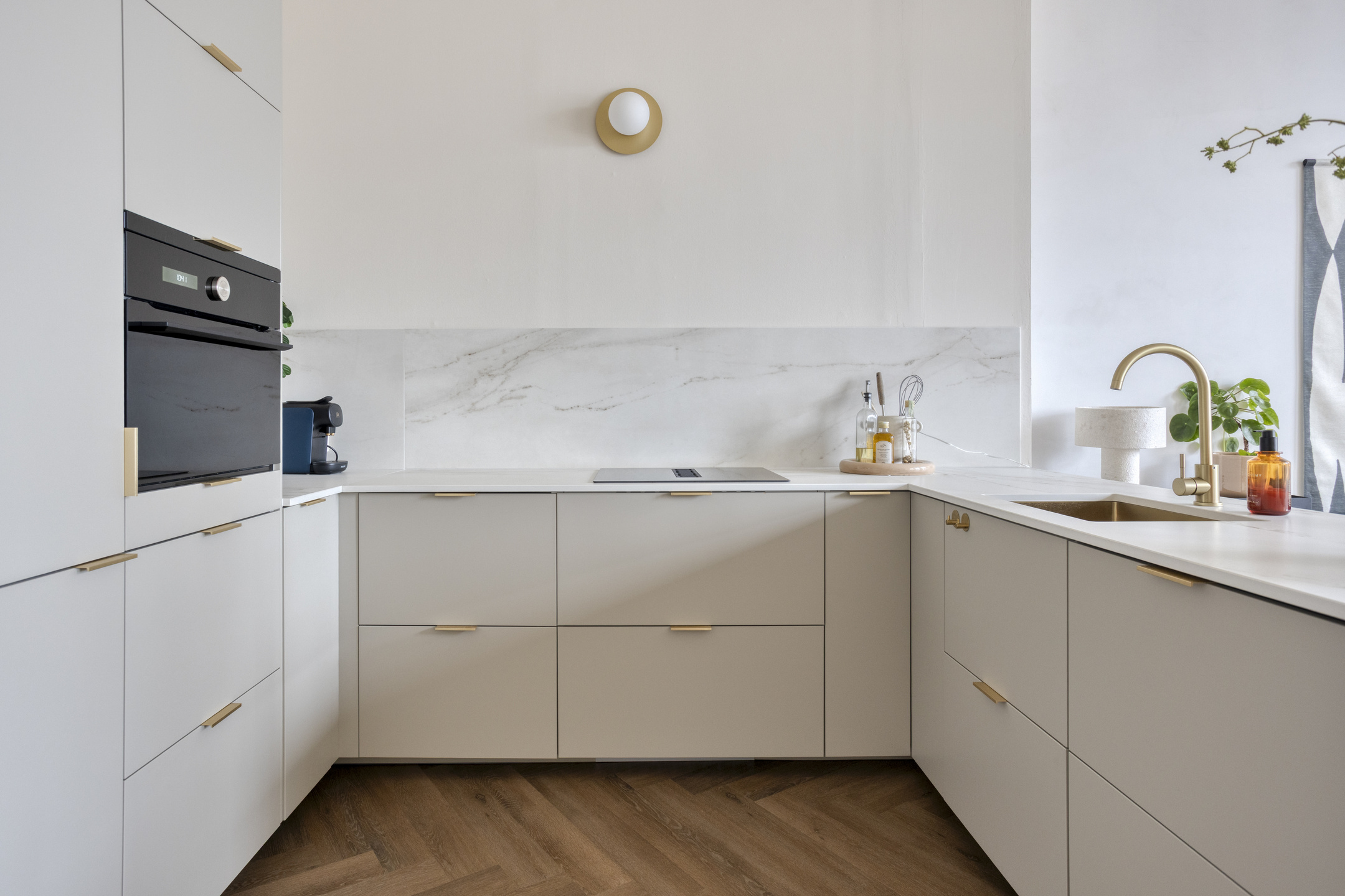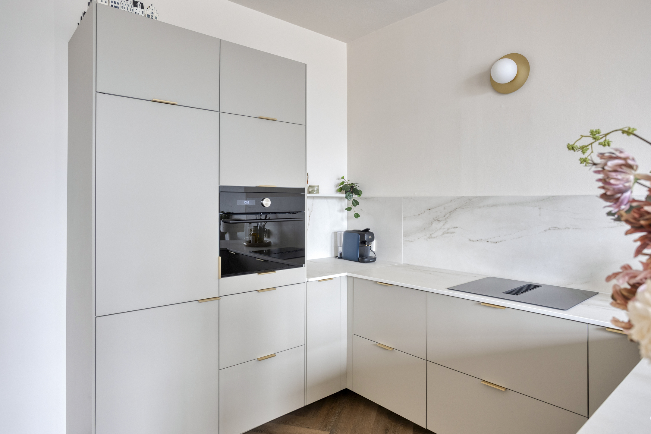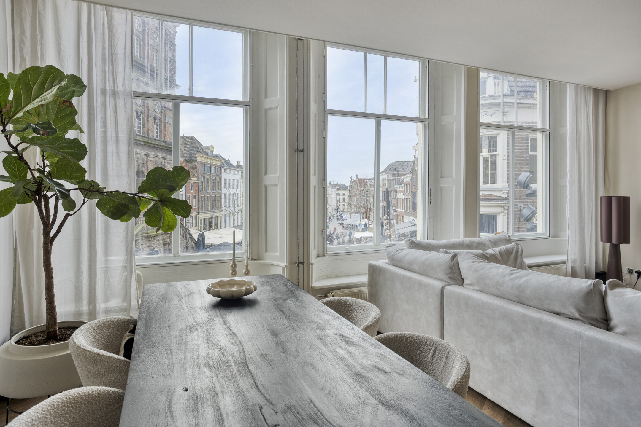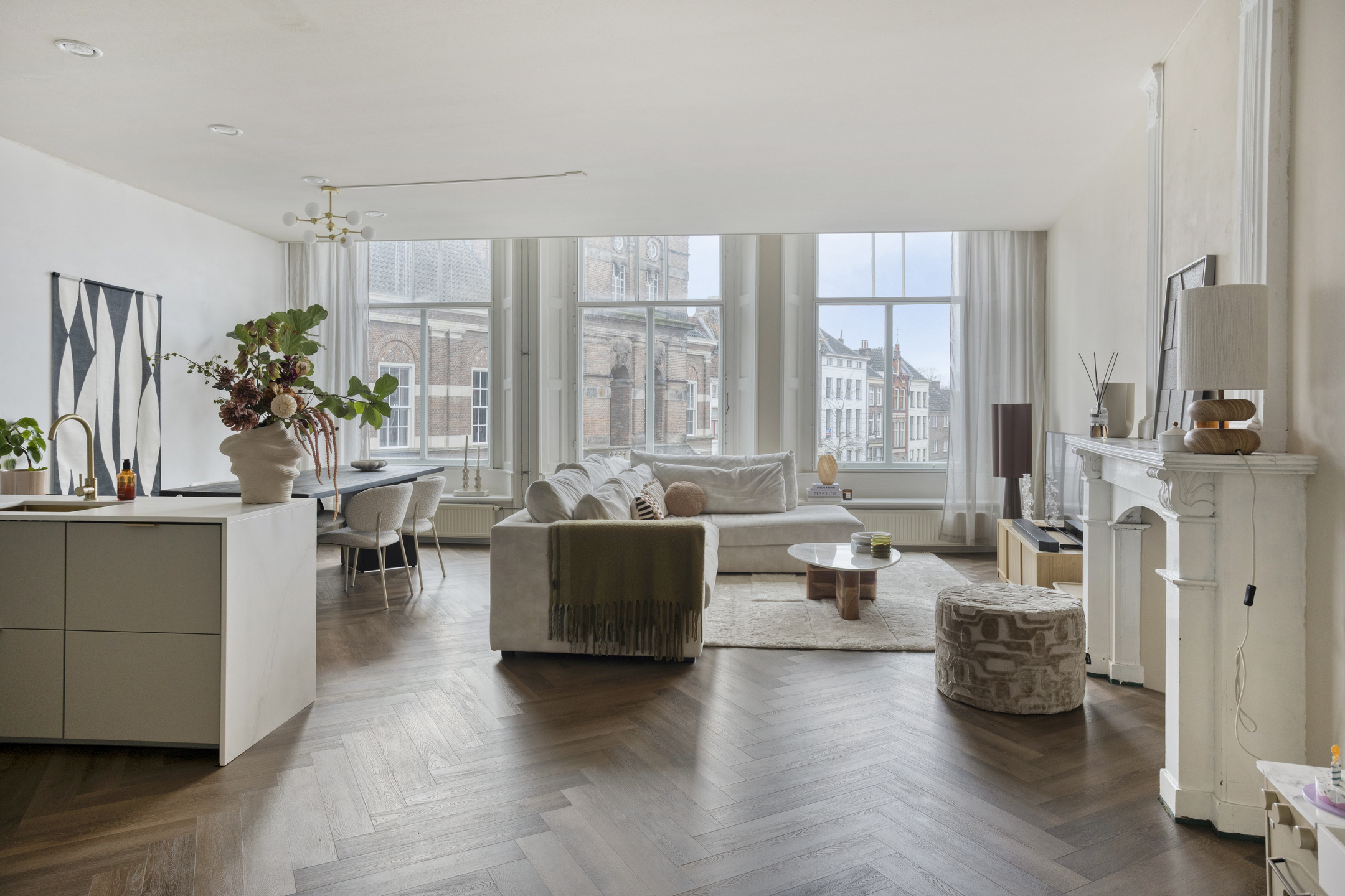 1e woonlaag: entree, hal met trapopgang naar de verdieping, berging met meterkast en toilet voorzien van wandcloset en fonteintje. Ruime woonkamer met werkelijk prachtig uitzicht over de markt en de wijnhuistoren, voorzien van visgraatvloer en schouw. Luxe open keuken in U-opstelling, voorzien van inductiekookplaat met geïntegreerde afzuiging, combi-oven, koelkast, vriezer en vaatwasser.