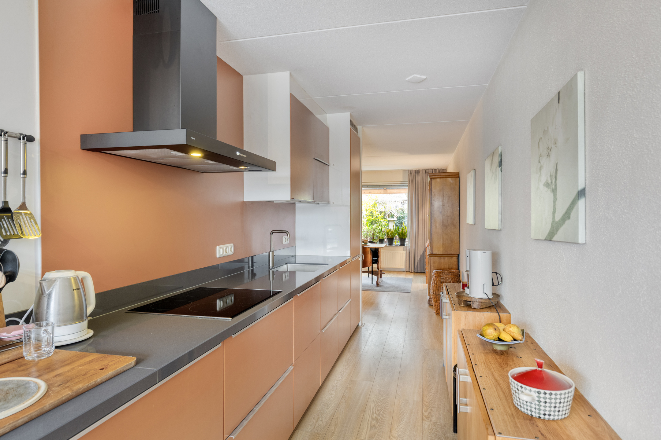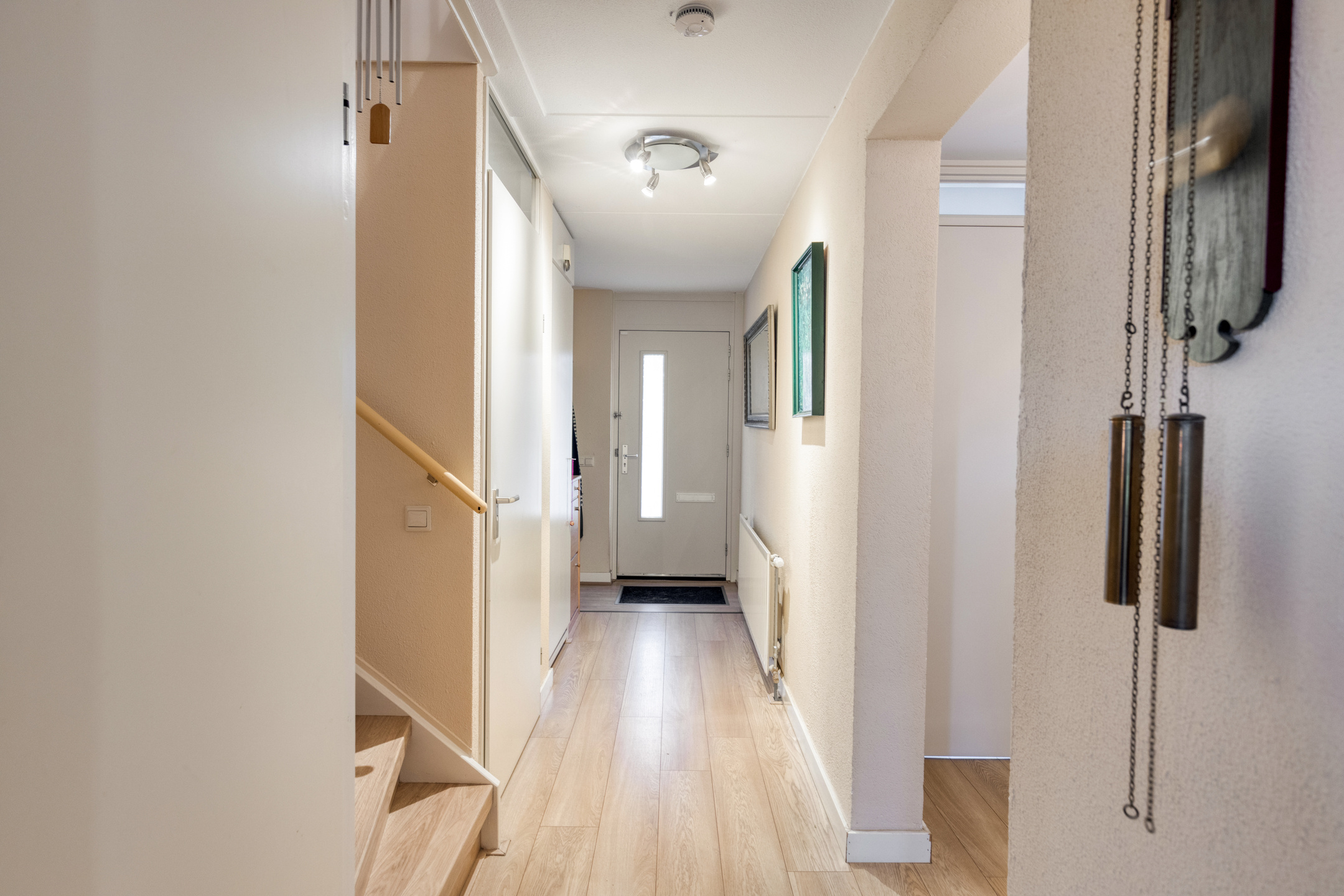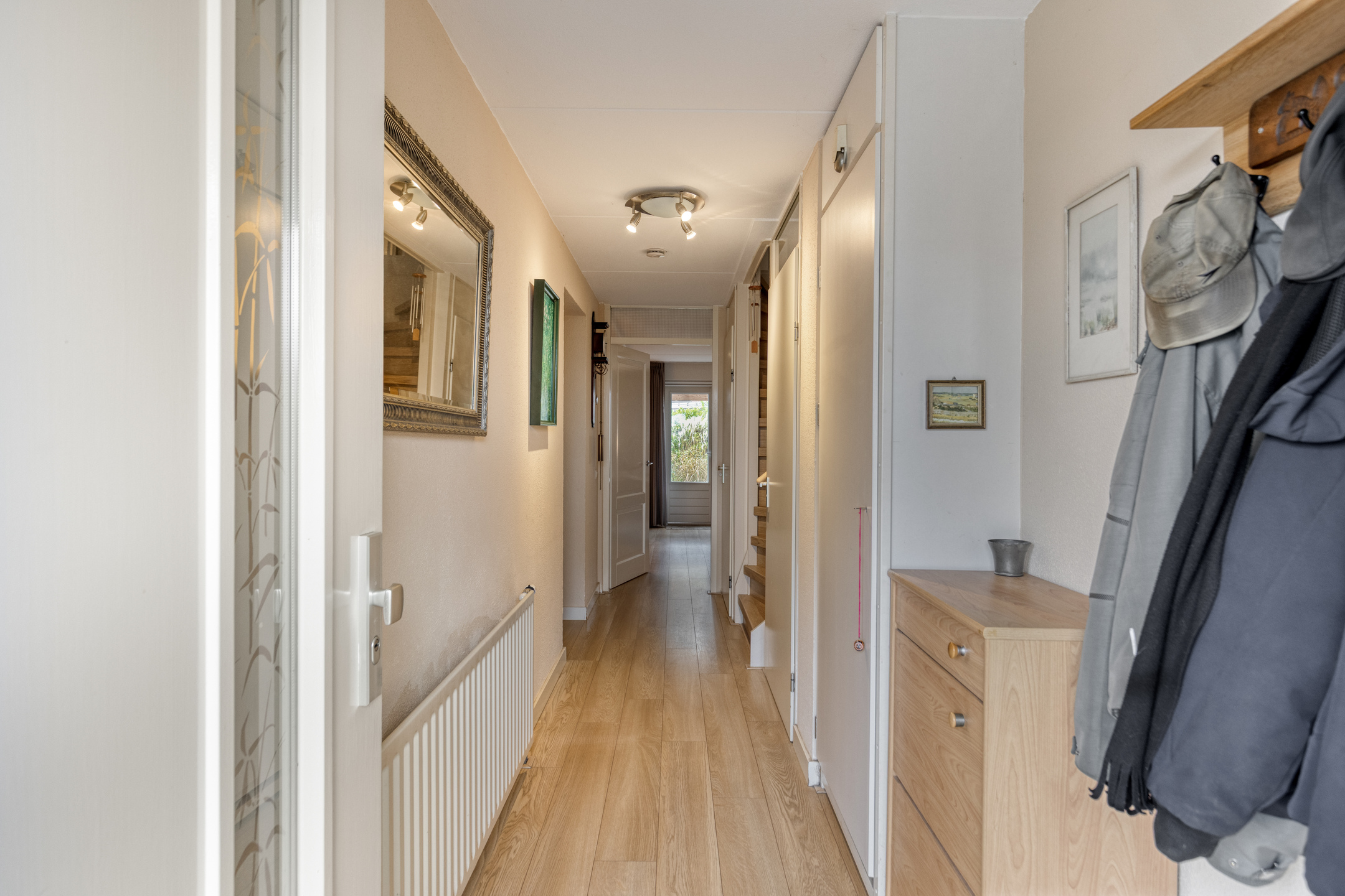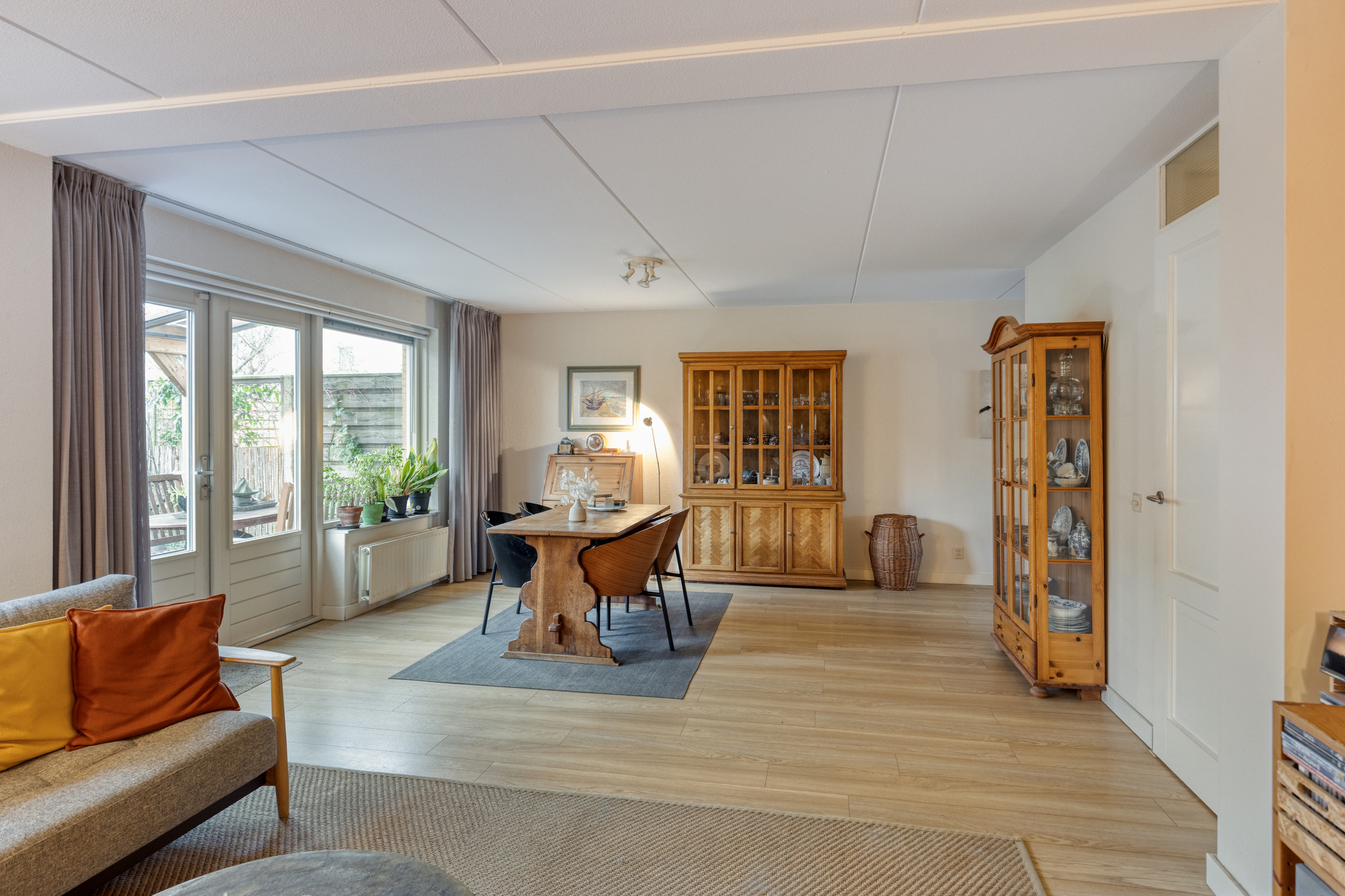Begane grond: overdekte entree, ruime hal met toegang tot vaste kast/berging met daarin aansluitingen wasmachine en droger, trapkast, meterkast, trapopgang naar de 1e verdieping en toilet voorzien van wandcloset en fonteintje. Riante tuingerichte woonkamer voorzien van laminaatvloer, met openslaande tuindeuren naar het overdekte terras. Ruime, half open woonkeuken met eethoek aan de voorzijde, voorzien van inductiekookplaat, afzuigkap, oven en koel-vriescombinatie. Extra werk-/slaapkamer aan de voorzijde in de voormalige garage, ter grootte van circa 8 m².