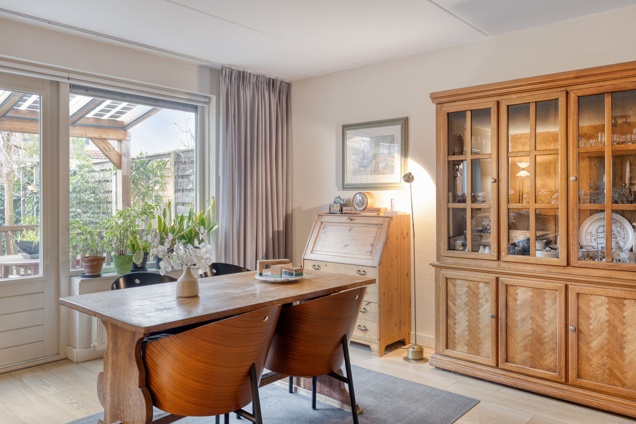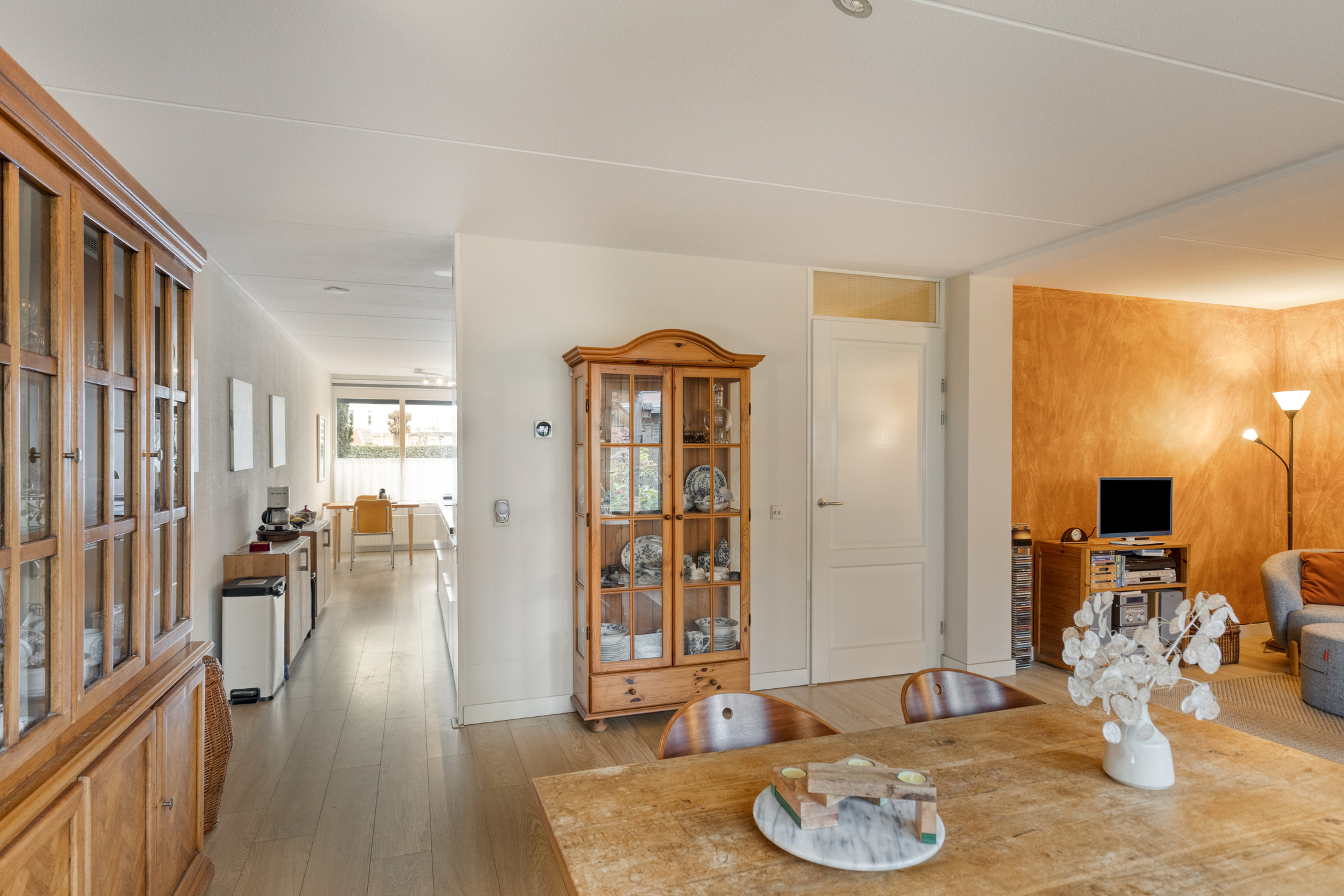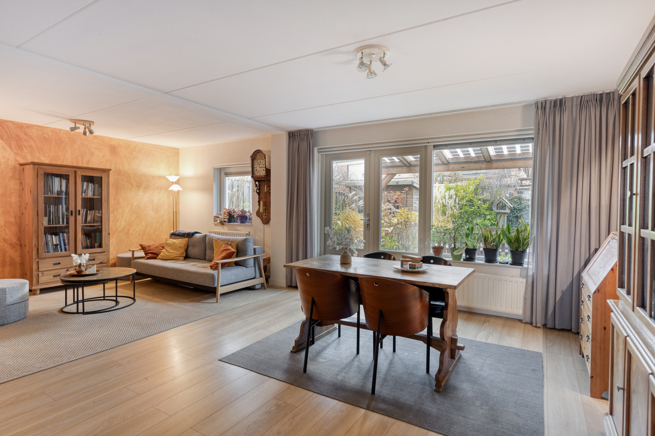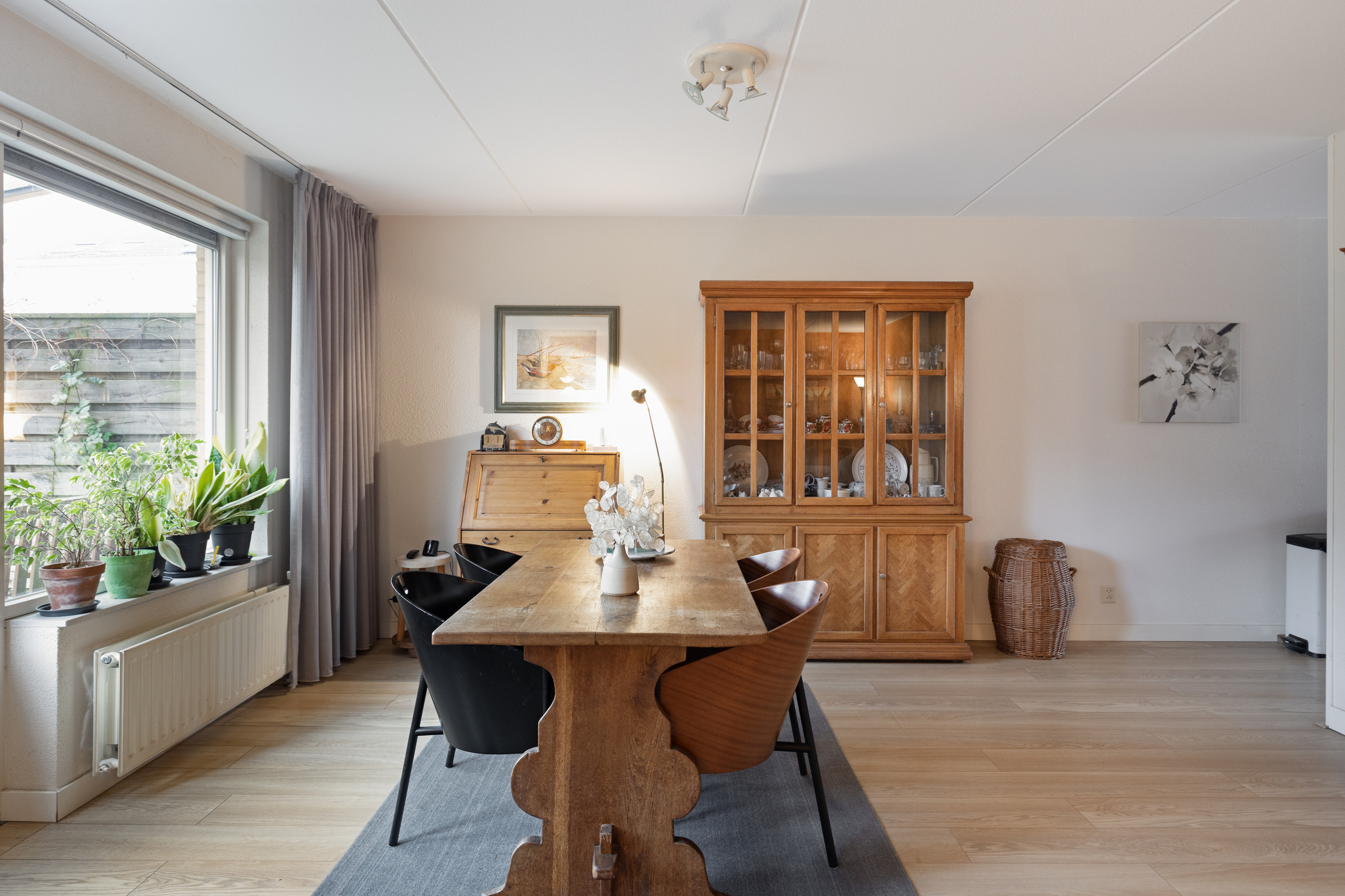Begane grond: overdekte entree, ruime hal met toegang tot vaste kast/berging met daarin aansluitingen wasmachine en droger, trapkast, meterkast, trapopgang naar de 1e verdieping en toilet voorzien van wandcloset en fonteintje. Riante tuingerichte woonkamer voorzien van laminaatvloer, met openslaande tuindeuren naar het overdekte terras. Ruime, half open woonkeuken met eethoek aan de voorzijde, voorzien van inductiekookplaat, afzuigkap, oven en koel-vriescombinatie. Extra werk-/slaapkamer aan de voorzijde in de voormalige garage, ter grootte van circa 8 m².