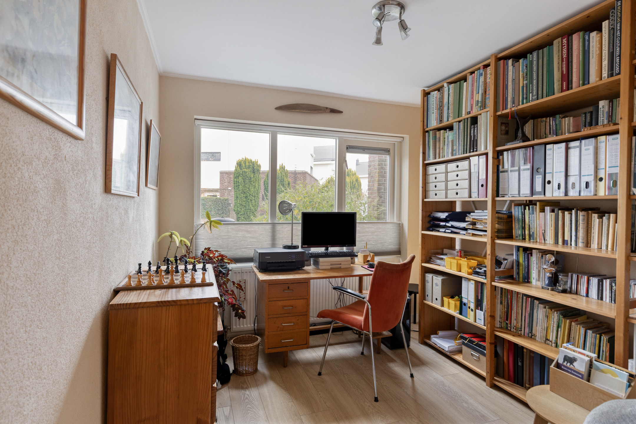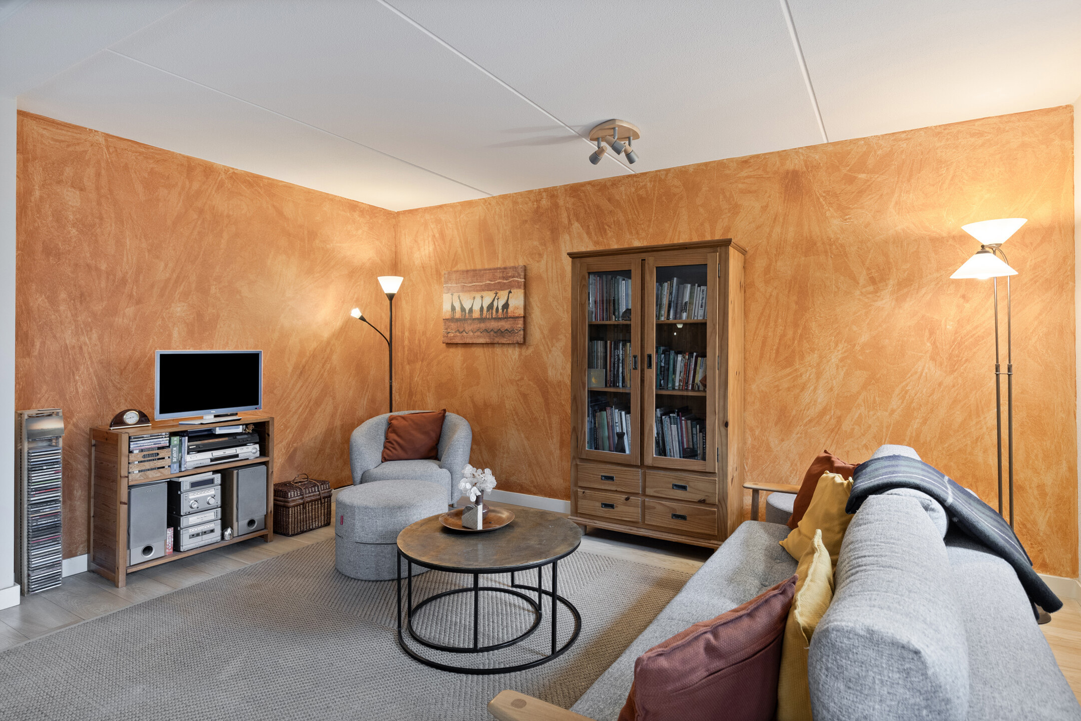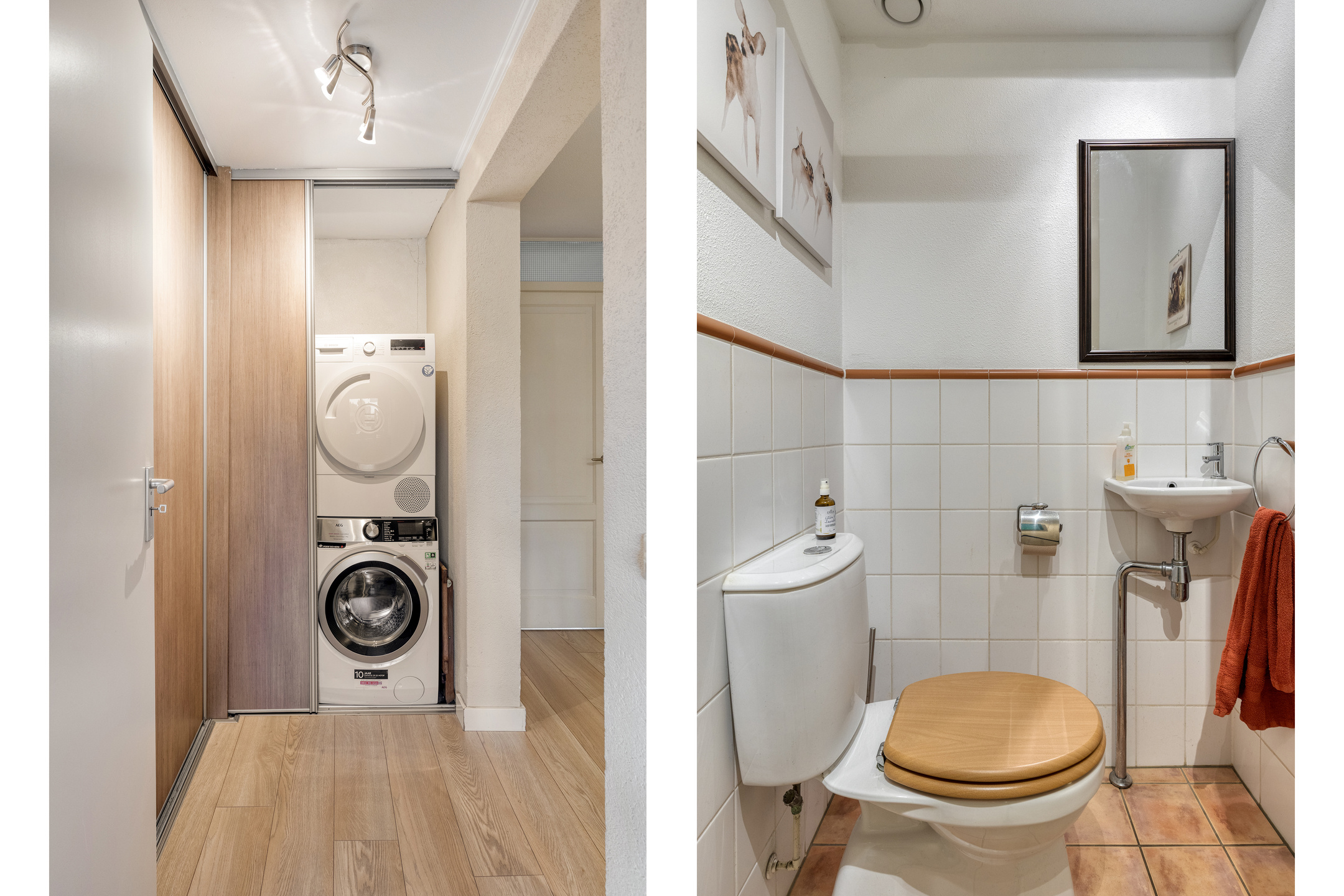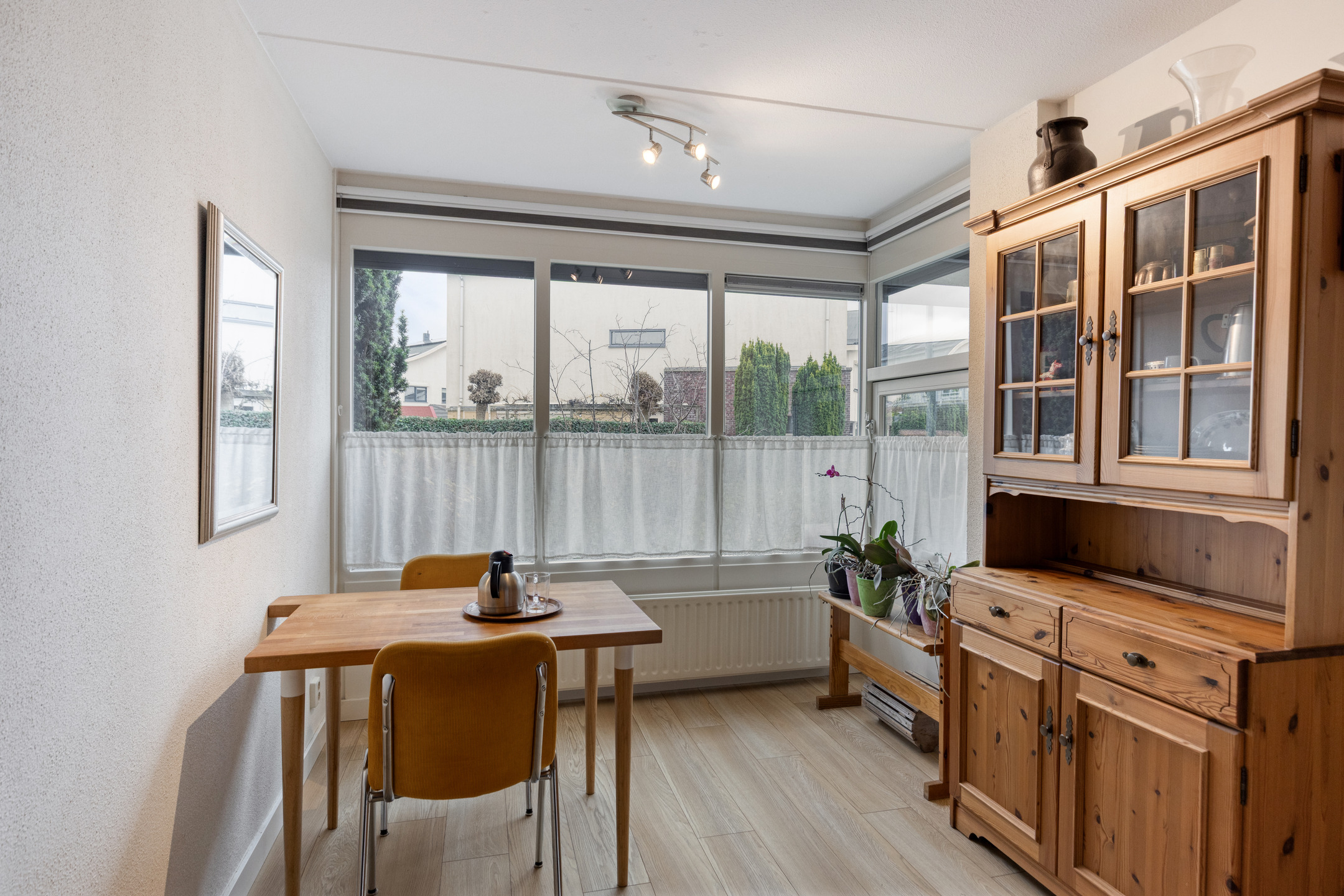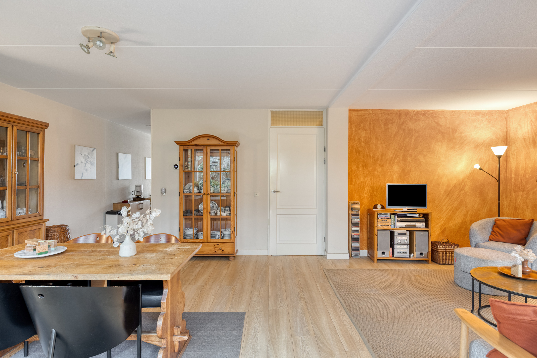 Begane grond: overdekte entree, ruime hal met toegang tot vaste kast/berging met daarin aansluitingen wasmachine en droger, trapkast, meterkast, trapopgang naar de 1e verdieping en toilet voorzien van wandcloset en fonteintje. Riante tuingerichte woonkamer voorzien van laminaatvloer, met openslaande tuindeuren naar het overdekte terras. Ruime, half open woonkeuken met eethoek aan de voorzijde, voorzien van inductiekookplaat, afzuigkap, oven en koel-vriescombinatie. Extra werk-/slaapkamer aan de voorzijde in de voormalige garage, ter grootte van circa 8 m².
