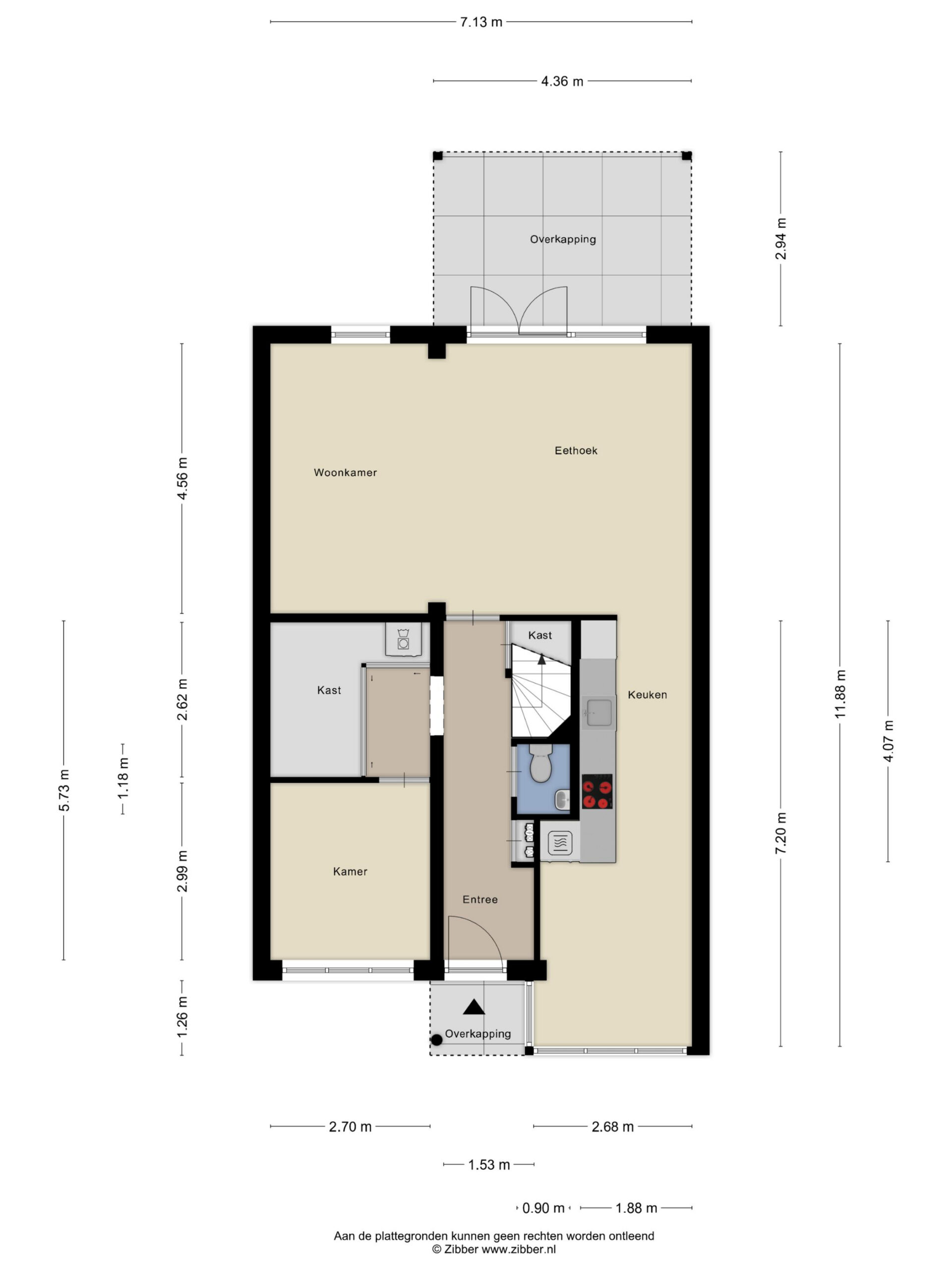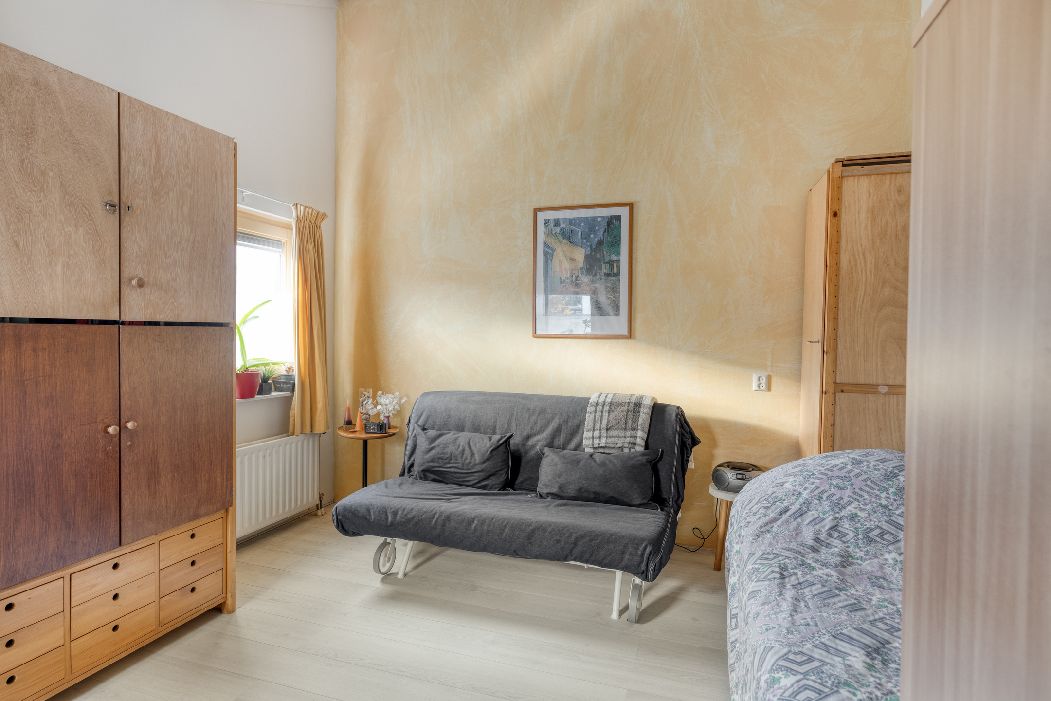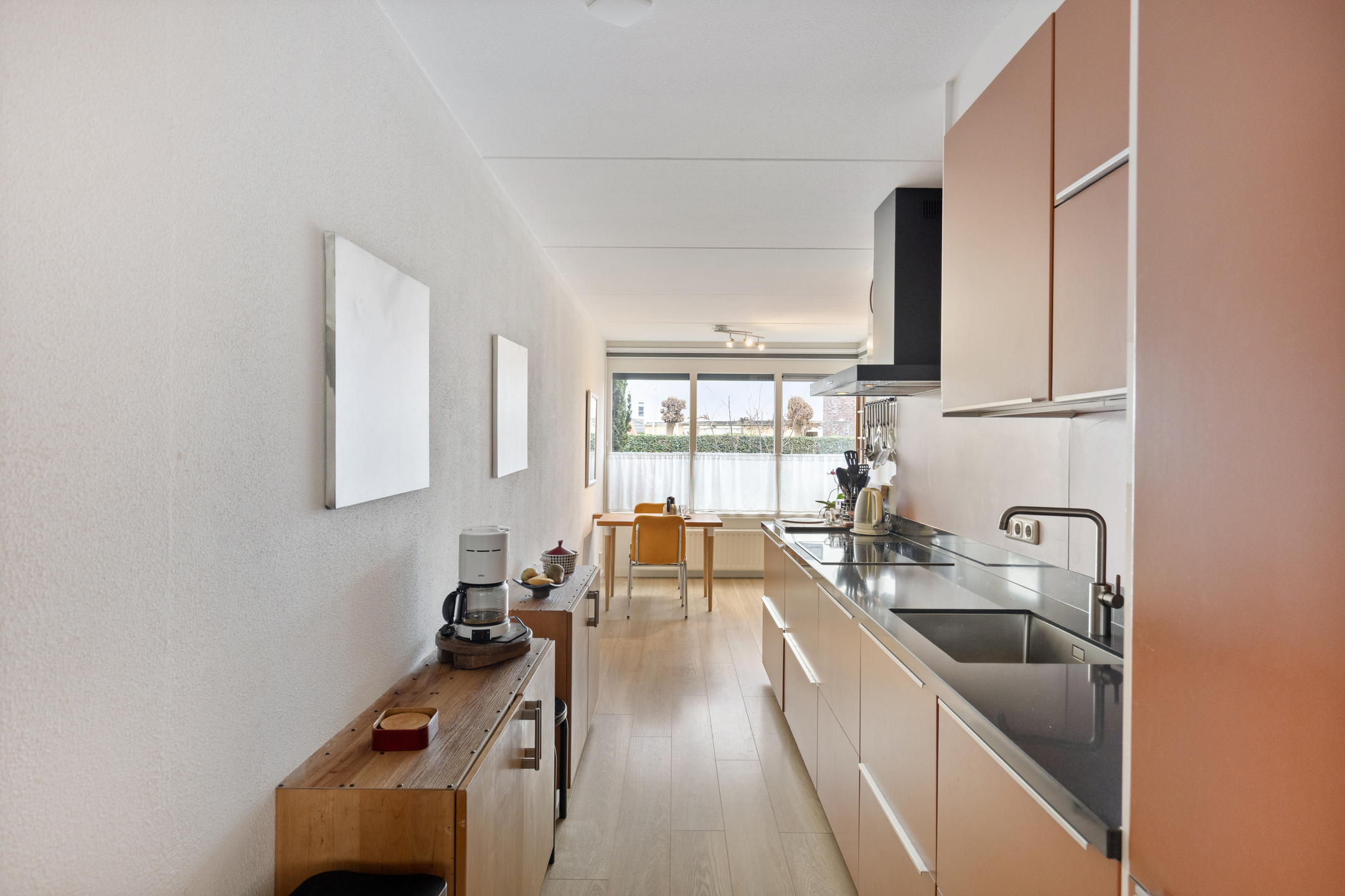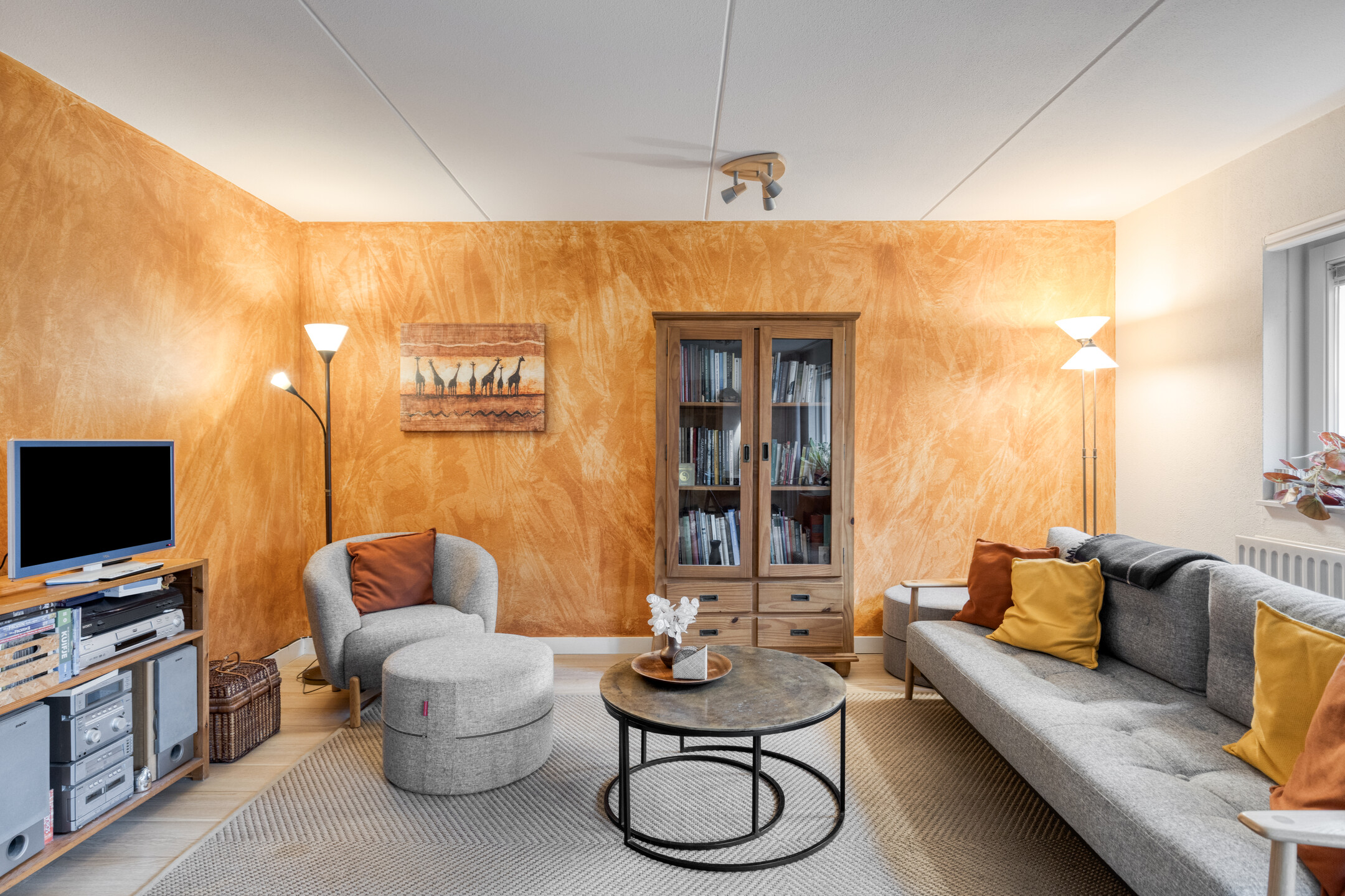Begane grond: overdekte entree, ruime hal met toegang tot vaste kast/berging met daarin aansluitingen wasmachine en droger, trapkast, meterkast, trapopgang naar de 1e verdieping en toilet voorzien van wandcloset en fonteintje. Riante tuingerichte woonkamer voorzien van laminaatvloer, met openslaande tuindeuren naar het overdekte terras. Ruime, half open woonkeuken met eethoek aan de voorzijde, voorzien van inductiekookplaat, afzuigkap, oven en koel-vriescombinatie. Extra werk-/slaapkamer aan de voorzijde in de voormalige garage, ter grootte van circa 8 m².