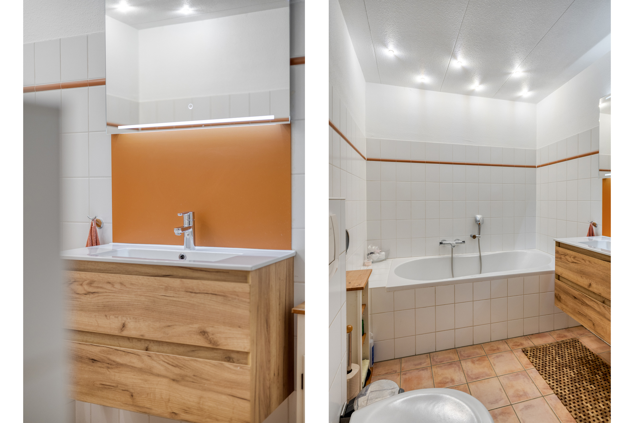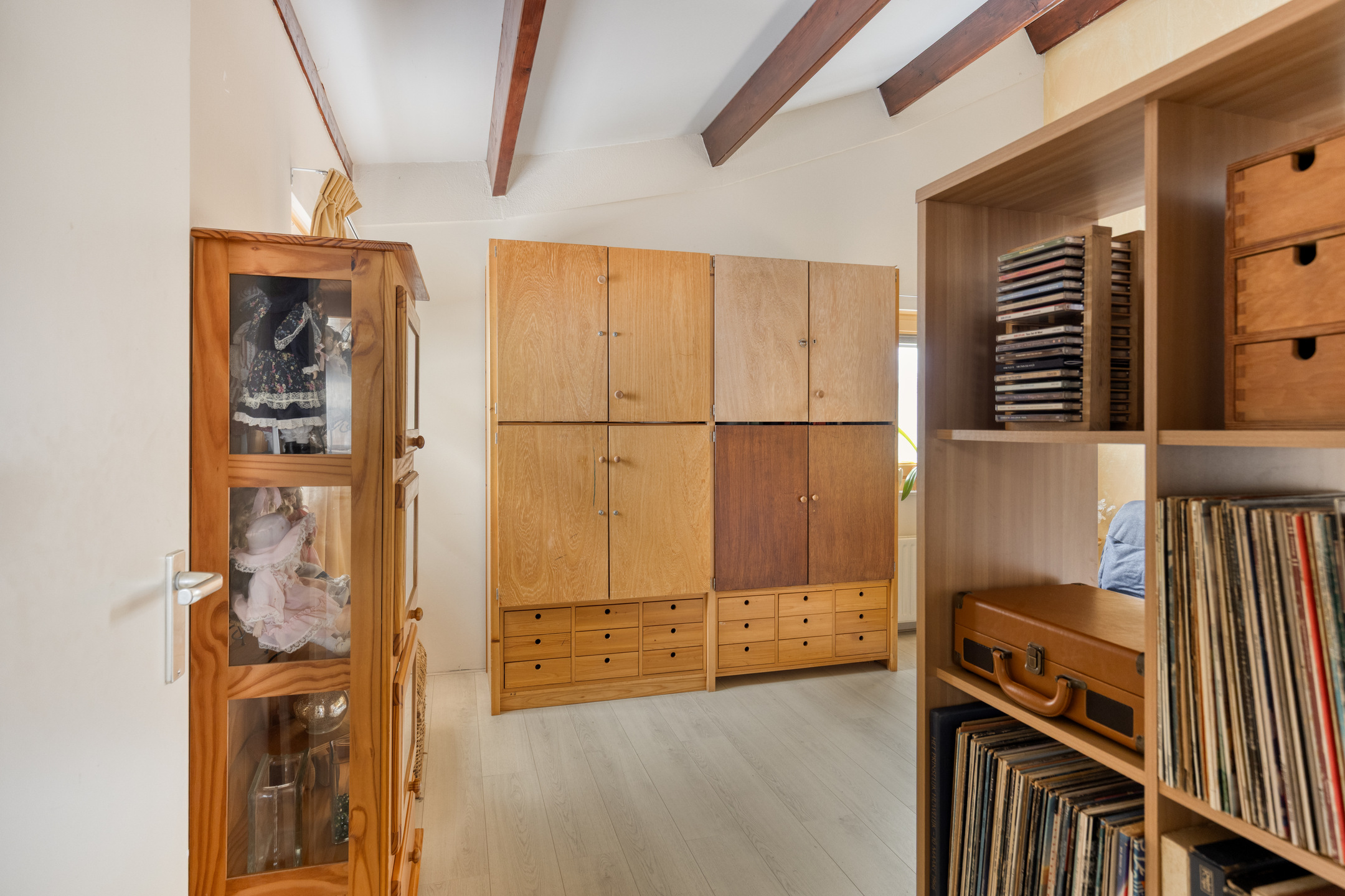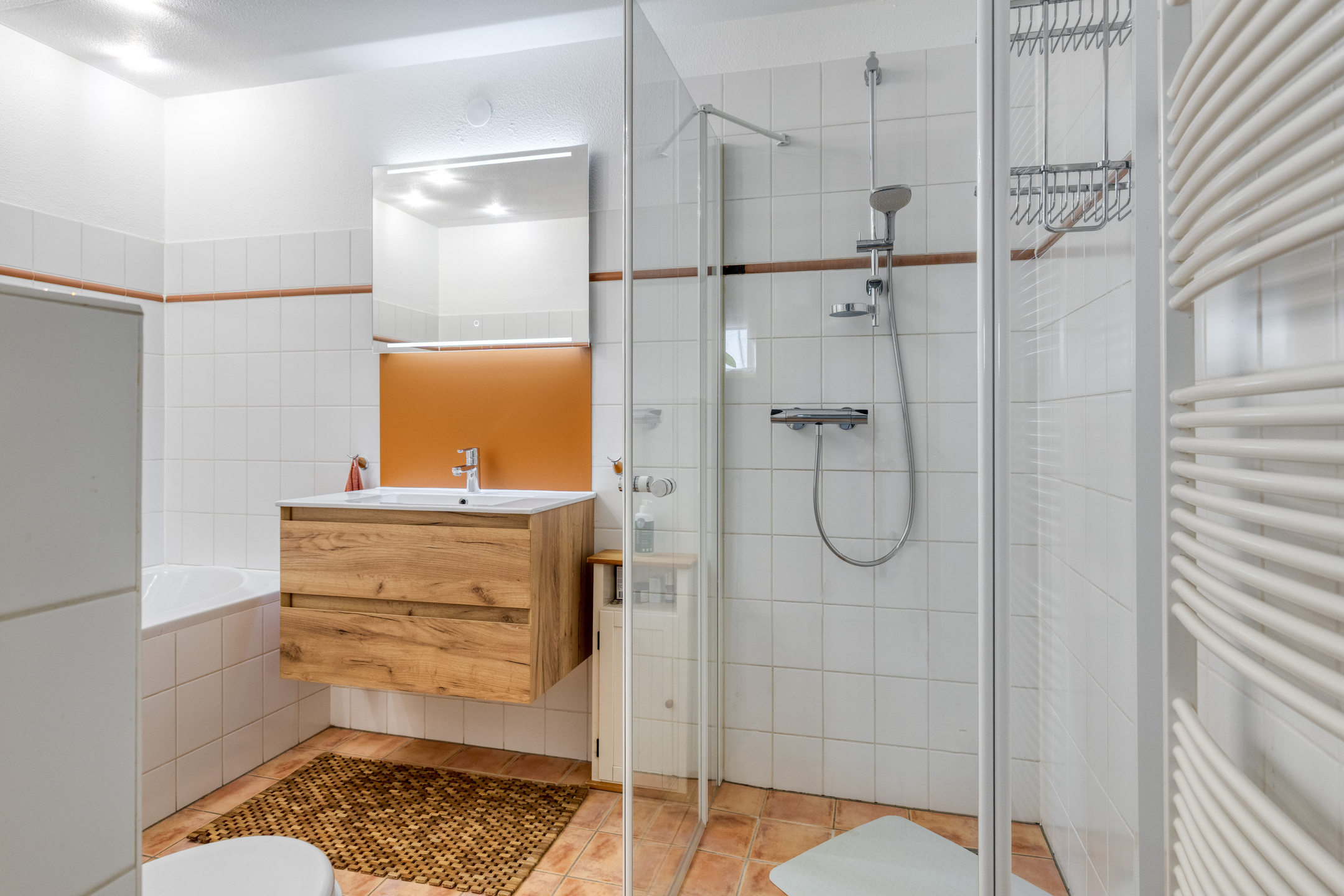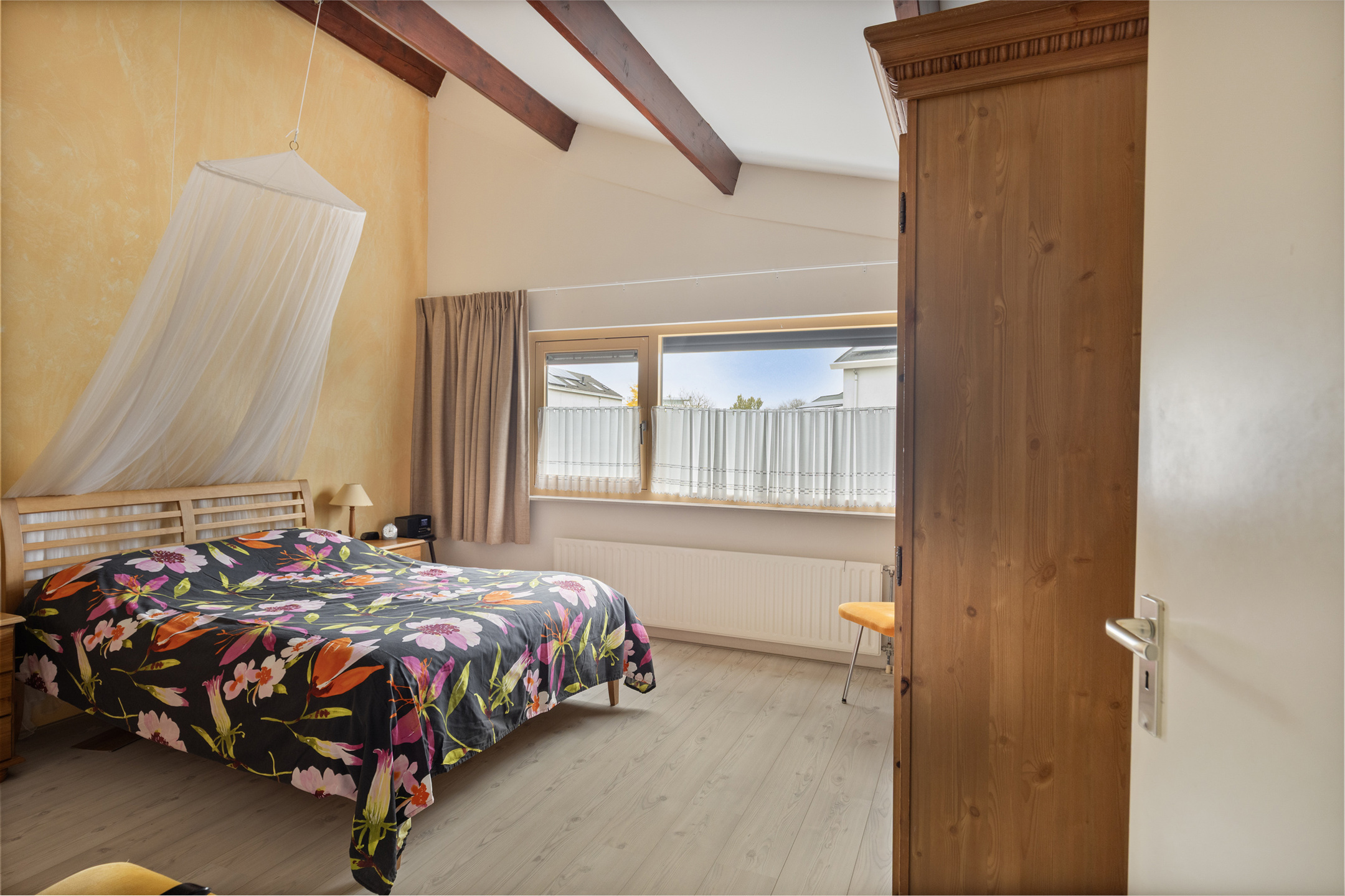 1e Verdieping: overloop, vaste kast t.b.v. de warmtepomp met boiler via de overloop met ladder toegang tot de vliering. Twee ruime slaapkamers (voorheen drie) ter grootte van circa 15,5 m² en 16 m², beiden keurig afgewerkt en voorzien van HR++ beglazing. Nette badkamer voorzien van ligbad, separate douche, wastafelmeubel, wandcloset en handdoekenradiator.