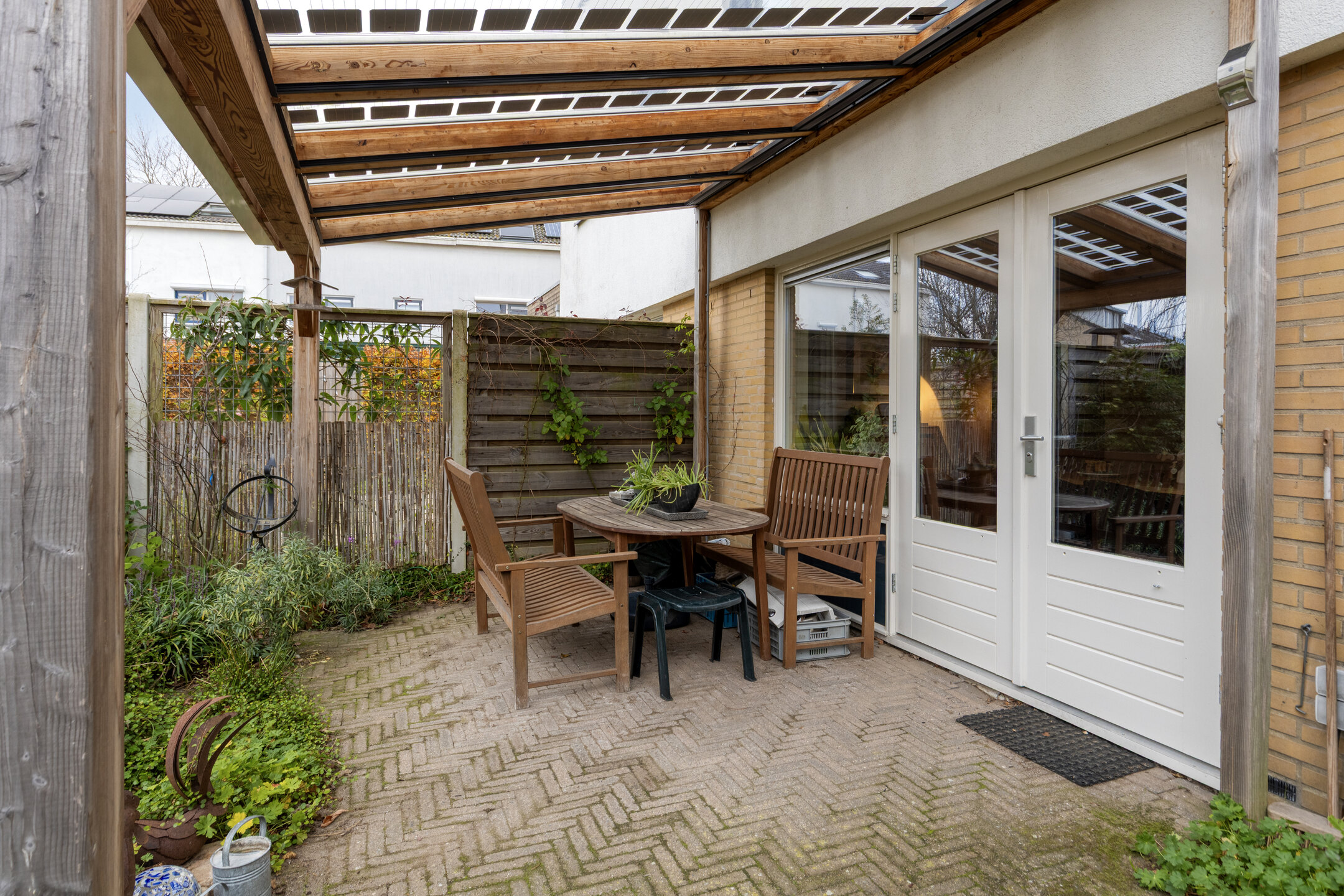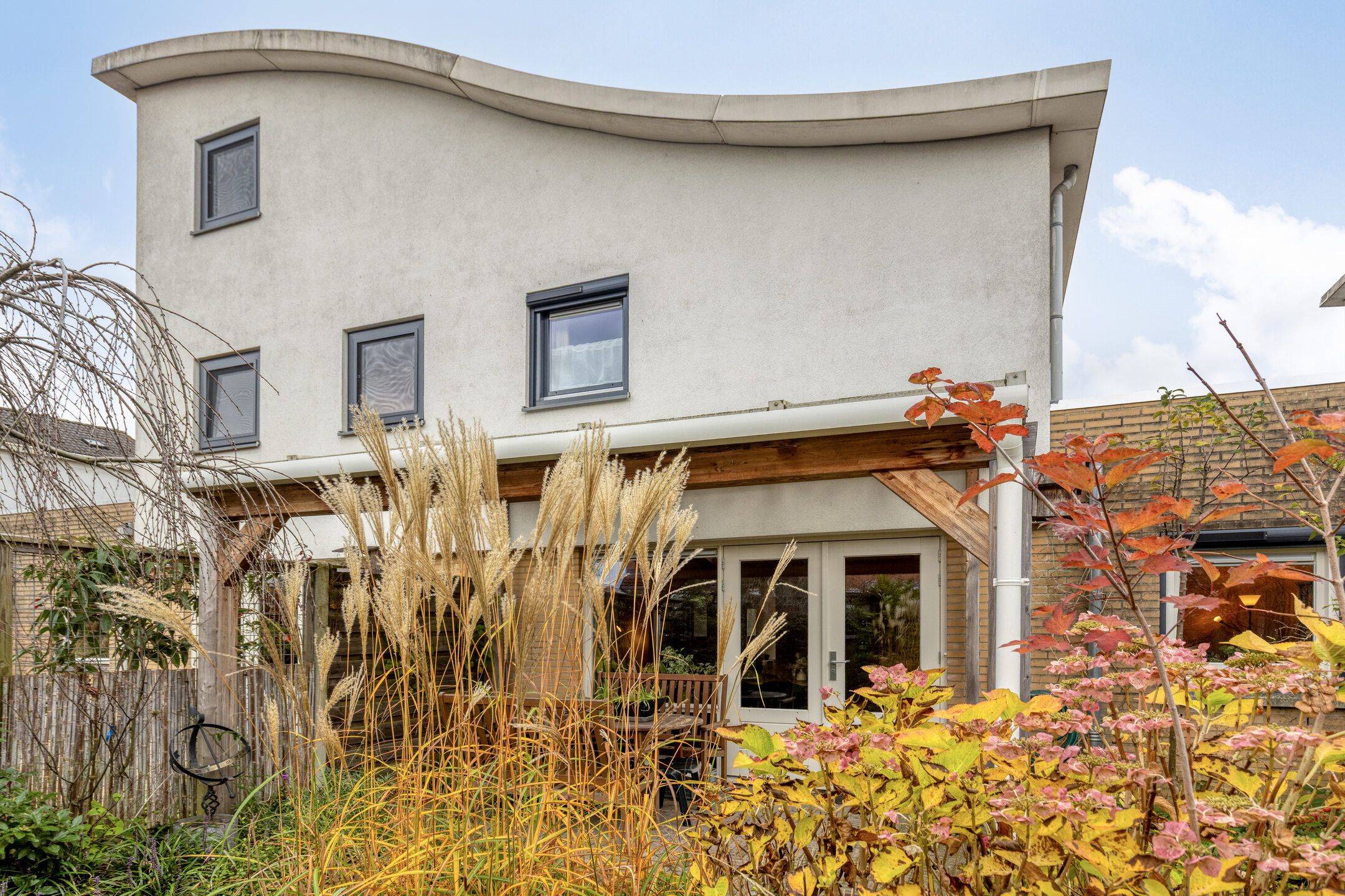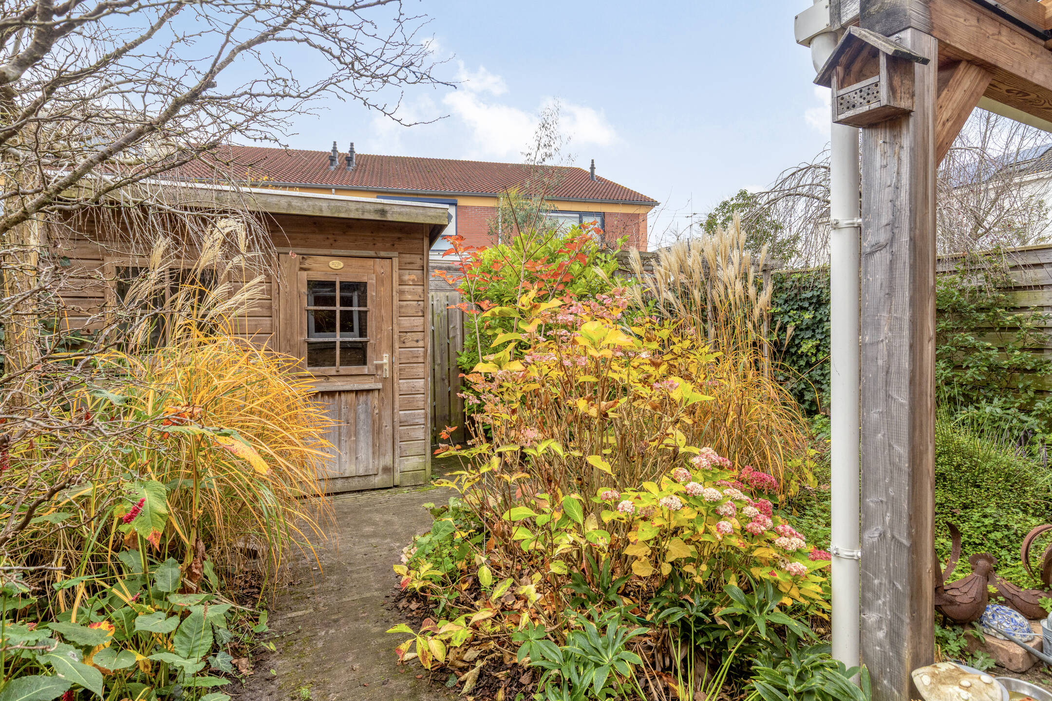 Achtertuin, met achterom, op het zuidwesten met fraaie overkapping tegen de achtergevel voorzien van semi-transparante zonnepanelen, sierbestrating, meerdere borders en houten berging. Aan de voorzijde is een siertuin aanwezig en oprit met parkeerruimte voor één (elektrische)personenauto, inclusief laadpunt!