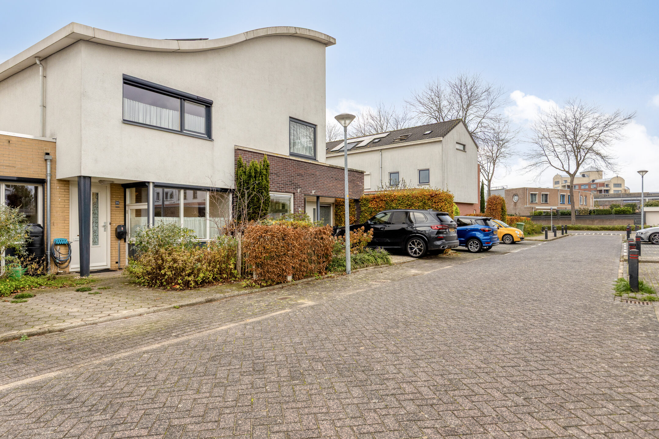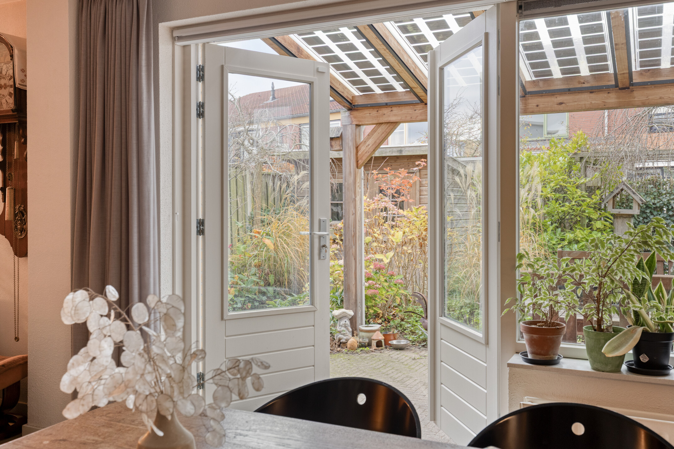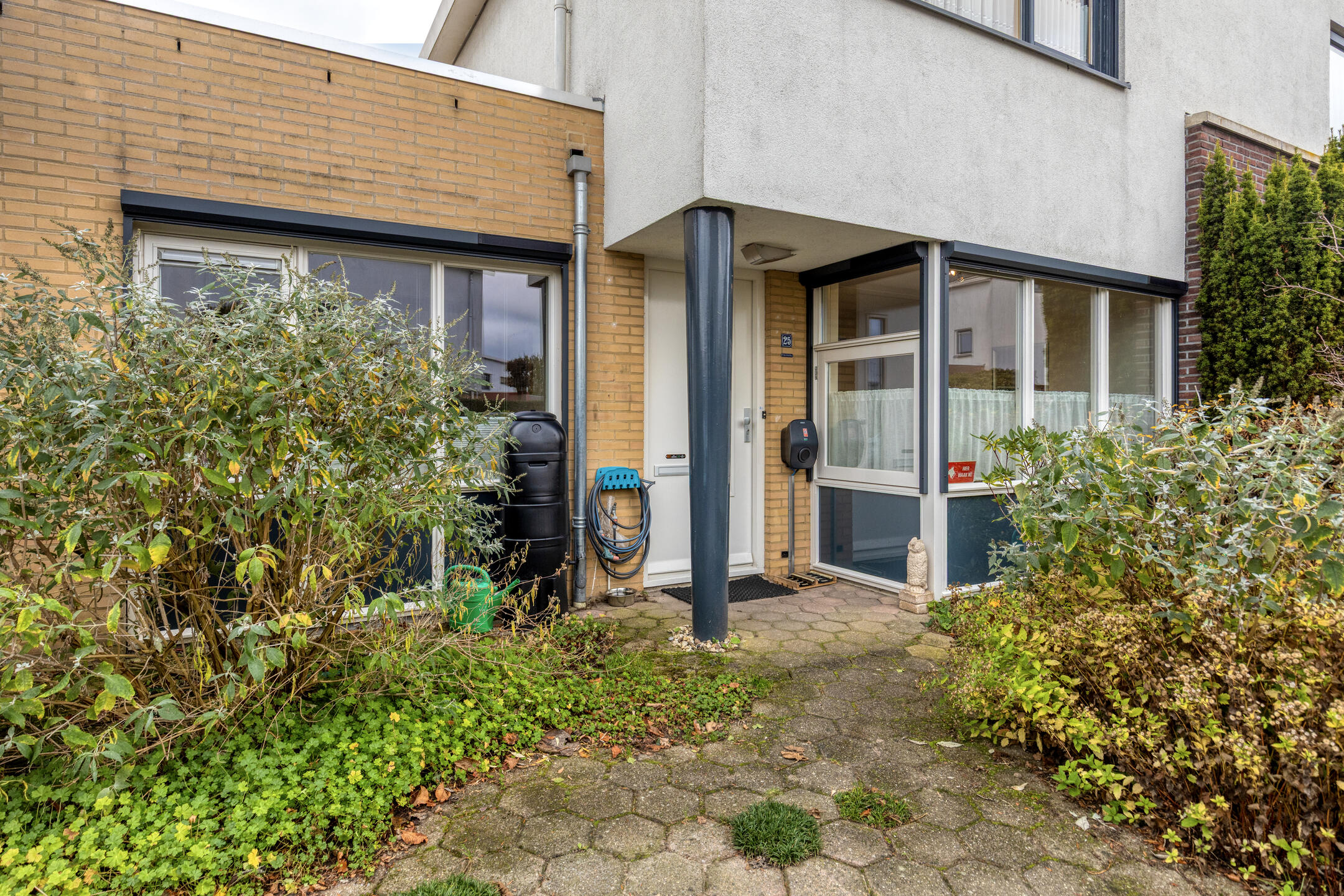 Achtertuin, met achterom, op het zuidwesten met fraaie overkapping tegen de achtergevel voorzien van semi-transparante zonnepanelen, sierbestrating, meerdere borders en houten berging. Aan de voorzijde is een siertuin aanwezig en oprit met parkeerruimte voor één (elektrische)personenauto, inclusief laadpunt!