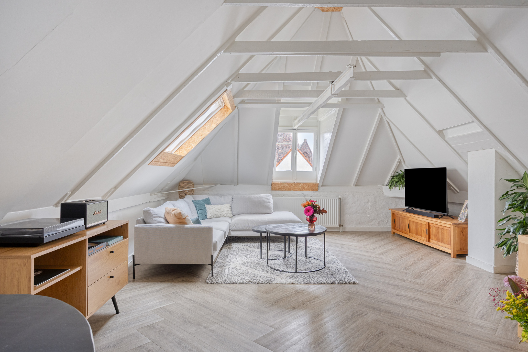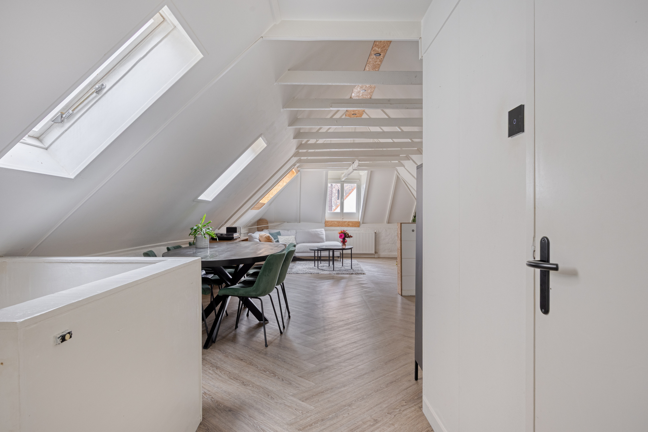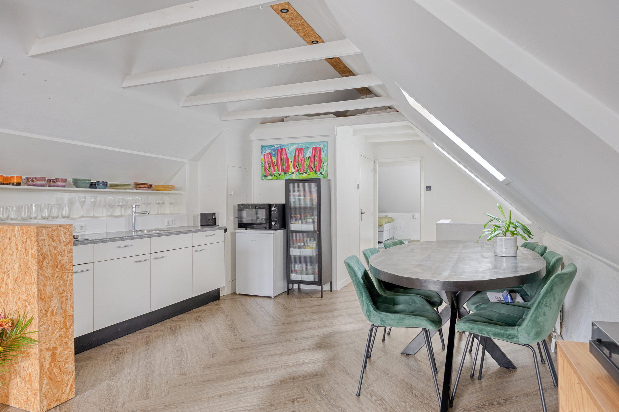 2e (woon)verdieping: strak afgewerkte woonkamer met fijne lichtinval door de vele ramen, voorzien van pvc-vloer en spotjes in de nok. Bij de renovatie van het appartement is rekening gehouden met behoud van oude details. Een mooie combinatie van modern en origineel! De keuken is voorzien van 4-pits gaskookplaat en biedt een gezellige eethoek. Ruime slaapkamer ter grootte van circa 17 m² met bergruimte in de nok, dakraam en aparte hoek/inbouwkast met bergruimte en t.b.v. de wasapparatuur. Nette badkamer voorzien van douche, fraai wastafelmeubel en toilet.