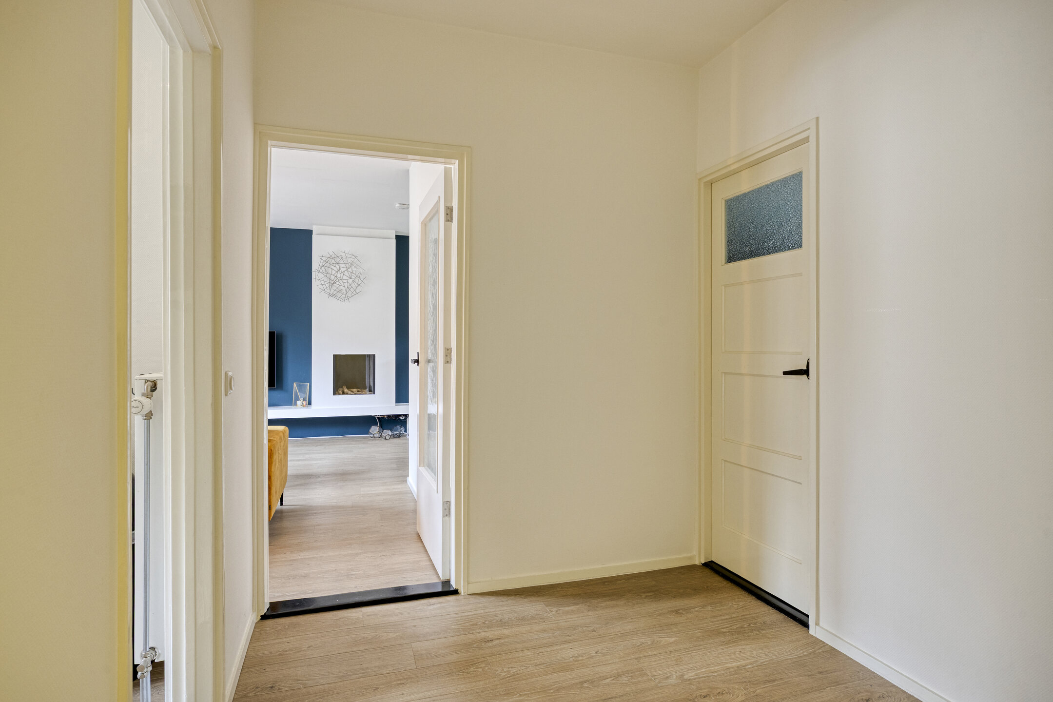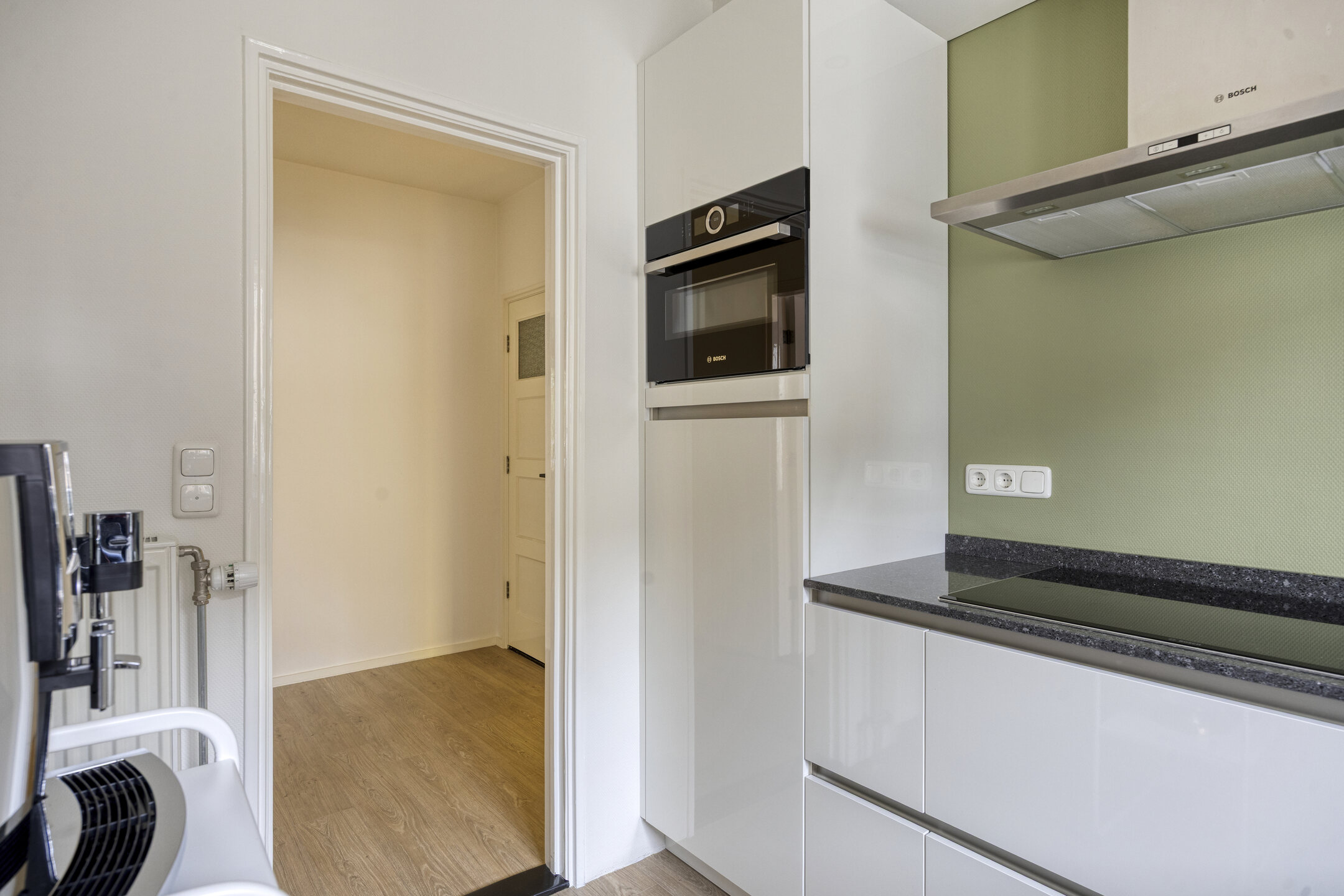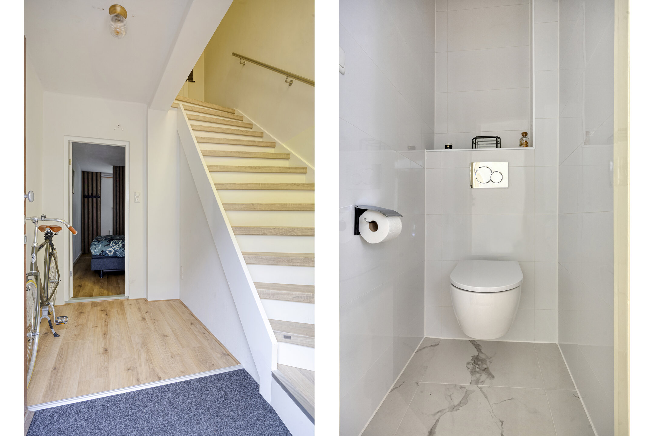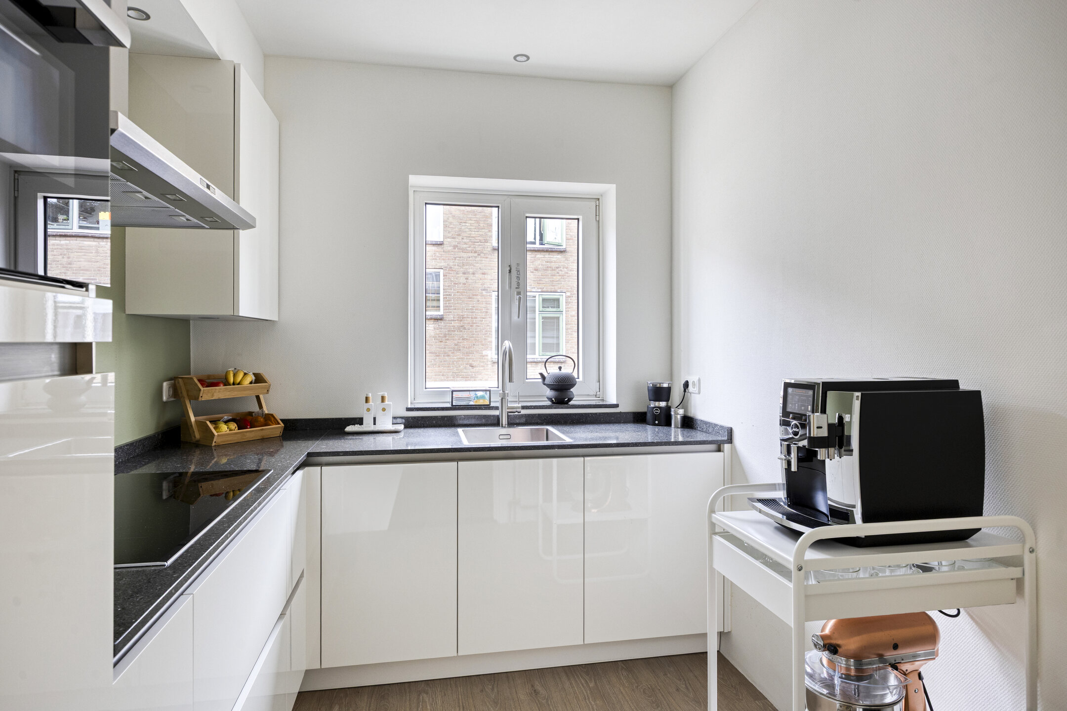 1e Verdieping: overloop met toegang tot het toilet en vlizotrap naar de bergzolder. L-vormige woon-/eetkamer met PVC-vloer, schouw en frans balkon met uitzicht over de gezamenlijke binnentuin. Strakke hoogglans witte keuken, voorzien van inductiekookplaat, afzuigkap, combi-oven, koelkast, vaatwasser en Quooker. Slaapkamer ter grootte van circa 8,5 m², voorzien van vaste kast. Badkamer met wastafelmeubel, douche en handdoekenradiator.