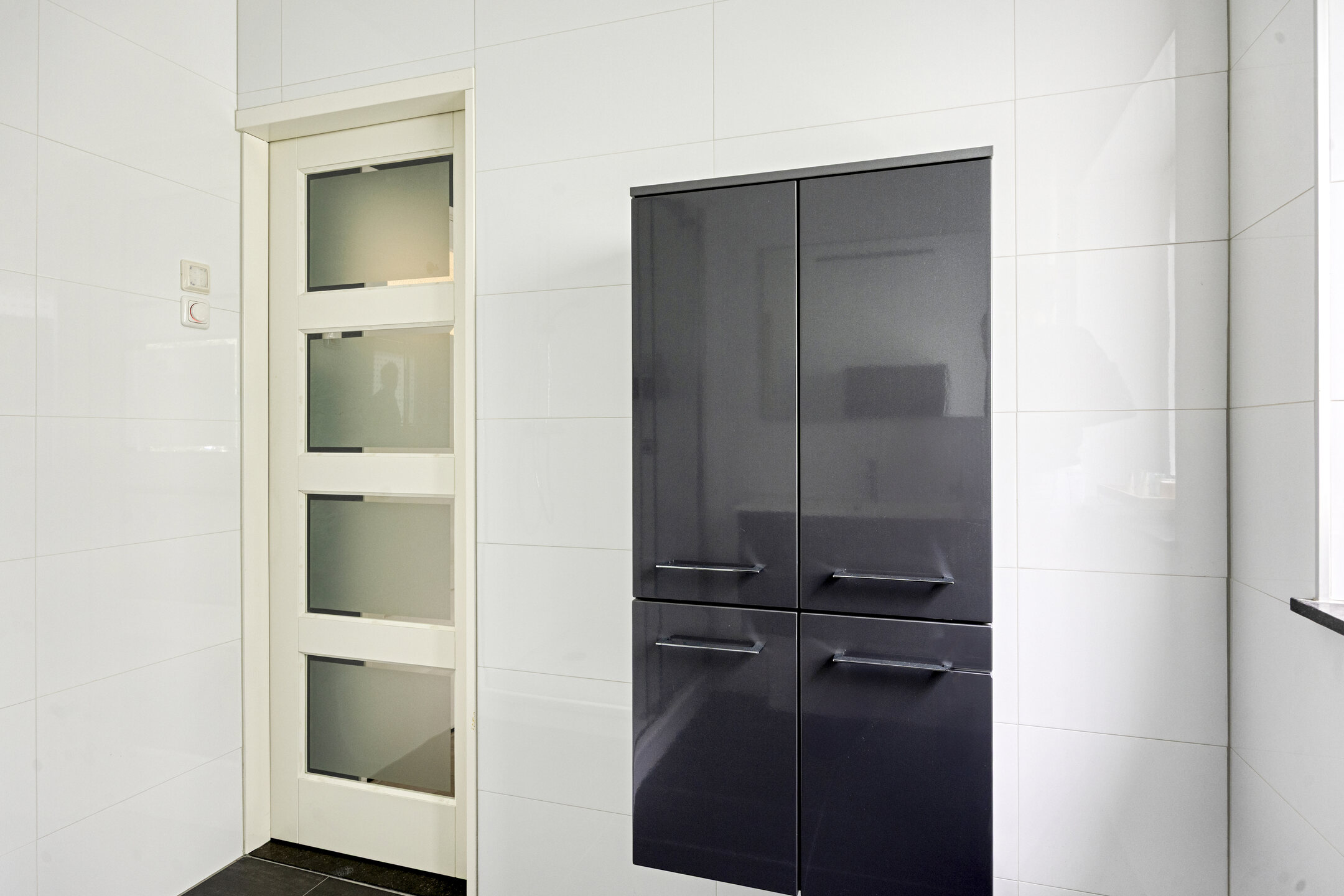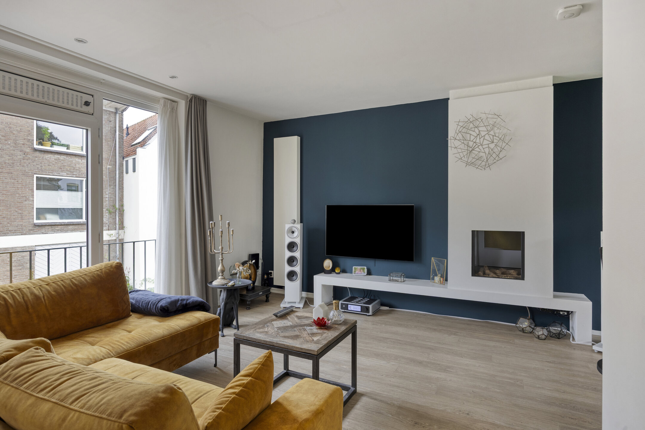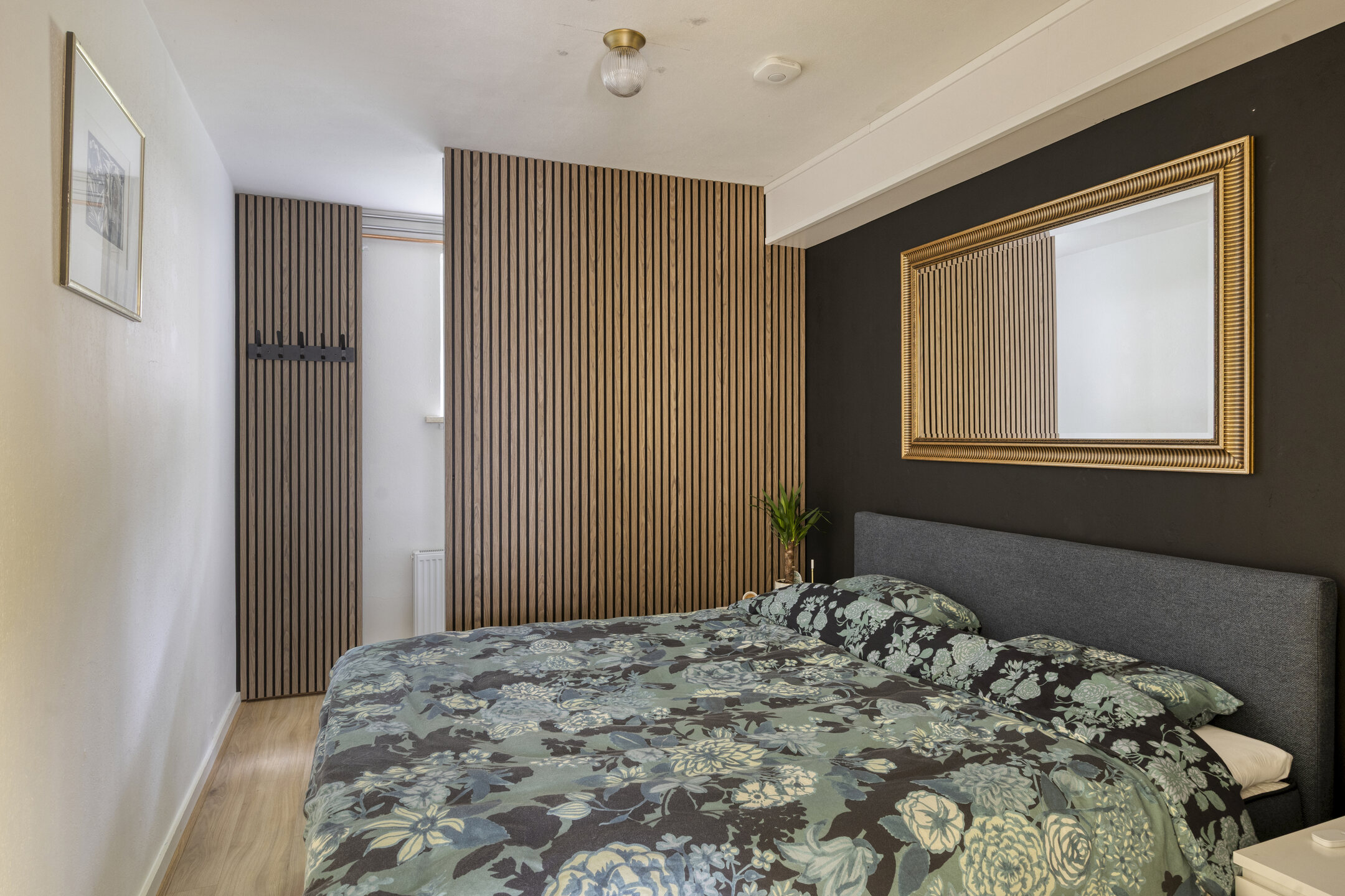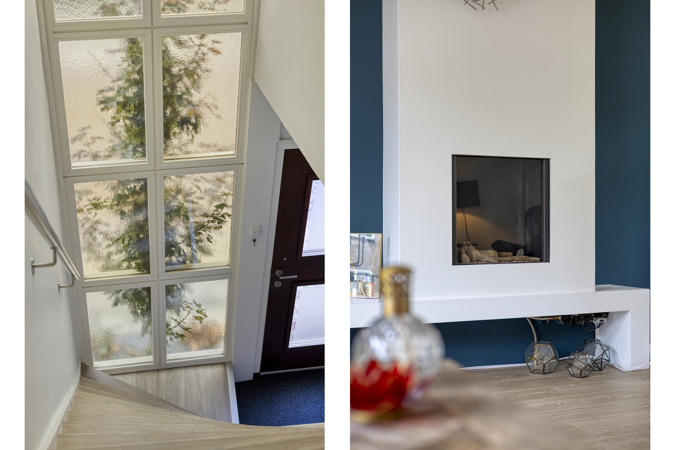 1e Verdieping: overloop met toegang tot het toilet en vlizotrap naar de bergzolder. L-vormige woon-/eetkamer met PVC-vloer, schouw en frans balkon met uitzicht over de gezamenlijke binnentuin. Strakke hoogglans witte keuken, voorzien van inductiekookplaat, afzuigkap, combi-oven, koelkast, vaatwasser en Quooker. Slaapkamer ter grootte van circa 8,5 m², voorzien van vaste kast. Badkamer met wastafelmeubel, douche en handdoekenradiator.