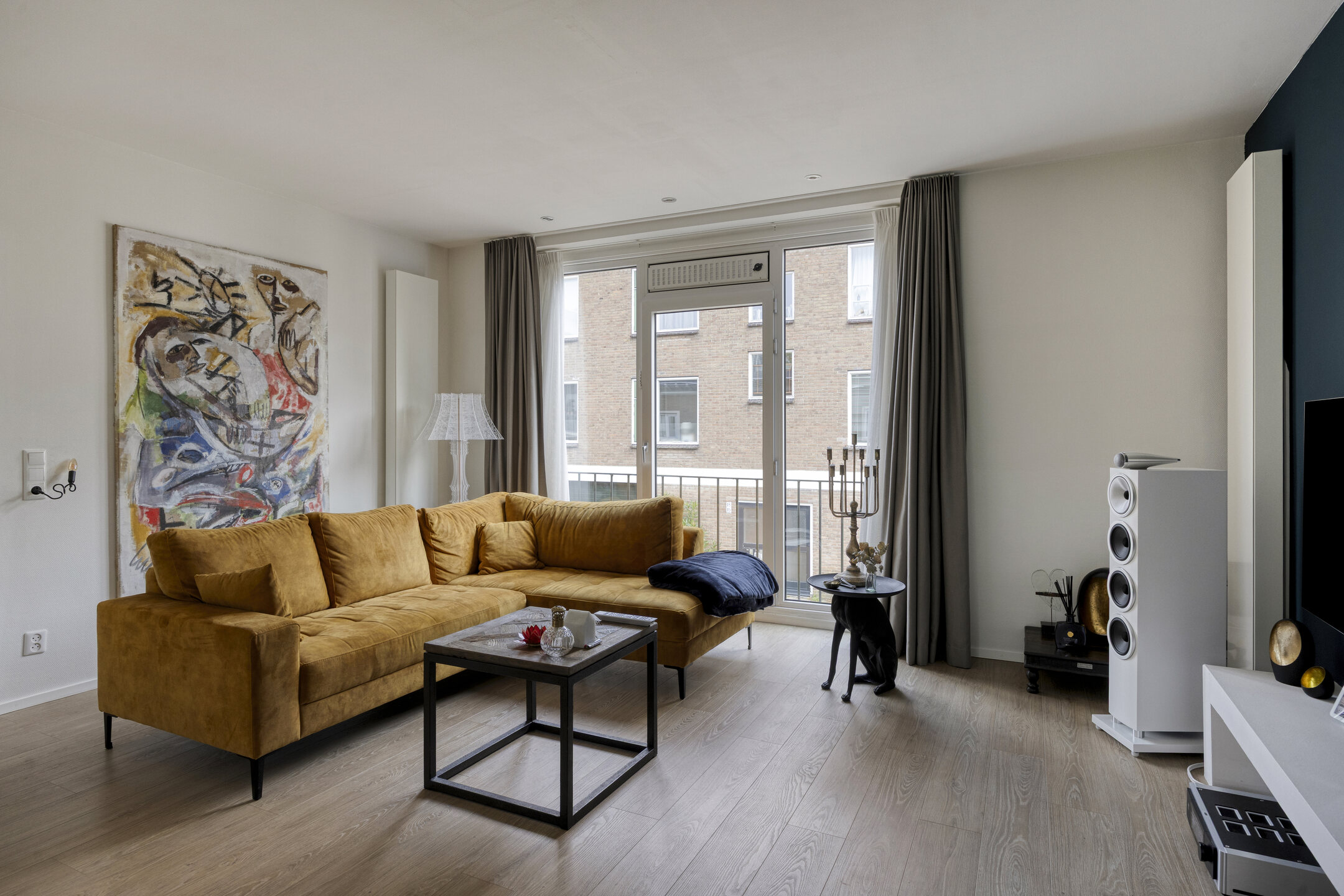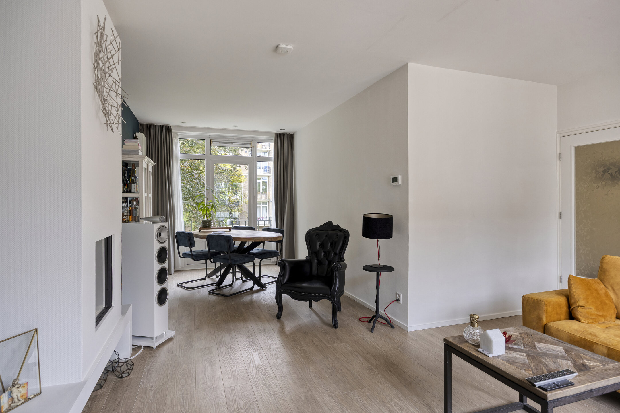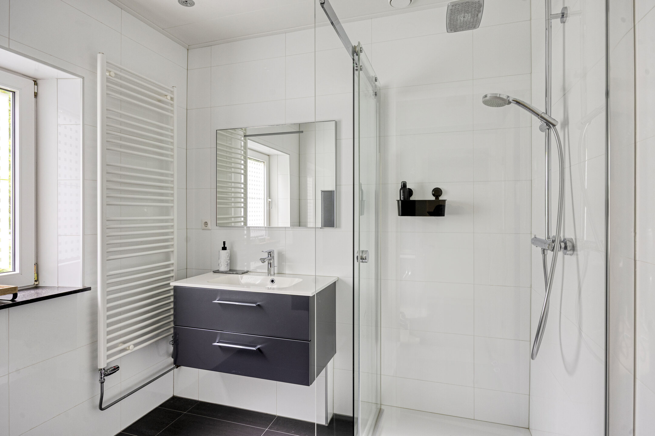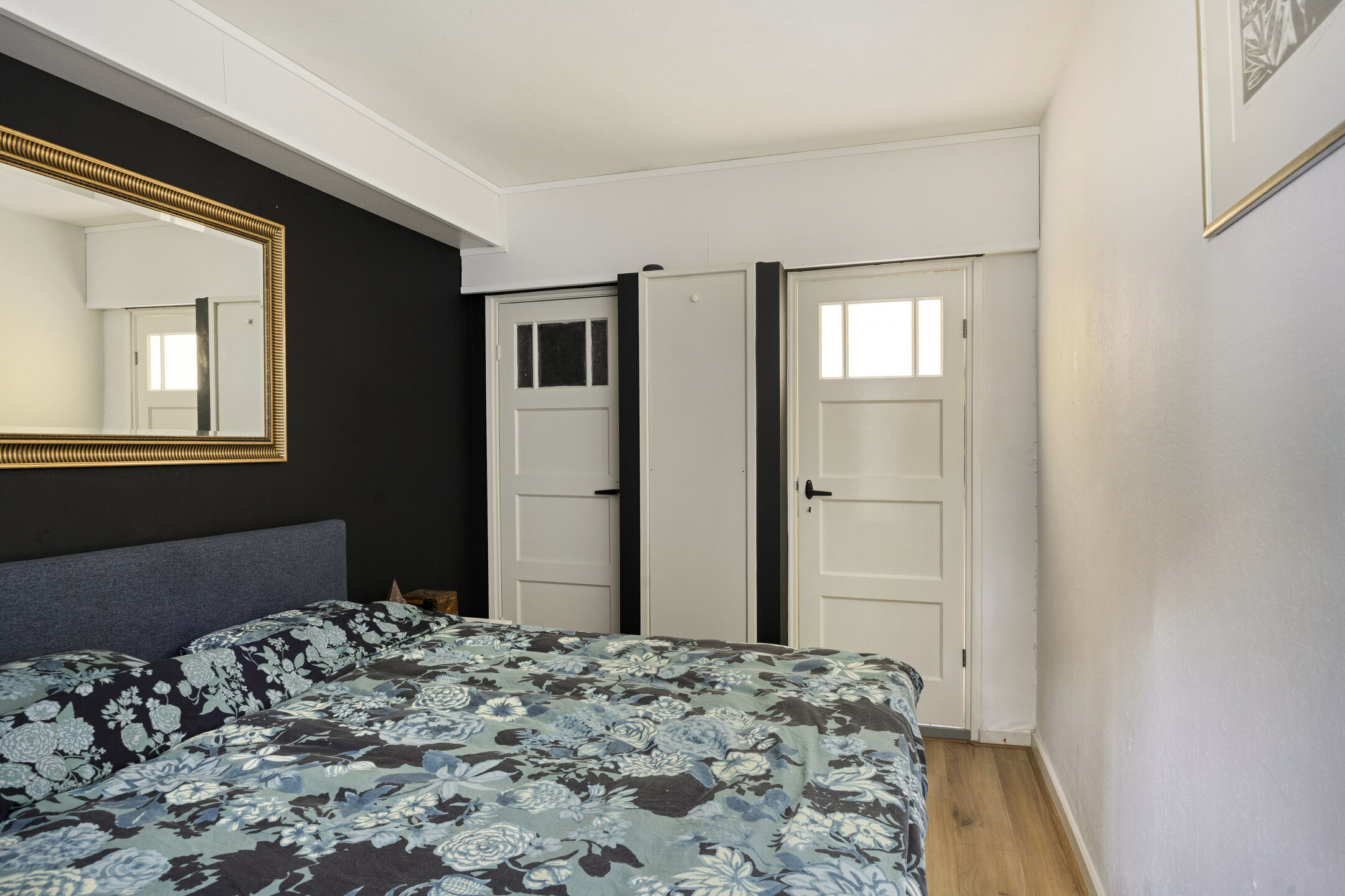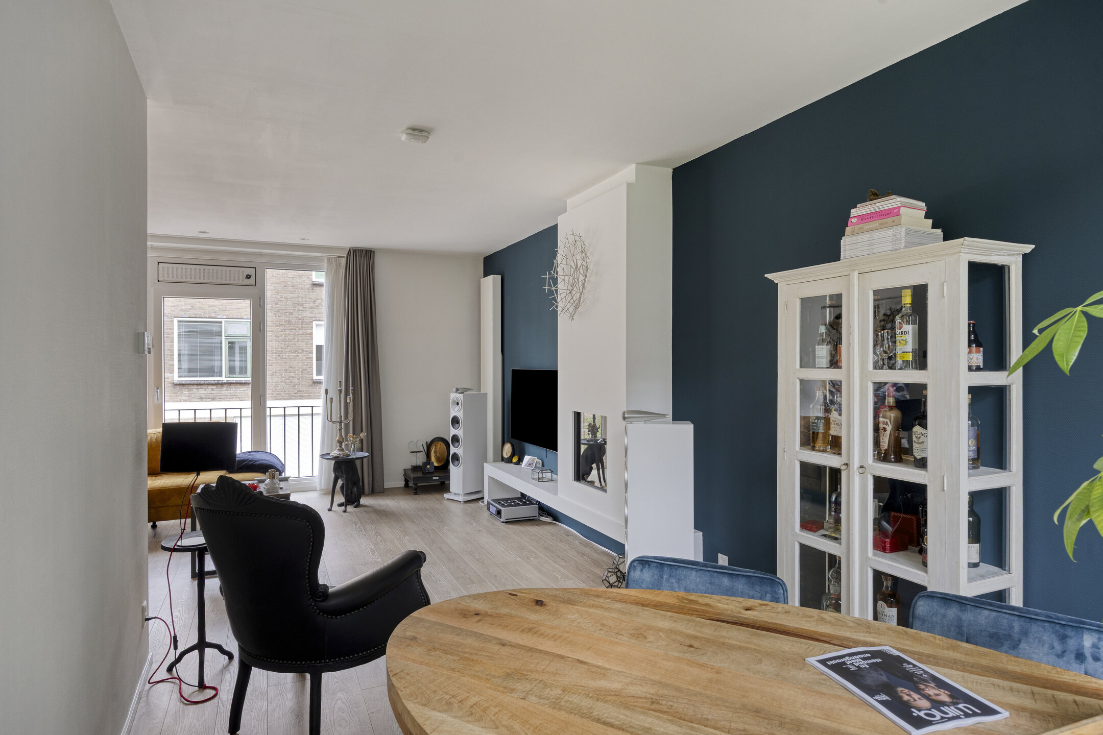 1e Verdieping: overloop met toegang tot het toilet en vlizotrap naar de bergzolder. L-vormige woon-/eetkamer met PVC-vloer, schouw en frans balkon met uitzicht over de gezamenlijke binnentuin. Strakke hoogglans witte keuken, voorzien van inductiekookplaat, afzuigkap, combi-oven, koelkast, vaatwasser en Quooker. Slaapkamer ter grootte van circa 8,5 m², voorzien van vaste kast. Badkamer met wastafelmeubel, douche en handdoekenradiator.