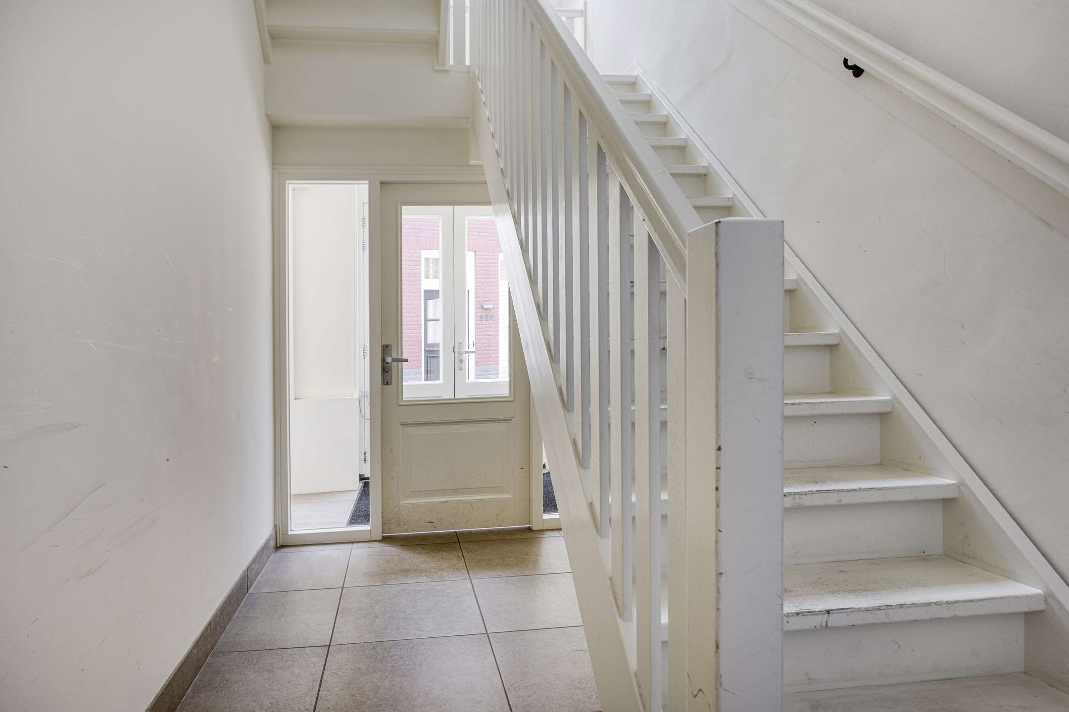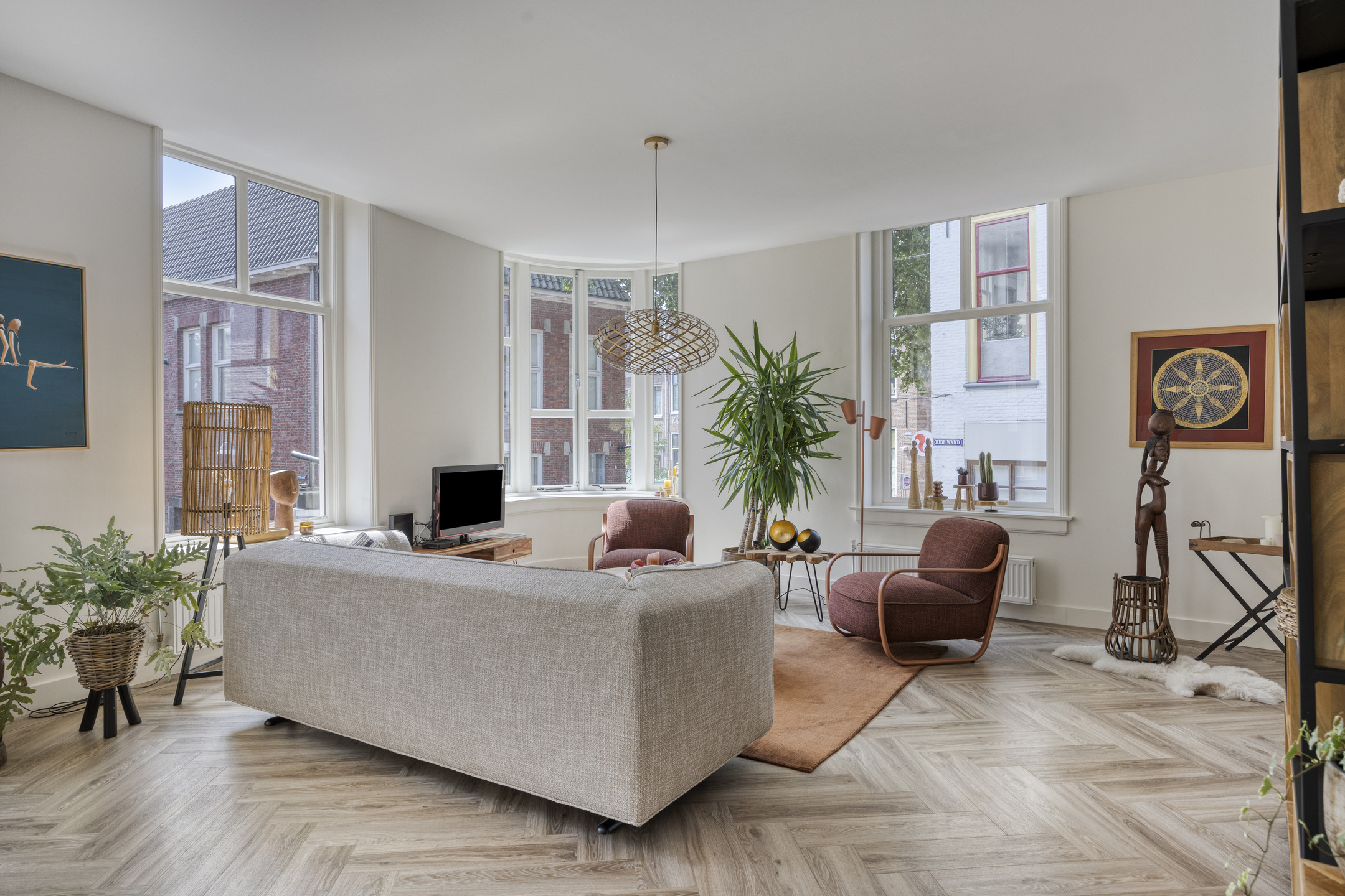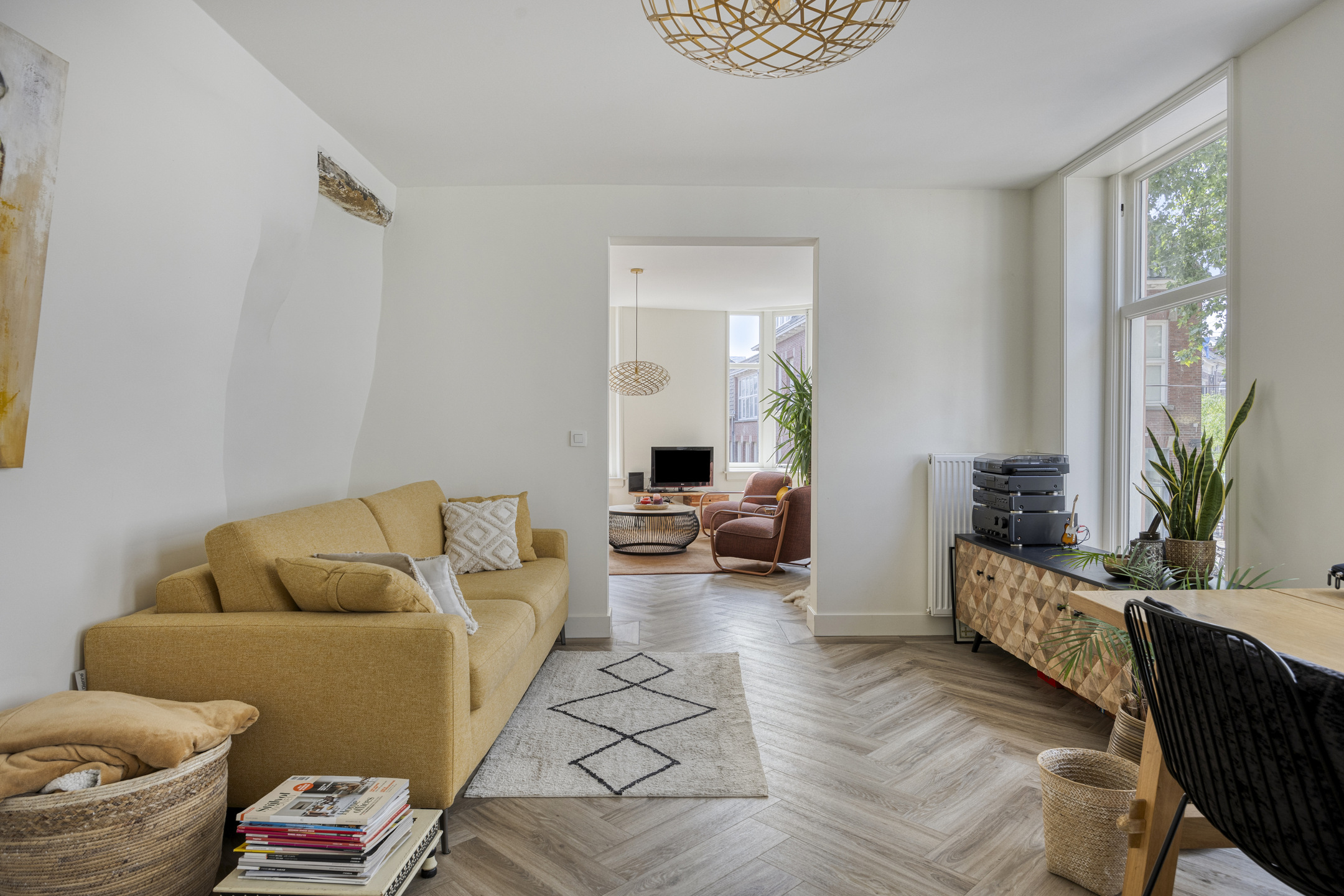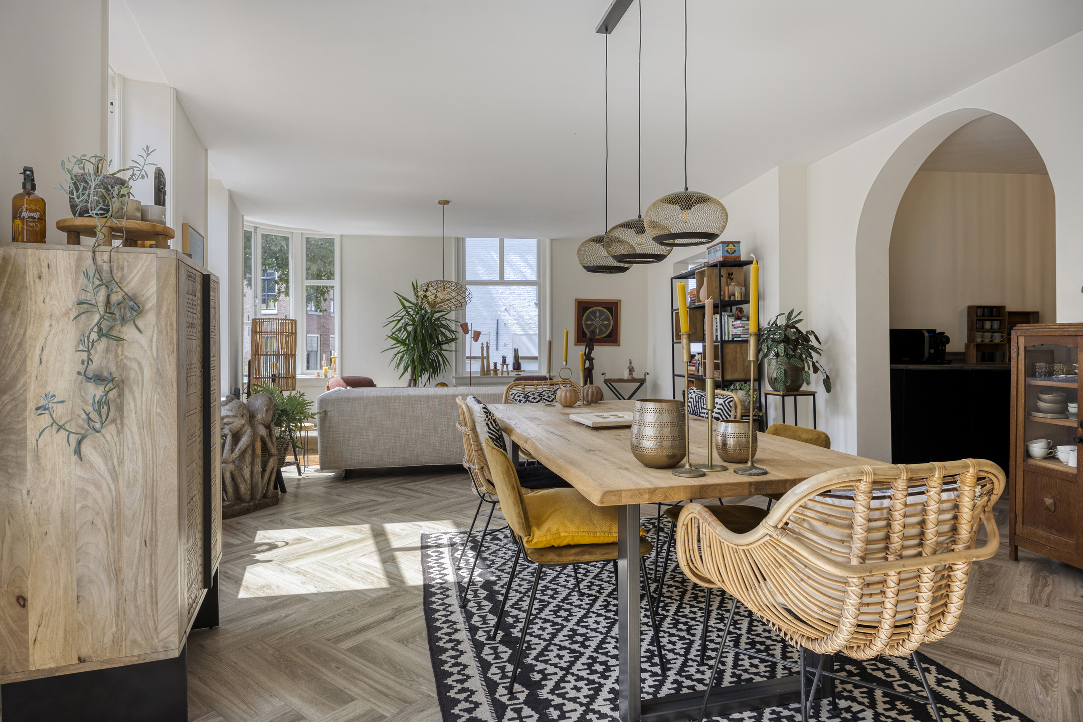 1e (woon)verdieping: entree, hal met groepenkast en toilet voorzien van wancloset en fonteintje. Riante woonkamer, welke bestaat uit twee gedeeltes, voorzien van visgraad PVC-vloer, met uitzicht over de winkelstraat, twee trapopgangen naar de 2e verdieping en fijne lichtinval door de vele ramen. Half open keuken voorzien van riant gasfornuis met afzuigkap en oven, koelkast en vaatwasser.