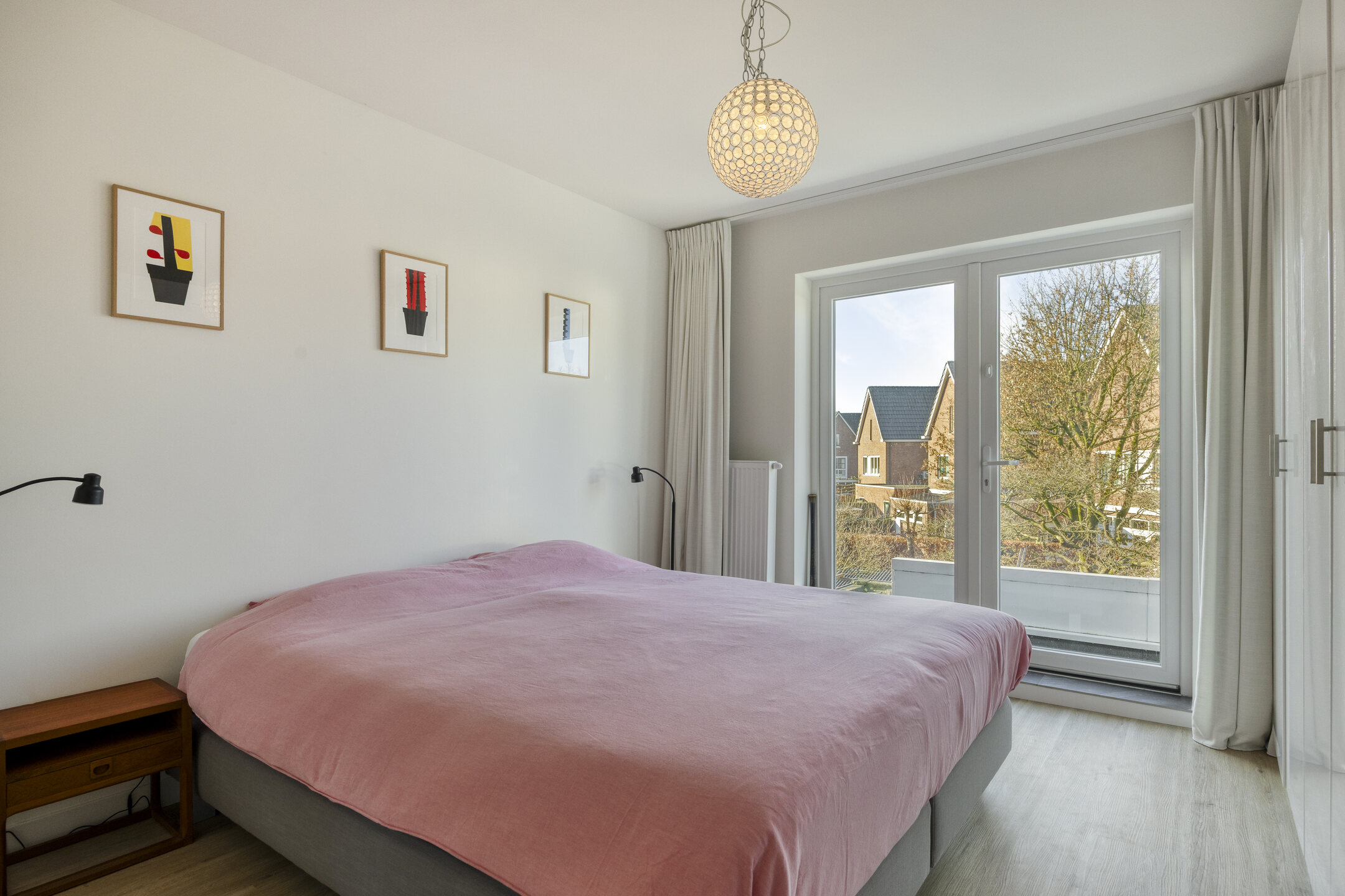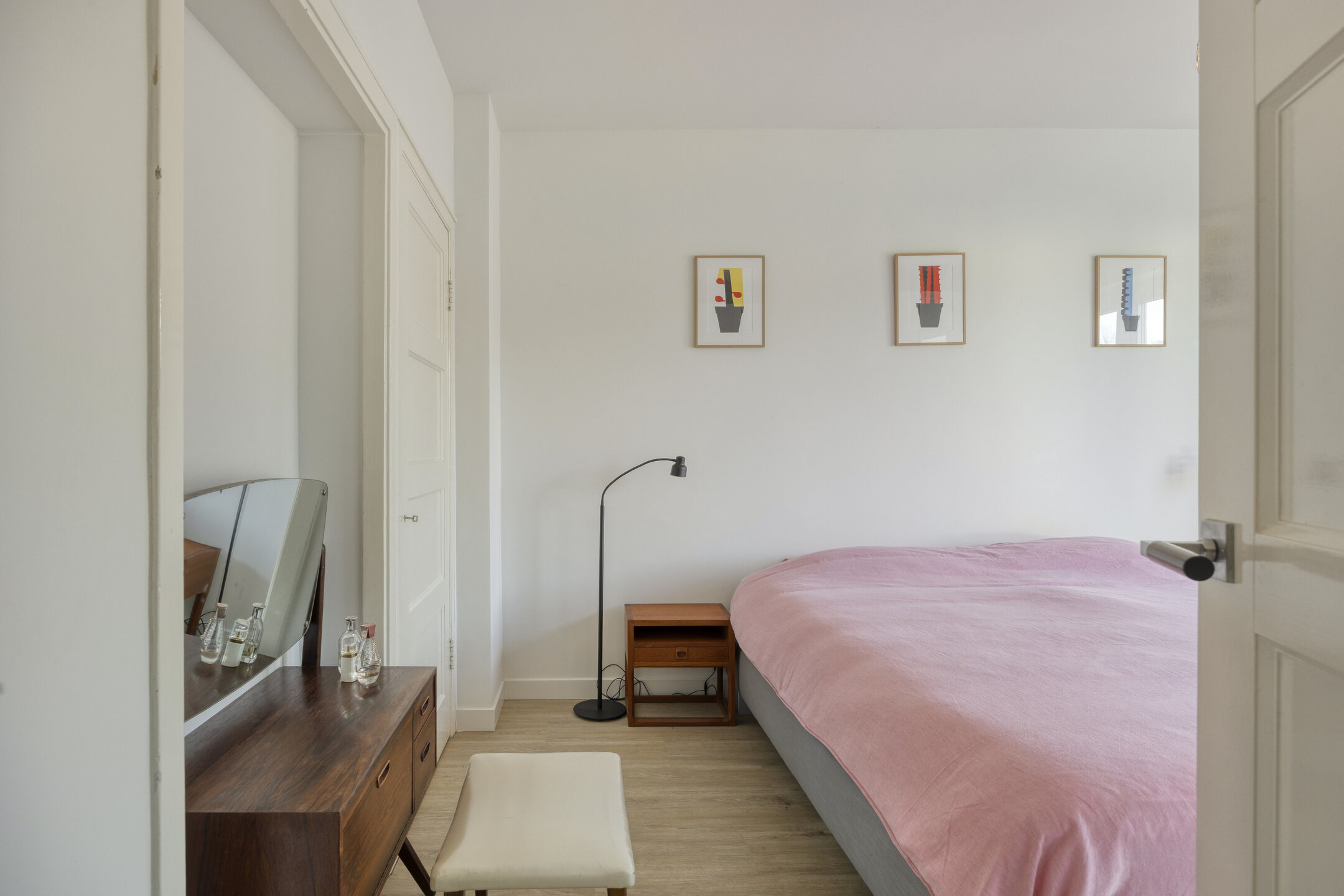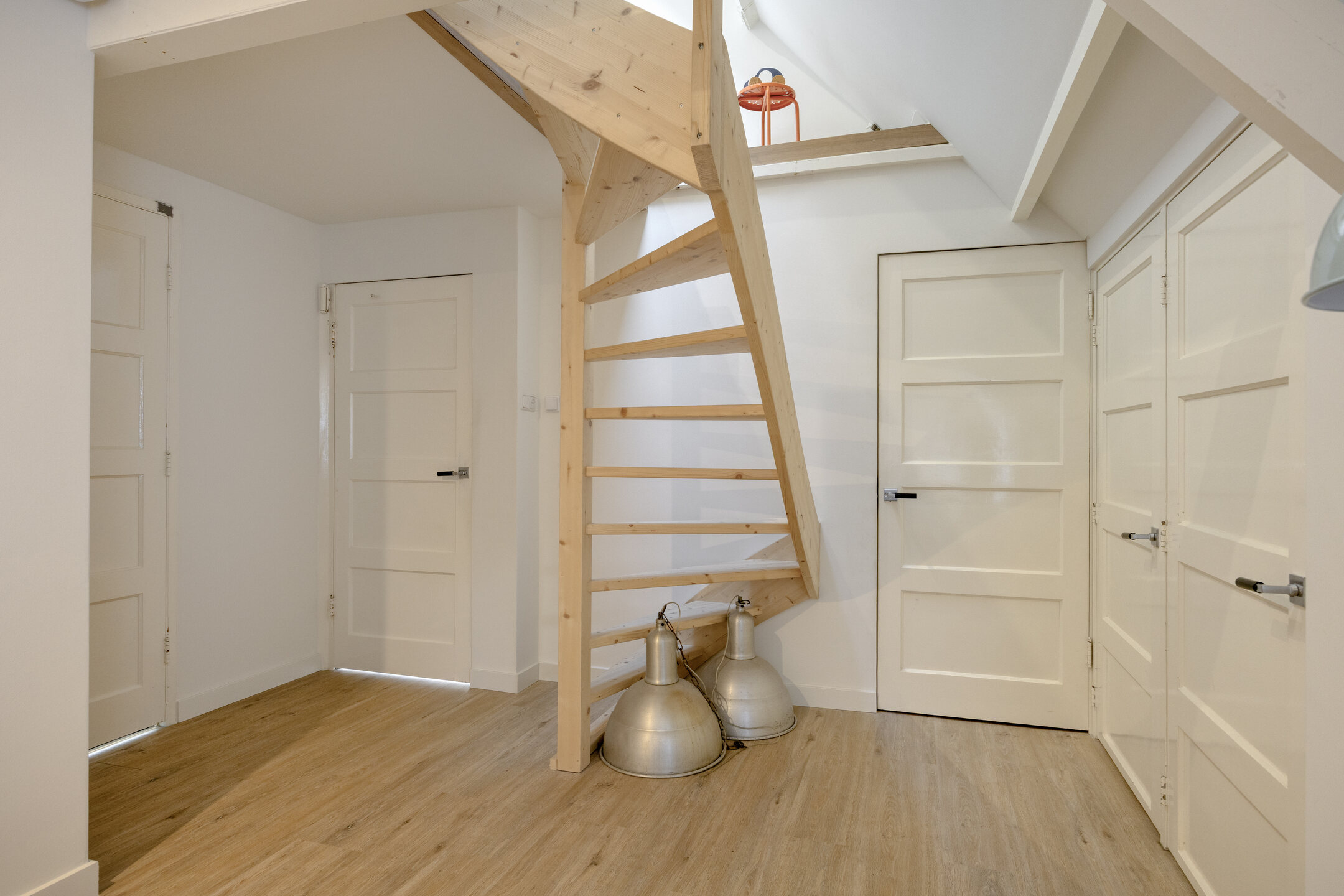Eerste verdieping Ruime overloop, drie nette slaapkamers (twee van ca. 8 m² en één van ca. 14 m²), allen met vaste (inbouw-)kasten. De slaapkamer aan de voorzijde heeft een unieke doorkijk naar de woonkamer. Fraaie badkamer met dubbel wastafelmeubel, wandcloset, inloopdouche en handdoekenradiator.